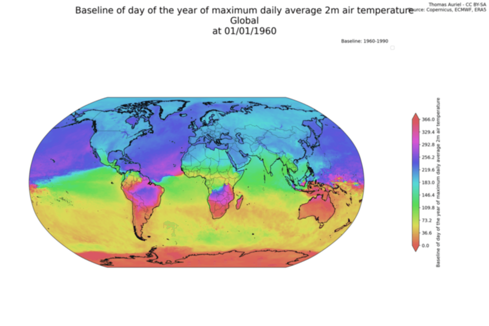 - The first map shows the day of the year when the maximum daily average 2m air temperature typically occurs.