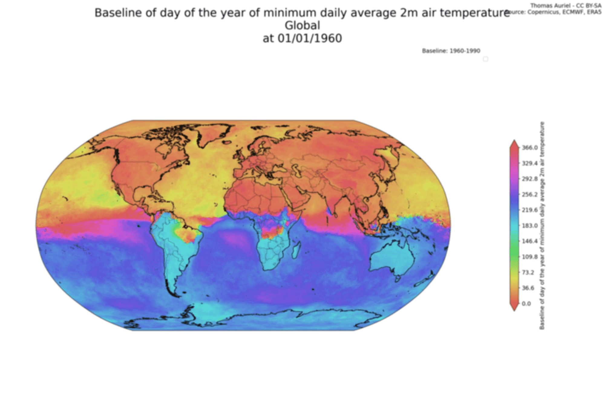 - The second map shows the day of the year when the minimum daily average 2m air temperature typically occurs.