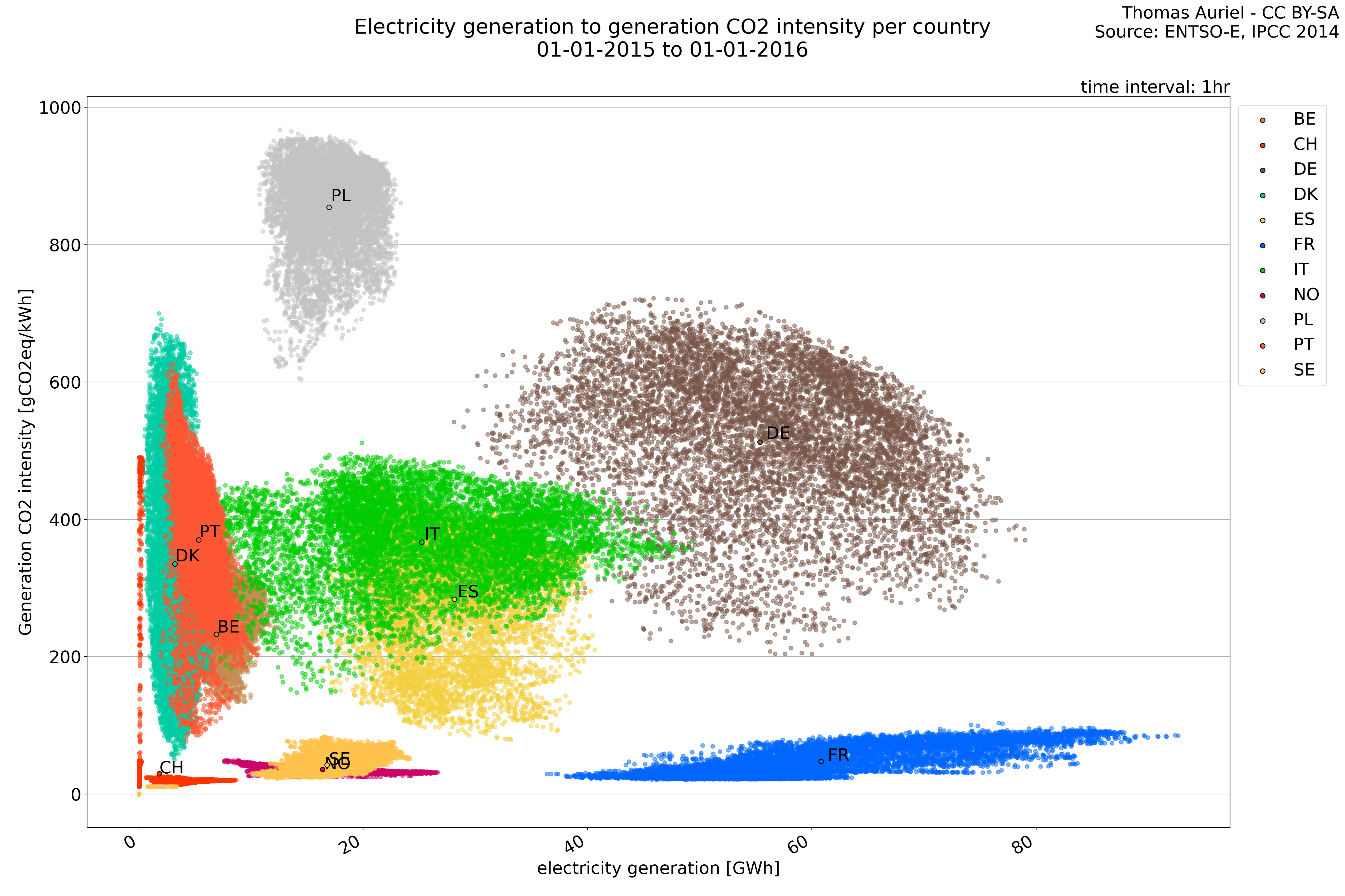 To read the scatter plot, locate a point on the graph and trace it back to both axes. The x-axis value gives the hour of production, and the y-axis value gives the CO2 intensity for that hour. By examining where the points are clustered, you can identify trends. For example, a cluster of points towards the lower right might indicate that higher production hours are associated with lower CO2 intensity for a particular country.