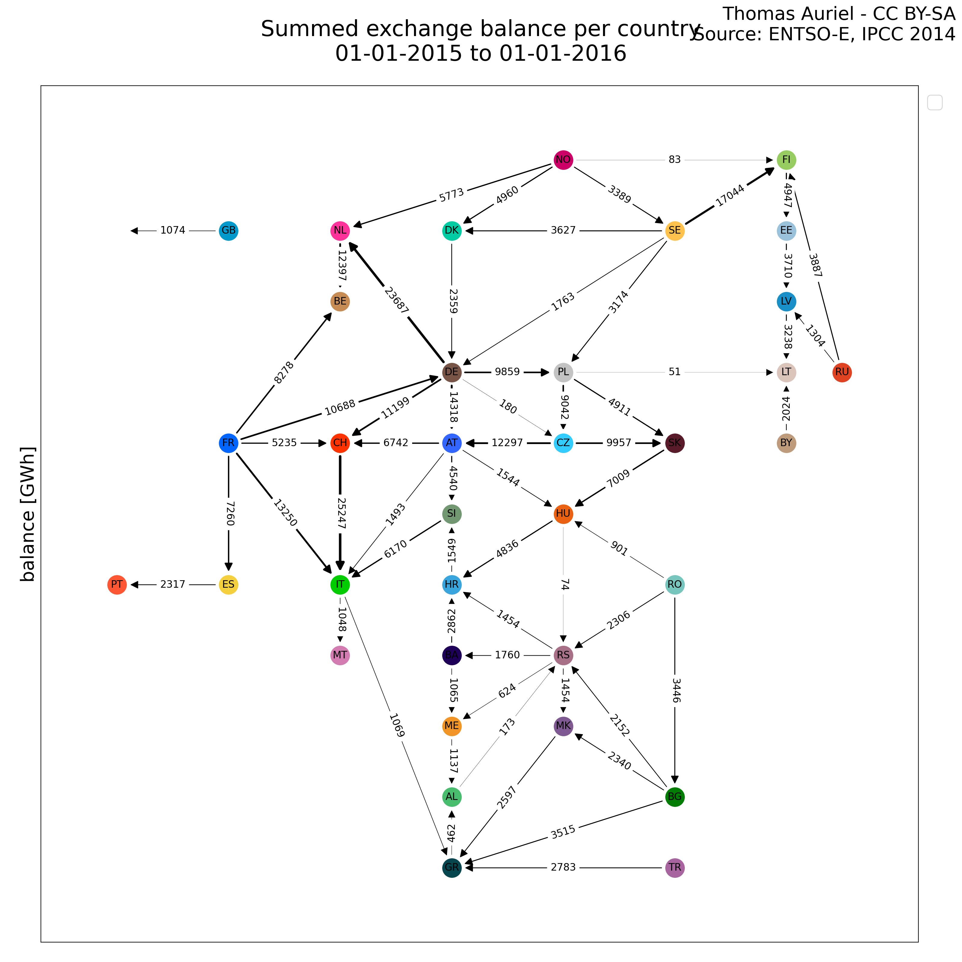 Graph network representations visualize complex interactions and electricity exchange among countries. Nodes represent individual countries, labeled with their iso code. Links illustrate the flow, direction, and intensity of exchanges, with wider links denoting greater exchange values. This representation aids in identifying countries with significant interactions and offers insights into international relationships.