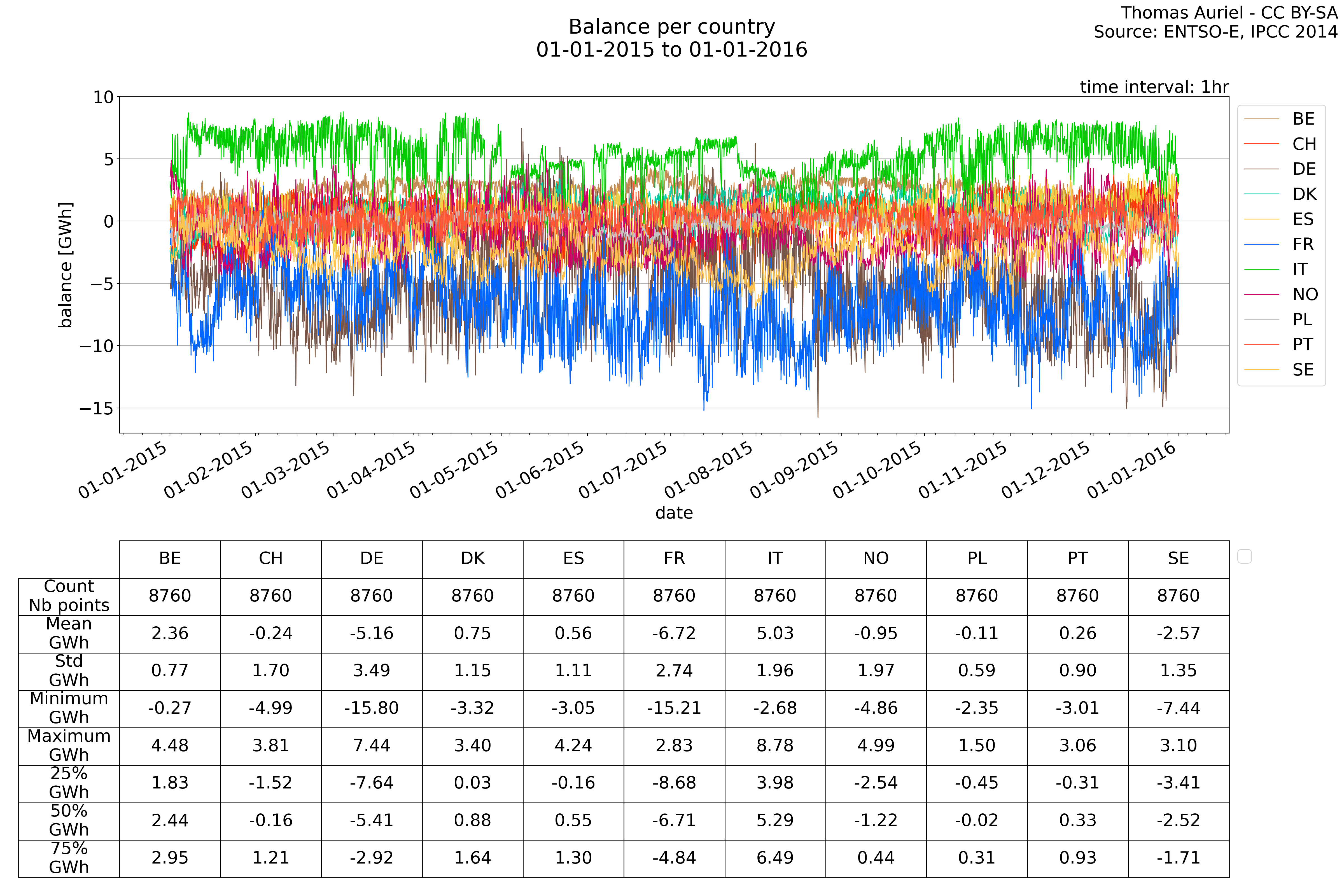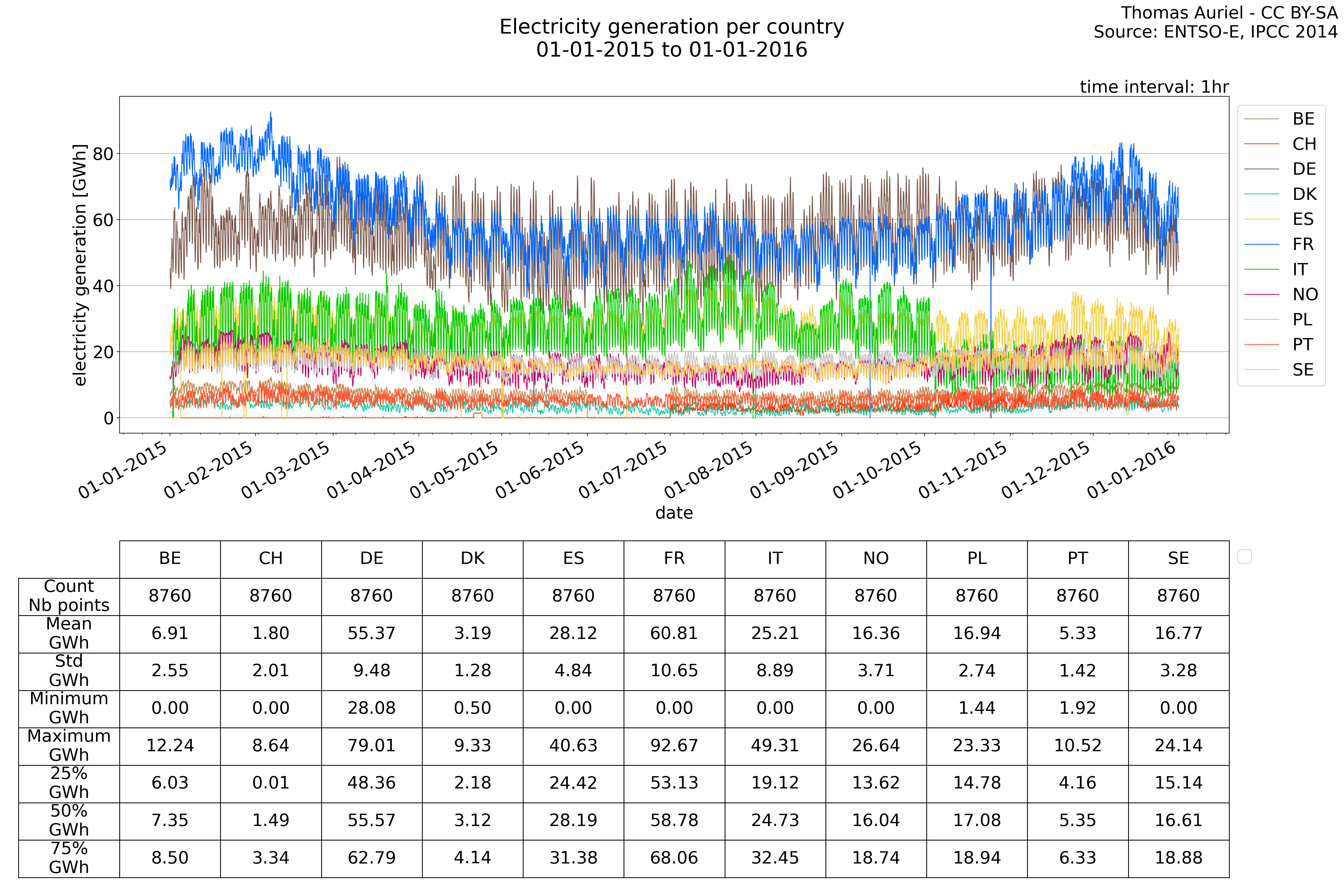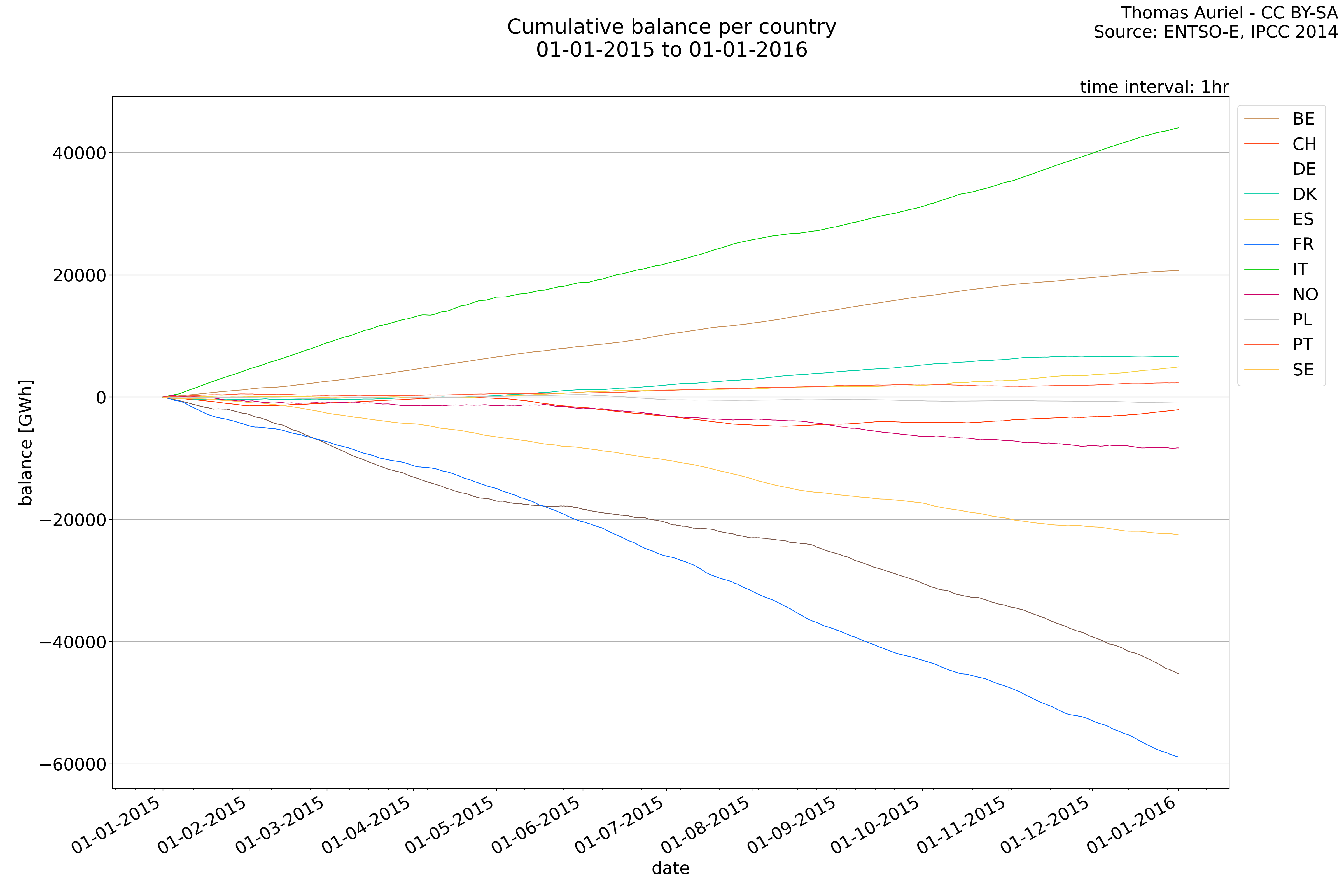 In these hourly line plots, the x-axis spans the entire year, with hours as individual data points. The y-axis represents the values of production, exchange, consumption, and data emissions, but unlike cumulative plots, these plots are designed for quality control purposes. Each line on the plot corresponds to a specific country and is used to identify data irregularities, holes, or artifacts that may occur within the year. By examining these plots, it is possible to spot discrepancies or missing data points in the hourly records, ensuring data integrity.