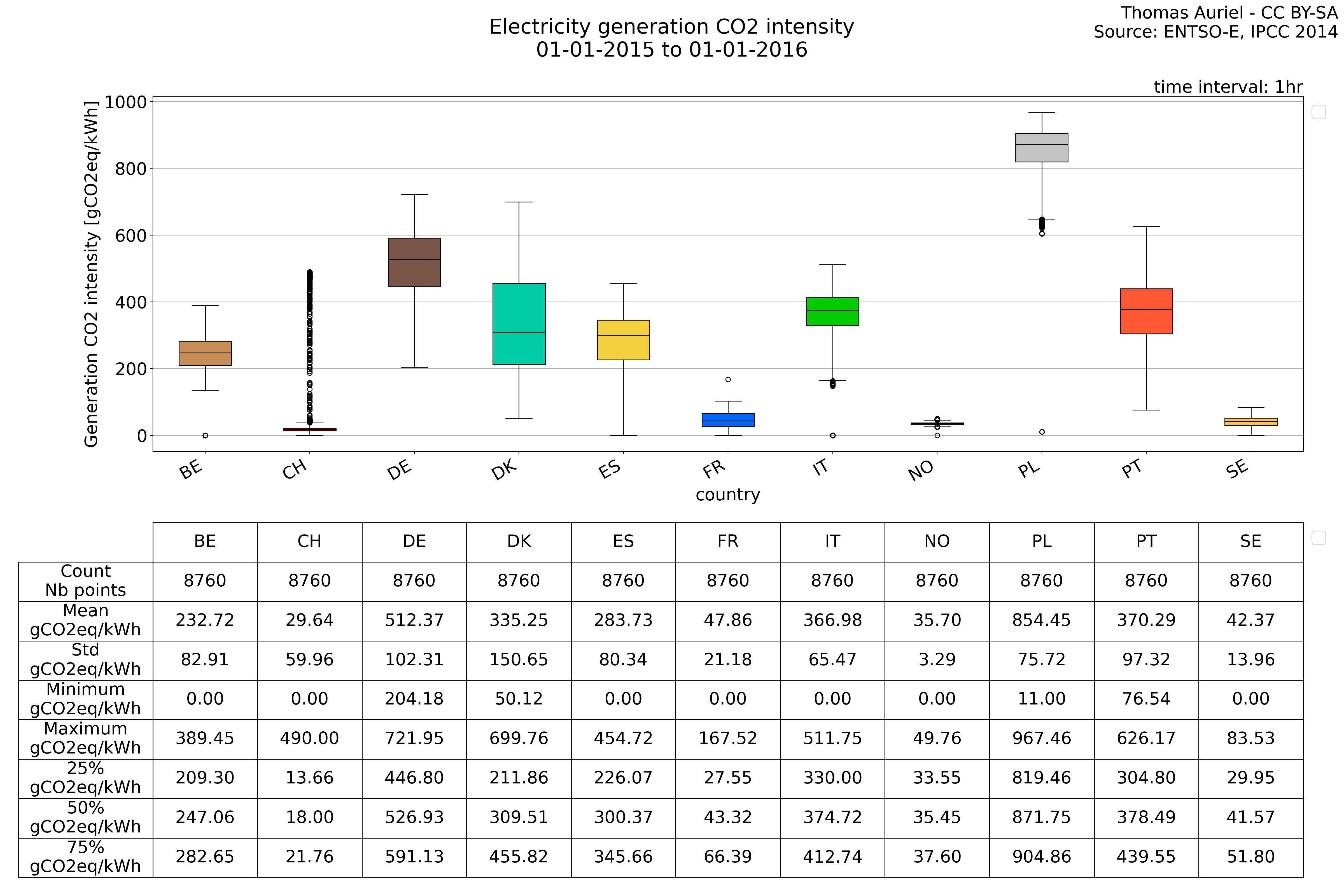 An essential feature of the square plot is the size of each square, which is proportional to the total CO2 emissions of the represented country, calculated by multiplying CO2 intensity with production. Larger squares indicate higher emissions.