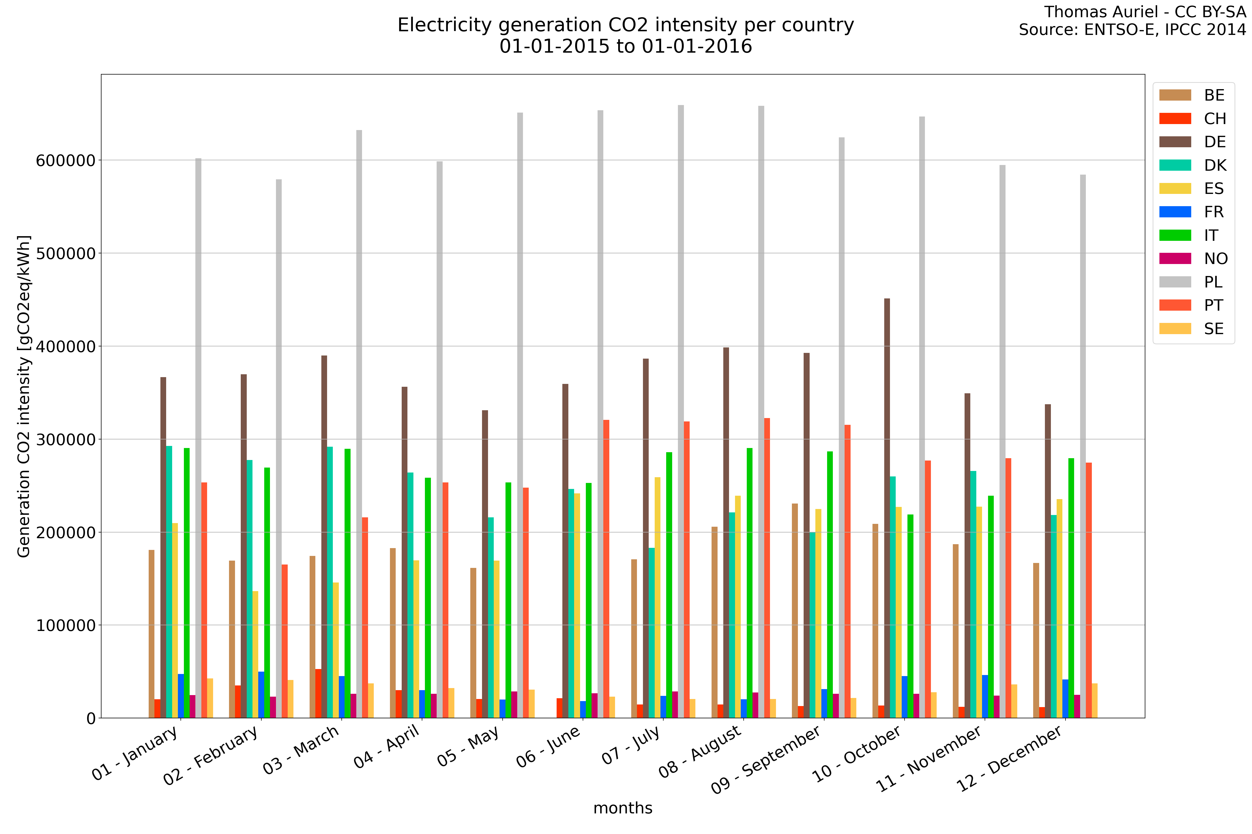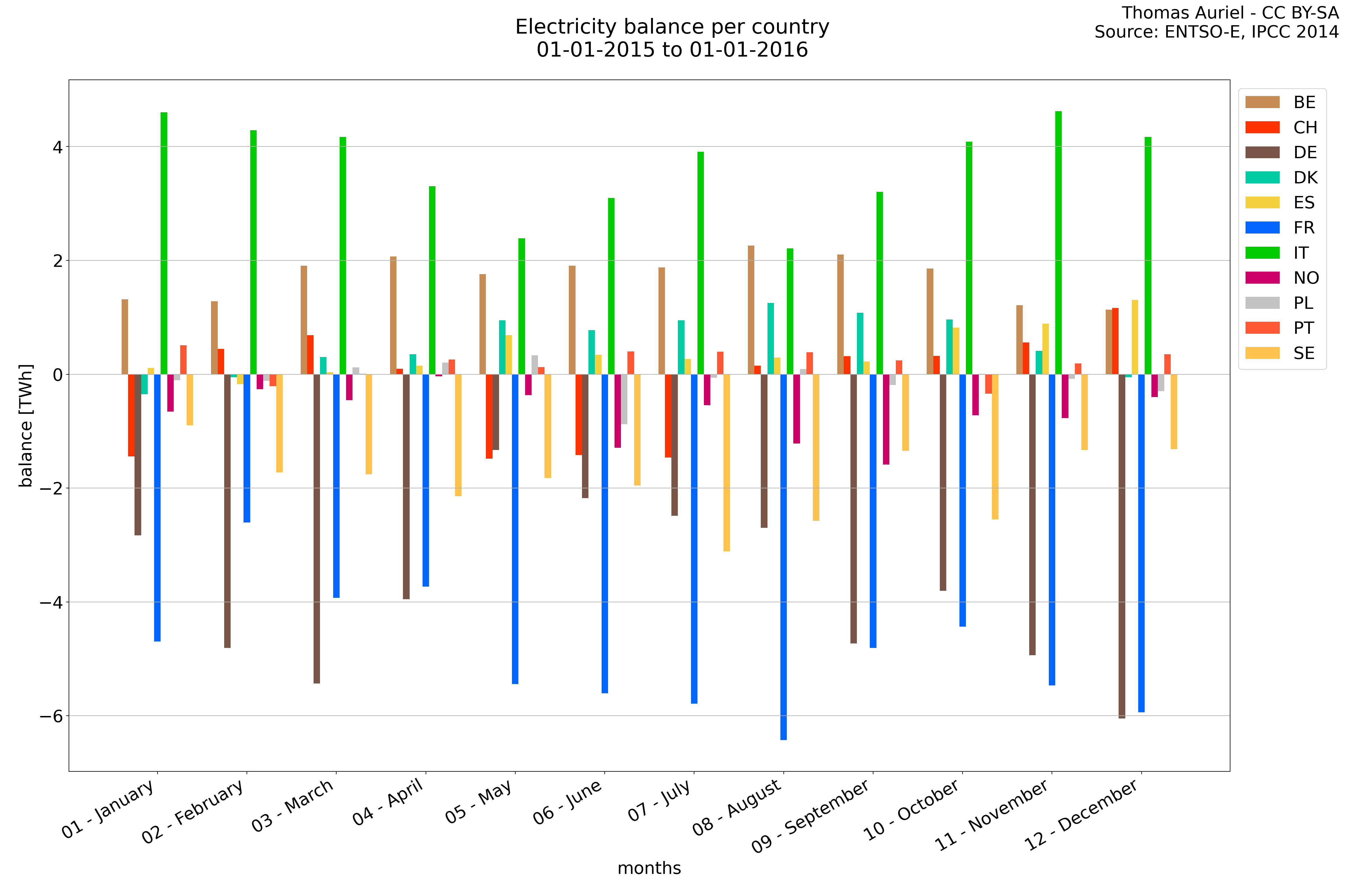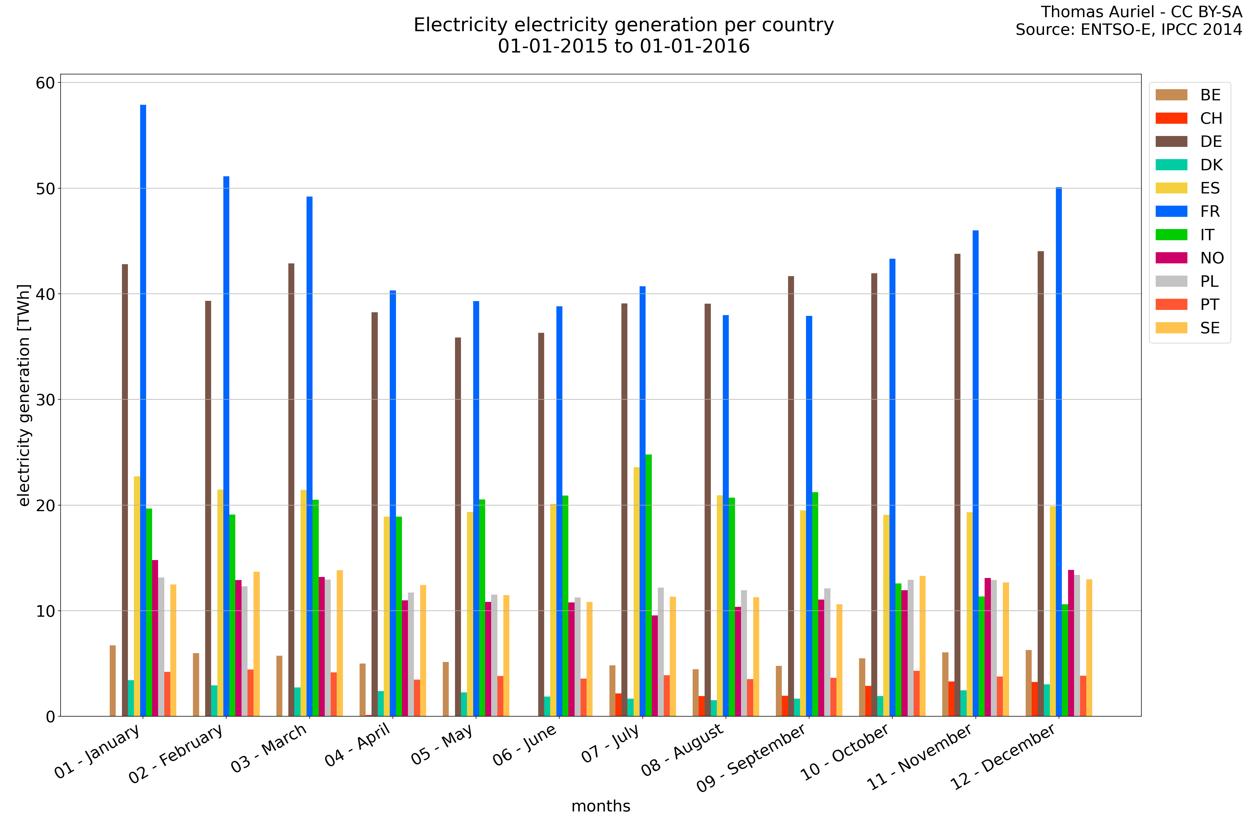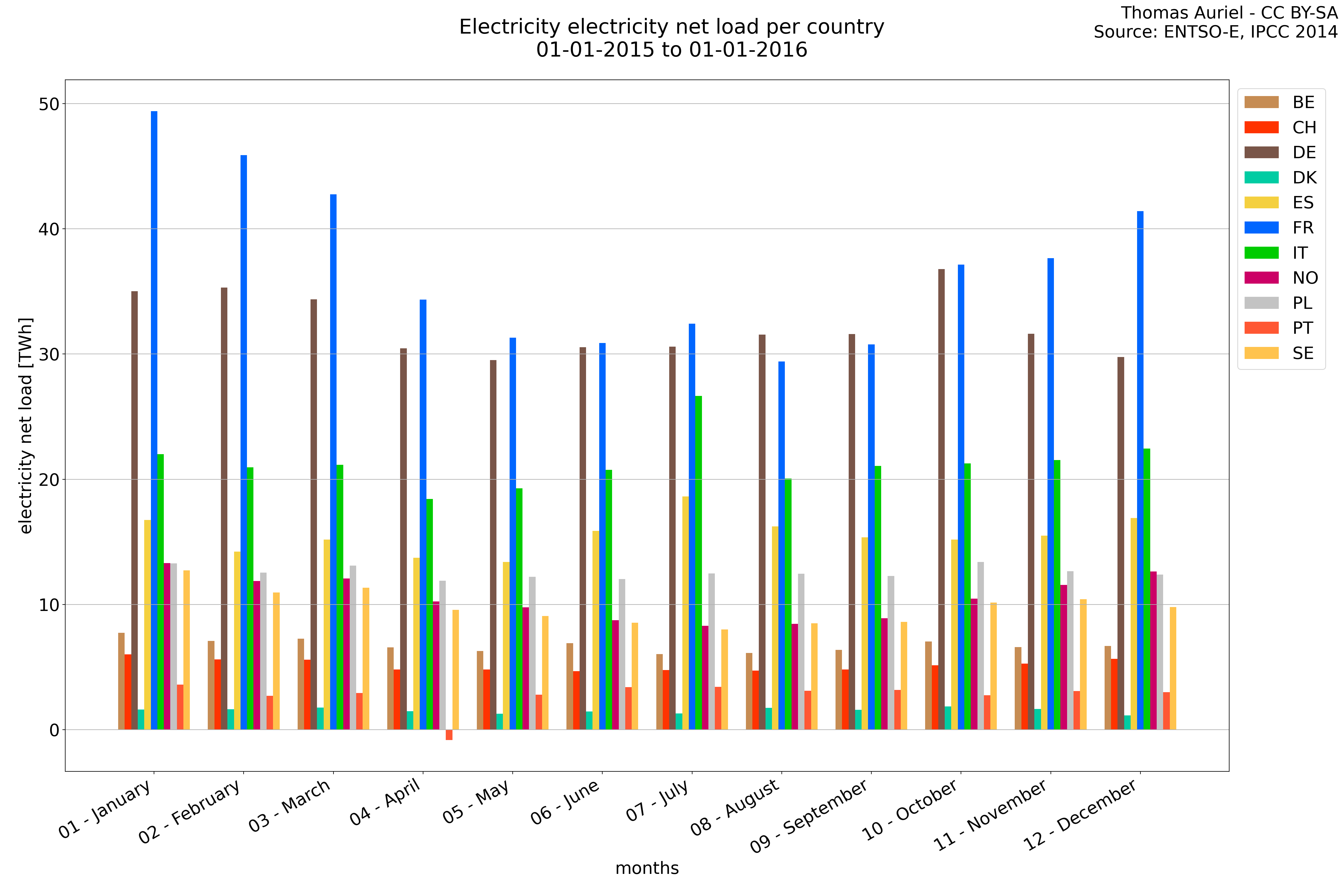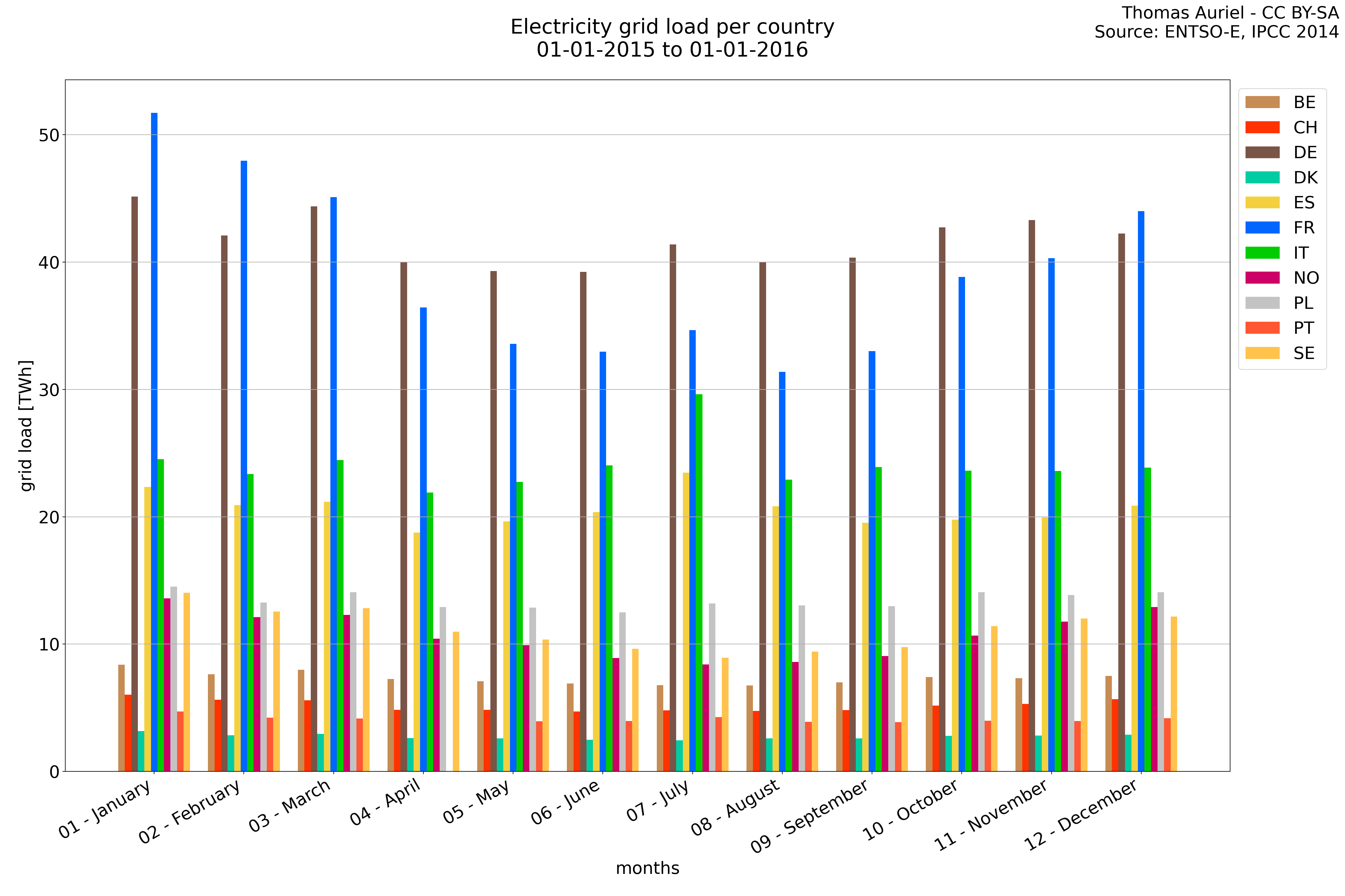 A periode plot takes a general view of the data by summing all the values over each month and presents them as a stacked bar plot. This visualization method allows for a clear understanding of how each country grid change over months. Then the Periode plot does not provide time-based trends but instead give an insight on the composition of the data within the chosen period.