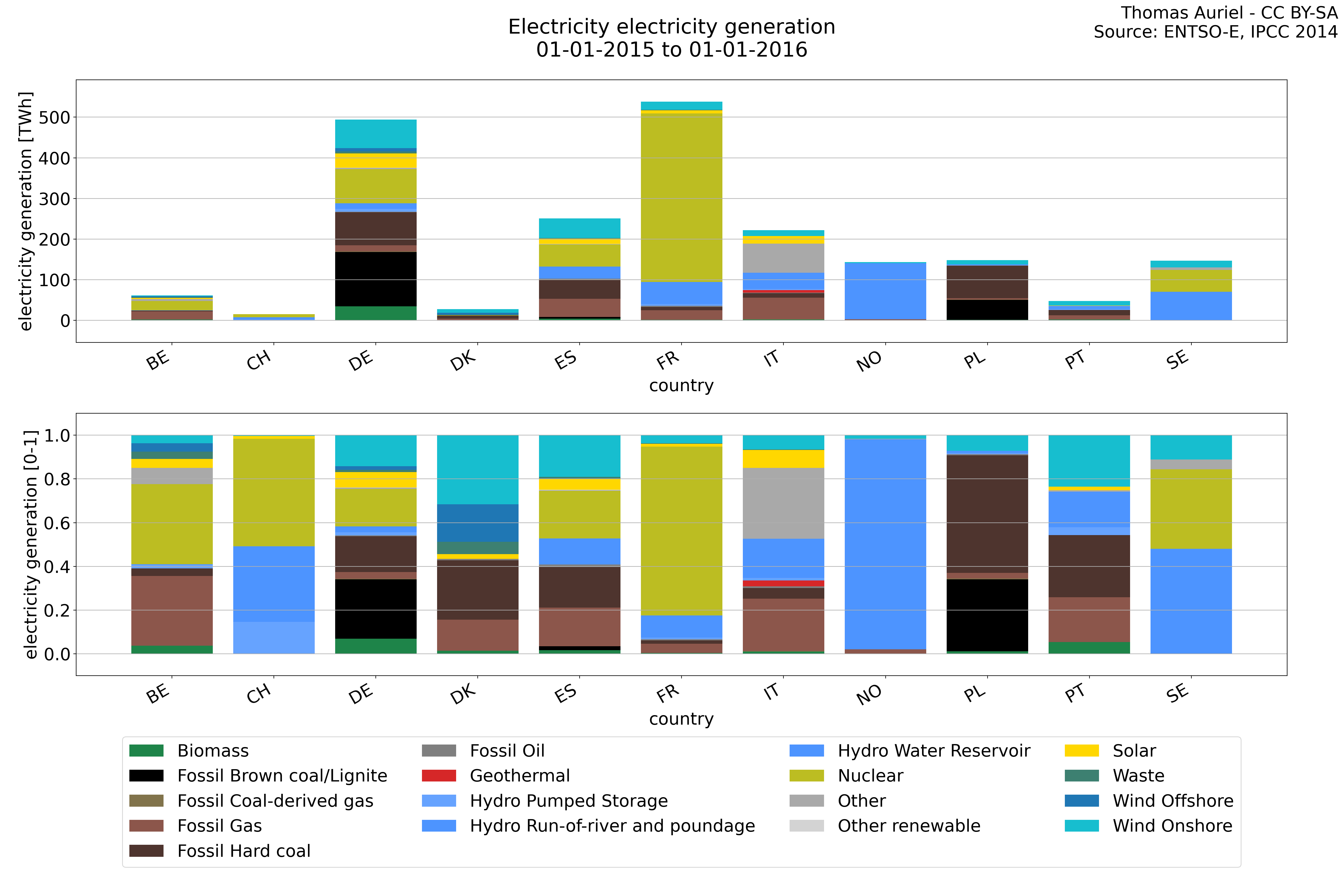 In these stacked bar plots, each bar represents a specific country. The bars are divided into sections that depict the decomposition of production, exchange, and CO2 emissions over the year. Two versions are presented: one displaying absolute values, and the other showing relative values. In the absolute values plot, each country's bar illustrates the absolute amounts of these components during the year. The relative values plot showcases the proportion of each component within a country's data for the entire year. These stacked bar plots offer insights into how production, exchange, and CO2 emissions vary across countries, aiding in comparative analysis.