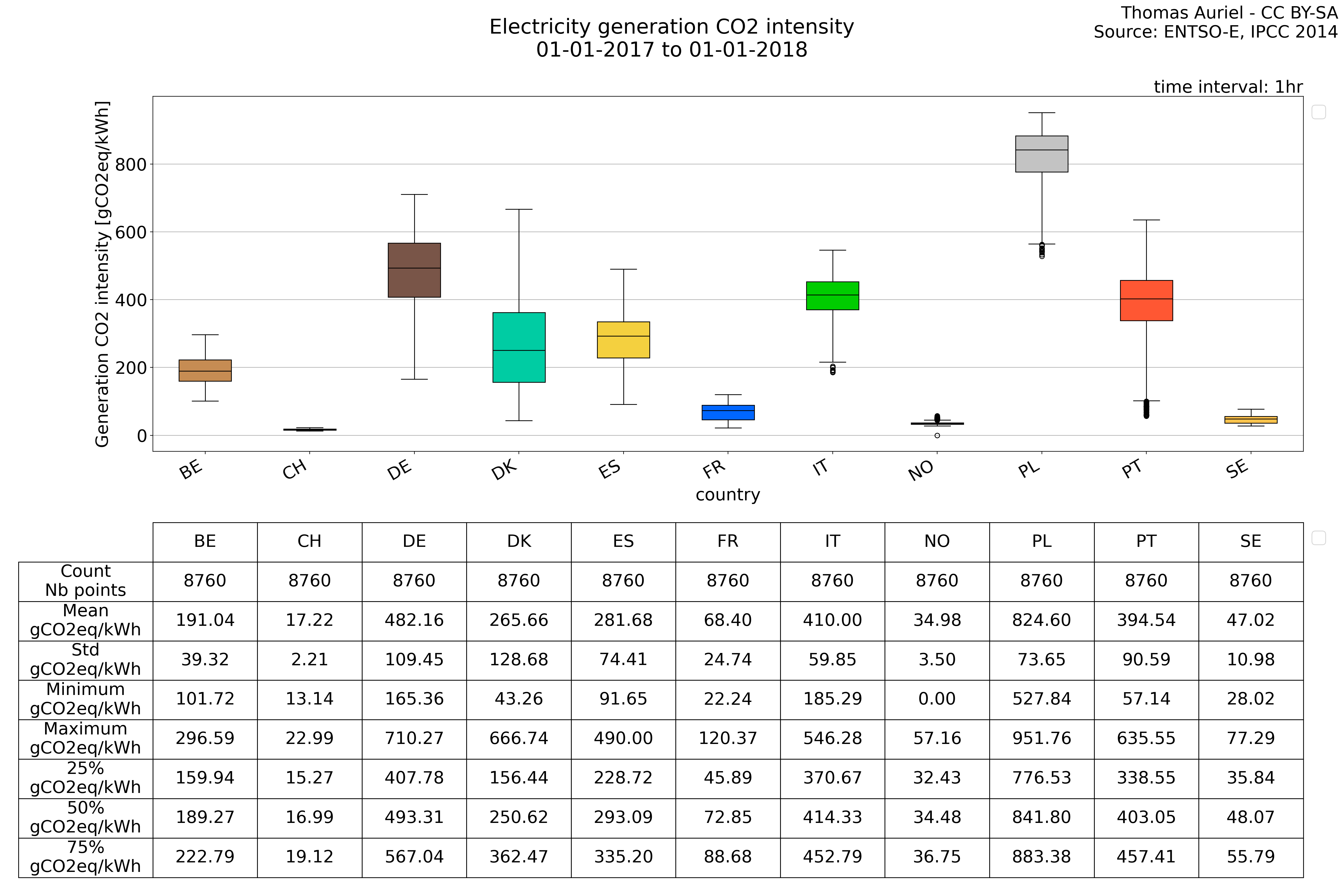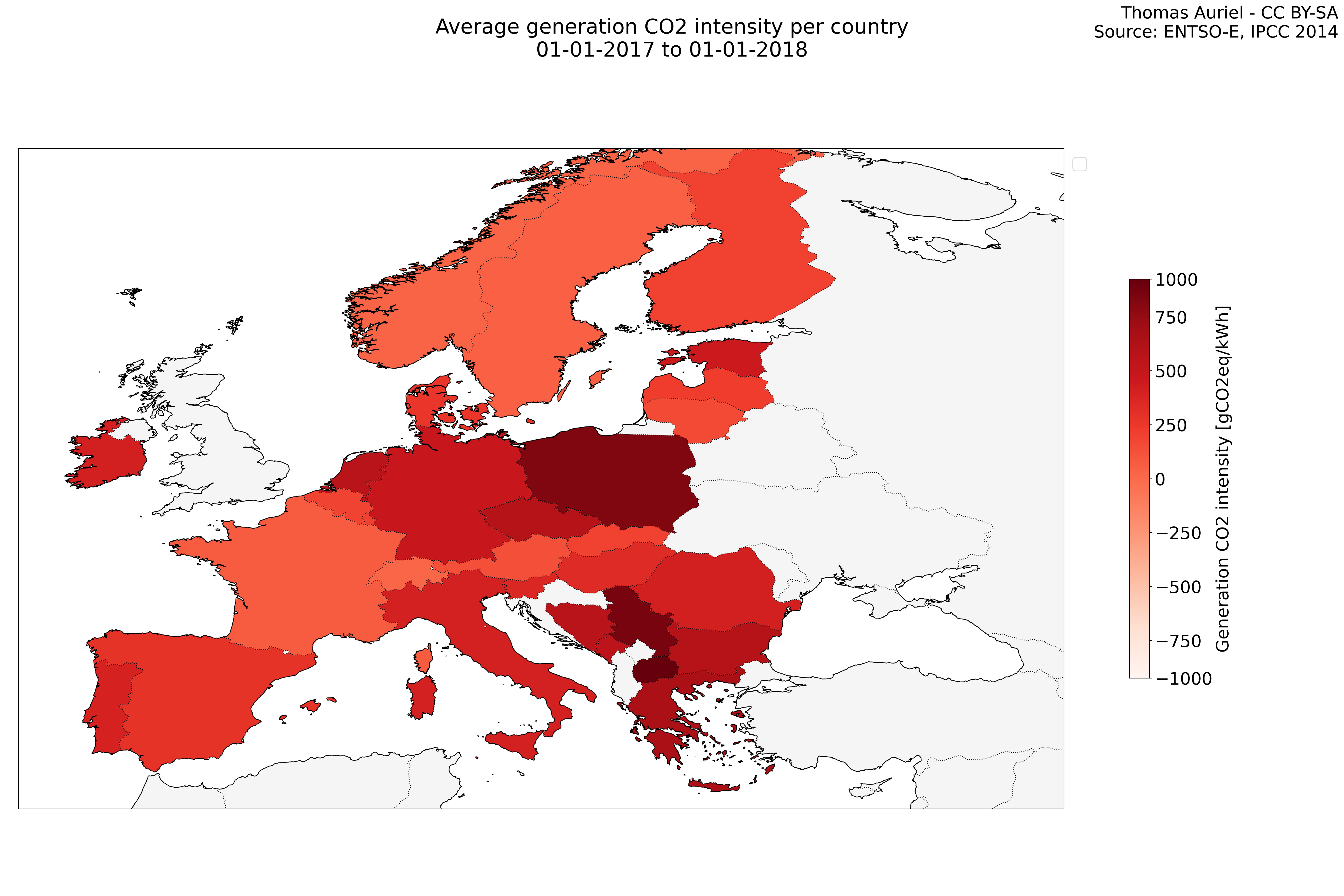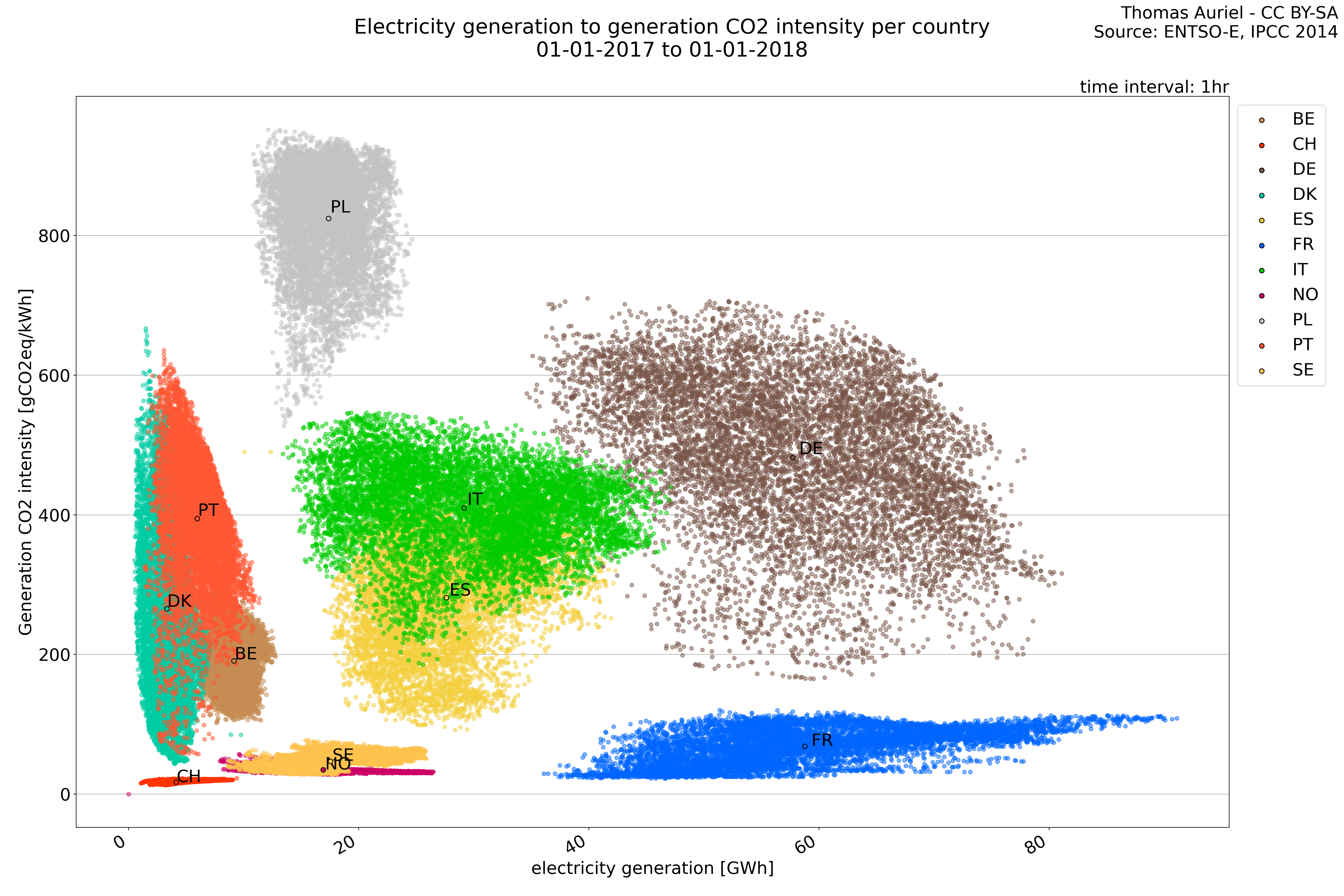 An essential feature of the square plot is the size of each square, which is proportional to the total CO2 emissions of the represented country, calculated by multiplying CO2 intensity with production. Larger squares indicate higher emissions.