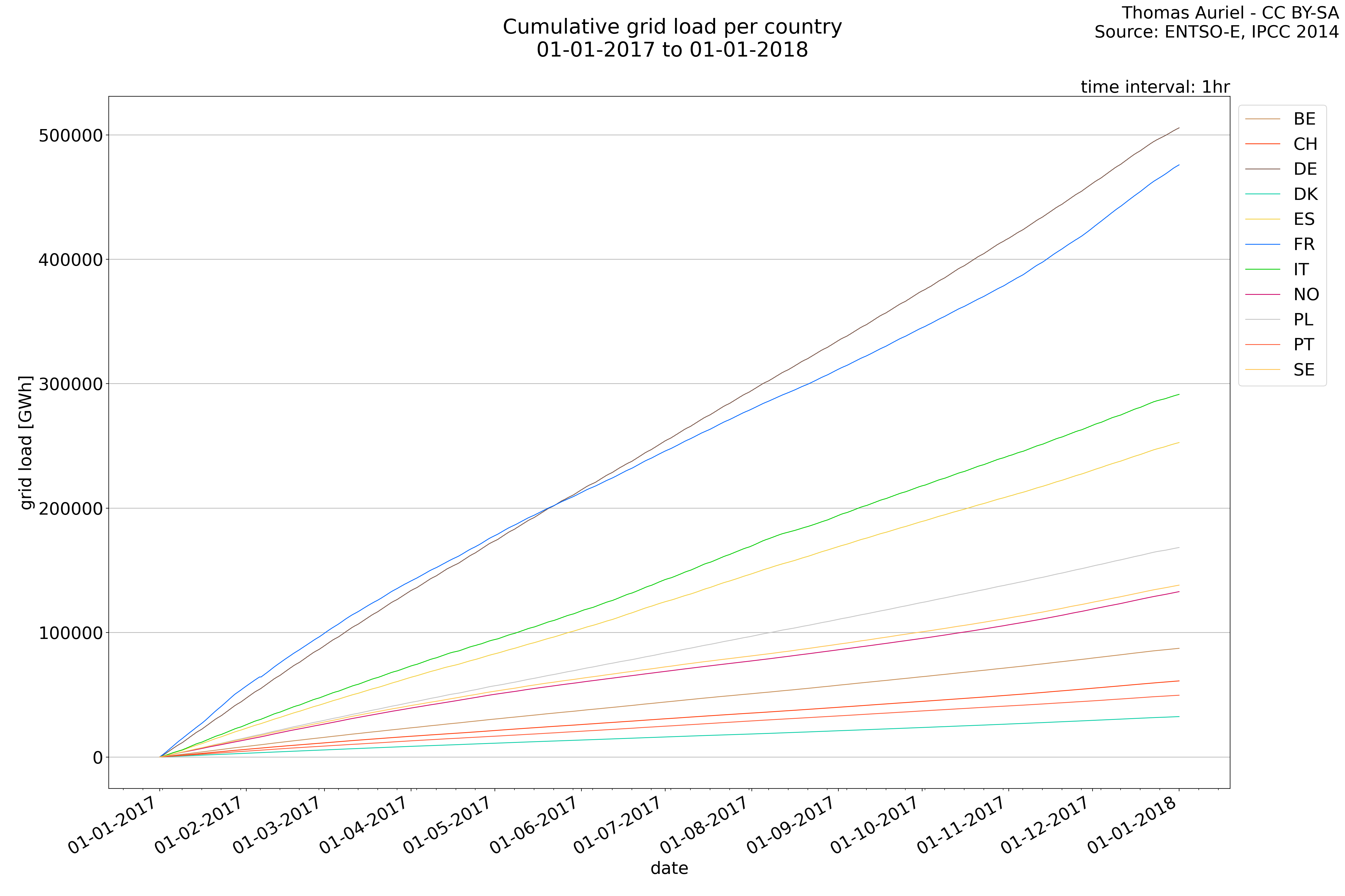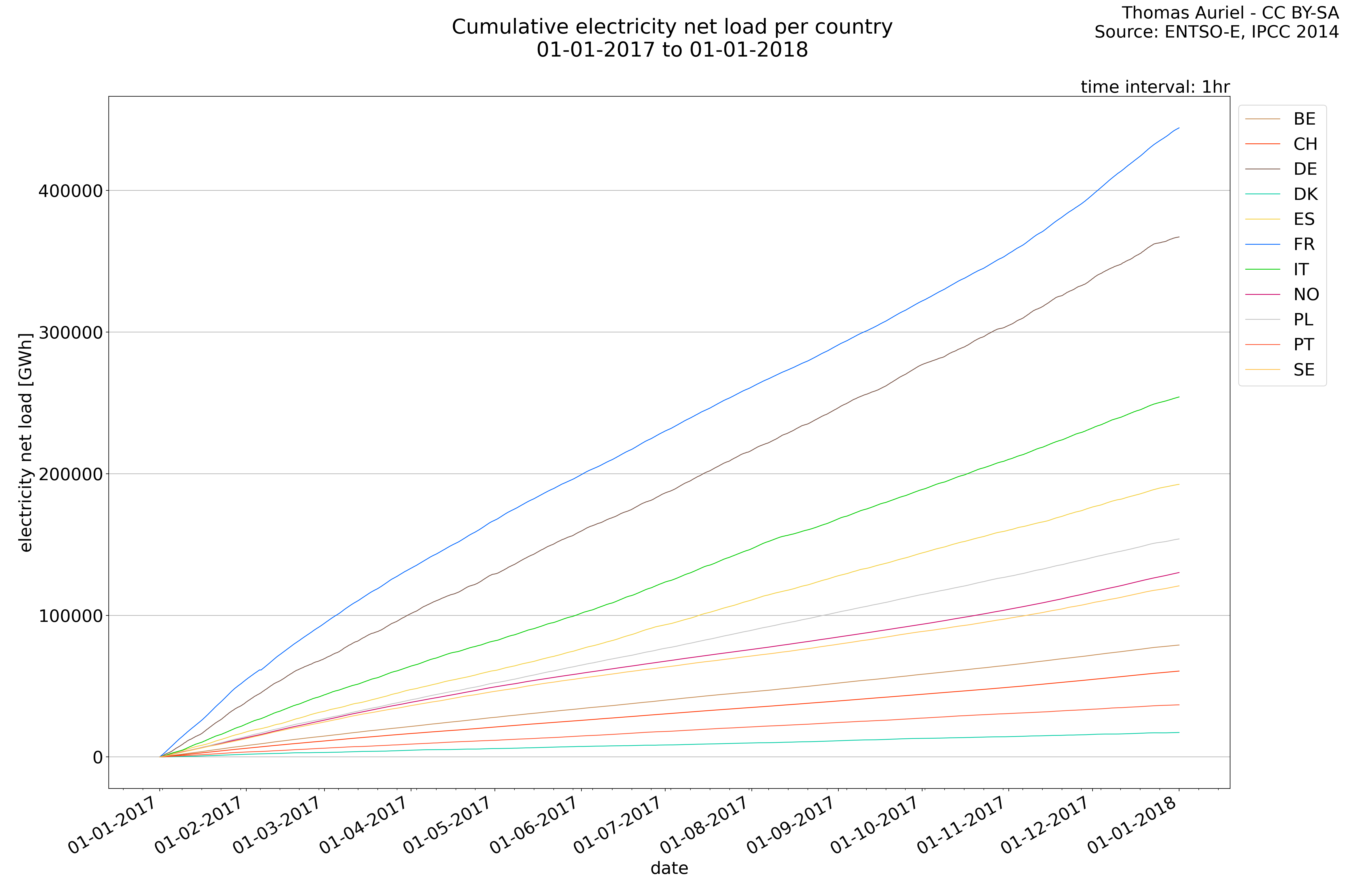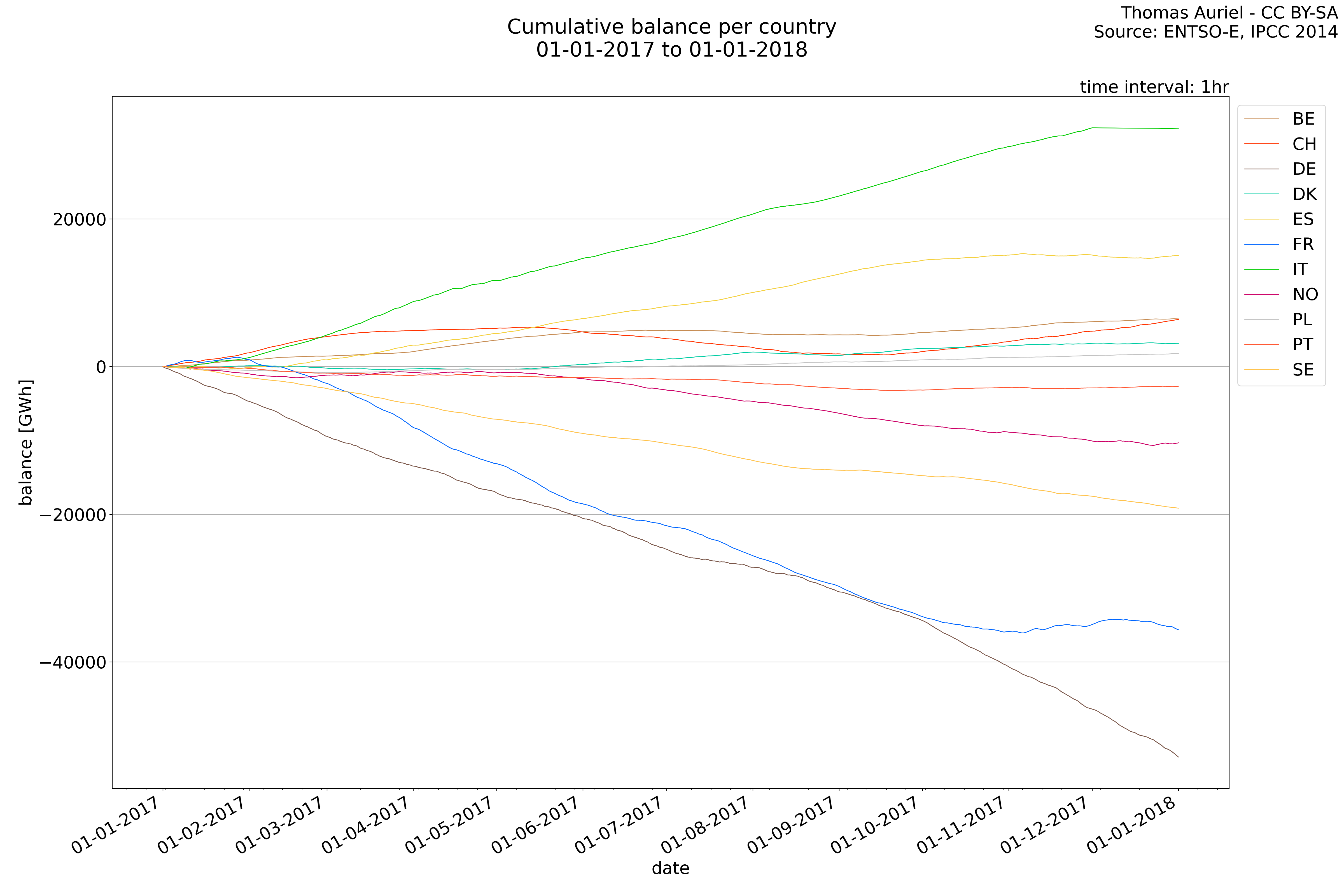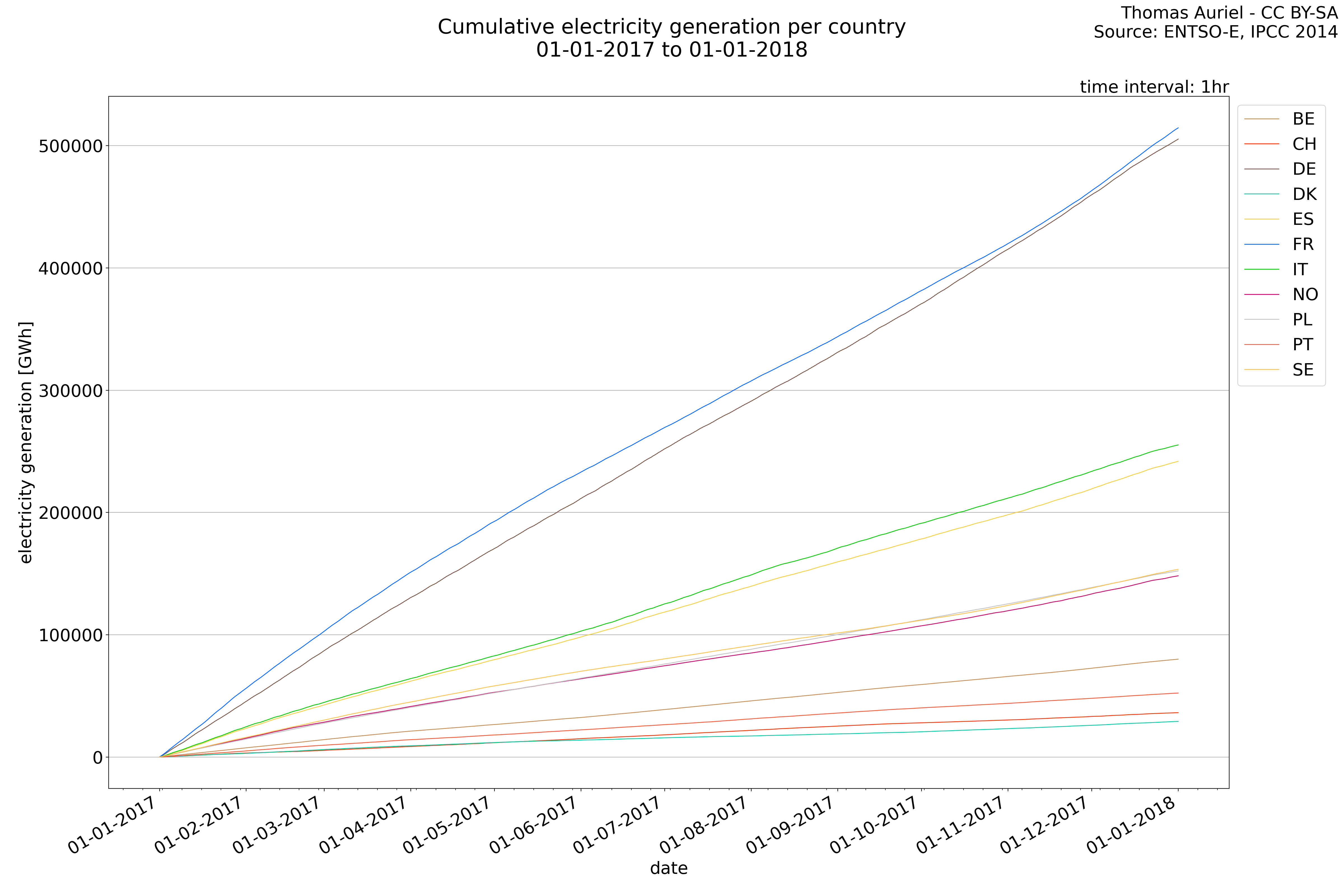 In these hourly line plots, the x-axis spans the entire year, with hours as individual data points. The y-axis represents the values of production, exchange, consumption, and data emissions, but unlike cumulative plots, these plots are designed for quality control purposes. Each line on the plot corresponds to a specific country and is used to identify data irregularities, holes, or artifacts that may occur within the year. By examining these plots, it is possible to spot discrepancies or missing data points in the hourly records, ensuring data integrity.