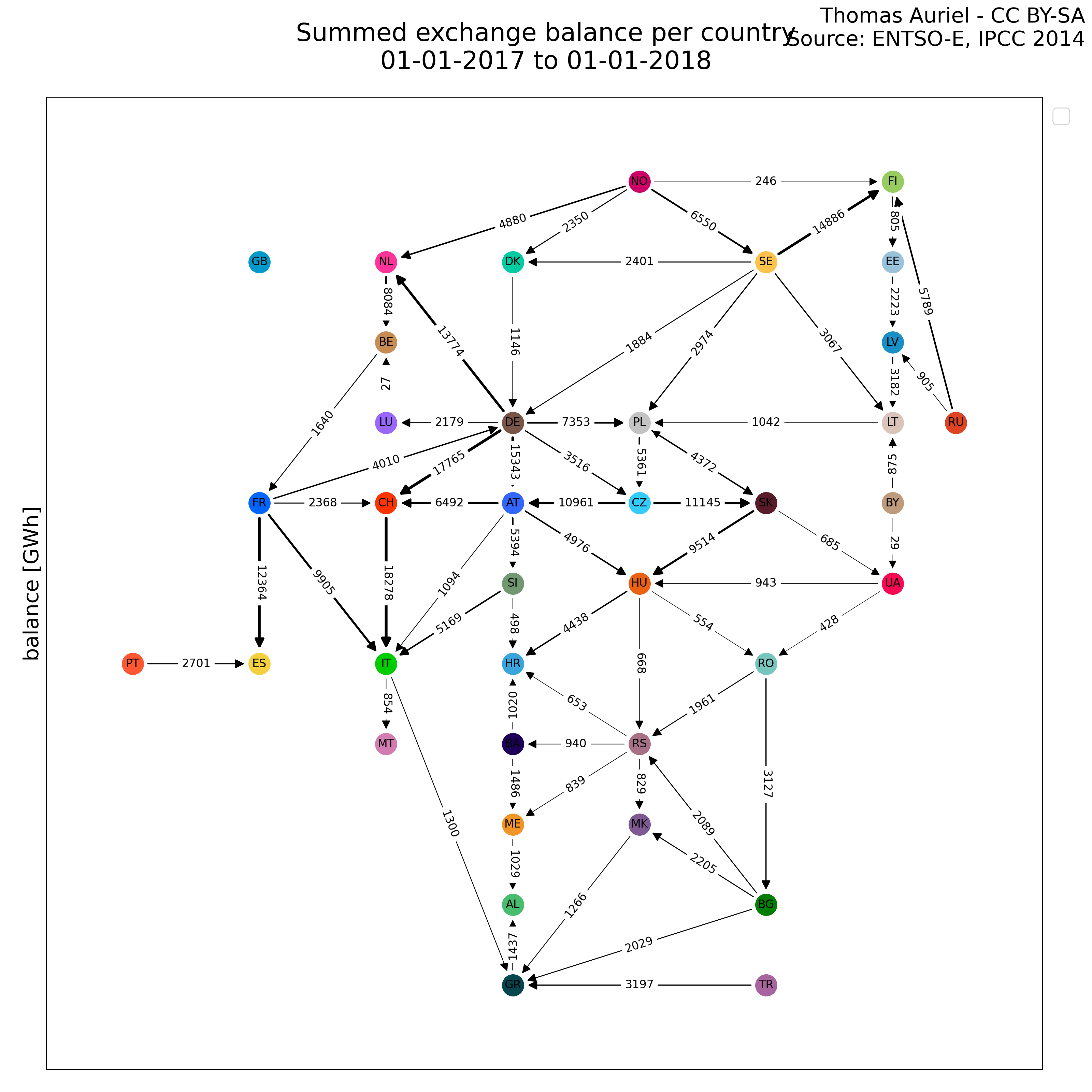 Graph network representations visualize complex interactions and electricity exchange among countries. Nodes represent individual countries, labeled with their iso code. Links illustrate the flow, direction, and intensity of exchanges, with wider links denoting greater exchange values. This representation aids in identifying countries with significant interactions and offers insights into international relationships.