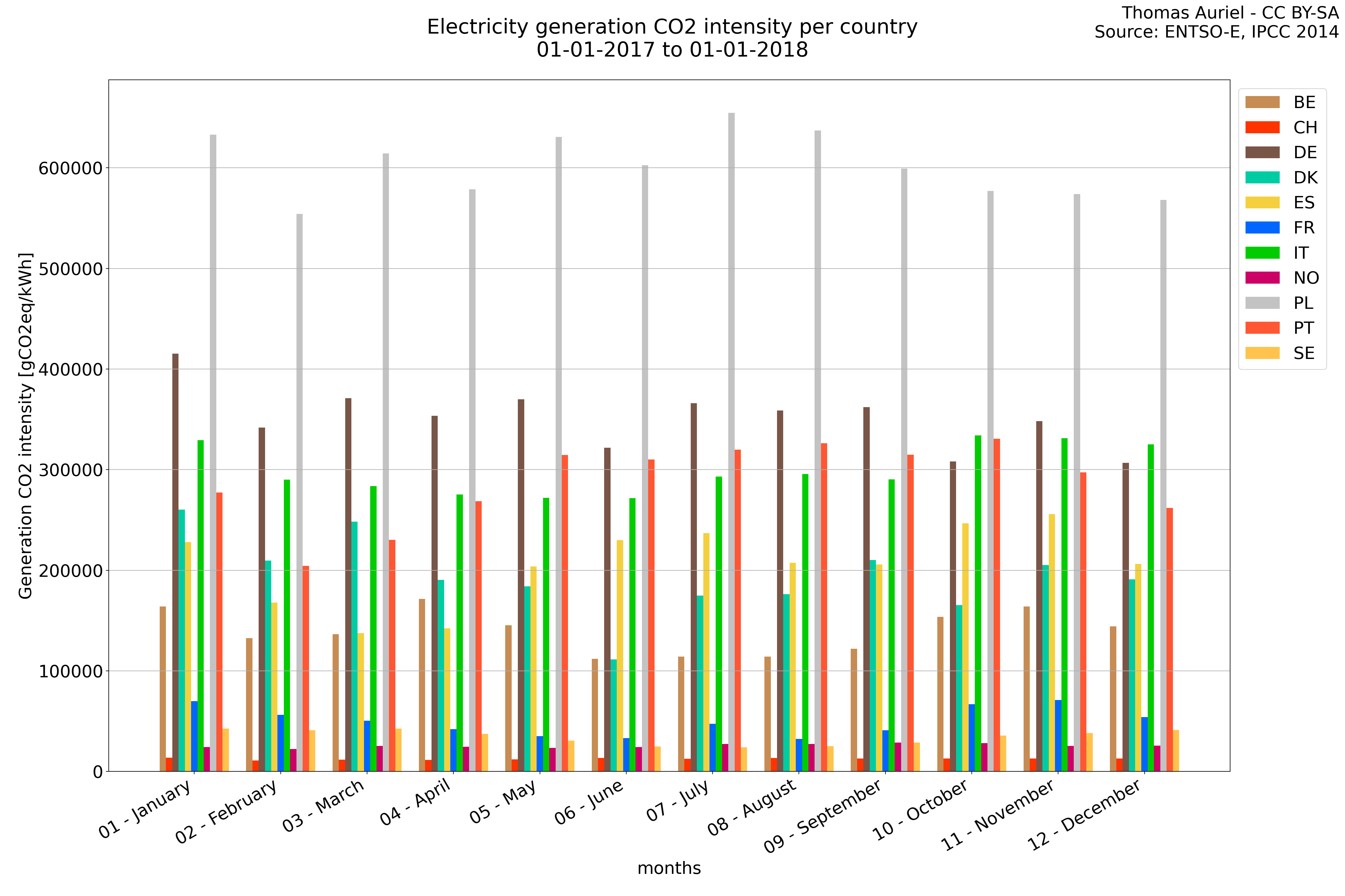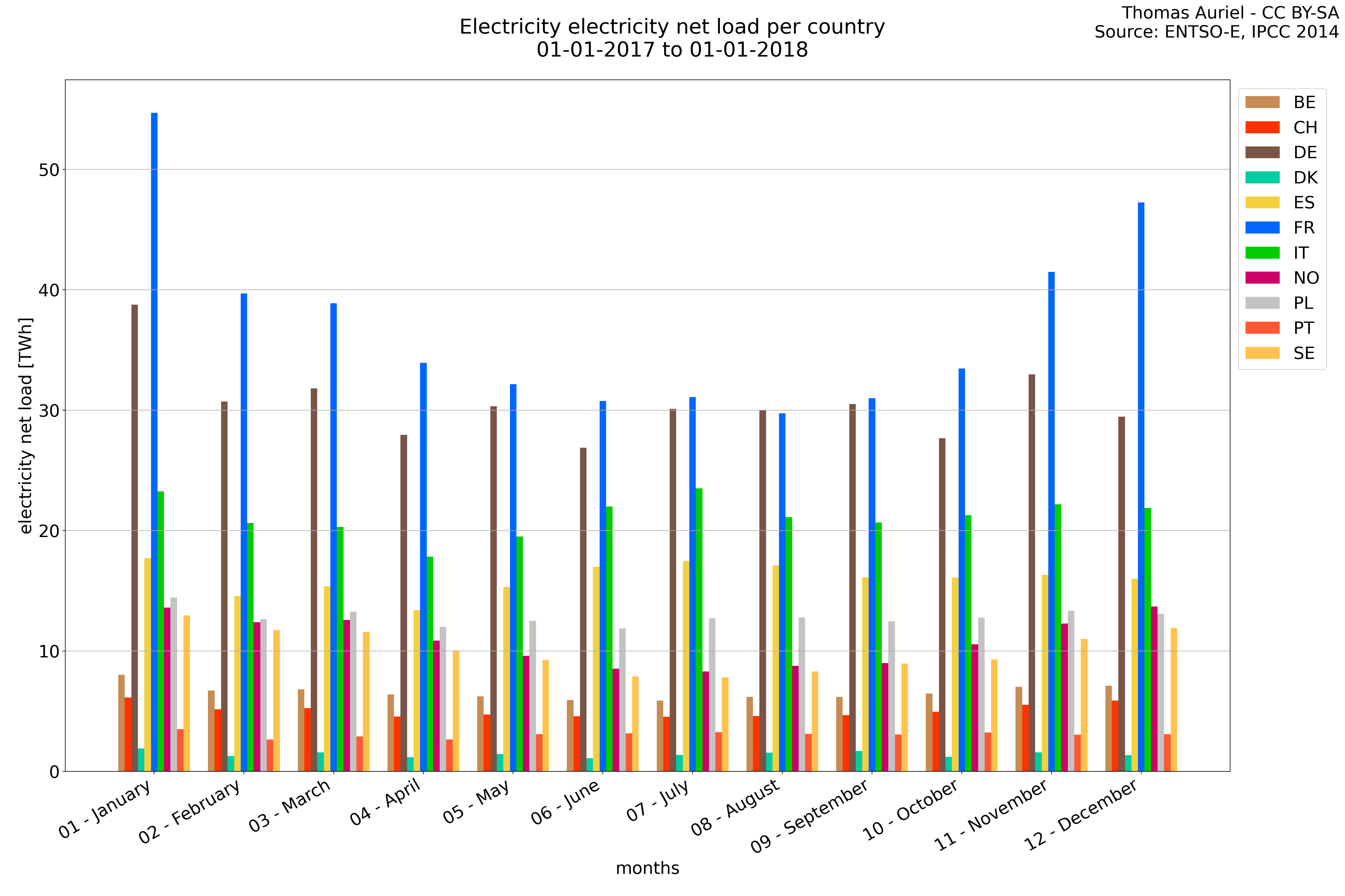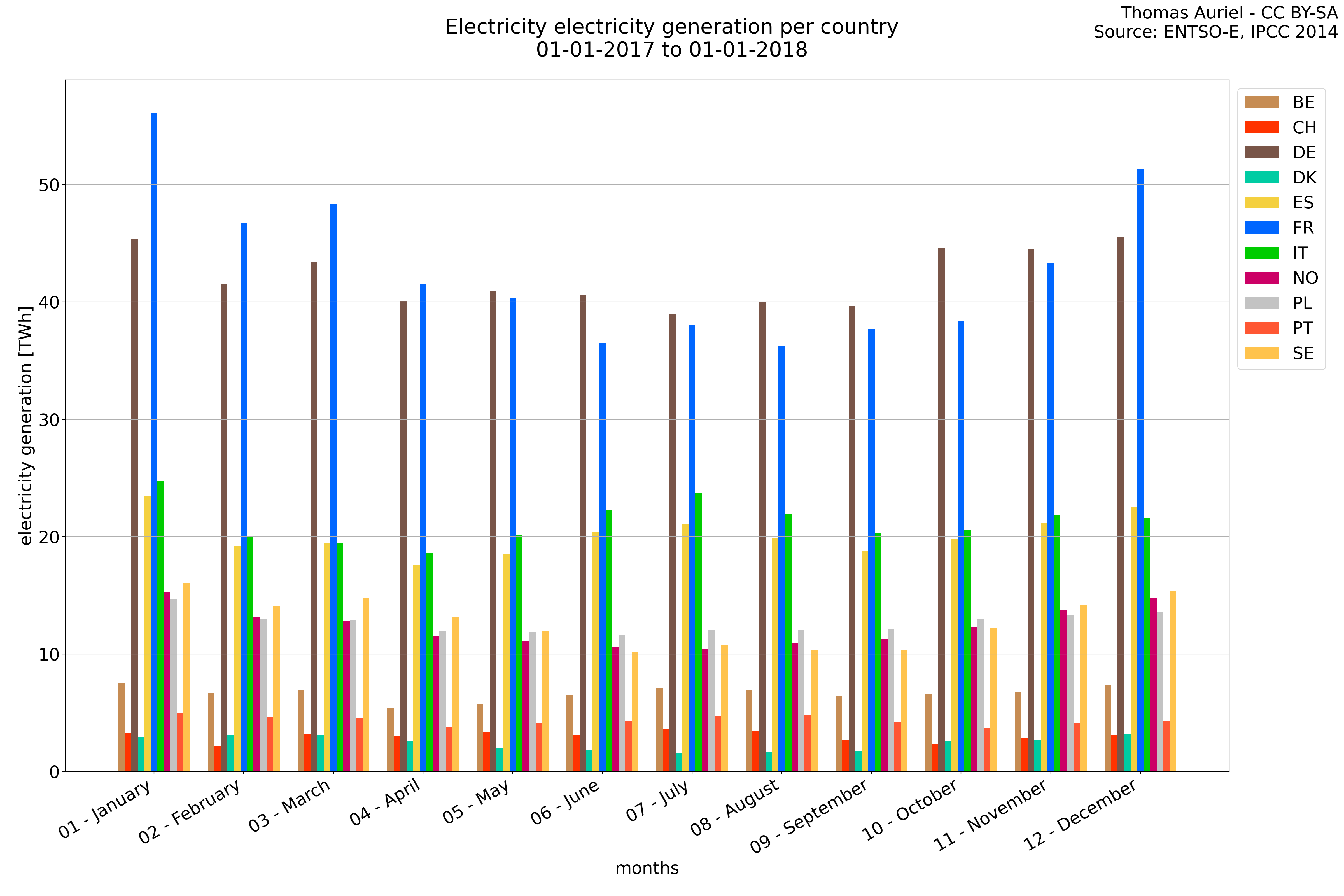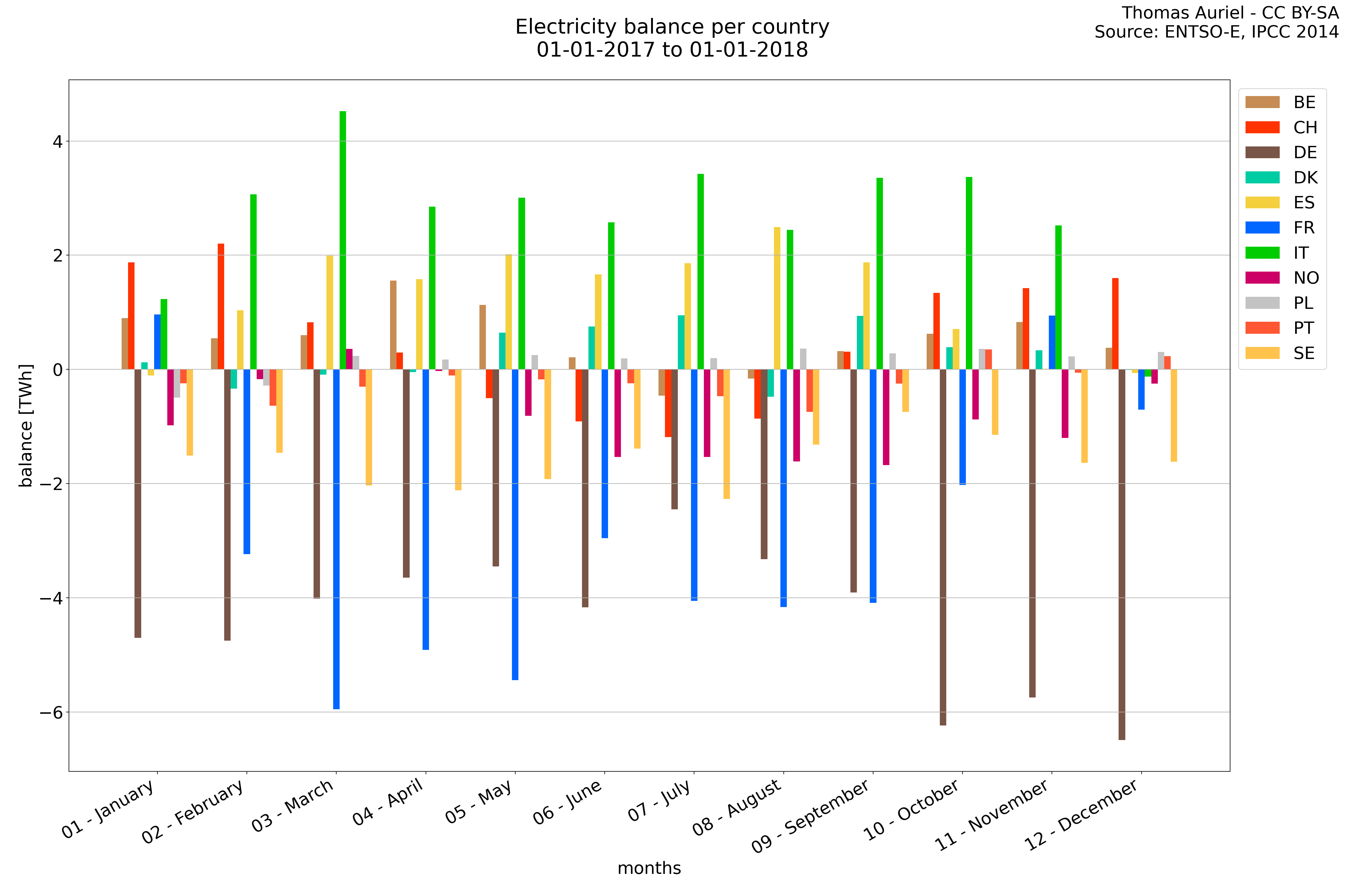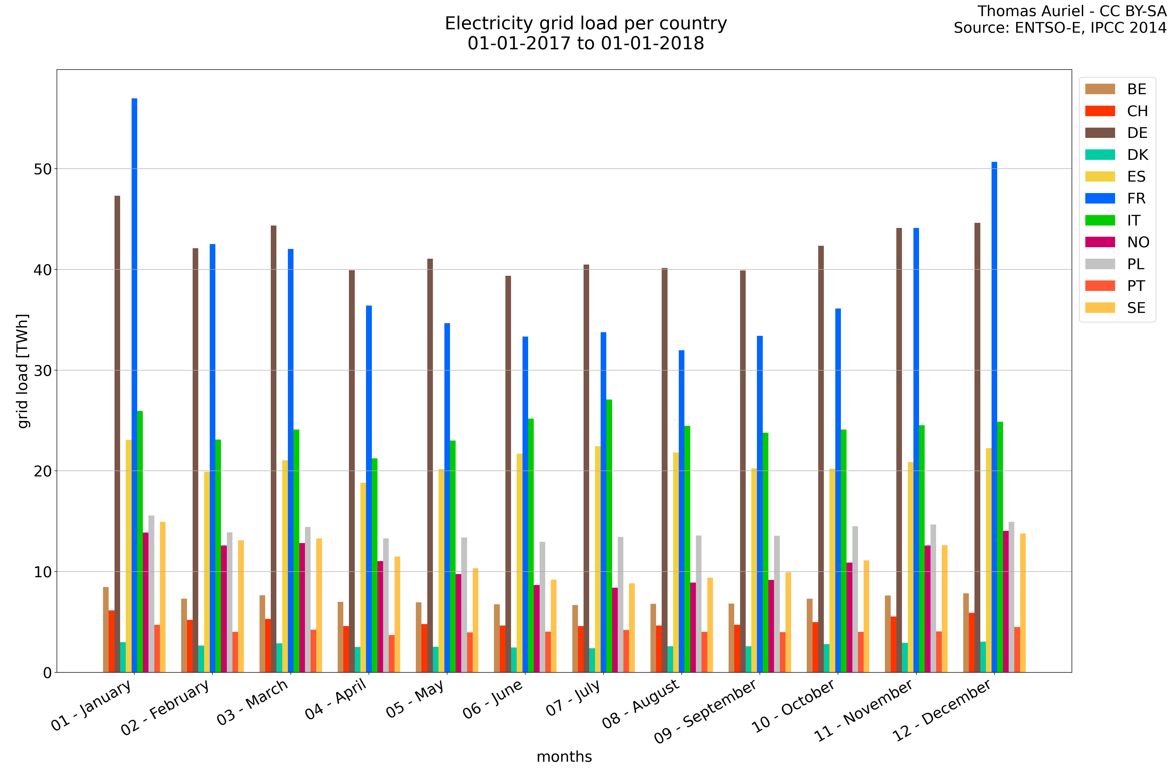 A periode plot takes a general view of the data by summing all the values over each month and presents them as a stacked bar plot. This visualization method allows for a clear understanding of how each country grid change over months. Then the Periode plot does not provide time-based trends but instead give an insight on the composition of the data within the chosen period.