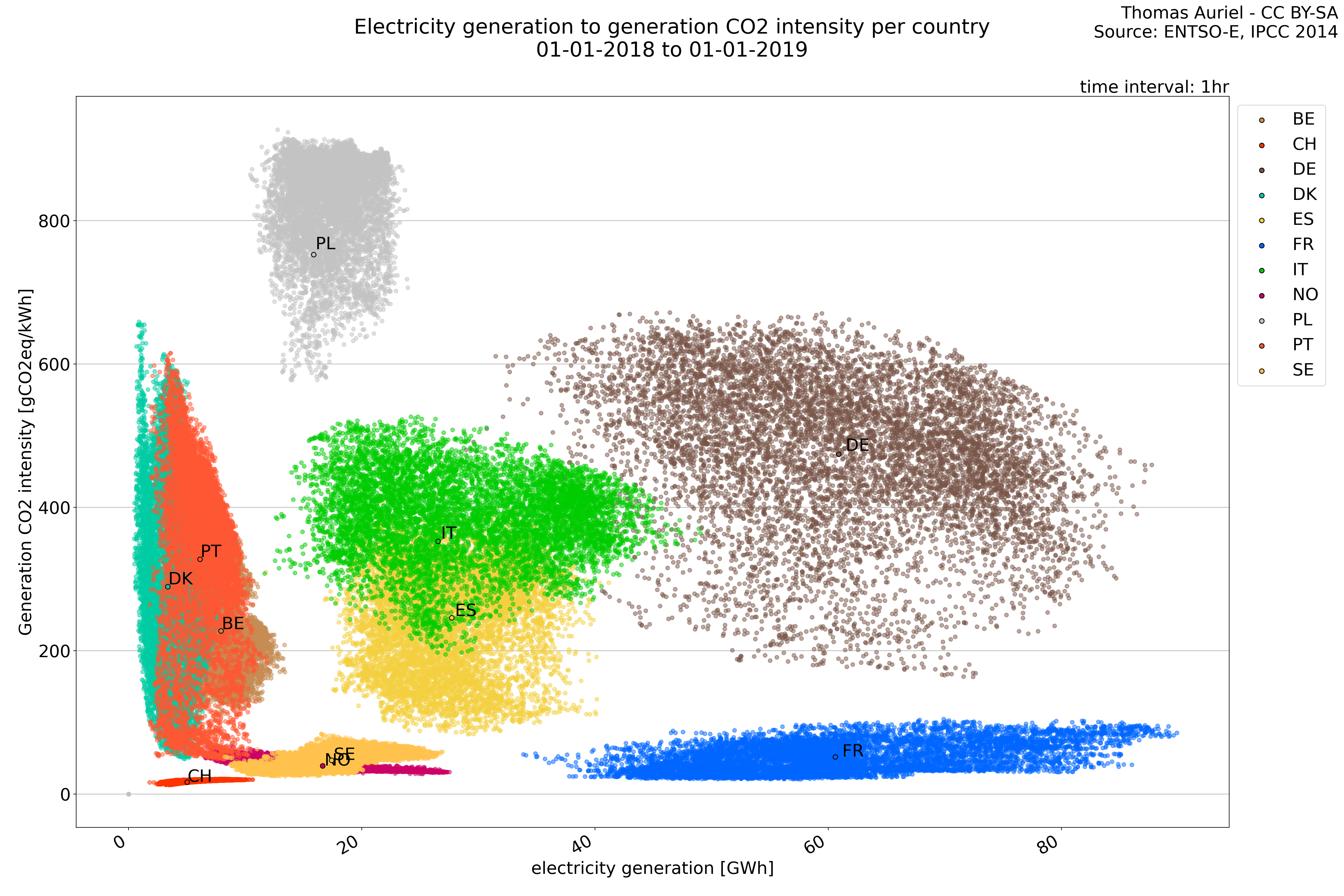 To read the scatter plot, locate a point on the graph and trace it back to both axes. The x-axis value gives the hour of production, and the y-axis value gives the CO2 intensity for that hour. By examining where the points are clustered, you can identify trends. For example, a cluster of points towards the lower right might indicate that higher production hours are associated with lower CO2 intensity for a particular country.