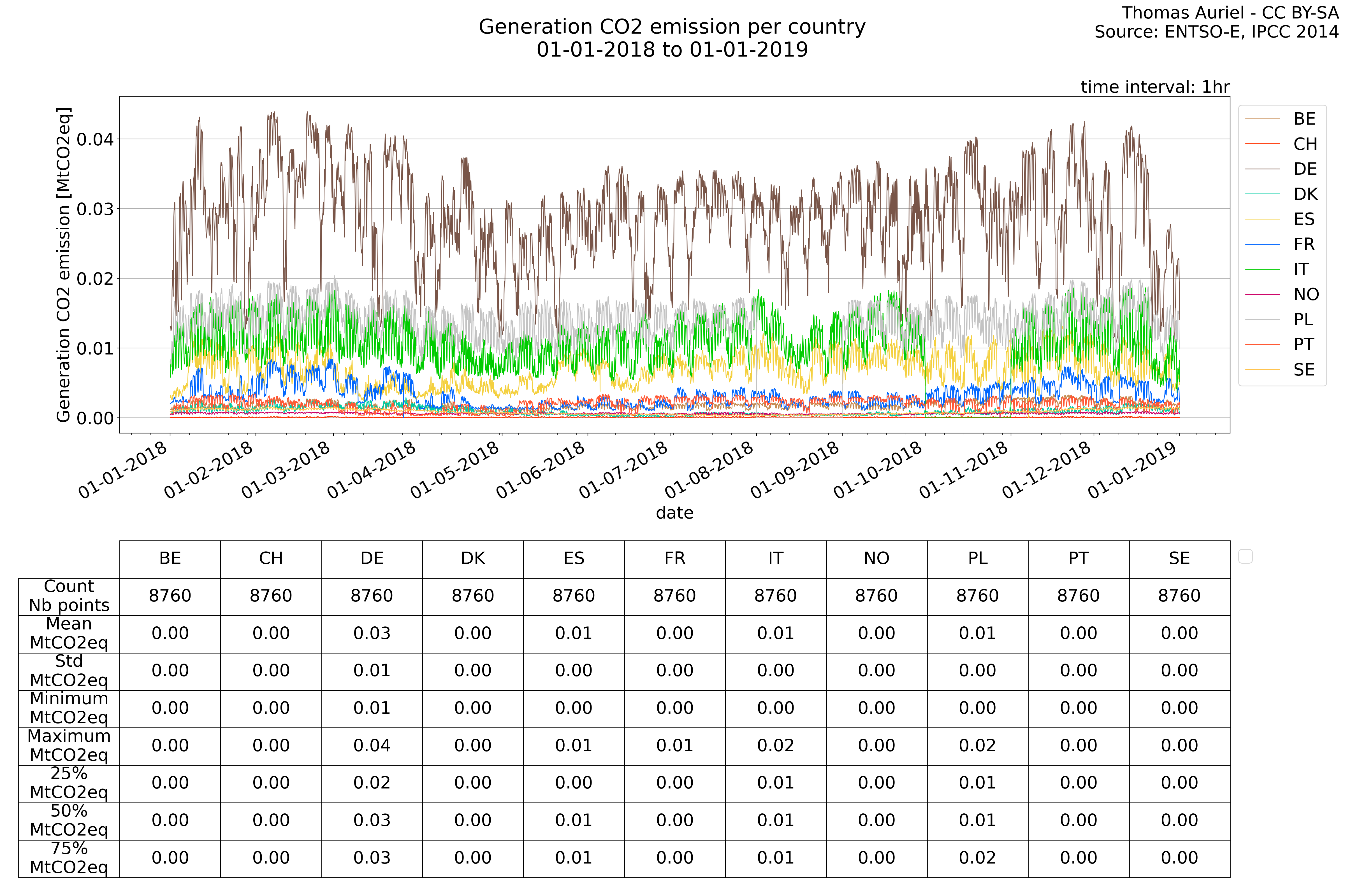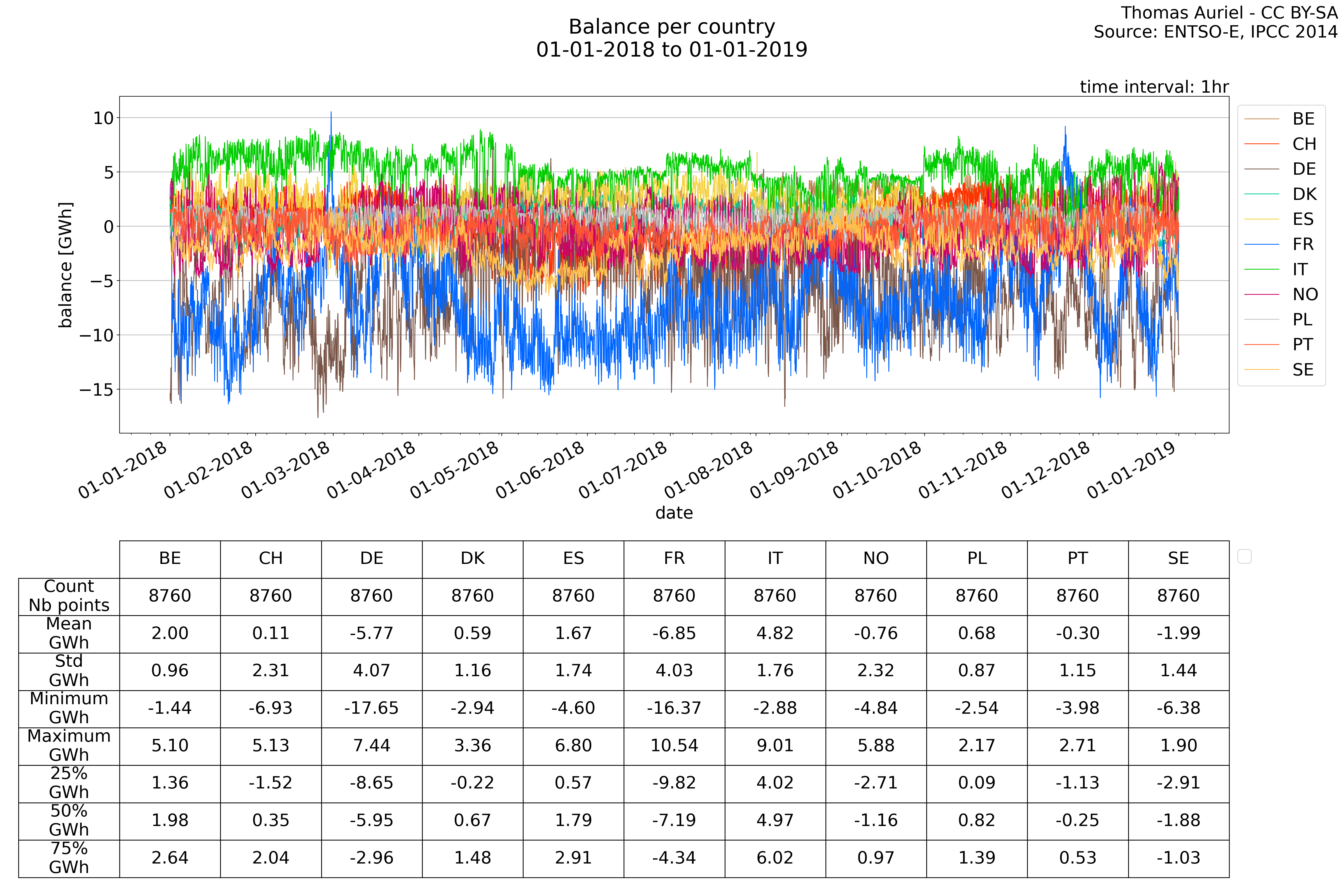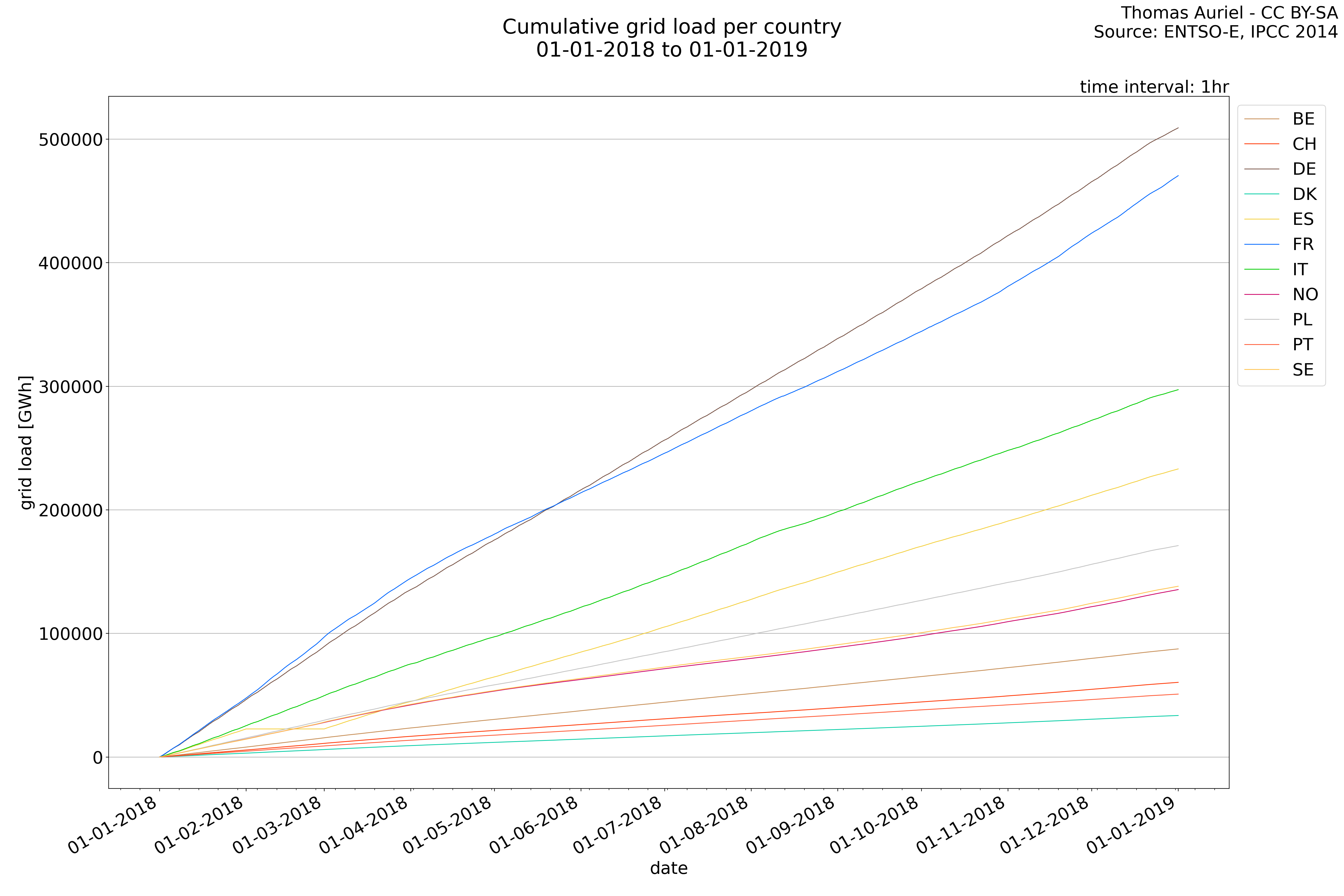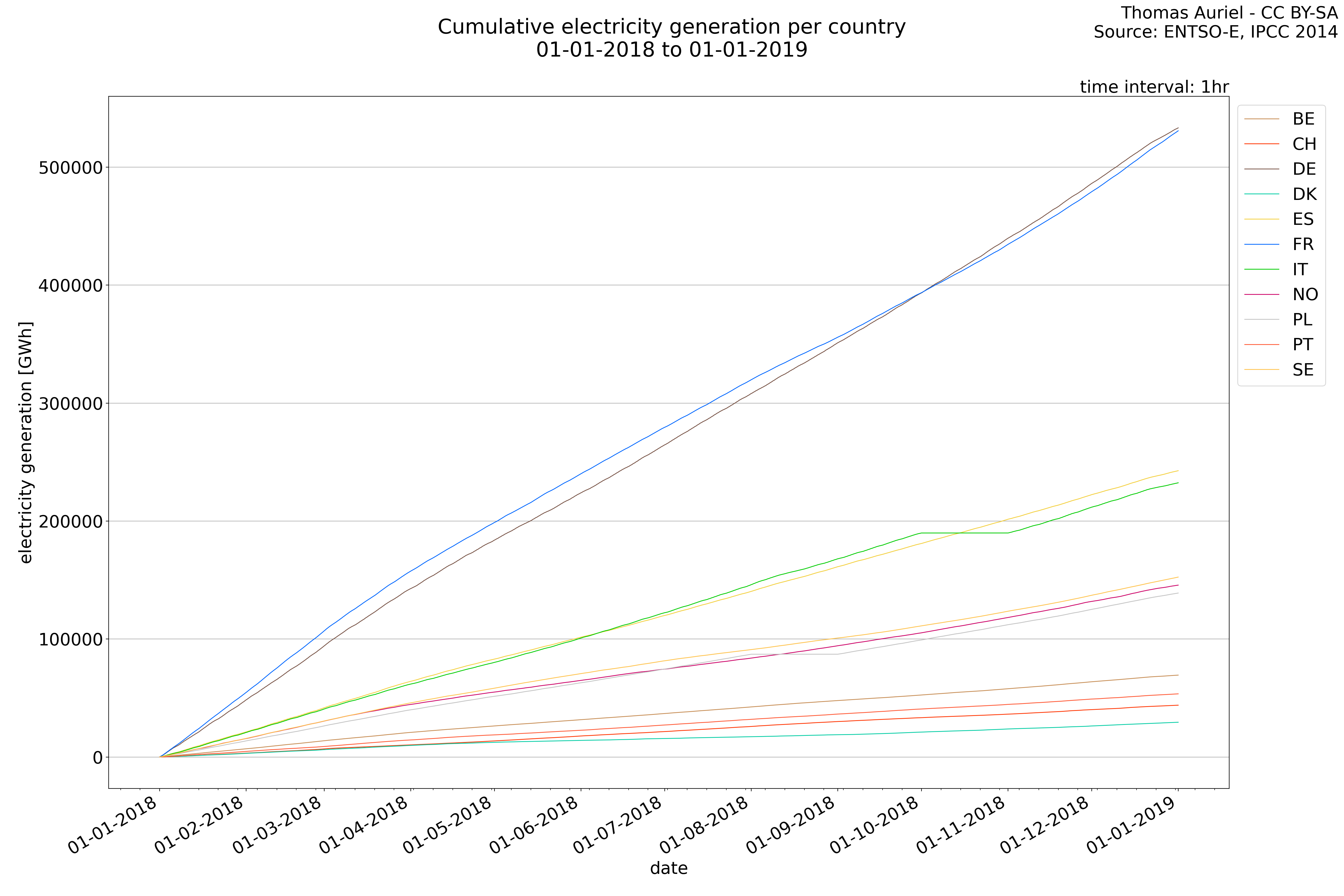 In these hourly line plots, the x-axis spans the entire year, with hours as individual data points. The y-axis represents the values of production, exchange, consumption, and data emissions, but unlike cumulative plots, these plots are designed for quality control purposes. Each line on the plot corresponds to a specific country and is used to identify data irregularities, holes, or artifacts that may occur within the year. By examining these plots, it is possible to spot discrepancies or missing data points in the hourly records, ensuring data integrity.