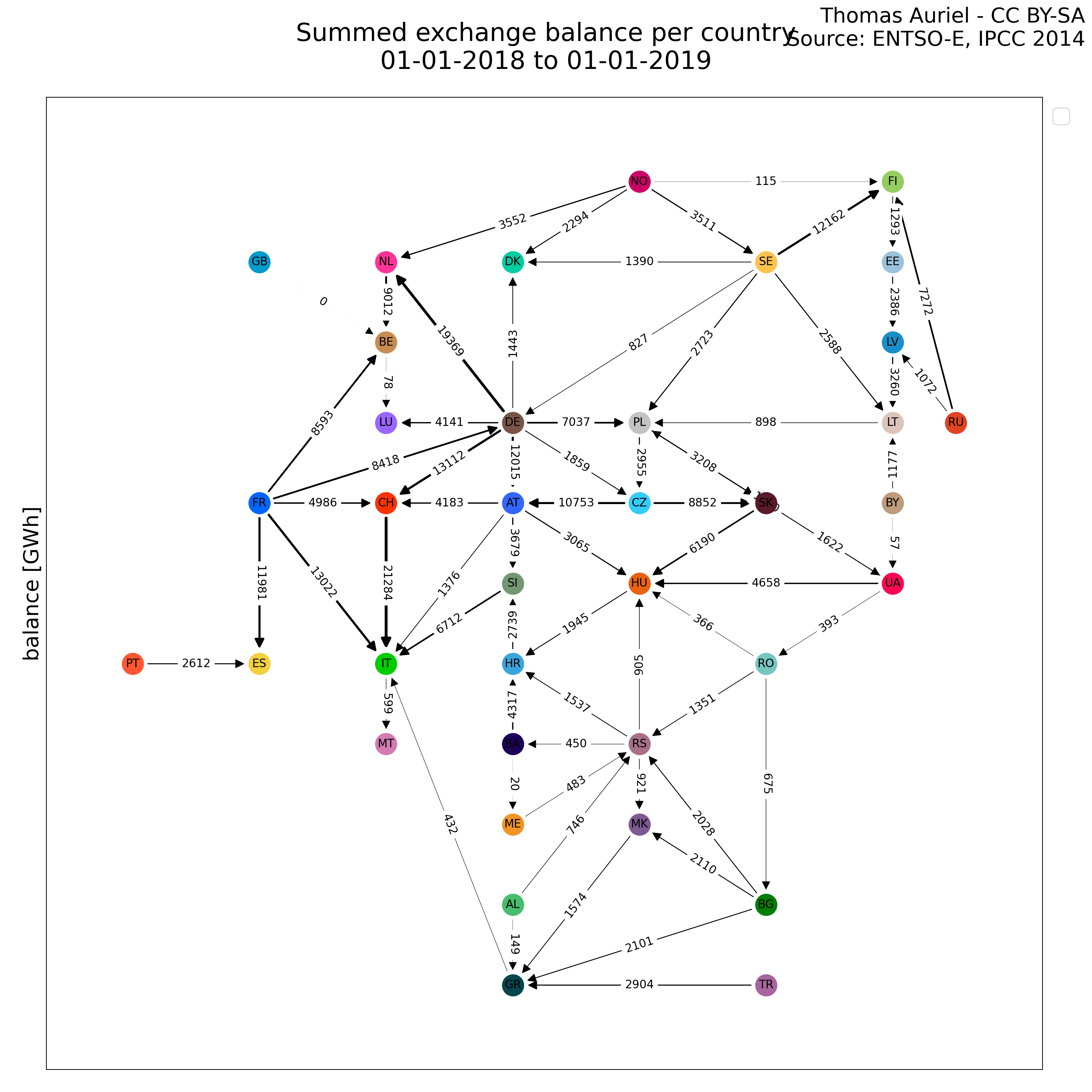 Graph network representations visualize complex interactions and electricity exchange among countries. Nodes represent individual countries, labeled with their iso code. Links illustrate the flow, direction, and intensity of exchanges, with wider links denoting greater exchange values. This representation aids in identifying countries with significant interactions and offers insights into international relationships.