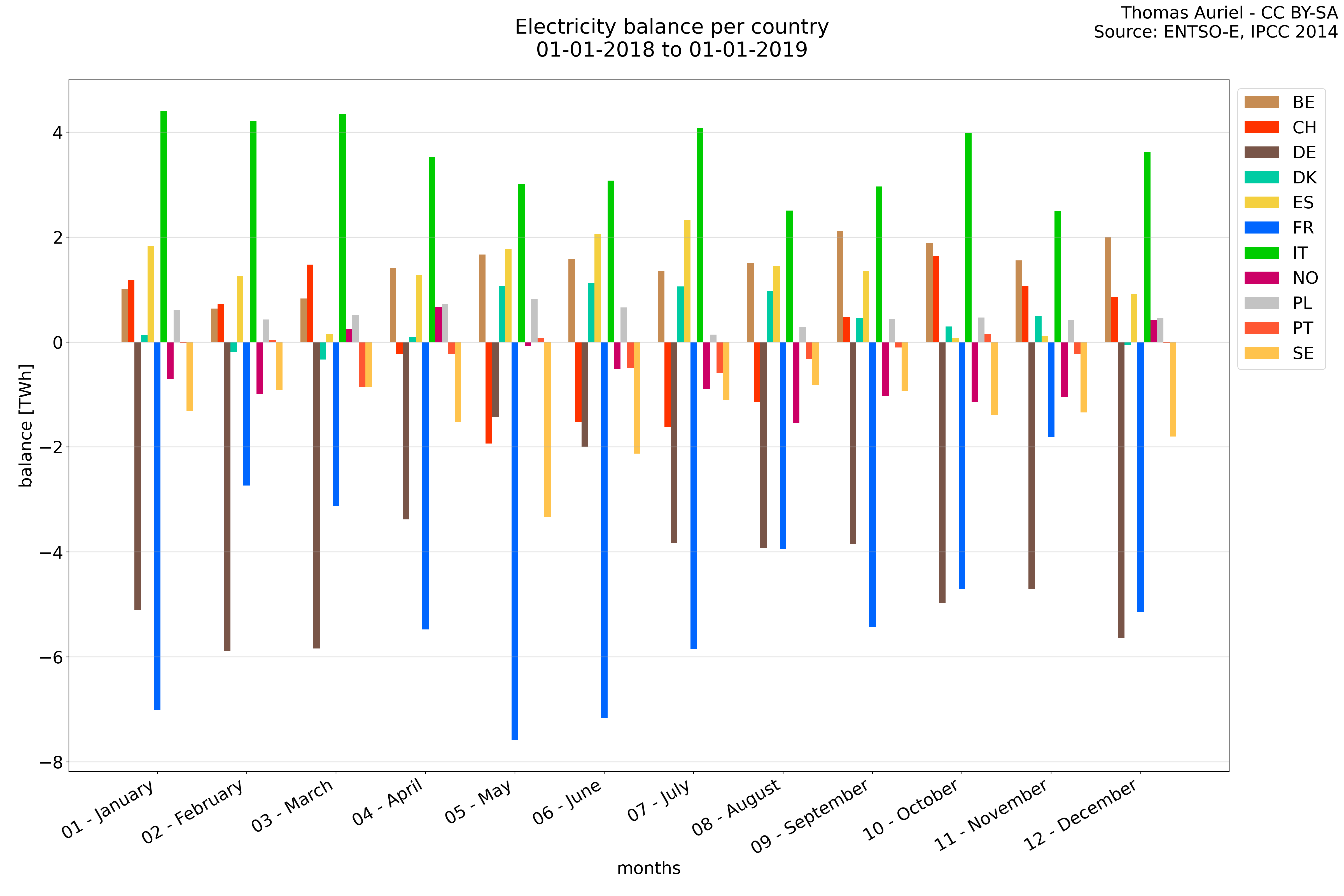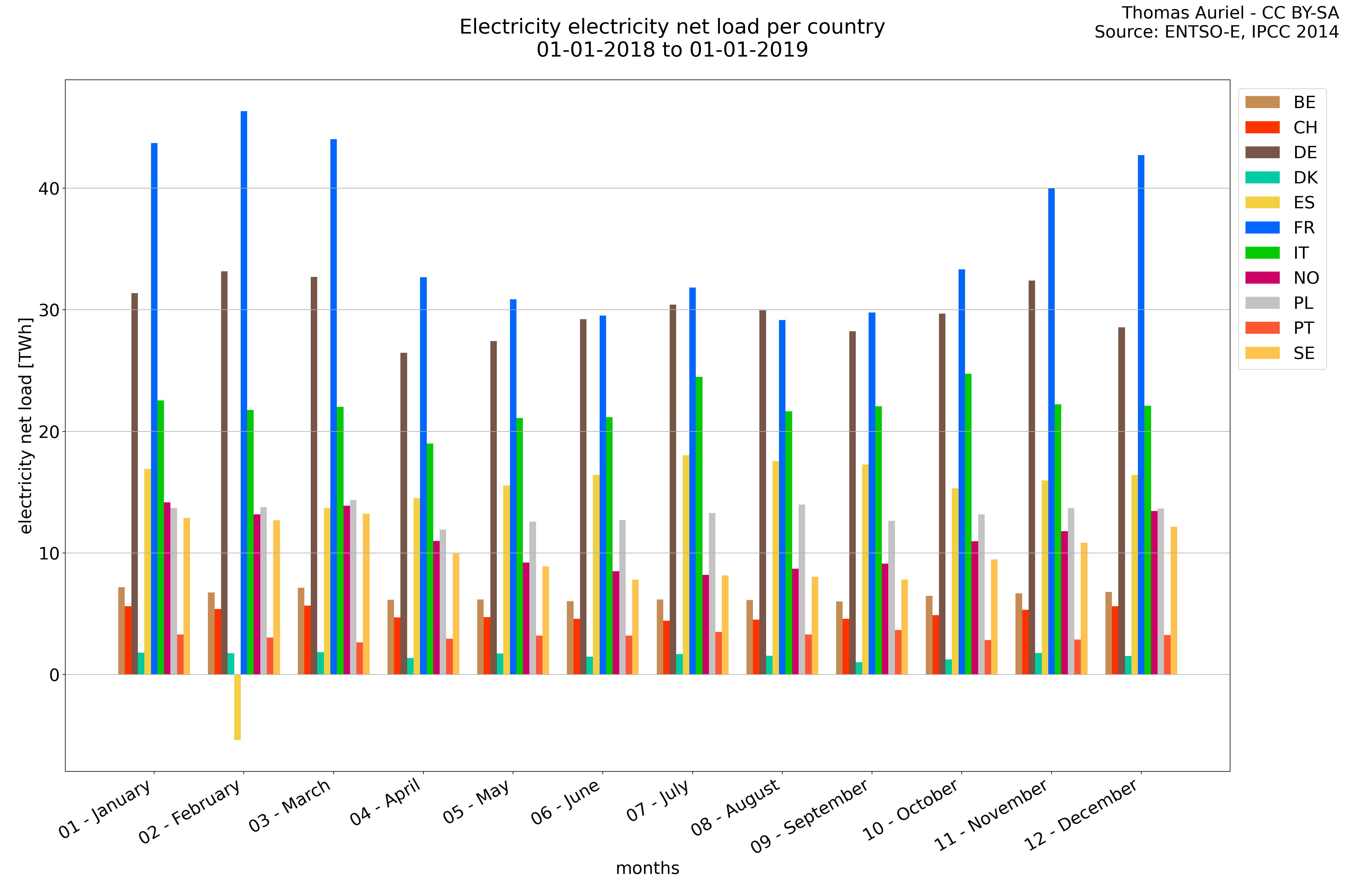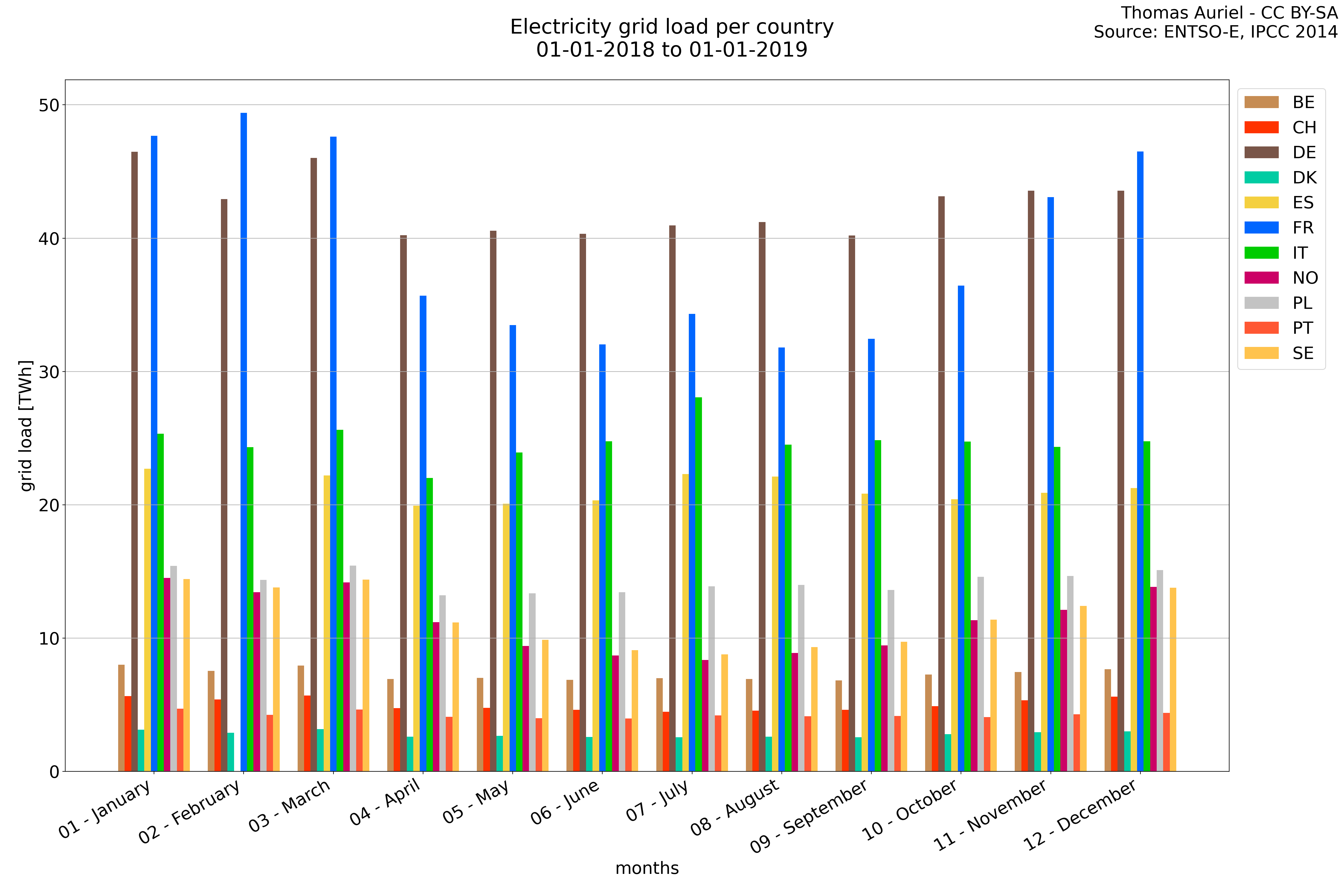 A periode plot takes a general view of the data by summing all the values over each month and presents them as a stacked bar plot. This visualization method allows for a clear understanding of how each country grid change over months. Then the Periode plot does not provide time-based trends but instead give an insight on the composition of the data within the chosen period.