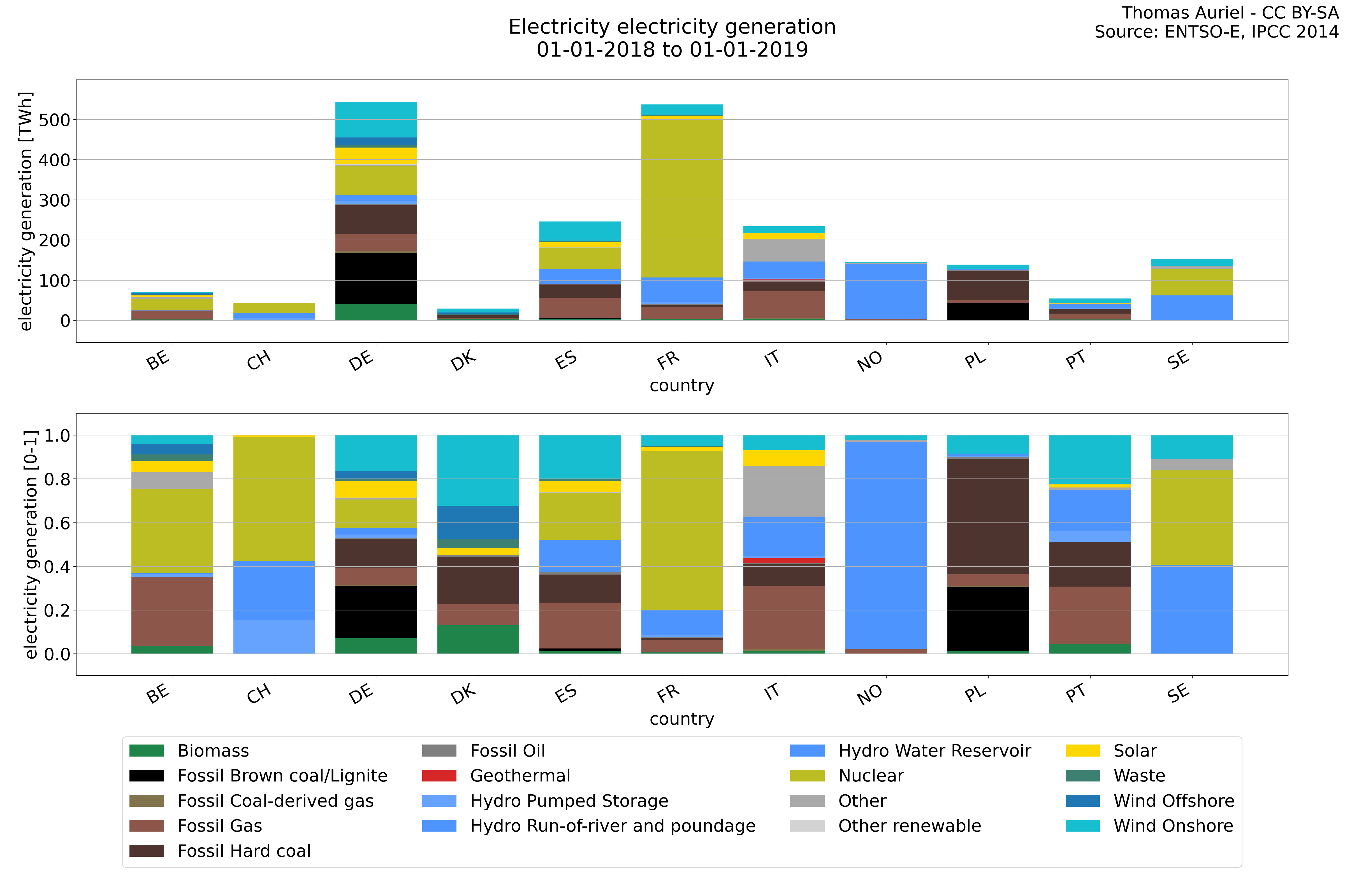 In these stacked bar plots, each bar represents a specific country. The bars are divided into sections that depict the decomposition of production, exchange, and CO2 emissions over the year. Two versions are presented: one displaying absolute values, and the other showing relative values. In the absolute values plot, each country's bar illustrates the absolute amounts of these components during the year. The relative values plot showcases the proportion of each component within a country's data for the entire year. These stacked bar plots offer insights into how production, exchange, and CO2 emissions vary across countries, aiding in comparative analysis.