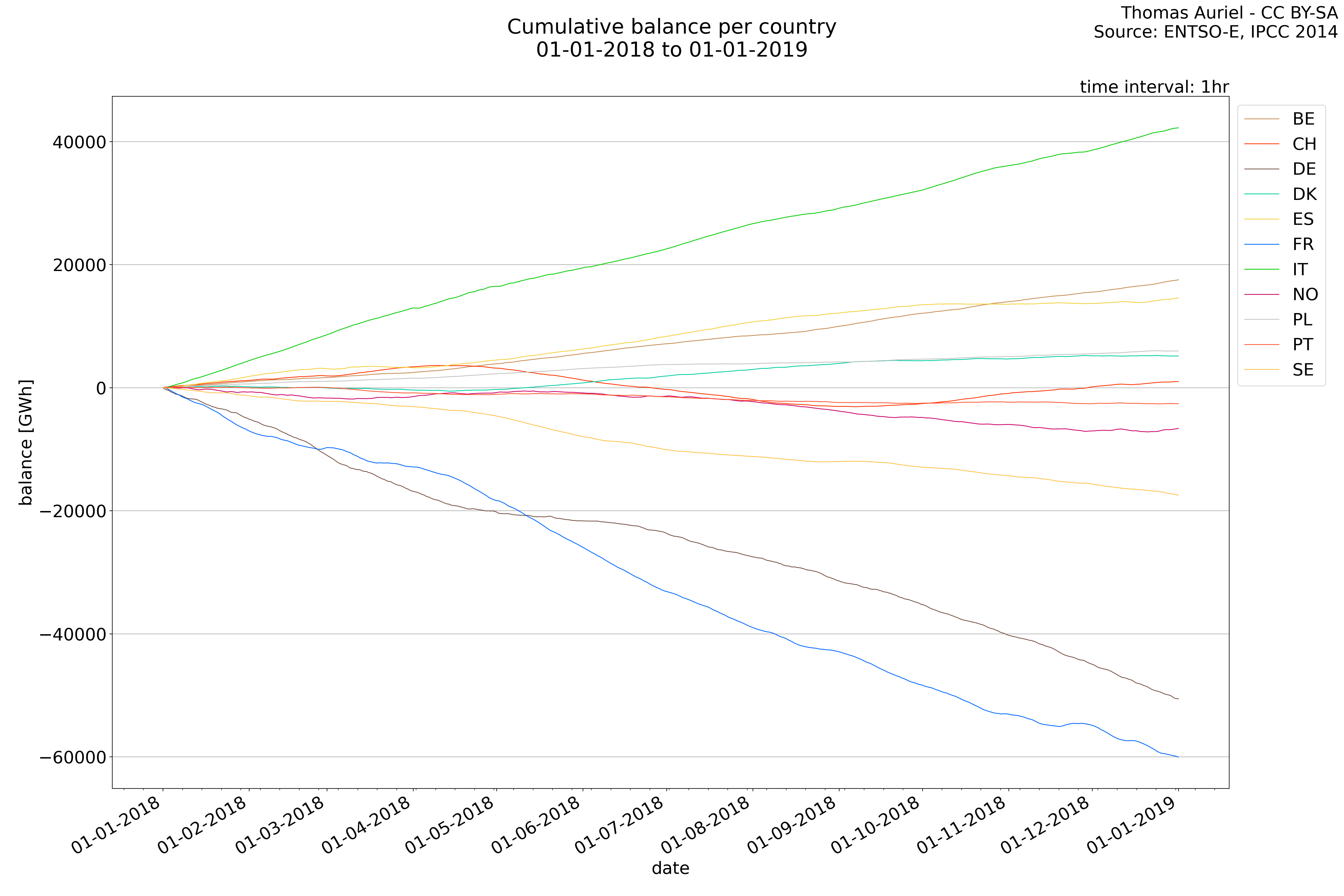 In these cumulative line plots, the x-axis spans the entire year, with hours as individual data points. The y-axis represents the cumulative total of production, exchange, consumption, and data emissions. Each line on the plot corresponds to a distinct country, providing a comprehensive view of how these variables evolve throughout the year. These plots offer insights into the annual evolution for each country.