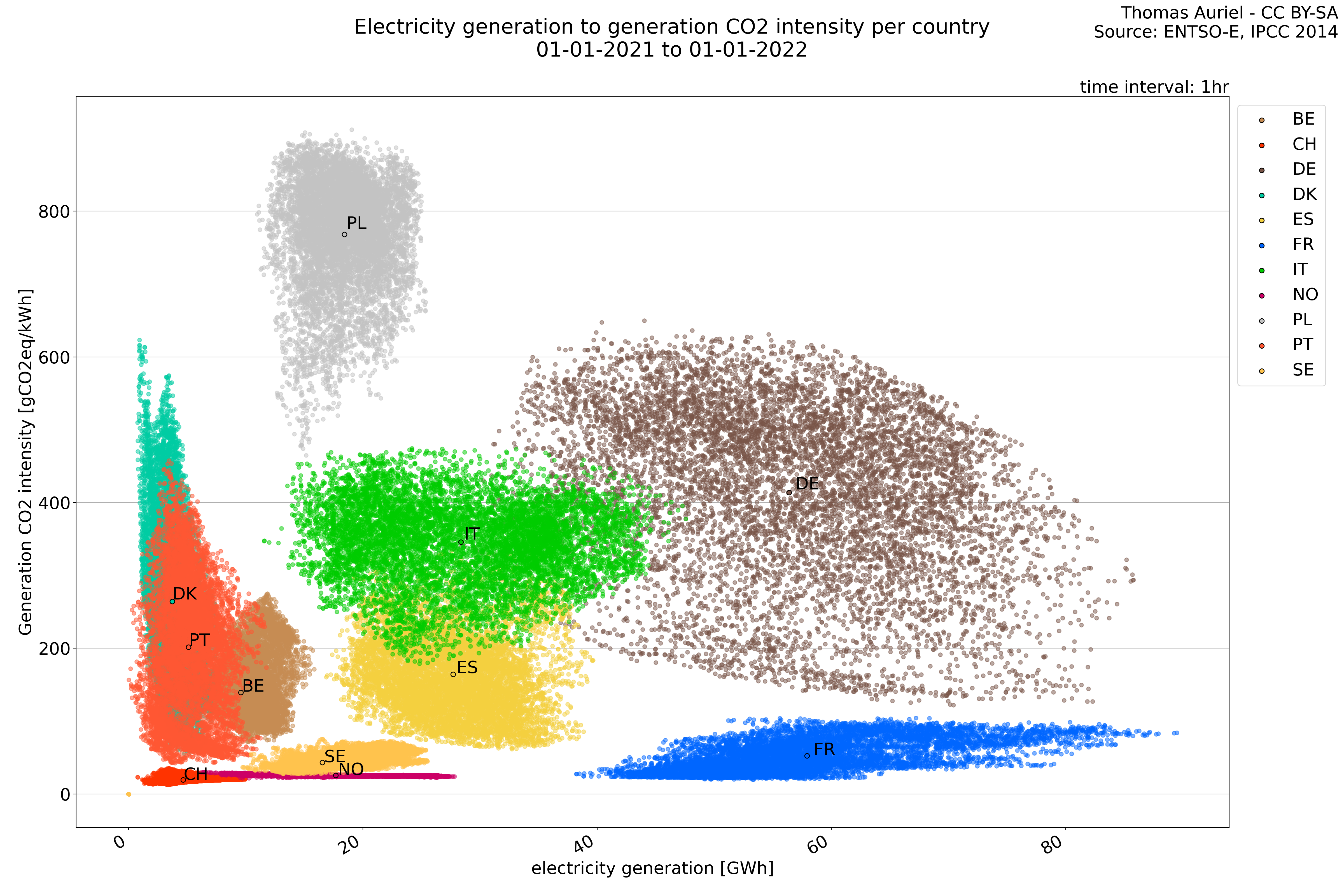 To read the scatter plot, locate a point on the graph and trace it back to both axes. The x-axis value gives the hour of production, and the y-axis value gives the CO2 intensity for that hour. By examining where the points are clustered, you can identify trends. For example, a cluster of points towards the lower right might indicate that higher production hours are associated with lower CO2 intensity for a particular country.