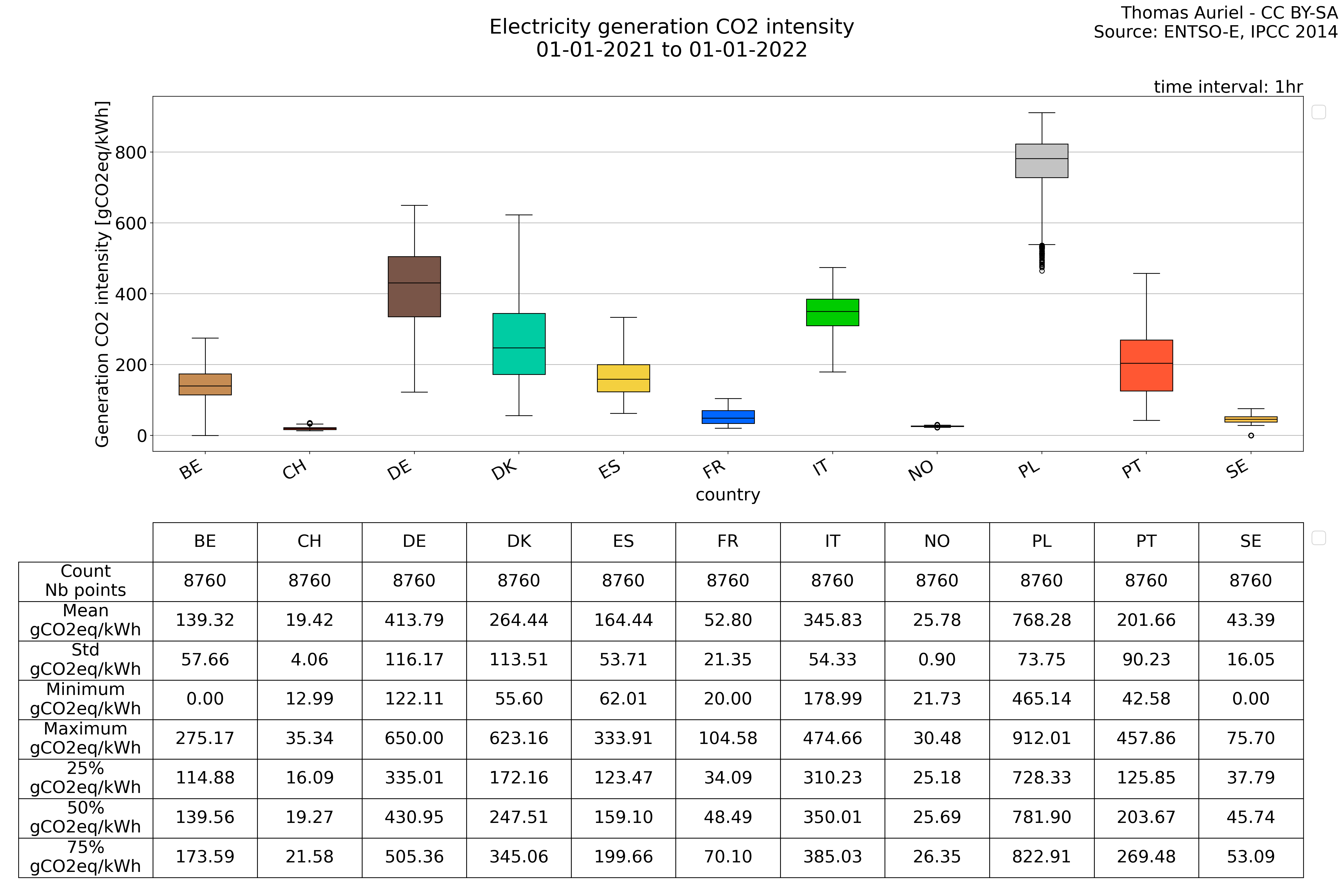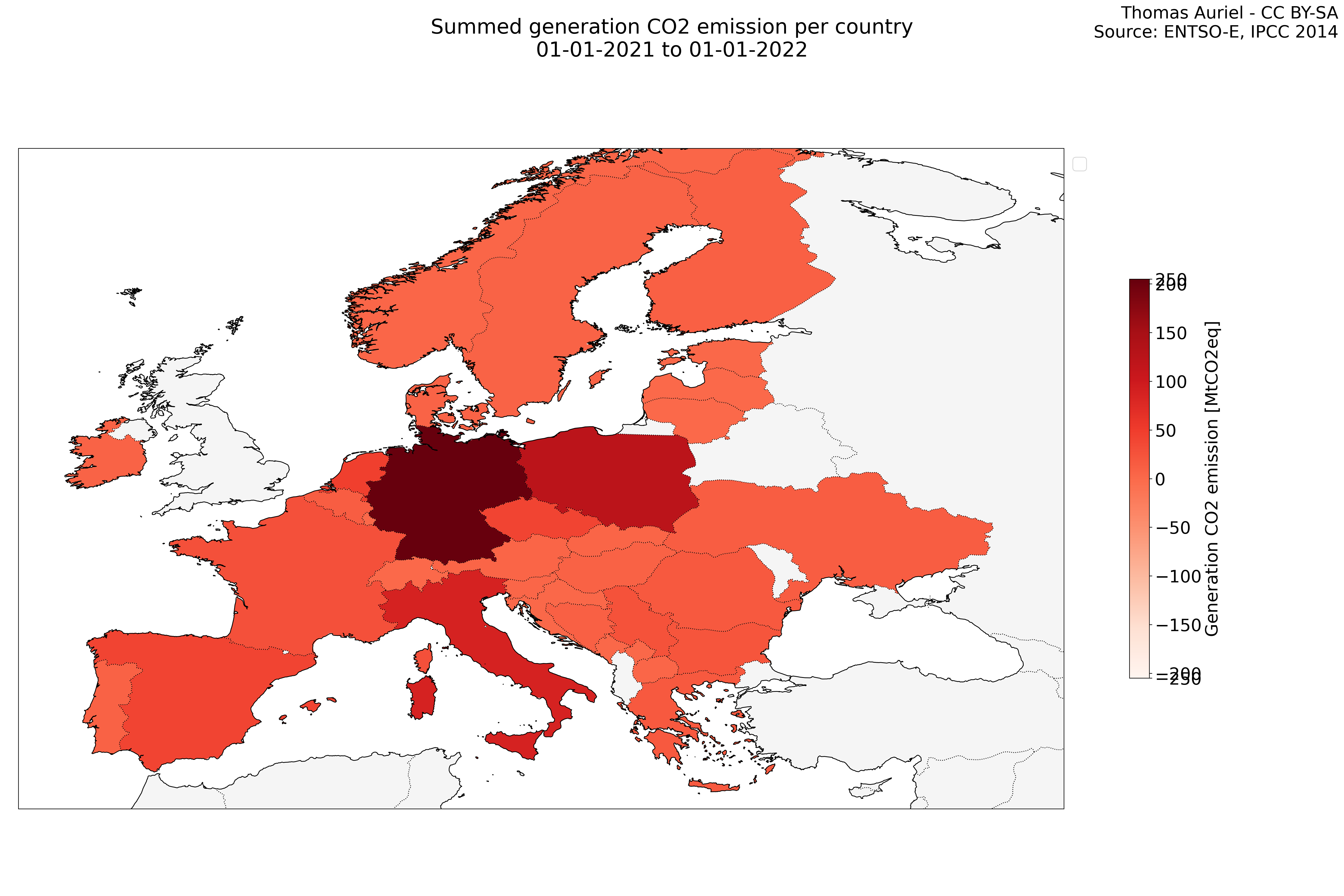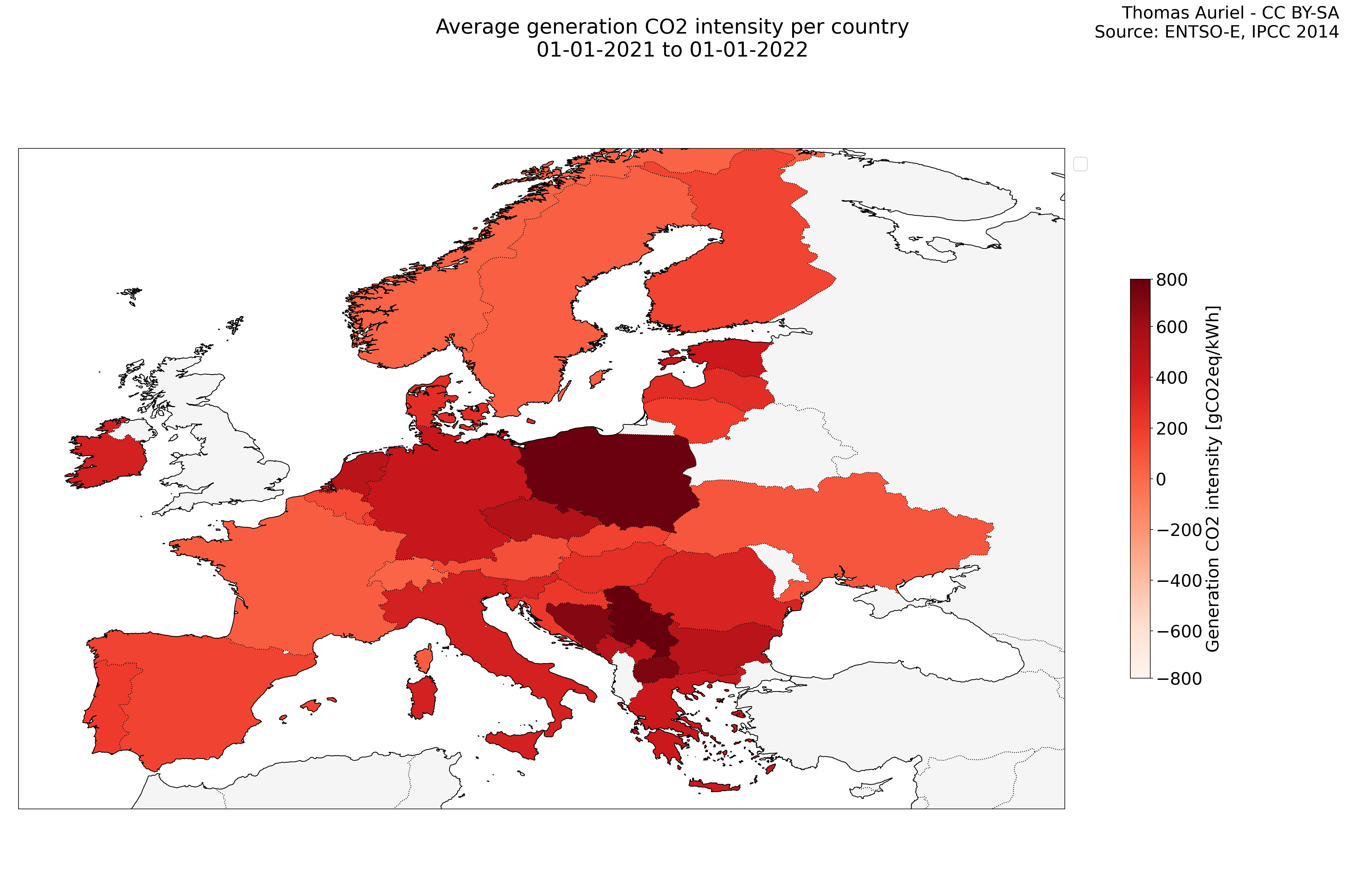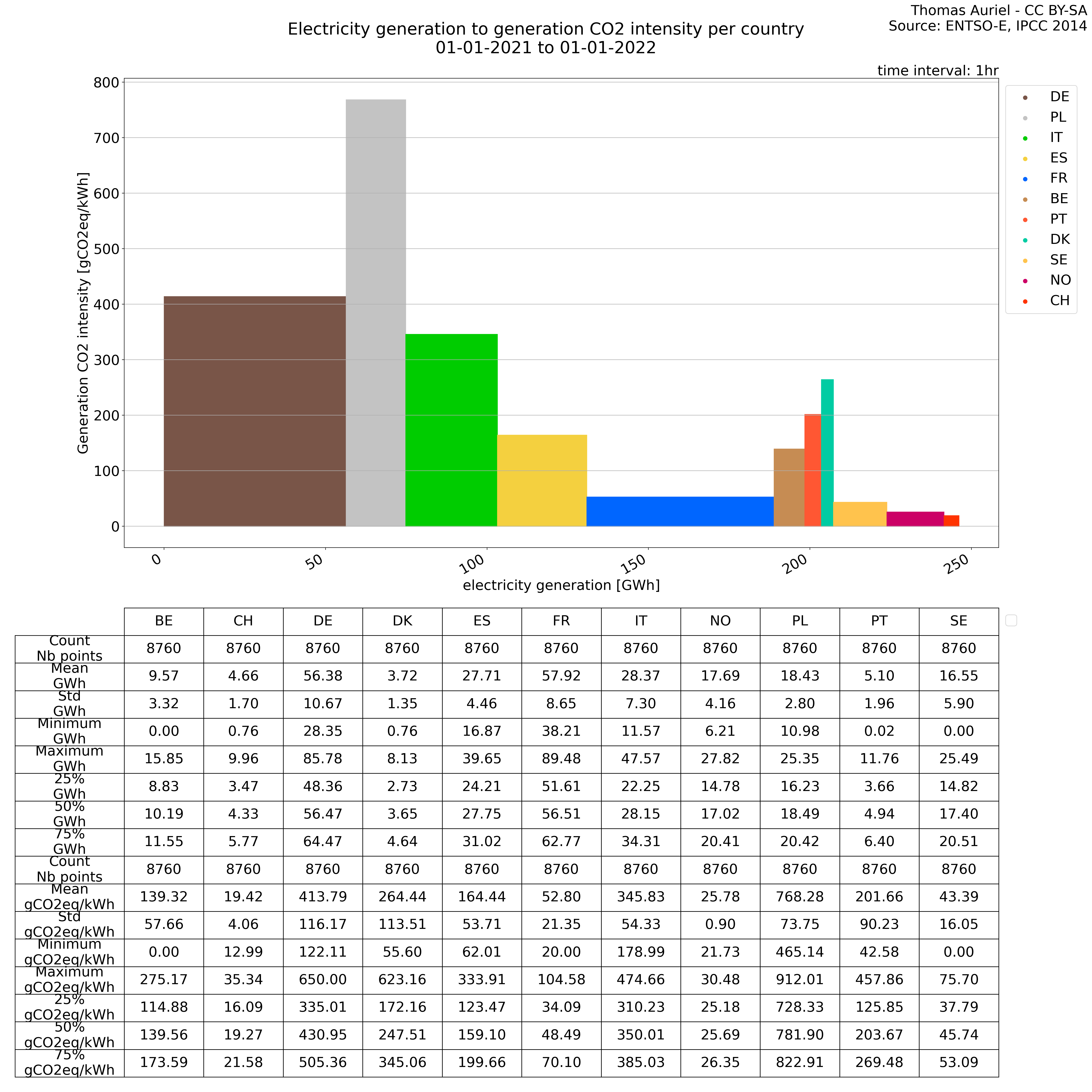 An essential feature of the square plot is the size of each square, which is proportional to the total CO2 emissions of the represented country, calculated by multiplying CO2 intensity with production. Larger squares indicate higher emissions.