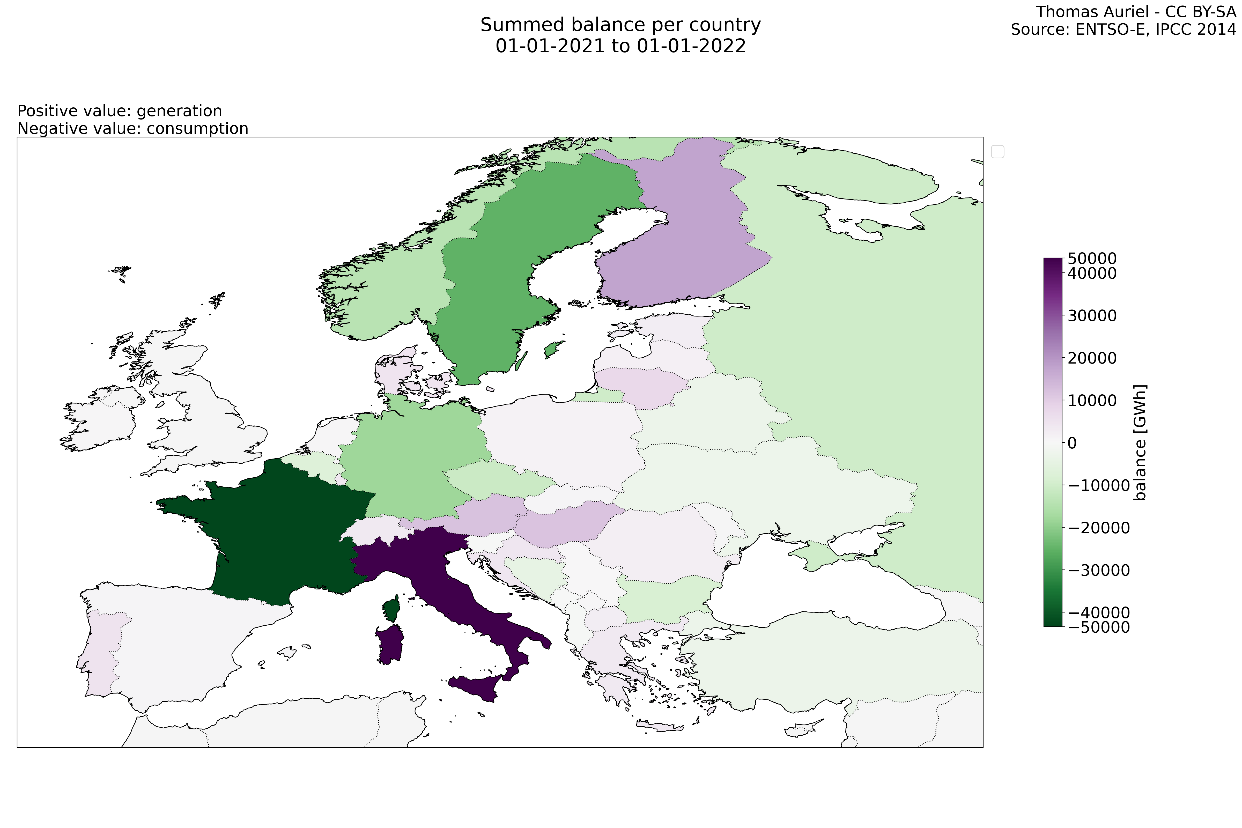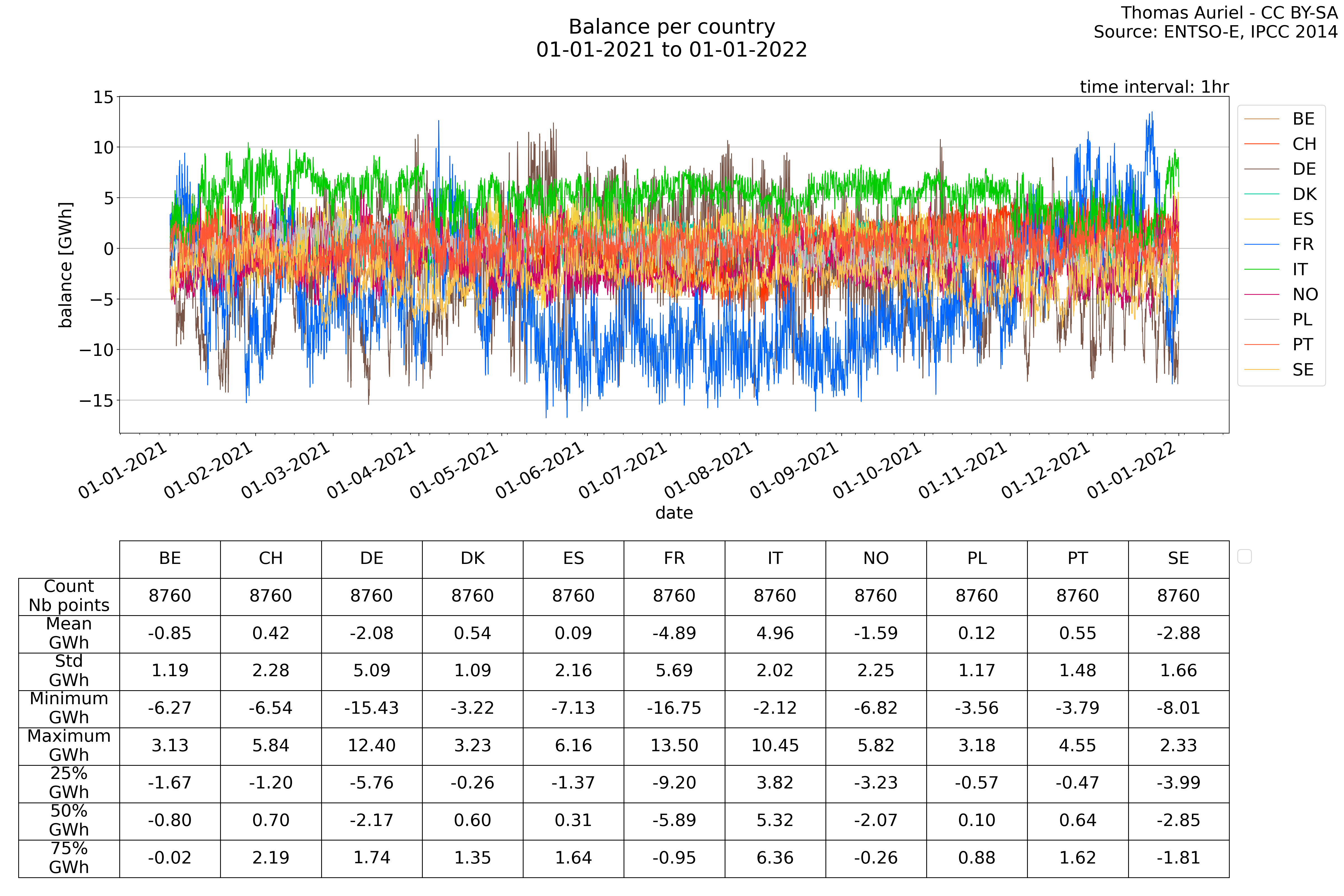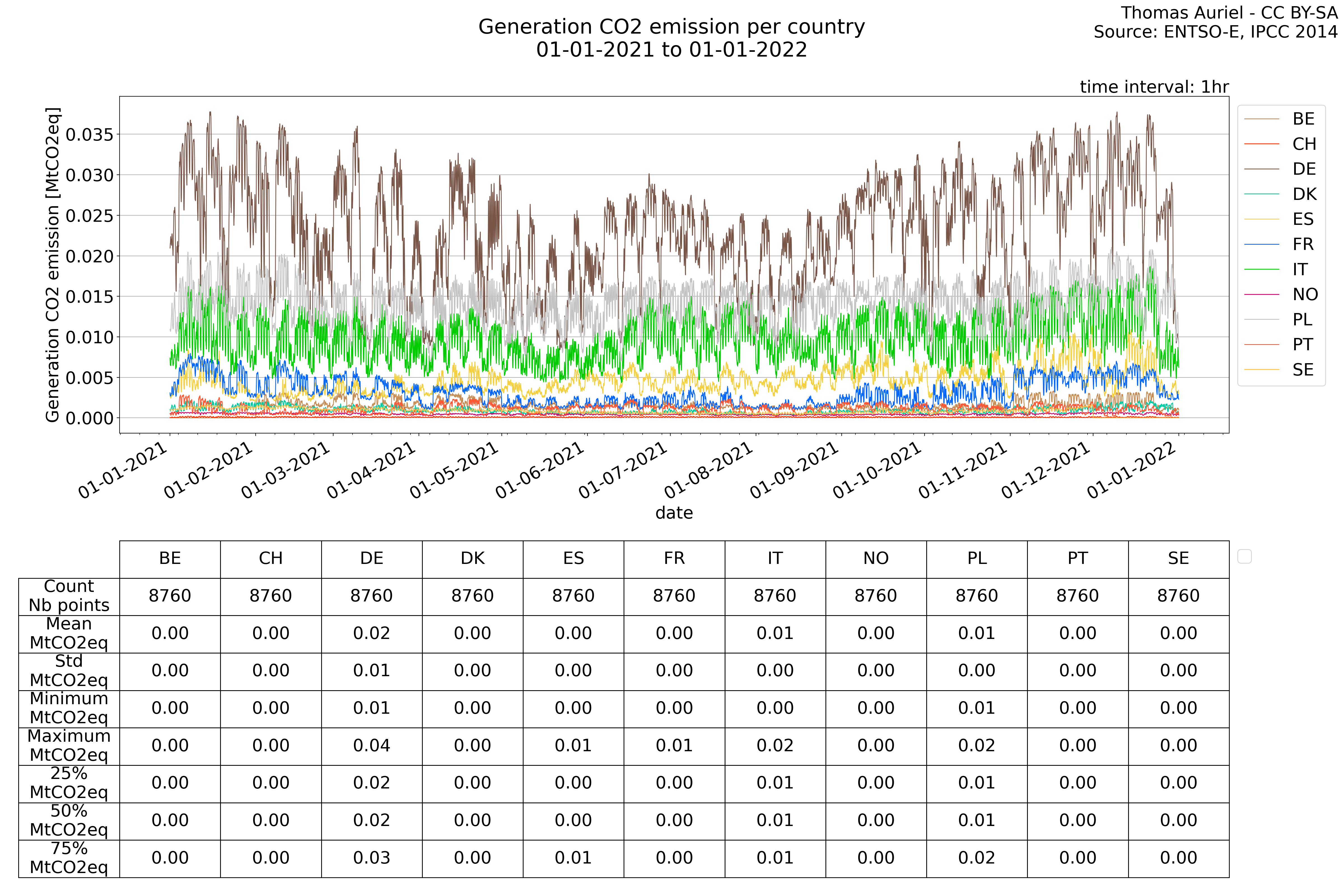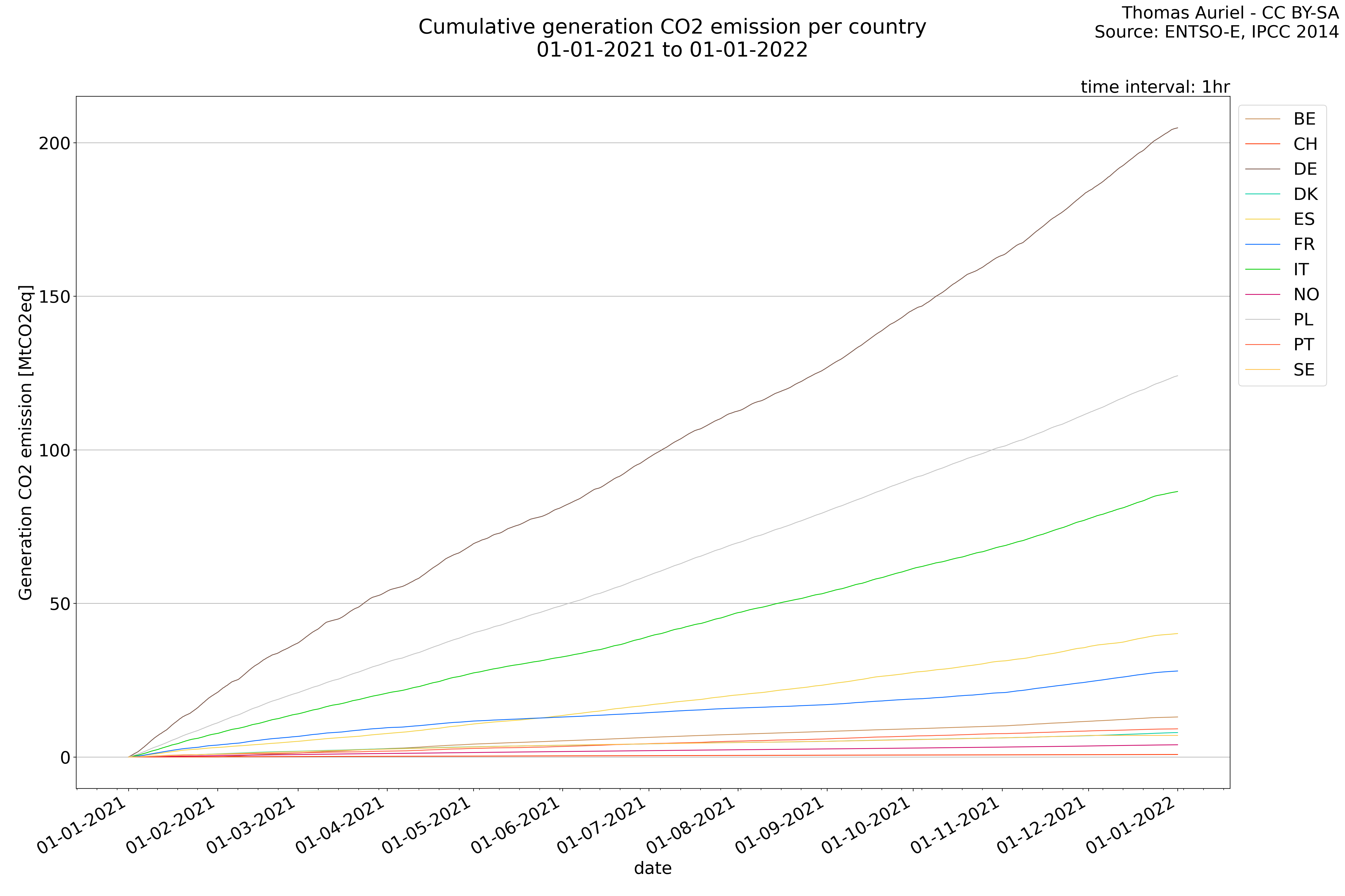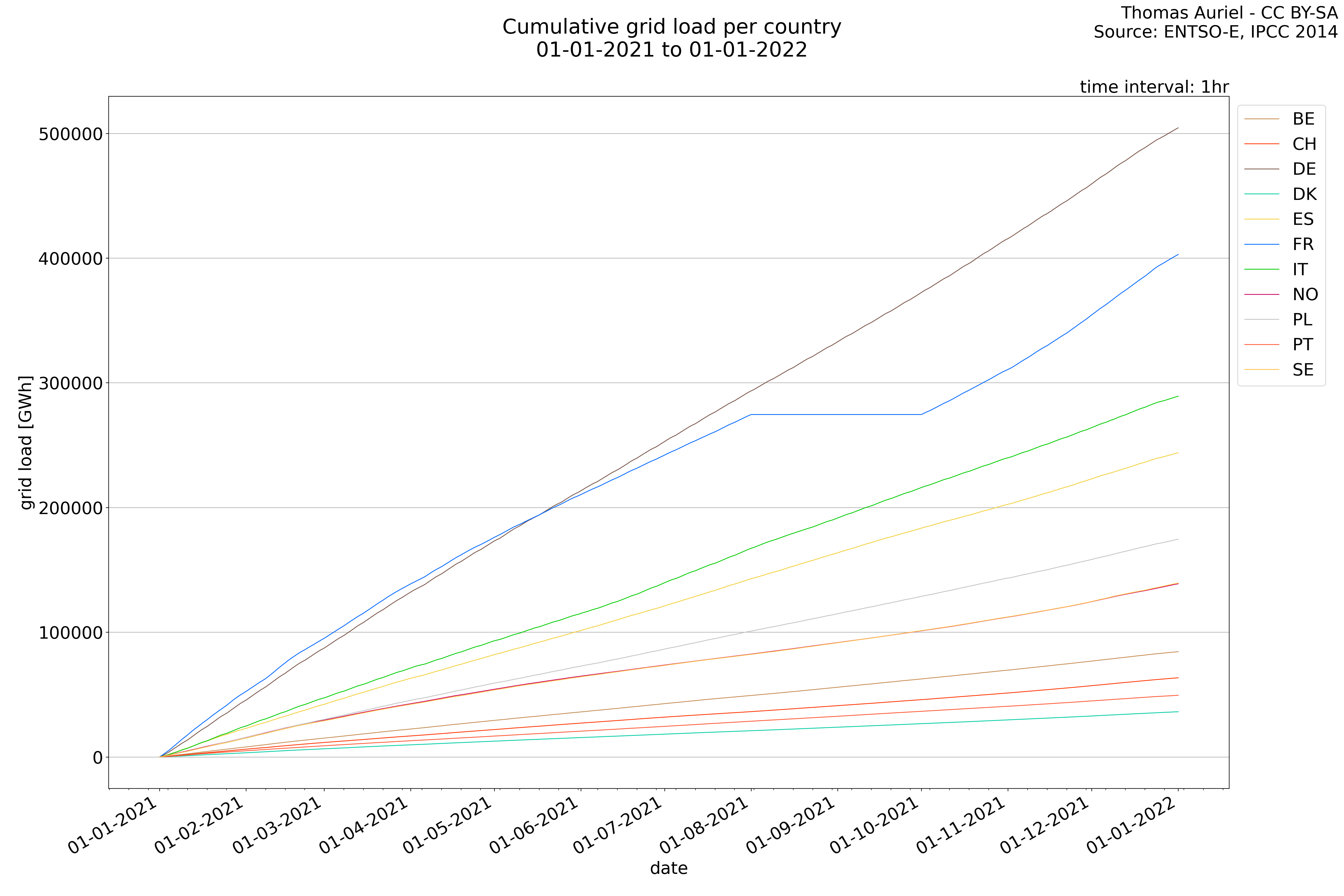 In these hourly line plots, the x-axis spans the entire year, with hours as individual data points. The y-axis represents the values of production, exchange, consumption, and data emissions, but unlike cumulative plots, these plots are designed for quality control purposes. Each line on the plot corresponds to a specific country and is used to identify data irregularities, holes, or artifacts that may occur within the year. By examining these plots, it is possible to spot discrepancies or missing data points in the hourly records, ensuring data integrity.