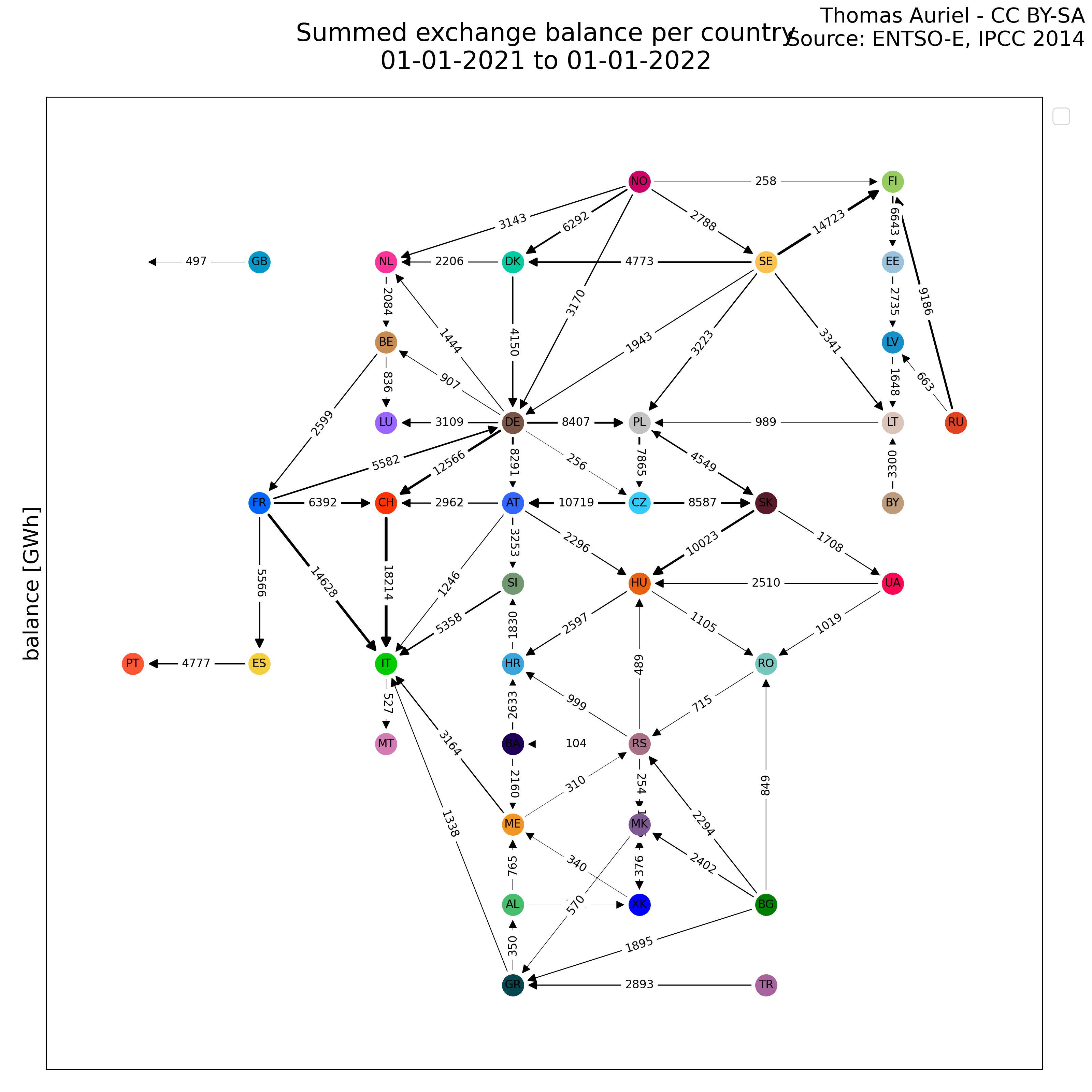 Graph network representations visualize complex interactions and electricity exchange among countries. Nodes represent individual countries, labeled with their iso code. Links illustrate the flow, direction, and intensity of exchanges, with wider links denoting greater exchange values. This representation aids in identifying countries with significant interactions and offers insights into international relationships.