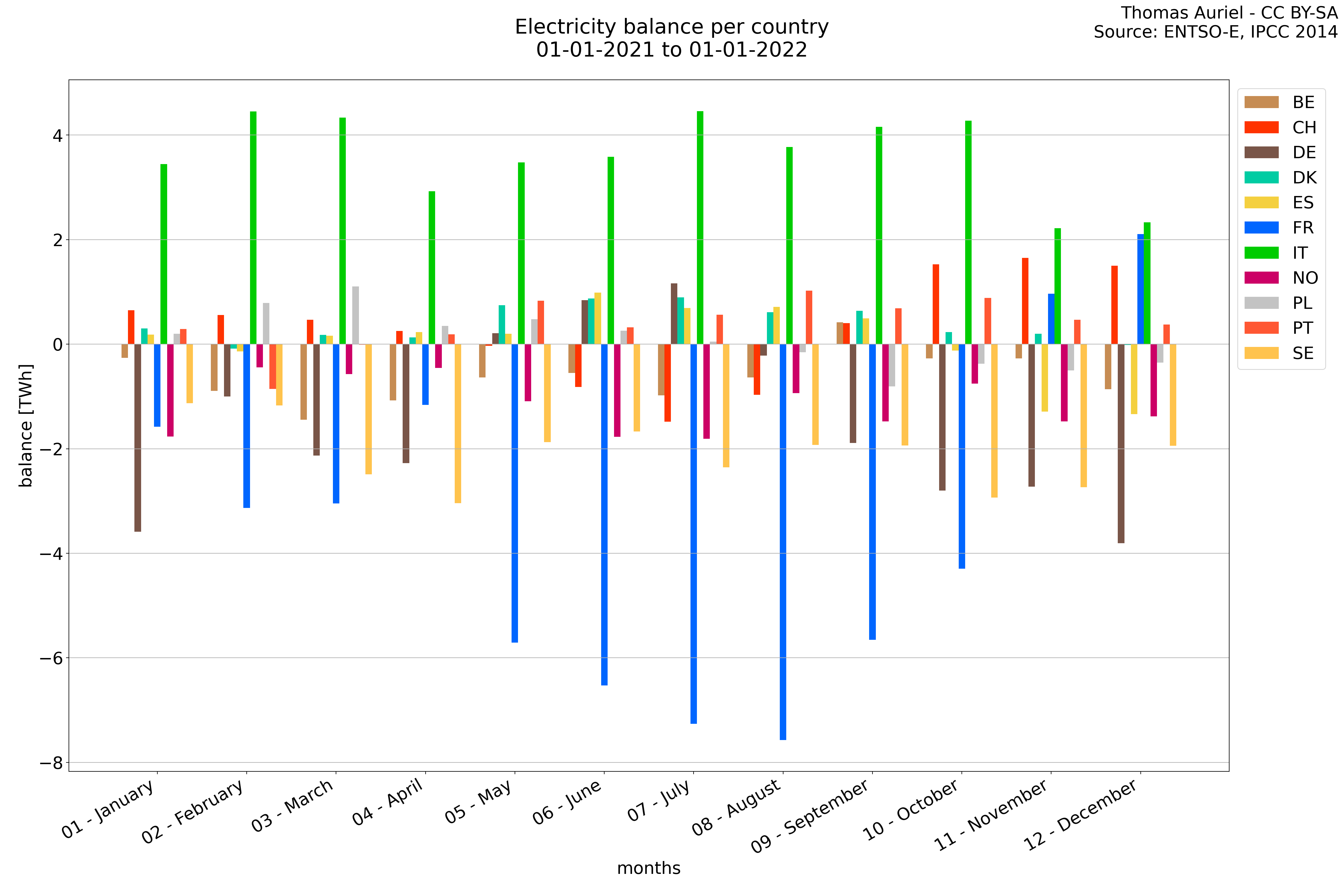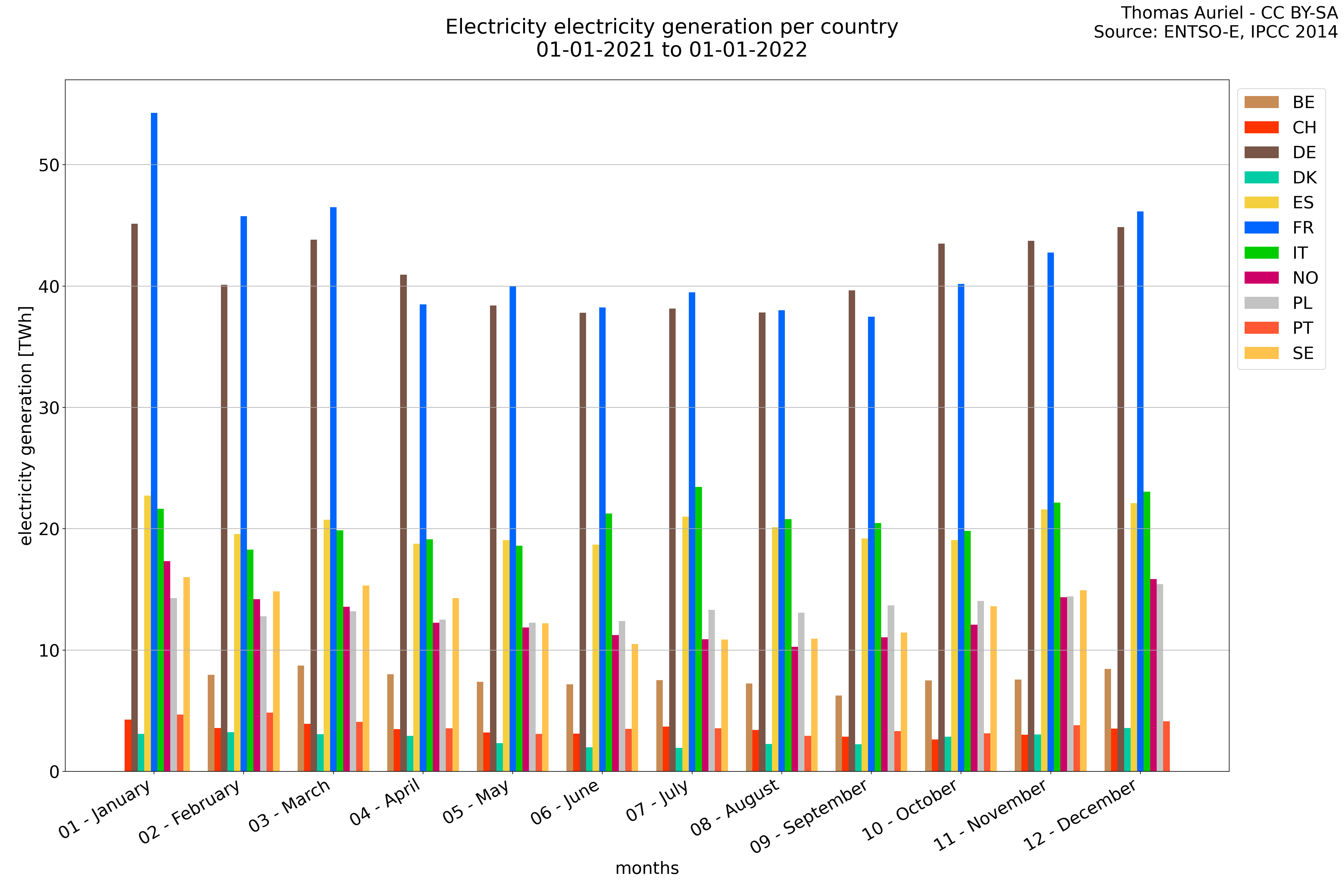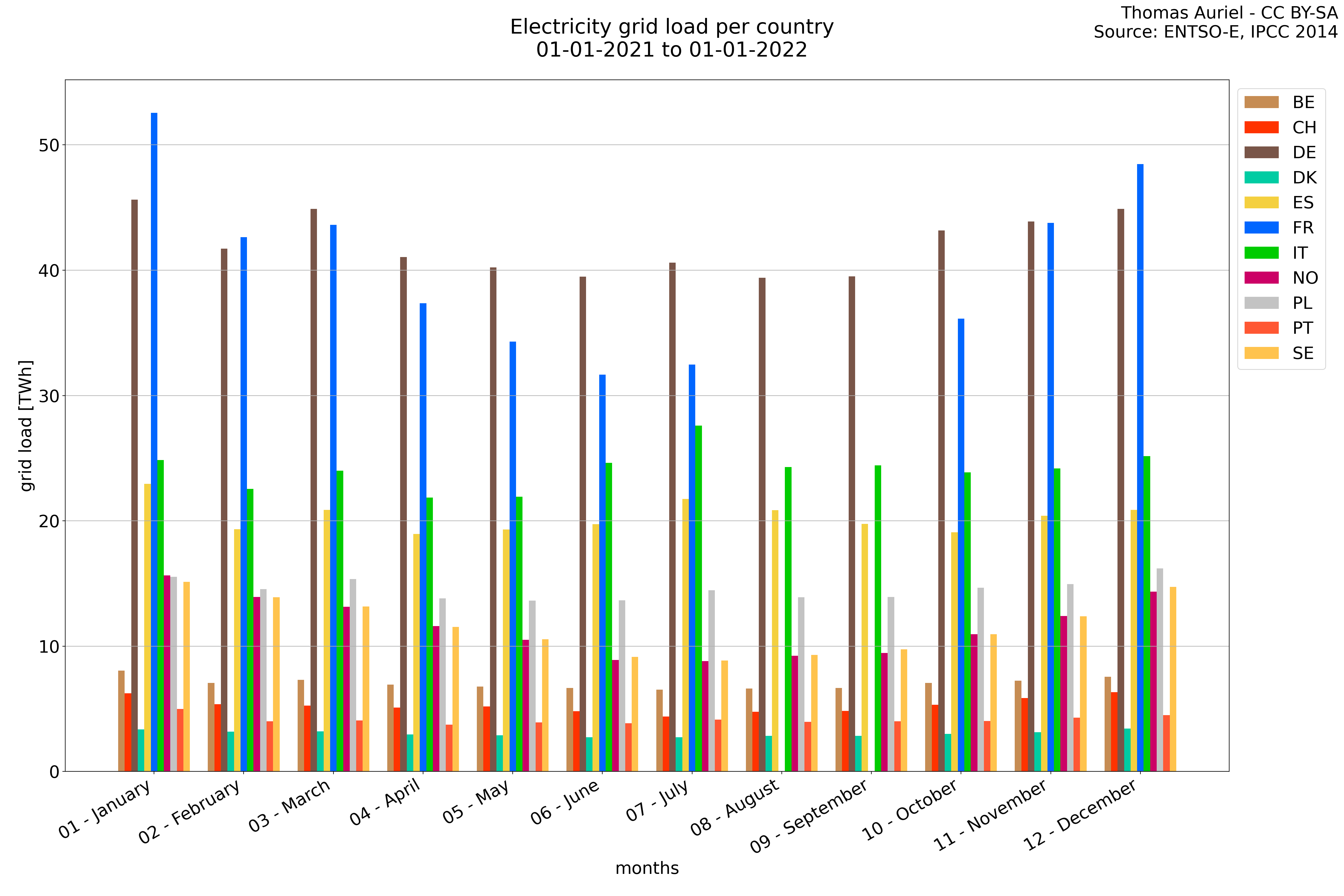 A periode plot takes a general view of the data by summing all the values over each month and presents them as a stacked bar plot. This visualization method allows for a clear understanding of how each country grid change over months. Then the Periode plot does not provide time-based trends but instead give an insight on the composition of the data within the chosen period.