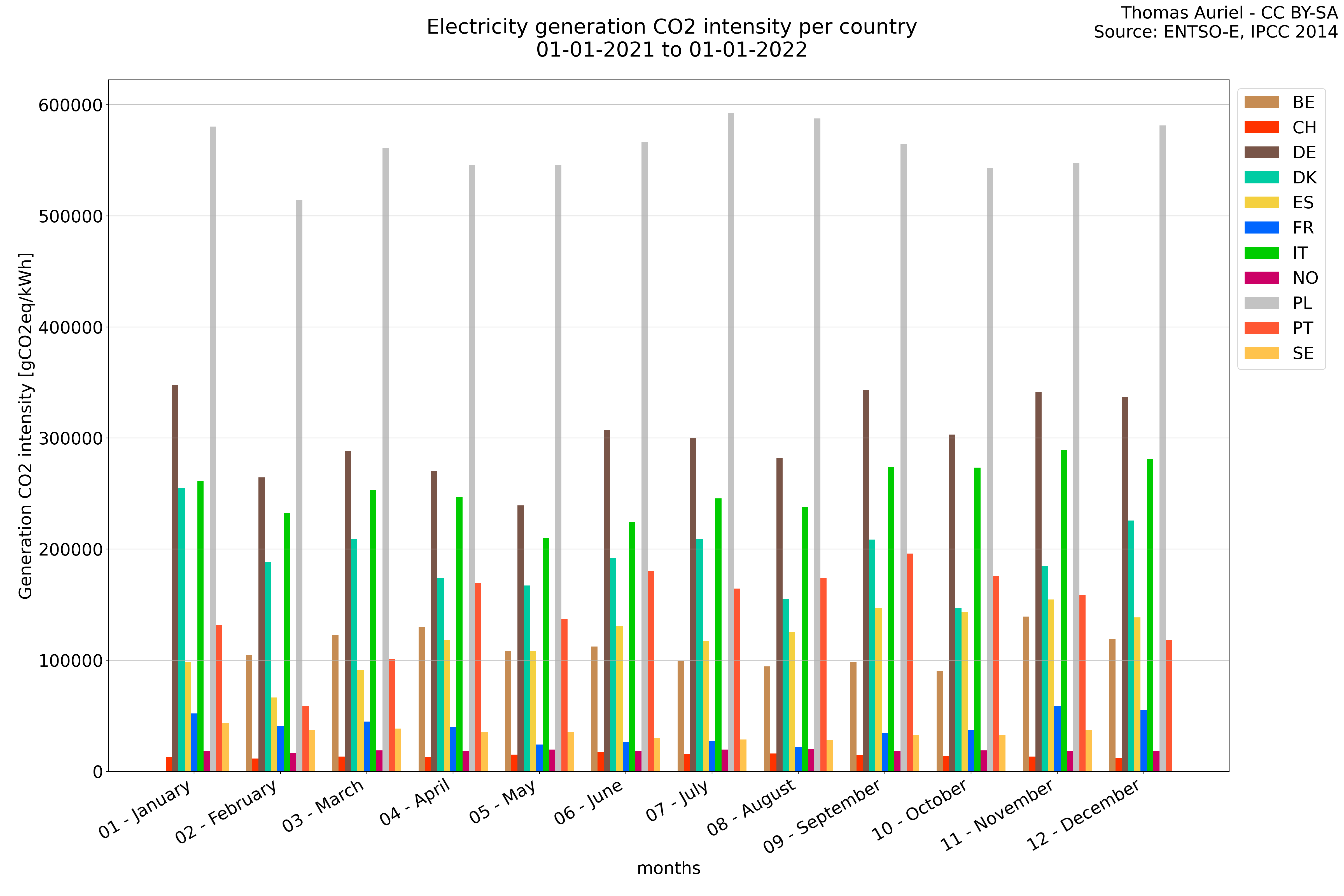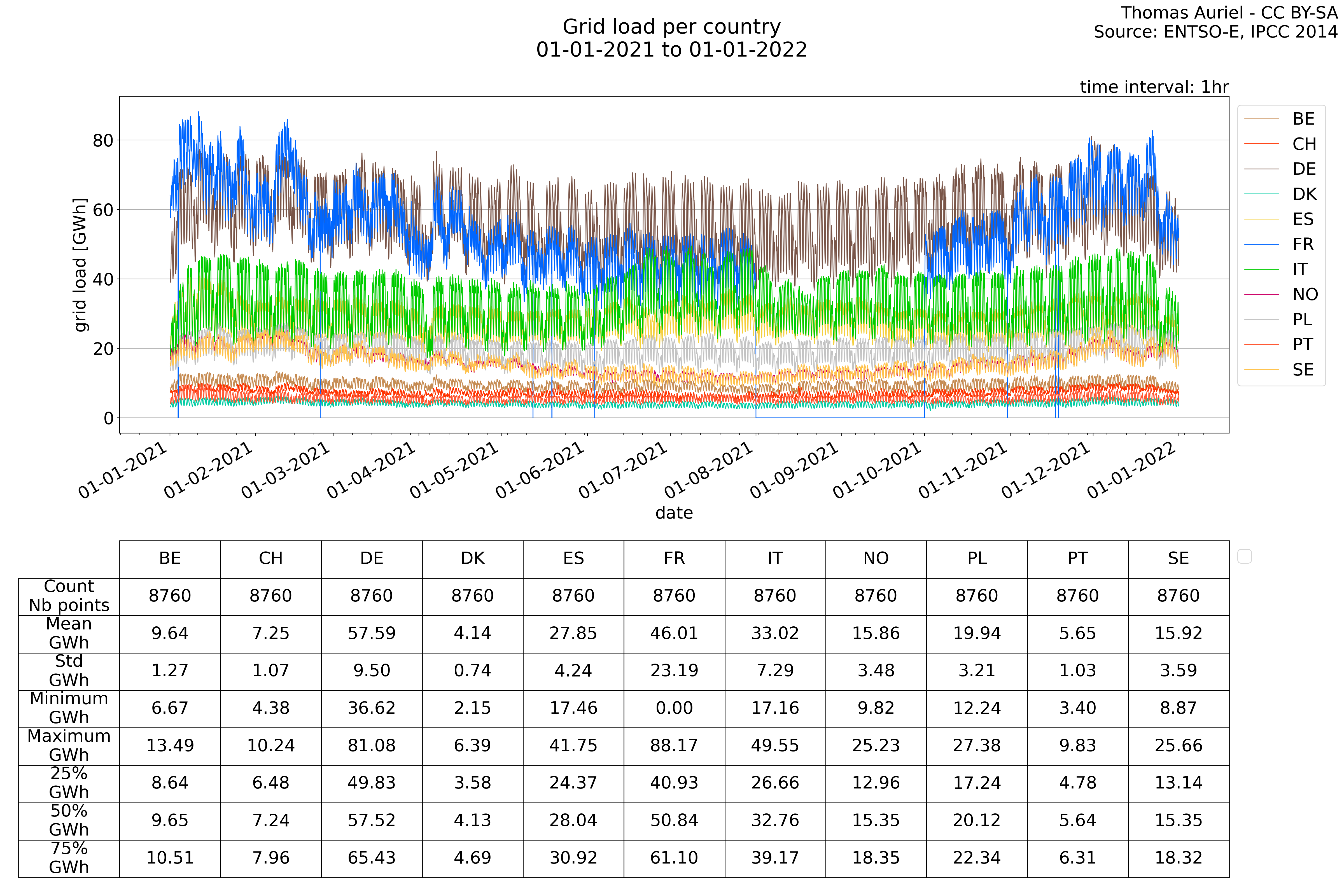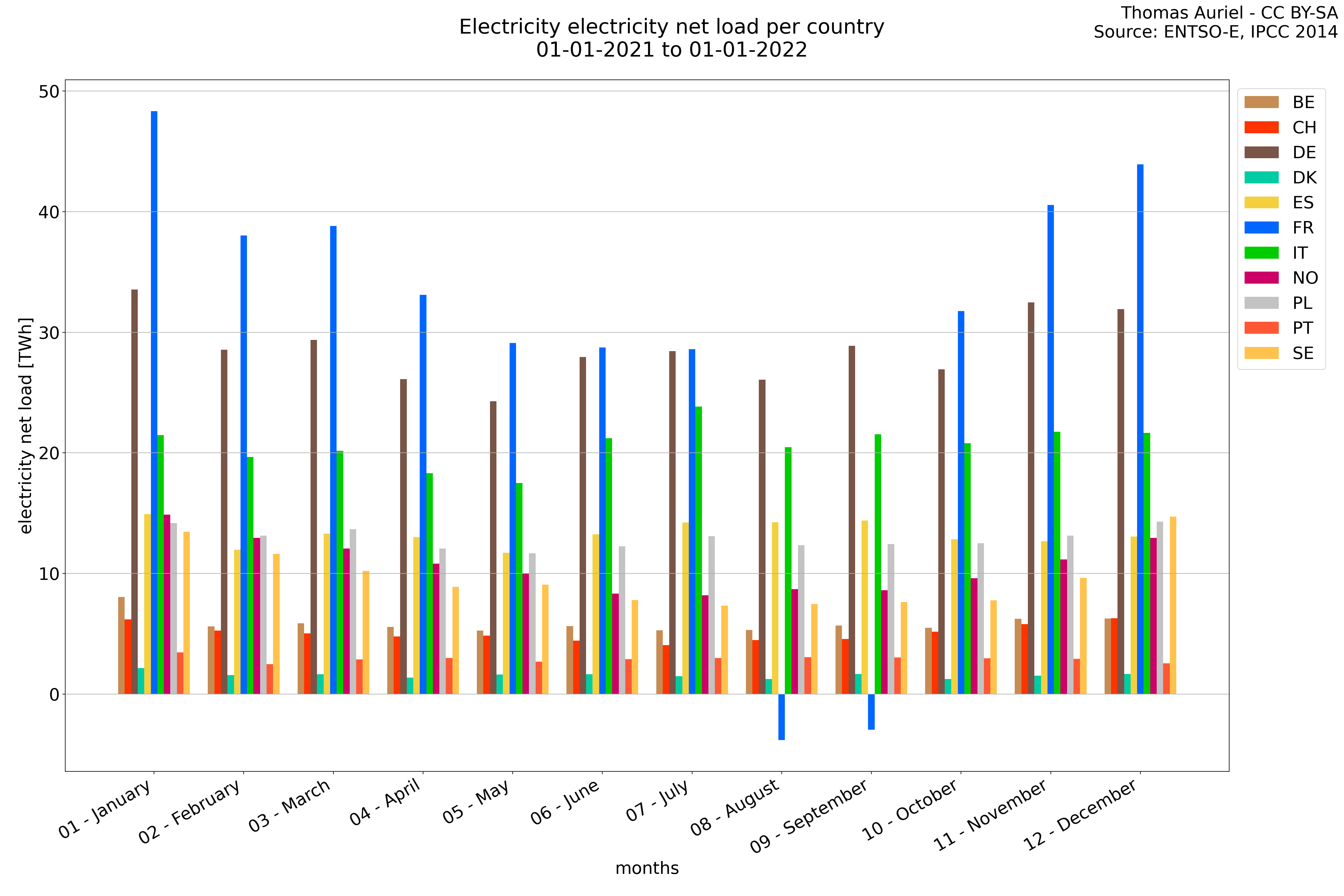 A periode plot takes a general view of the data by summing all the values over each month and presents them as a stacked bar plot. This visualization method allows for a clear understanding of how each country grid change over months. Then the Periode plot does not provide time-based trends but instead give an insight on the composition of the data within the chosen period.
