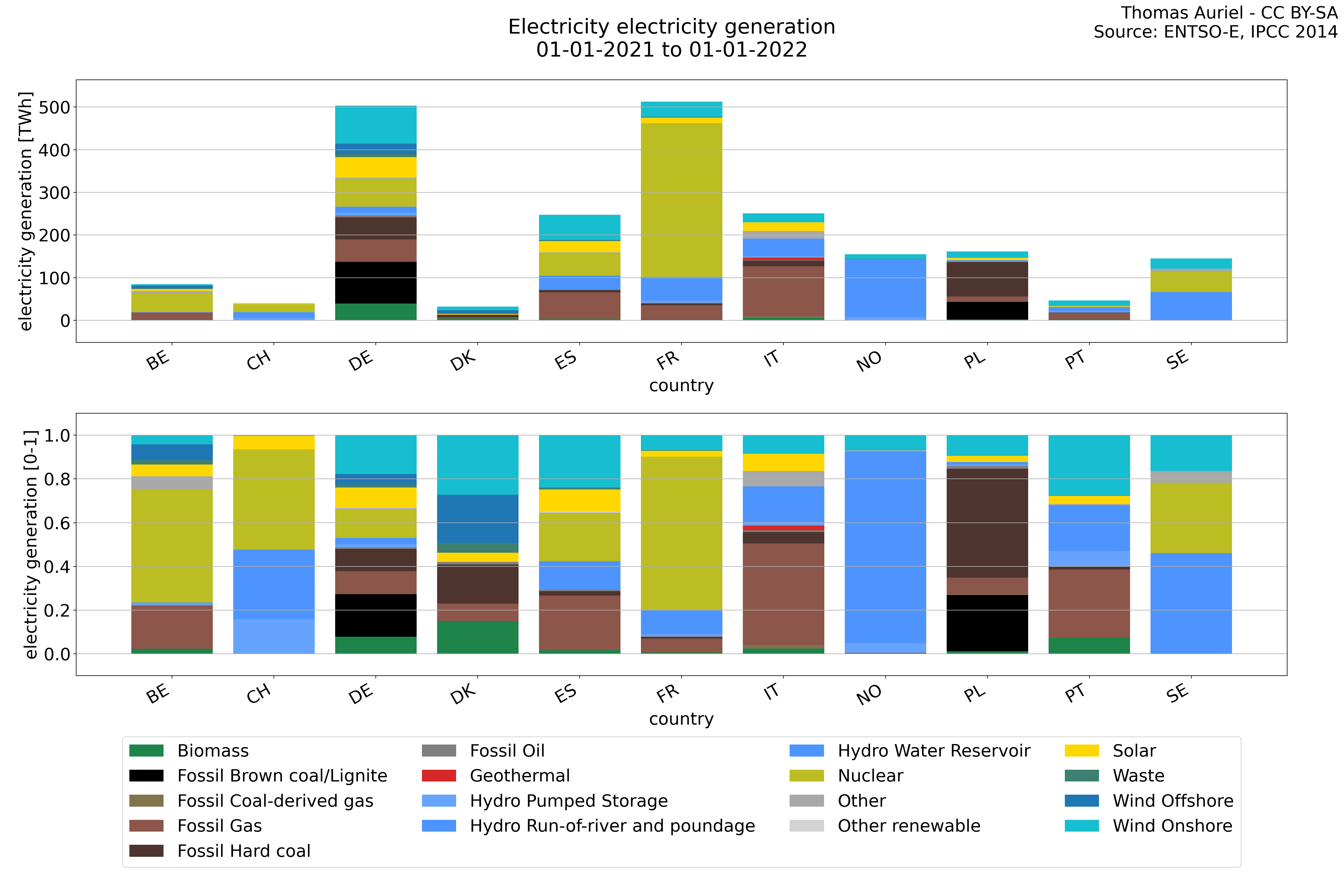 In these stacked bar plots, each bar represents a specific country. The bars are divided into sections that depict the decomposition of production, exchange, and CO2 emissions over the year. Two versions are presented: one displaying absolute values, and the other showing relative values. In the absolute values plot, each country's bar illustrates the absolute amounts of these components during the year. The relative values plot showcases the proportion of each component within a country's data for the entire year. These stacked bar plots offer insights into how production, exchange, and CO2 emissions vary across countries, aiding in comparative analysis.