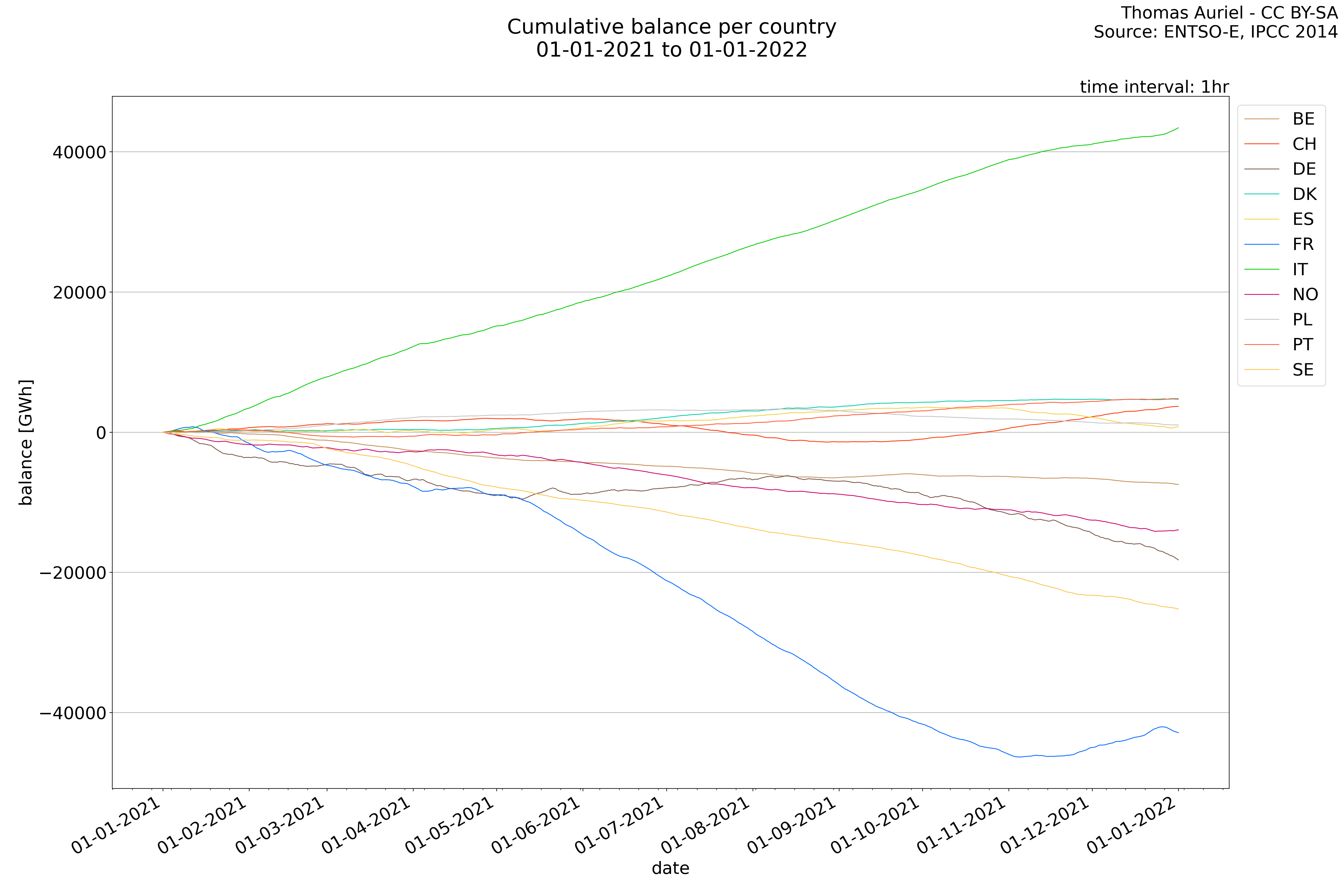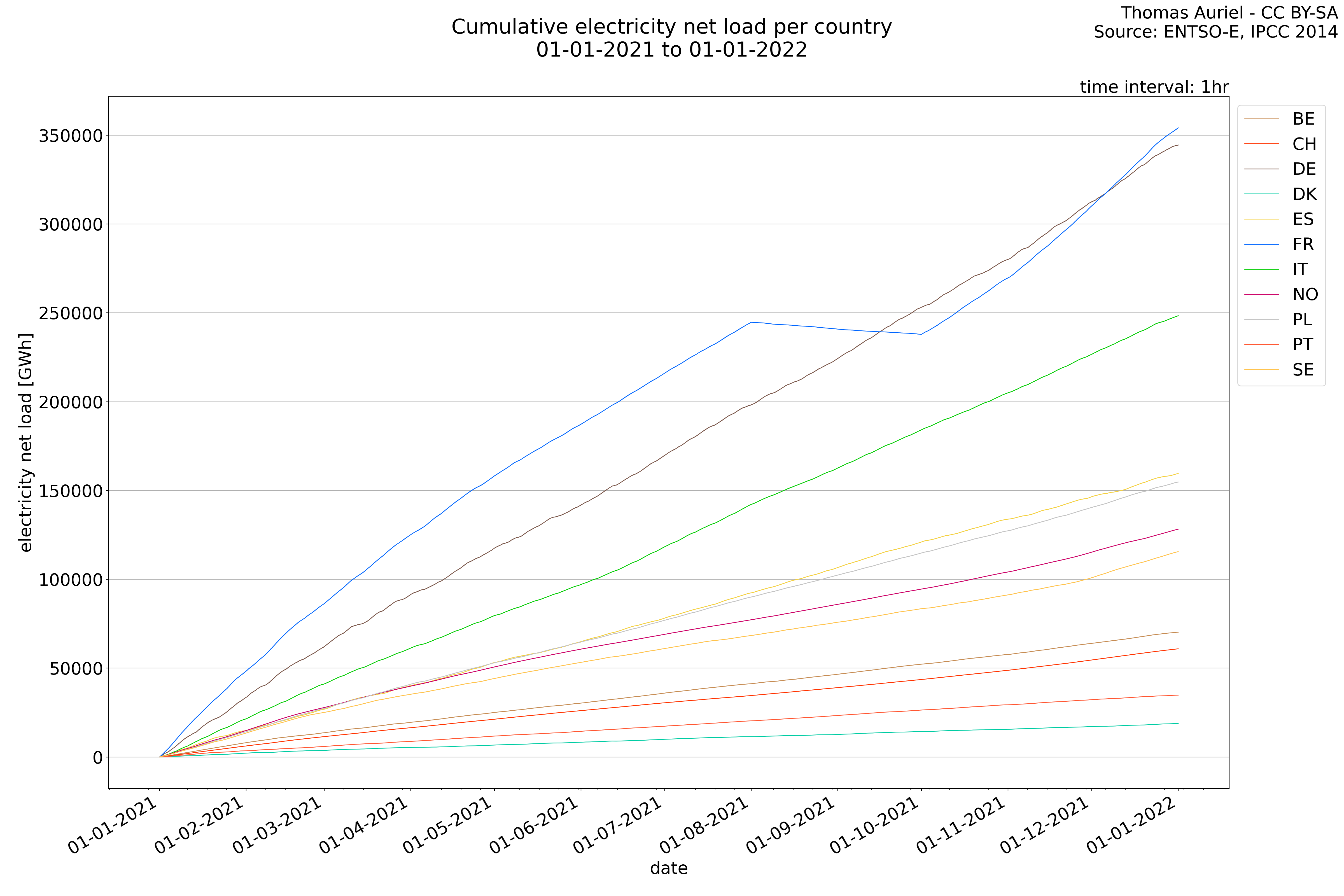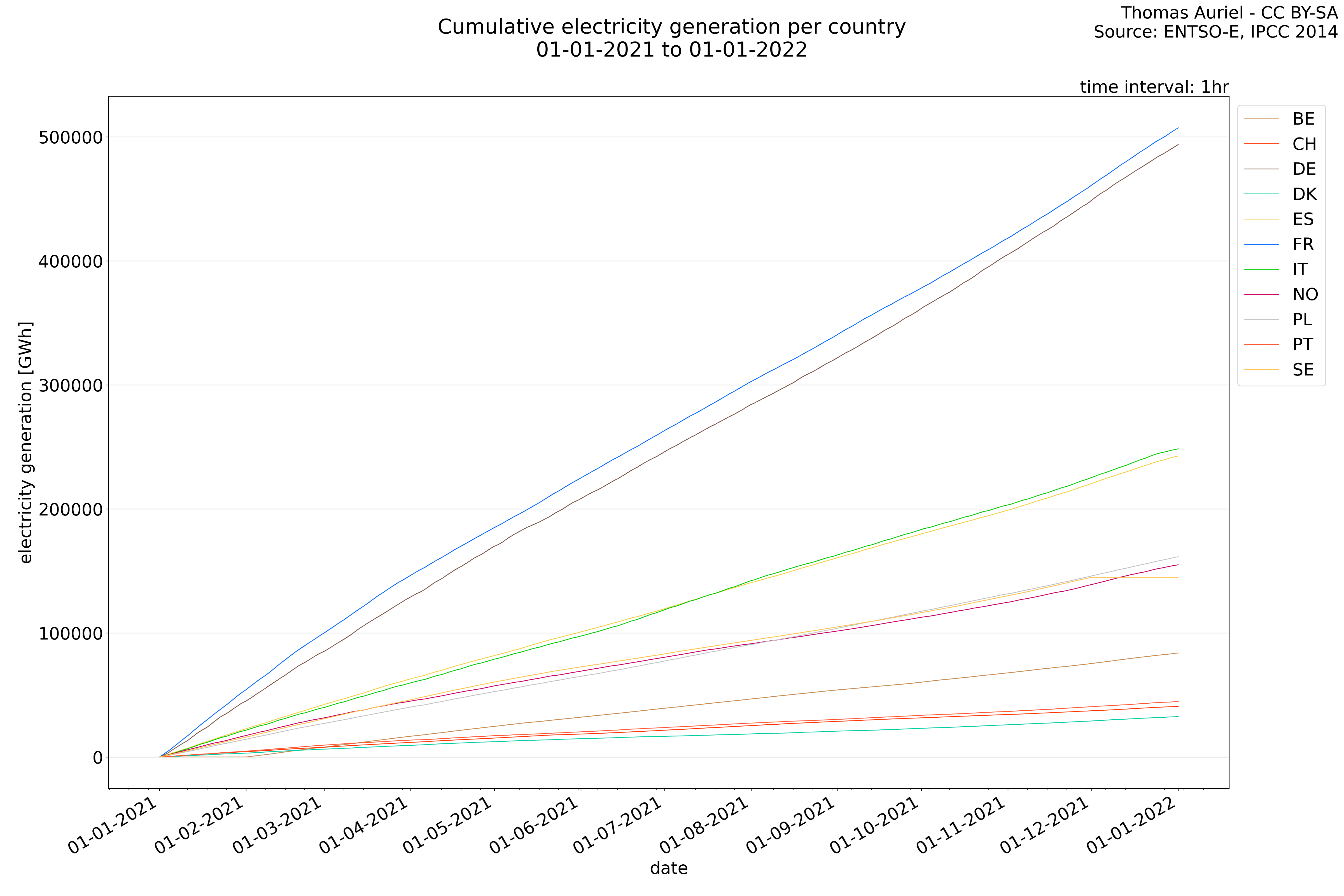 In these cumulative line plots, the x-axis spans the entire year, with hours as individual data points. The y-axis represents the cumulative total of production, exchange, consumption, and data emissions. Each line on the plot corresponds to a distinct country, providing a comprehensive view of how these variables evolve throughout the year. These plots offer insights into the annual evolution for each country.