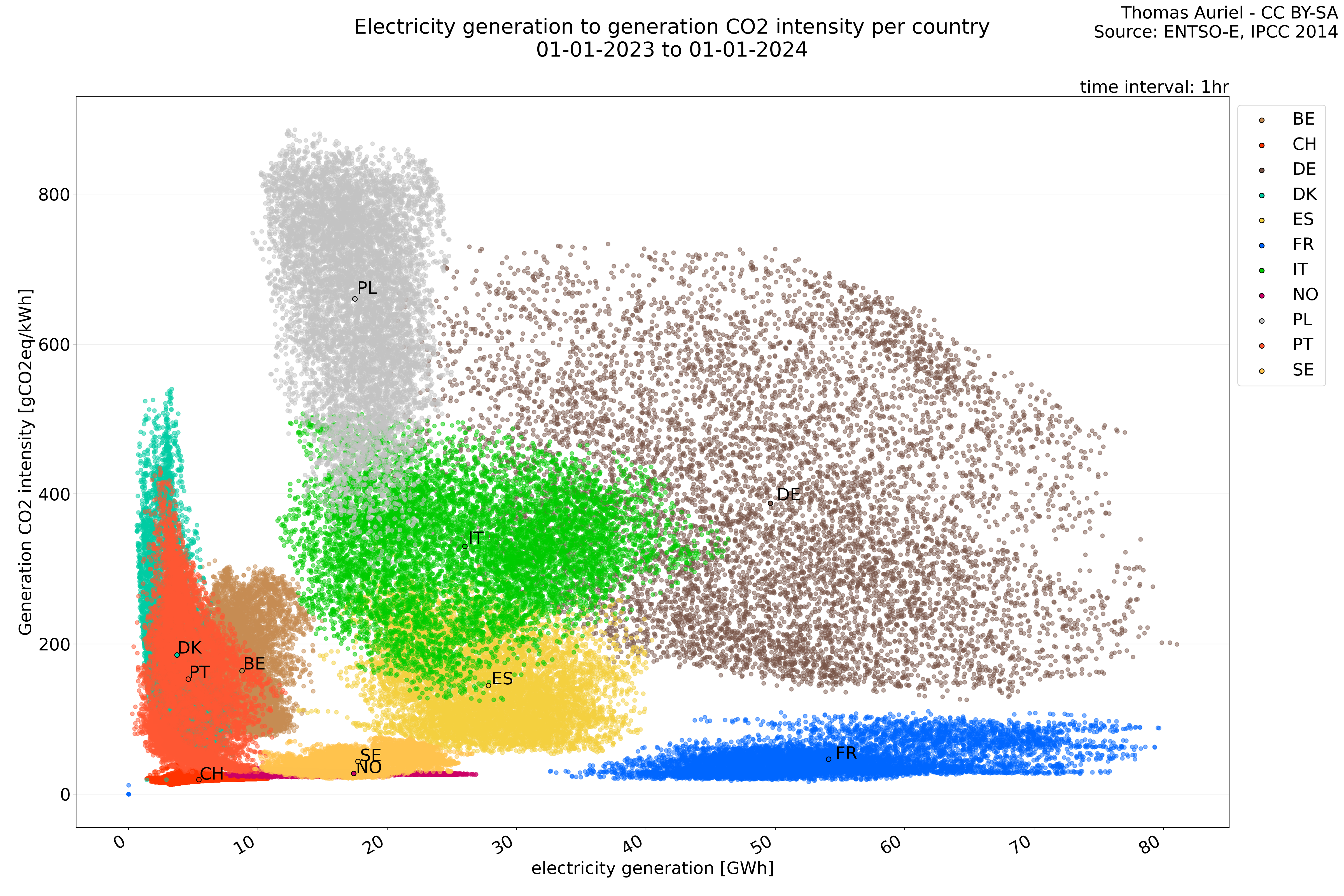 To read the scatter plot, locate a point on the graph and trace it back to both axes. The x-axis value gives the hour of production, and the y-axis value gives the CO2 intensity for that hour. By examining where the points are clustered, you can identify trends. For example, a cluster of points towards the lower right might indicate that higher production hours are associated with lower CO2 intensity for a particular country.
