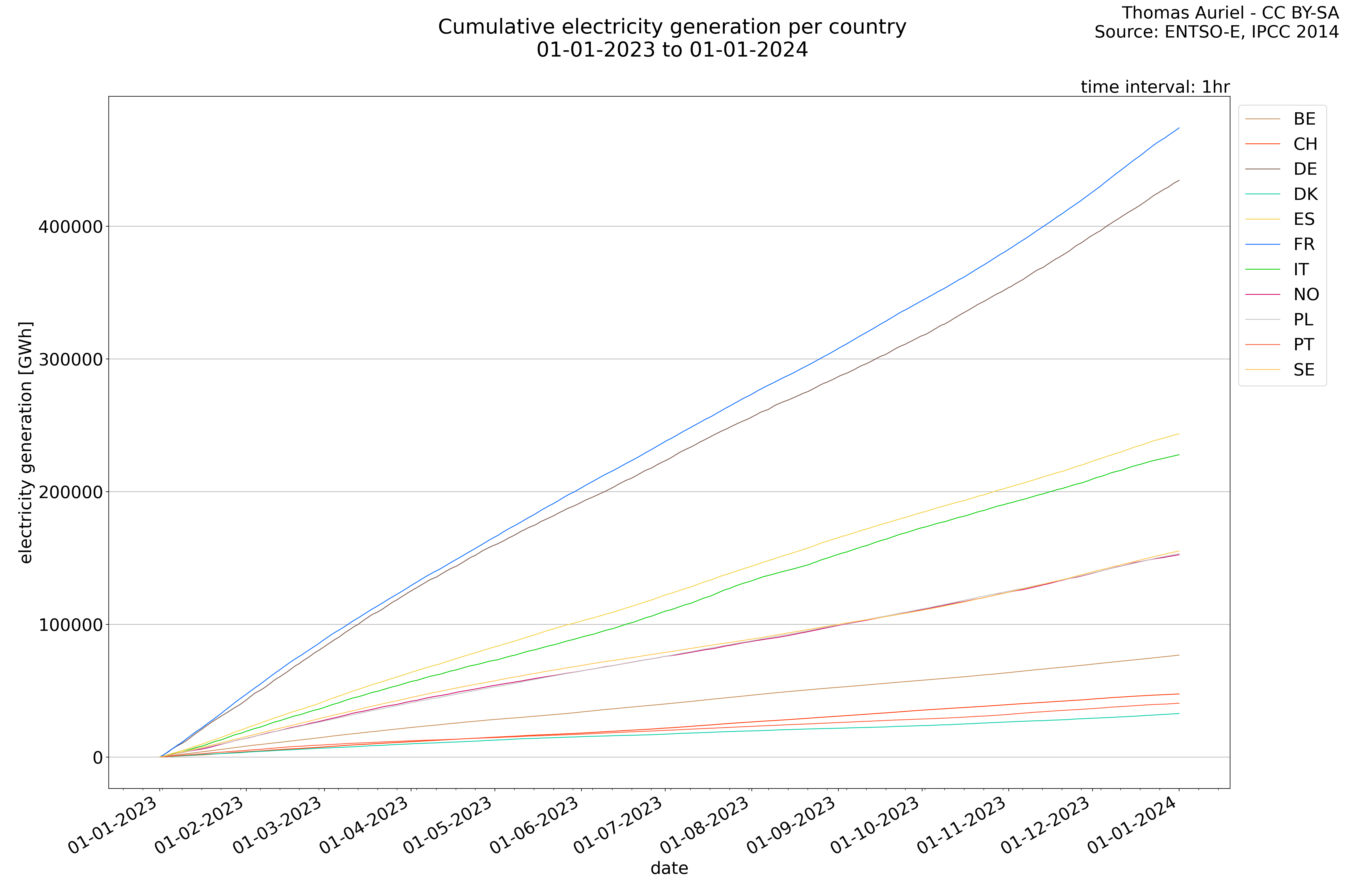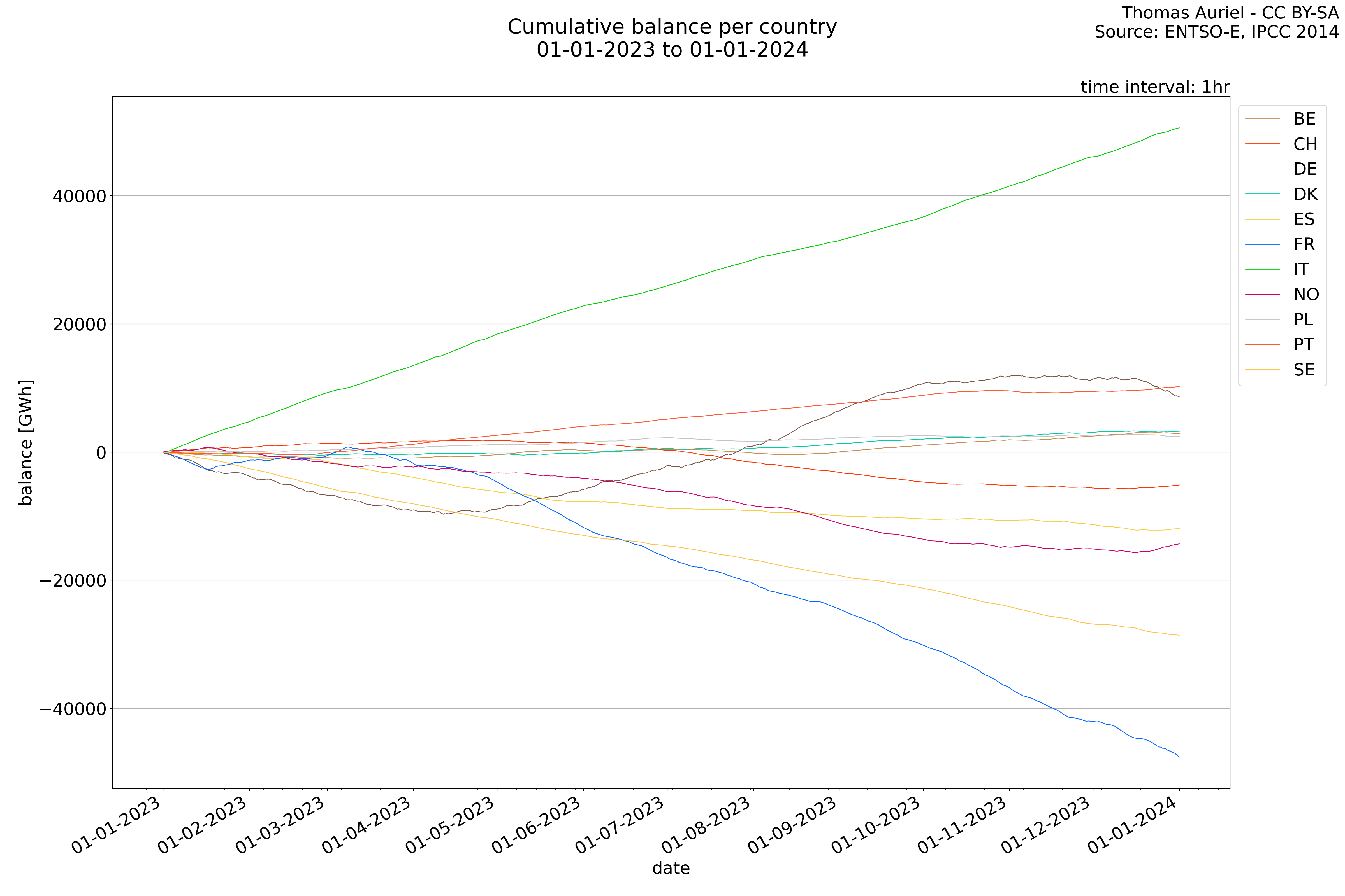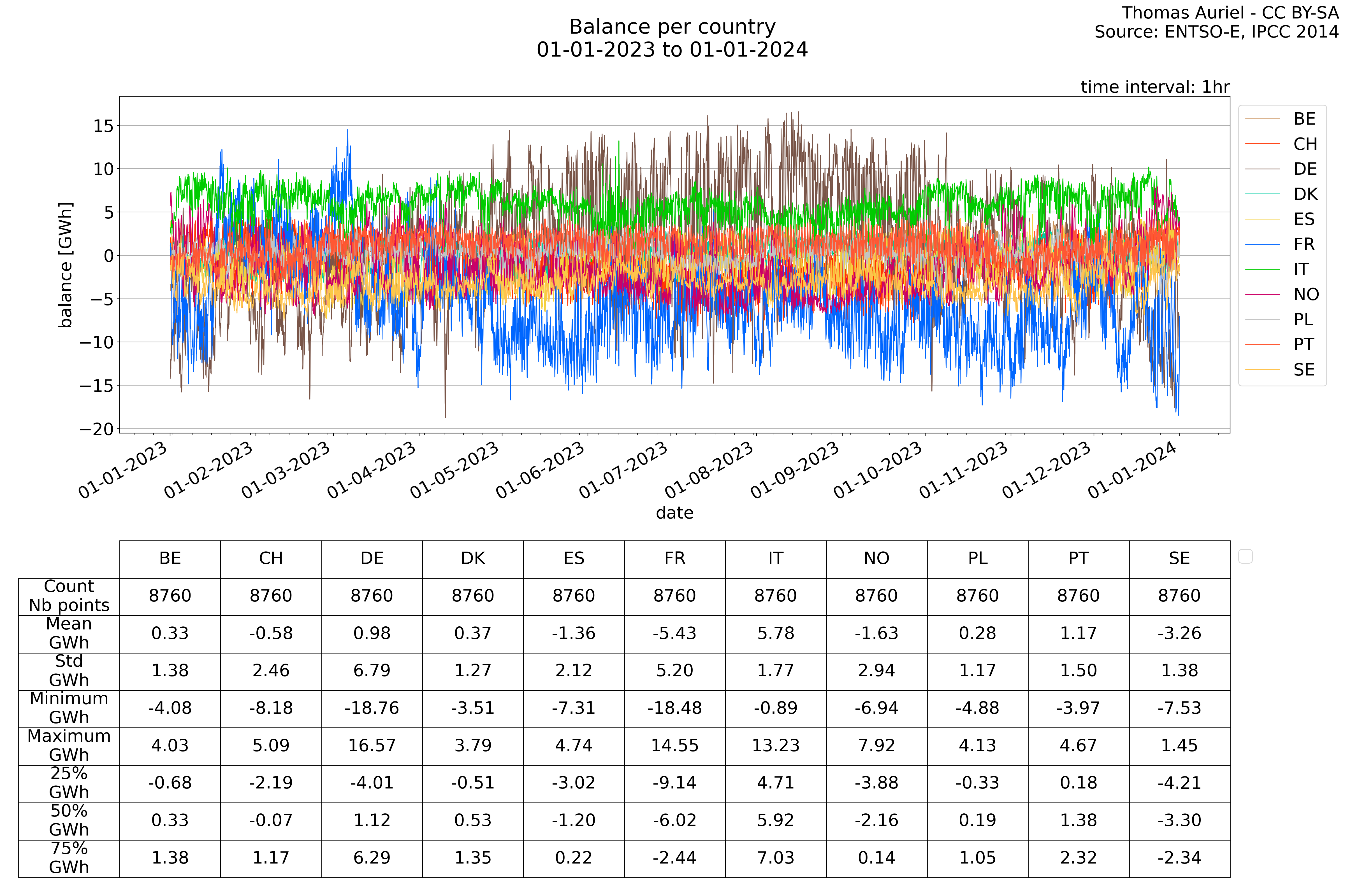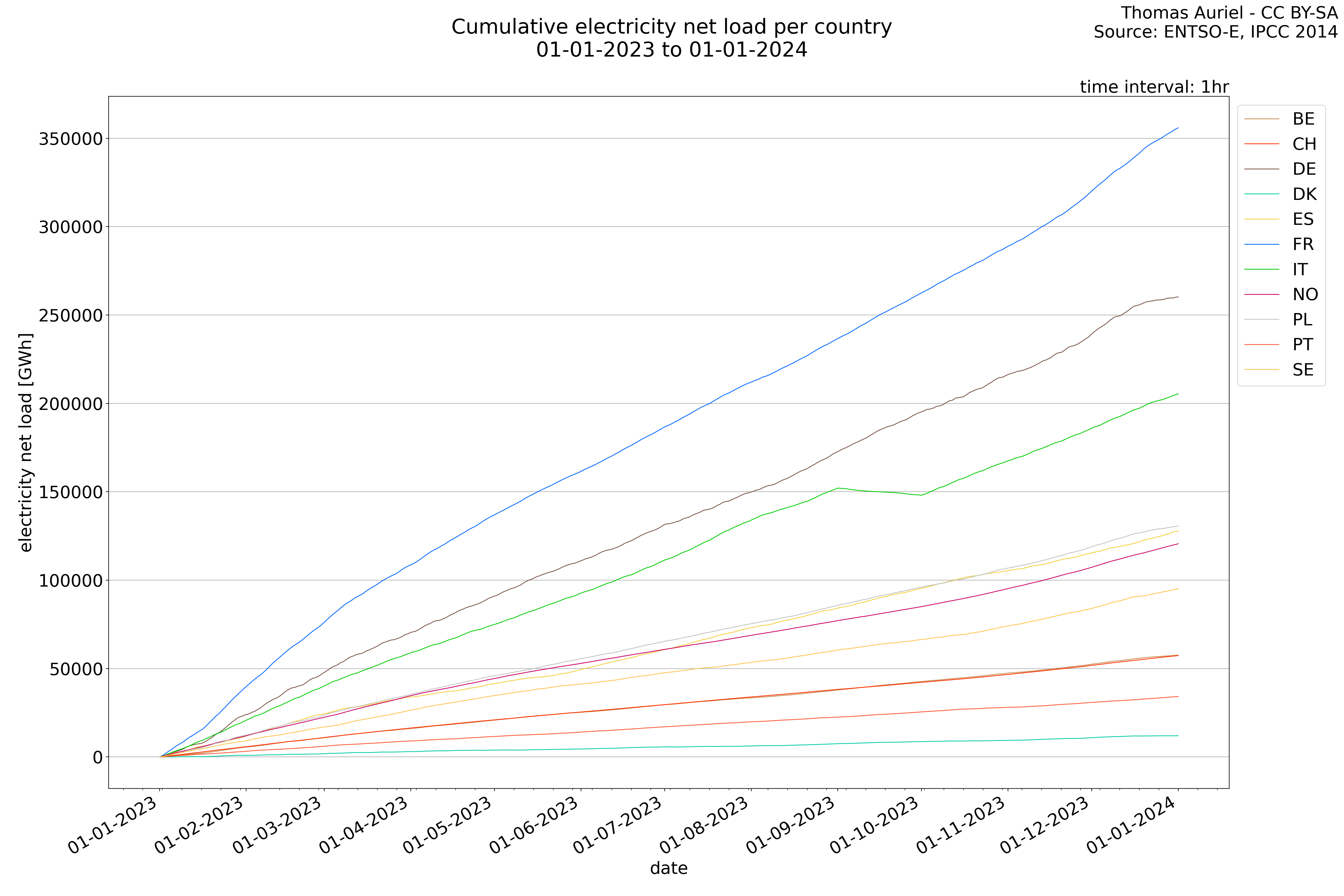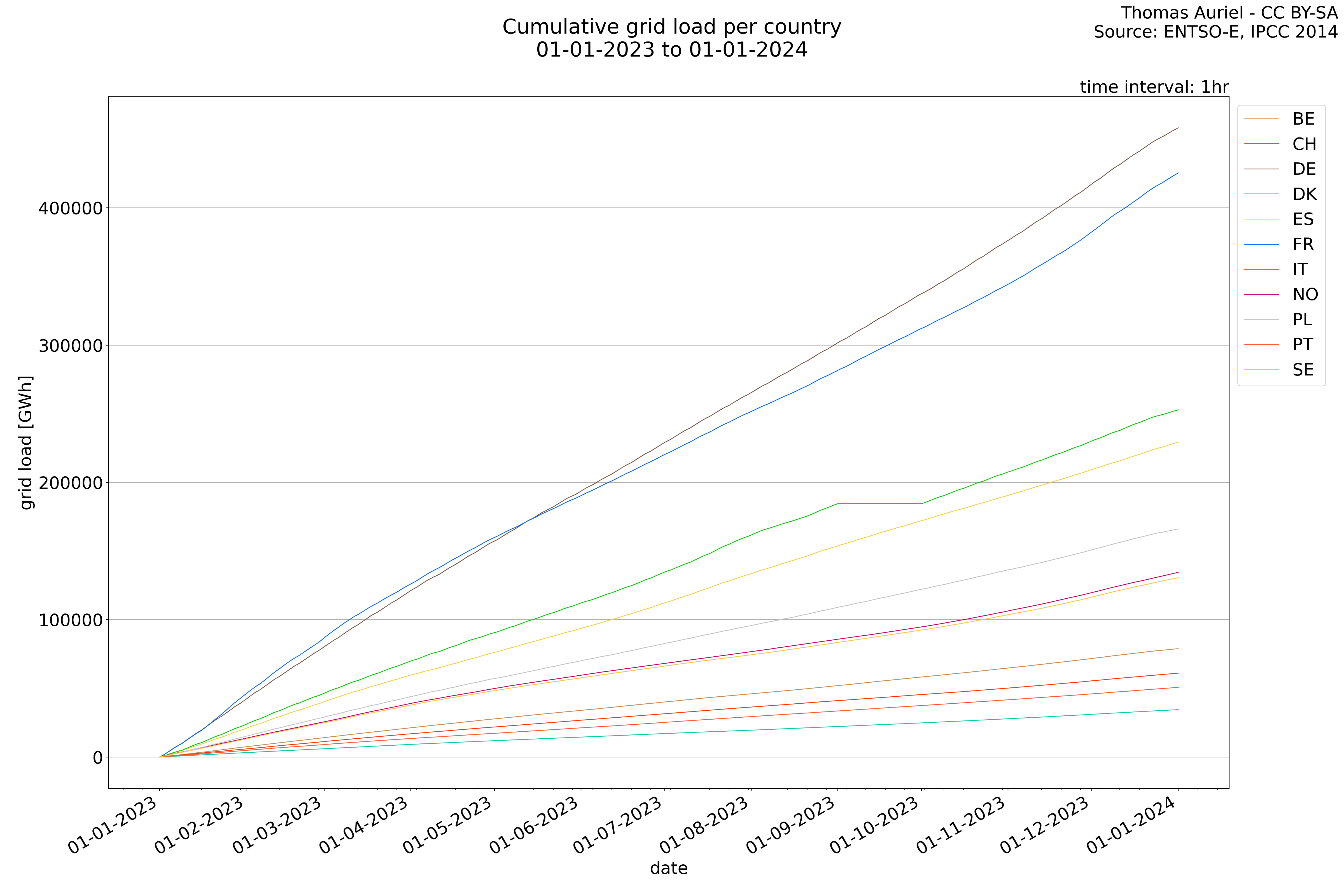 In these hourly line plots, the x-axis spans the entire year, with hours as individual data points. The y-axis represents the values of production, exchange, consumption, and data emissions, but unlike cumulative plots, these plots are designed for quality control purposes. Each line on the plot corresponds to a specific country and is used to identify data irregularities, holes, or artifacts that may occur within the year. By examining these plots, it is possible to spot discrepancies or missing data points in the hourly records, ensuring data integrity.