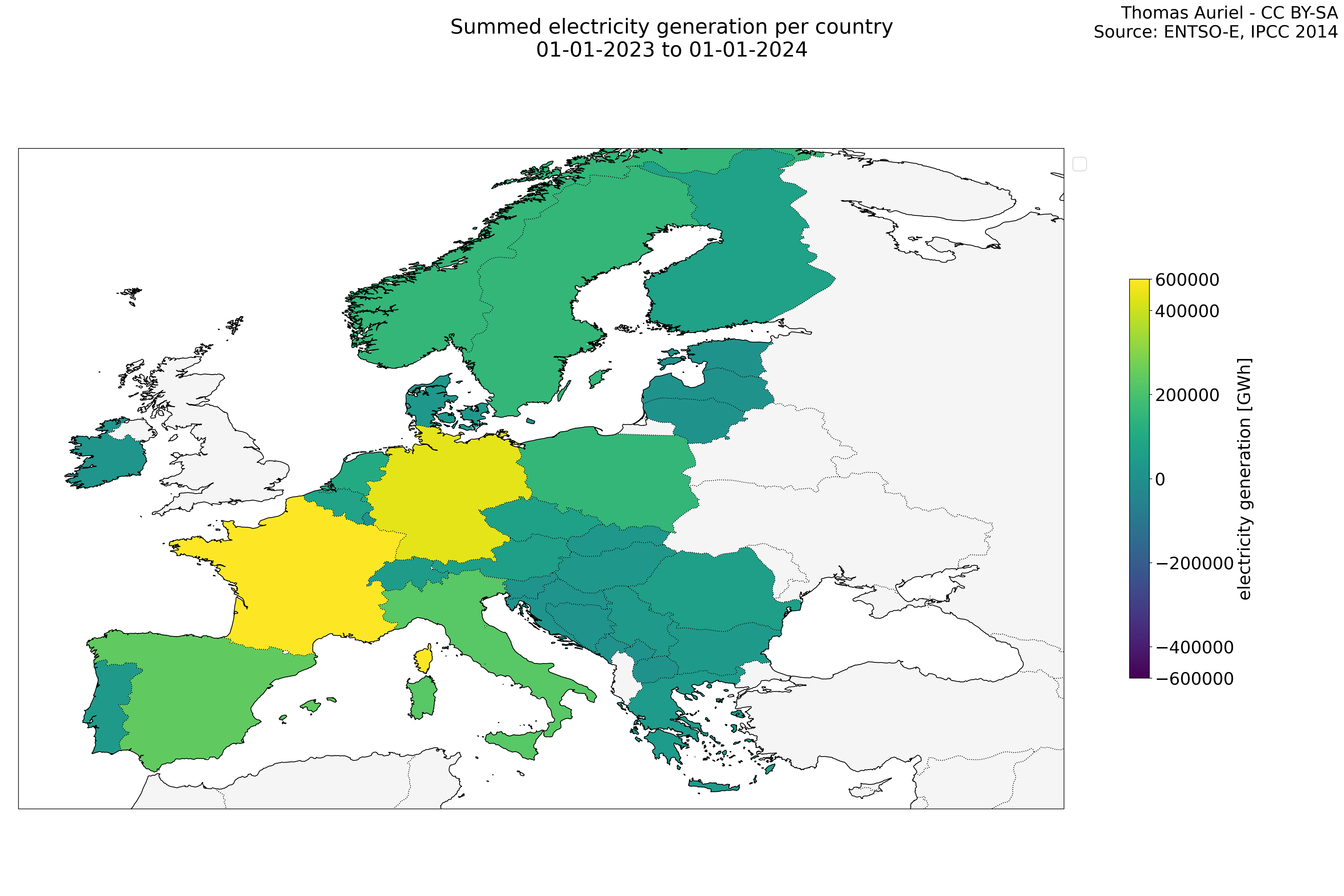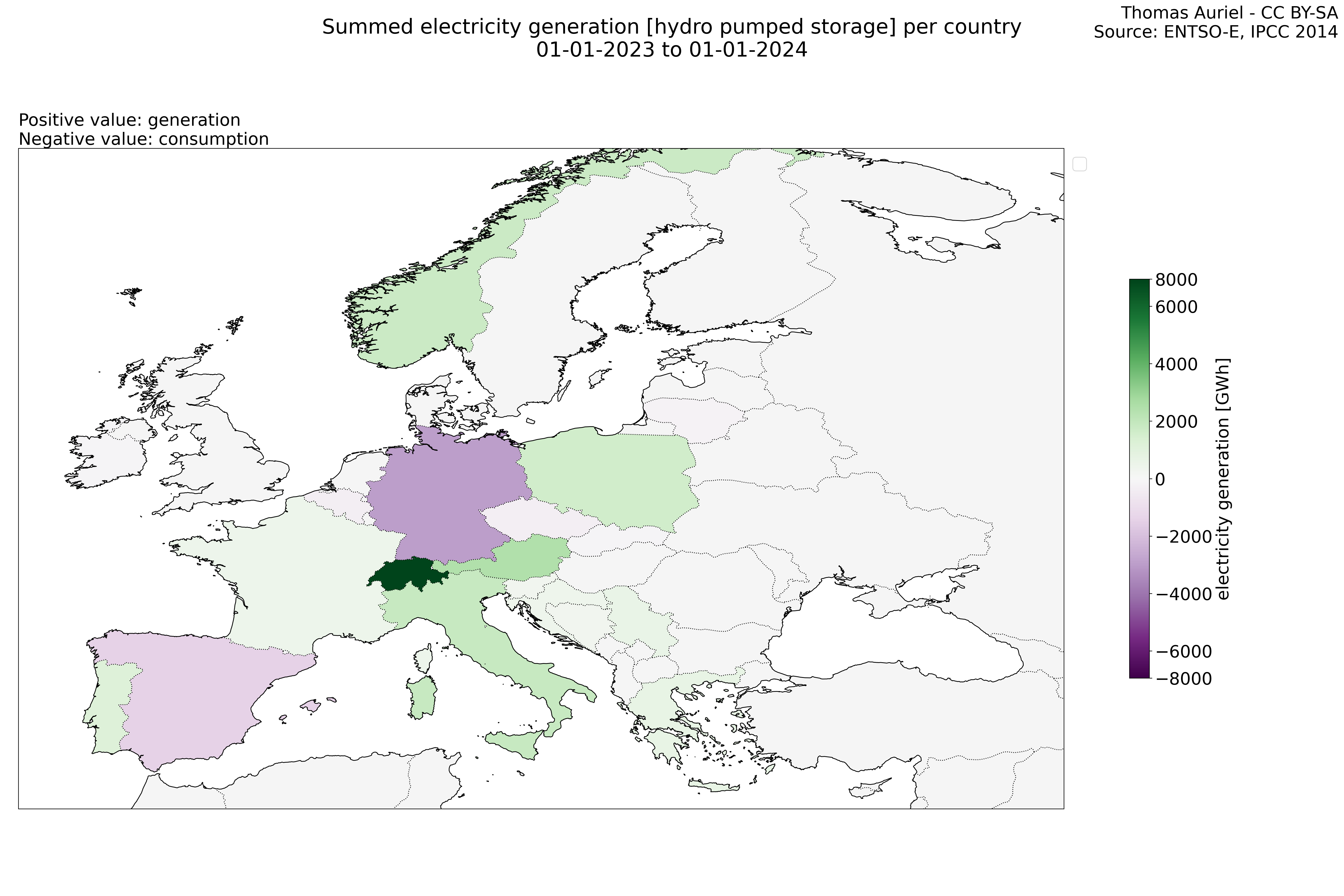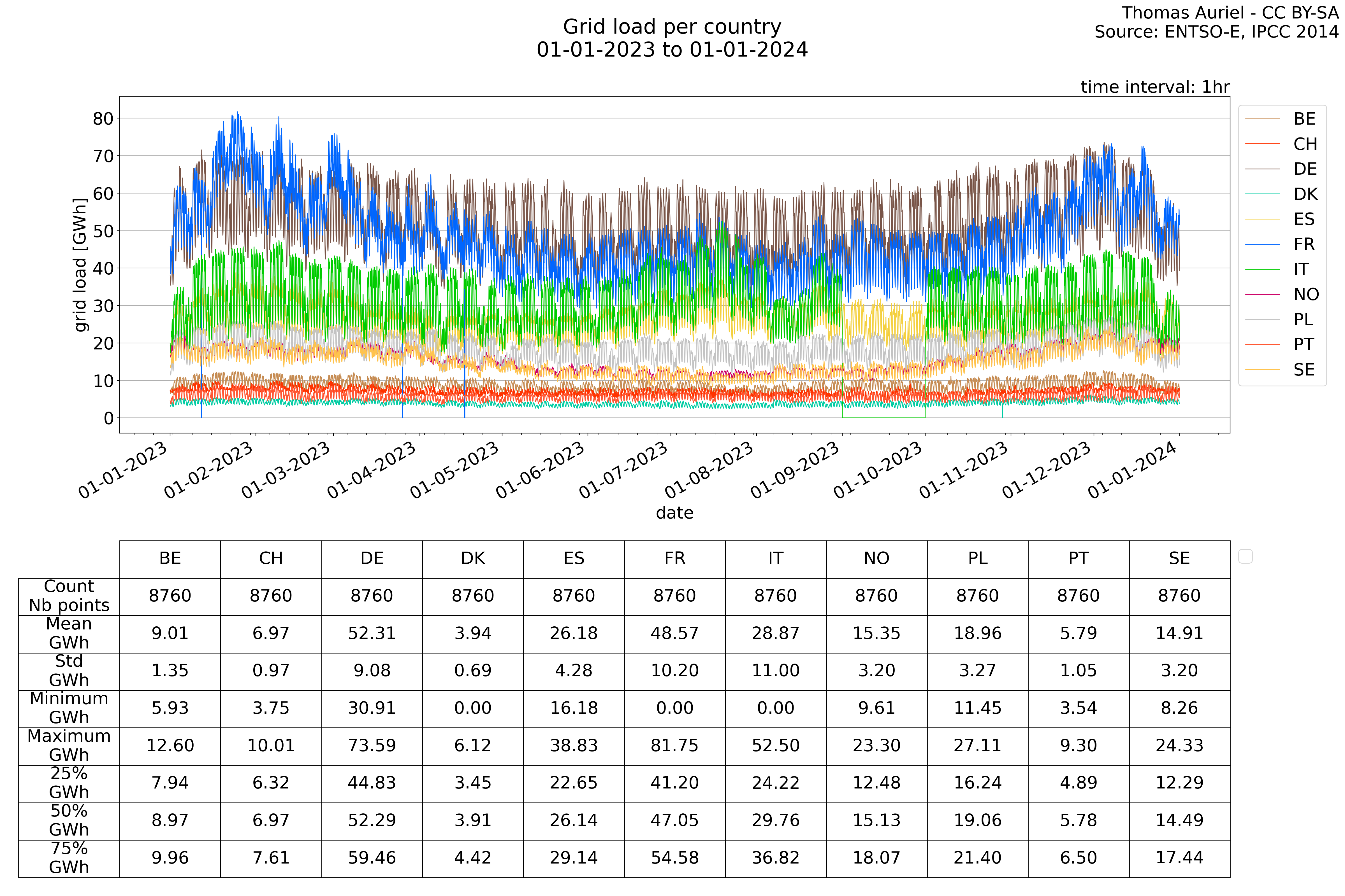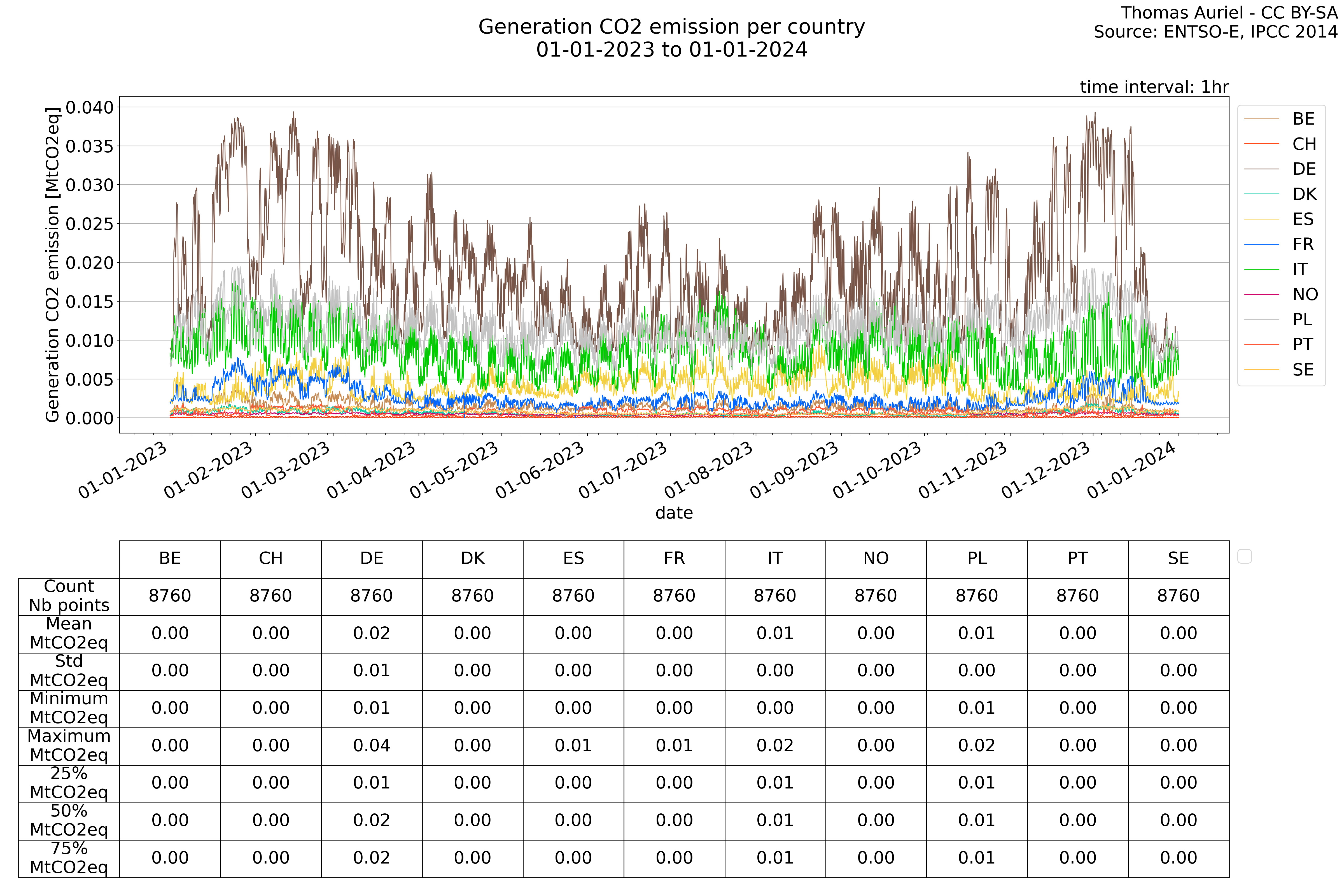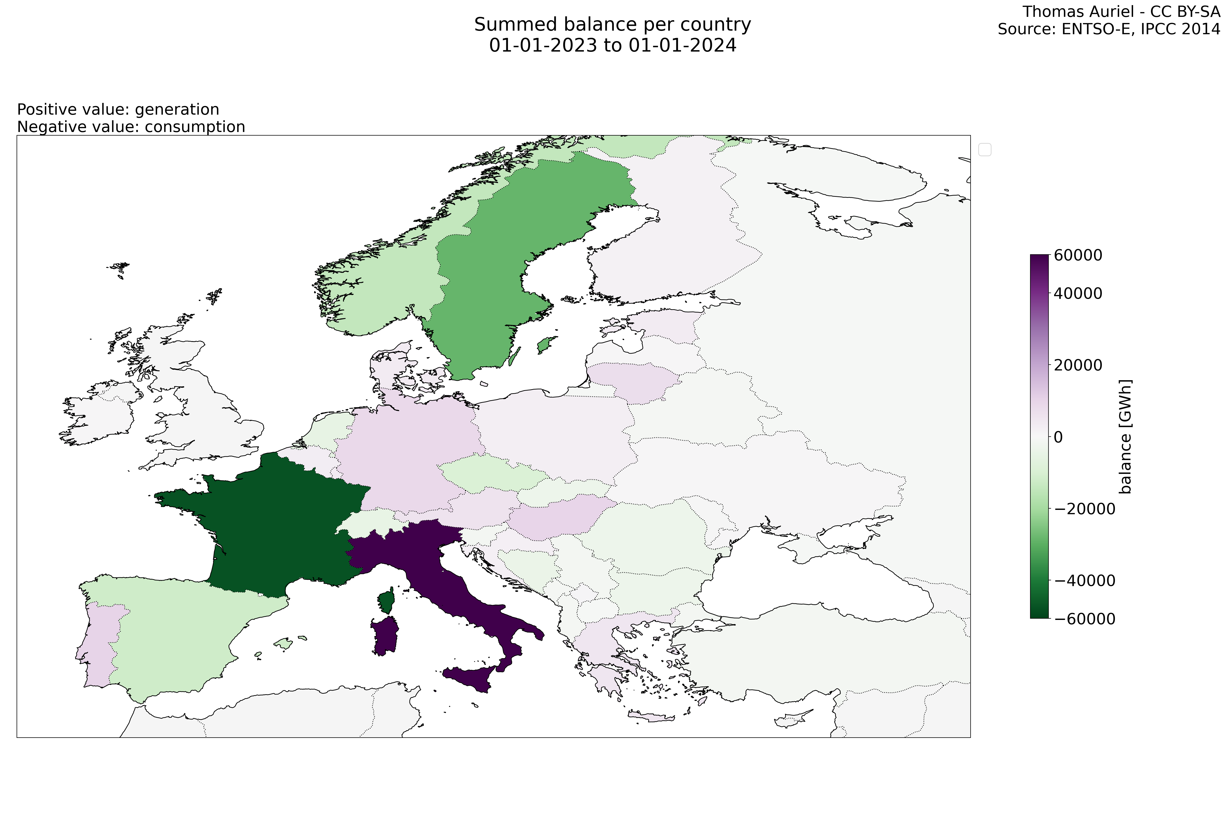 In these hourly line plots, the x-axis spans the entire year, with hours as individual data points. The y-axis represents the values of production, exchange, consumption, and data emissions, but unlike cumulative plots, these plots are designed for quality control purposes. Each line on the plot corresponds to a specific country and is used to identify data irregularities, holes, or artifacts that may occur within the year. By examining these plots, it is possible to spot discrepancies or missing data points in the hourly records, ensuring data integrity.