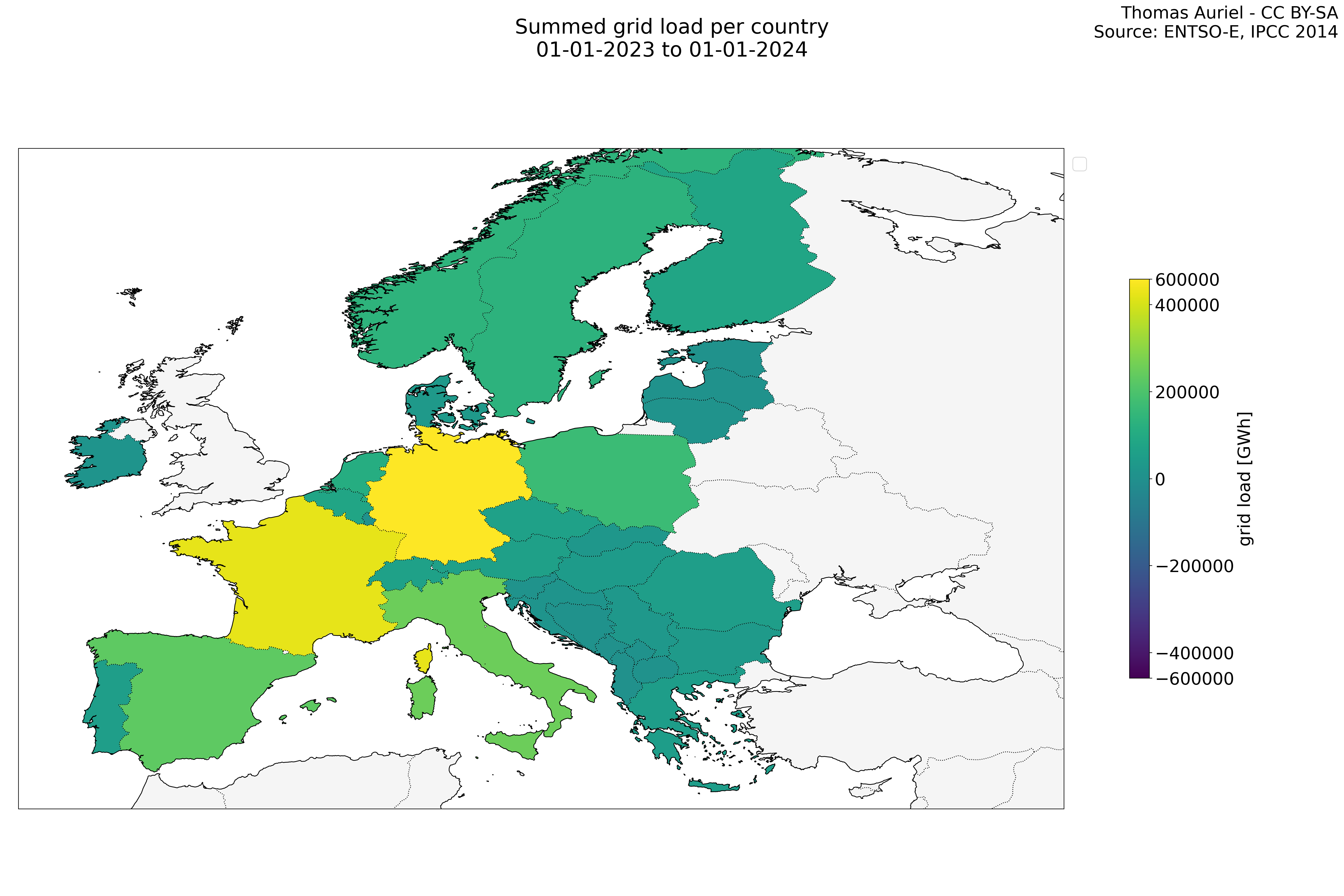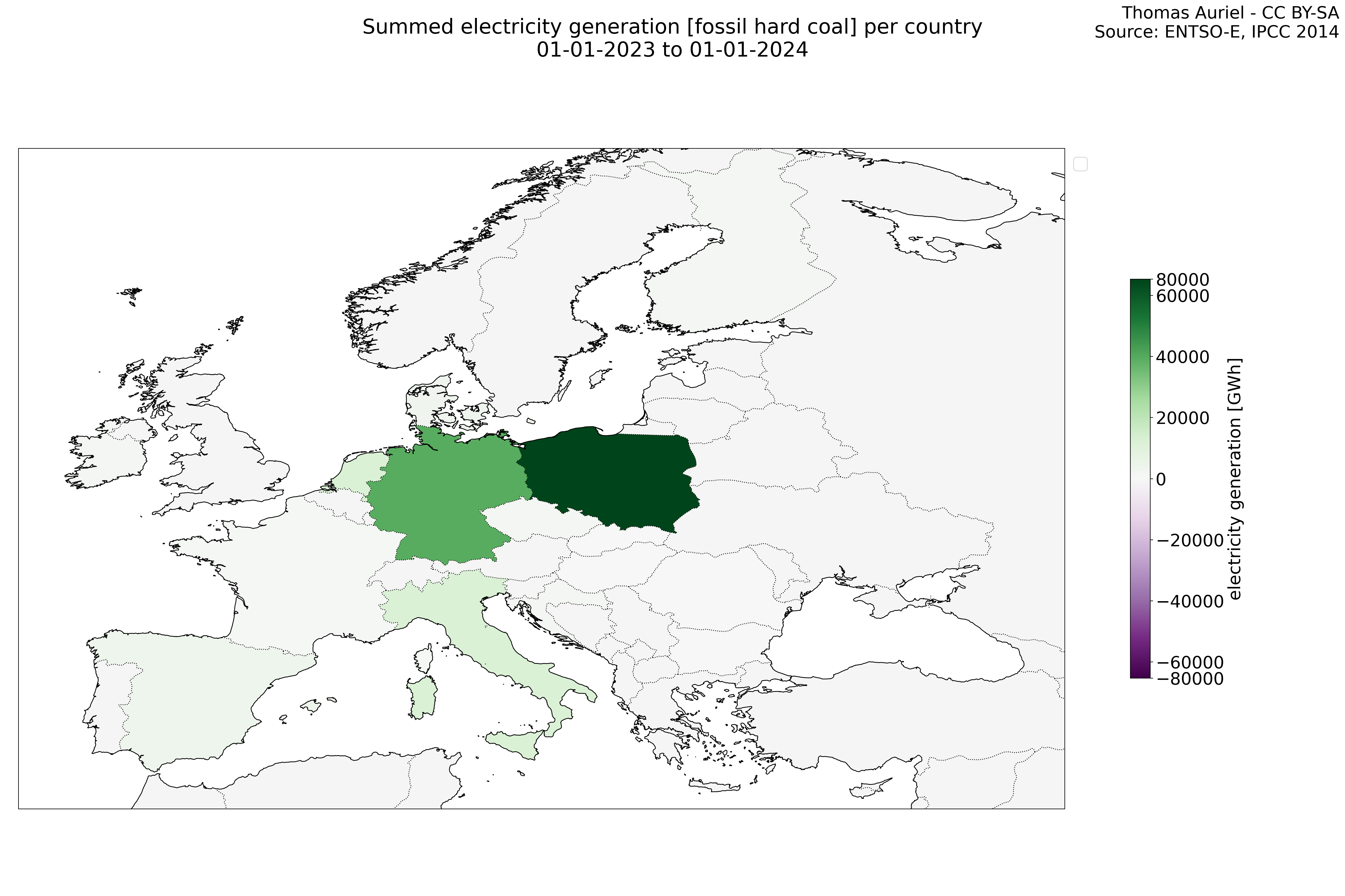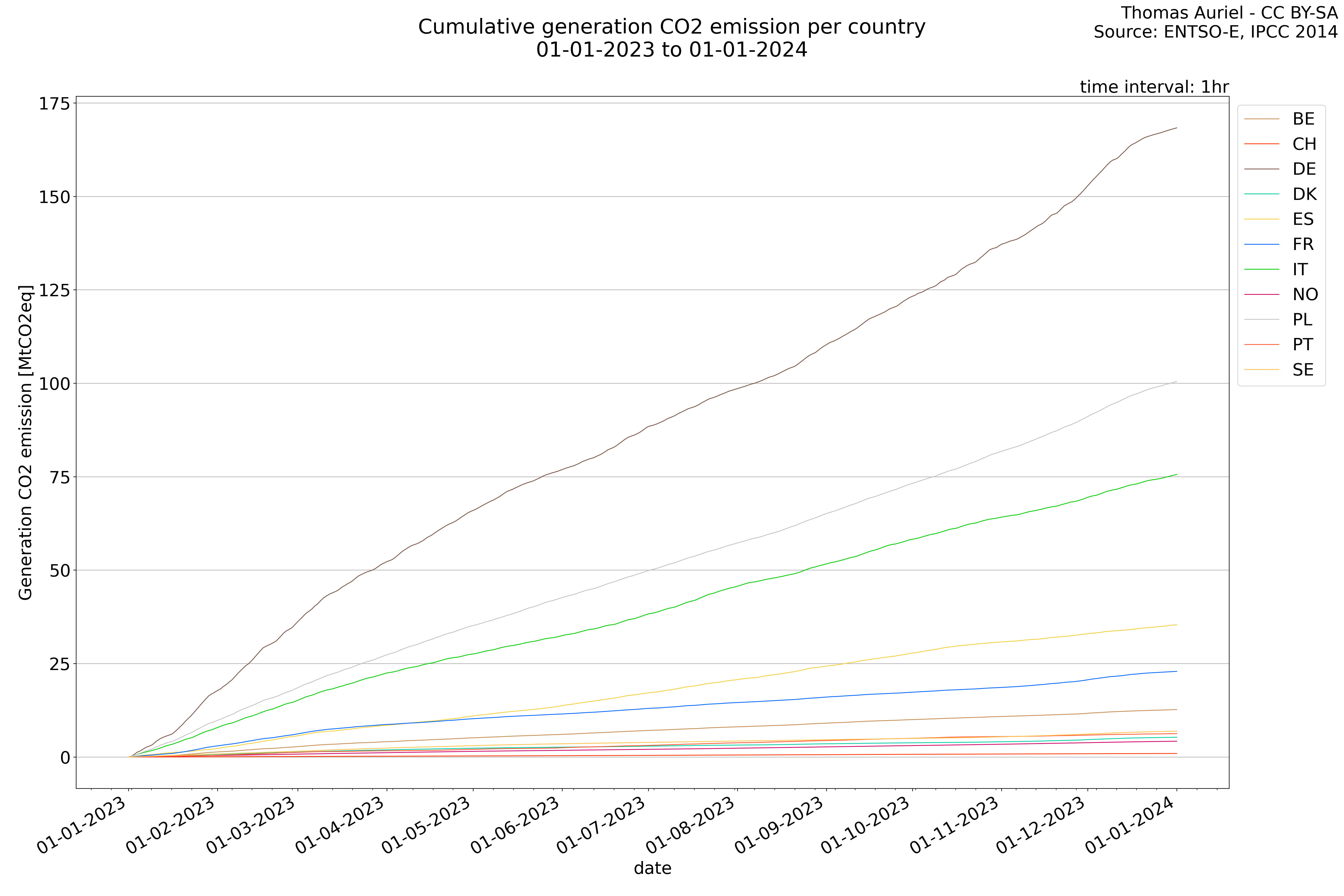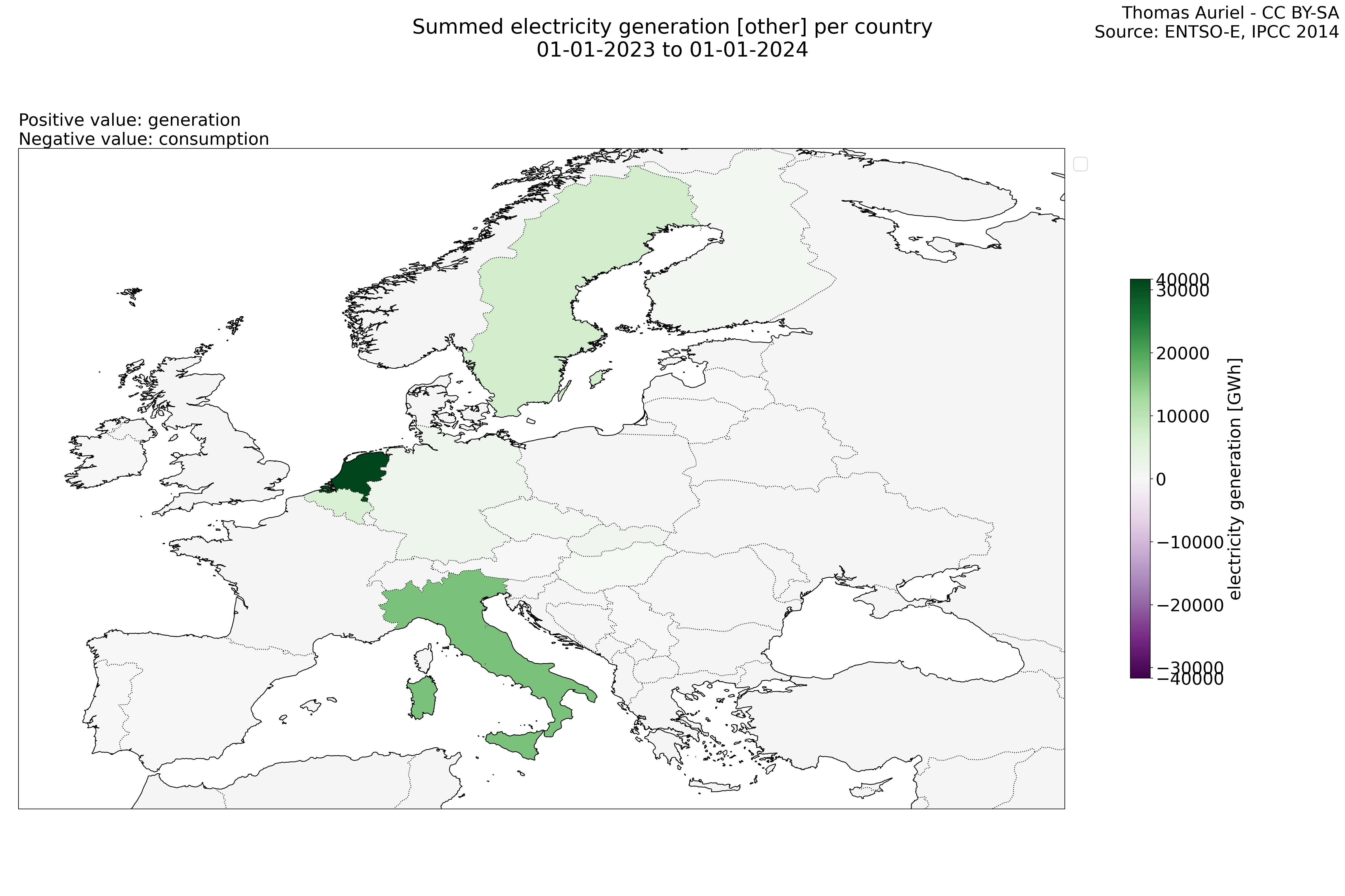 In these hourly line plots, the x-axis spans the entire year, with hours as individual data points. The y-axis represents the values of production, exchange, consumption, and data emissions, but unlike cumulative plots, these plots are designed for quality control purposes. Each line on the plot corresponds to a specific country and is used to identify data irregularities, holes, or artifacts that may occur within the year. By examining these plots, it is possible to spot discrepancies or missing data points in the hourly records, ensuring data integrity.