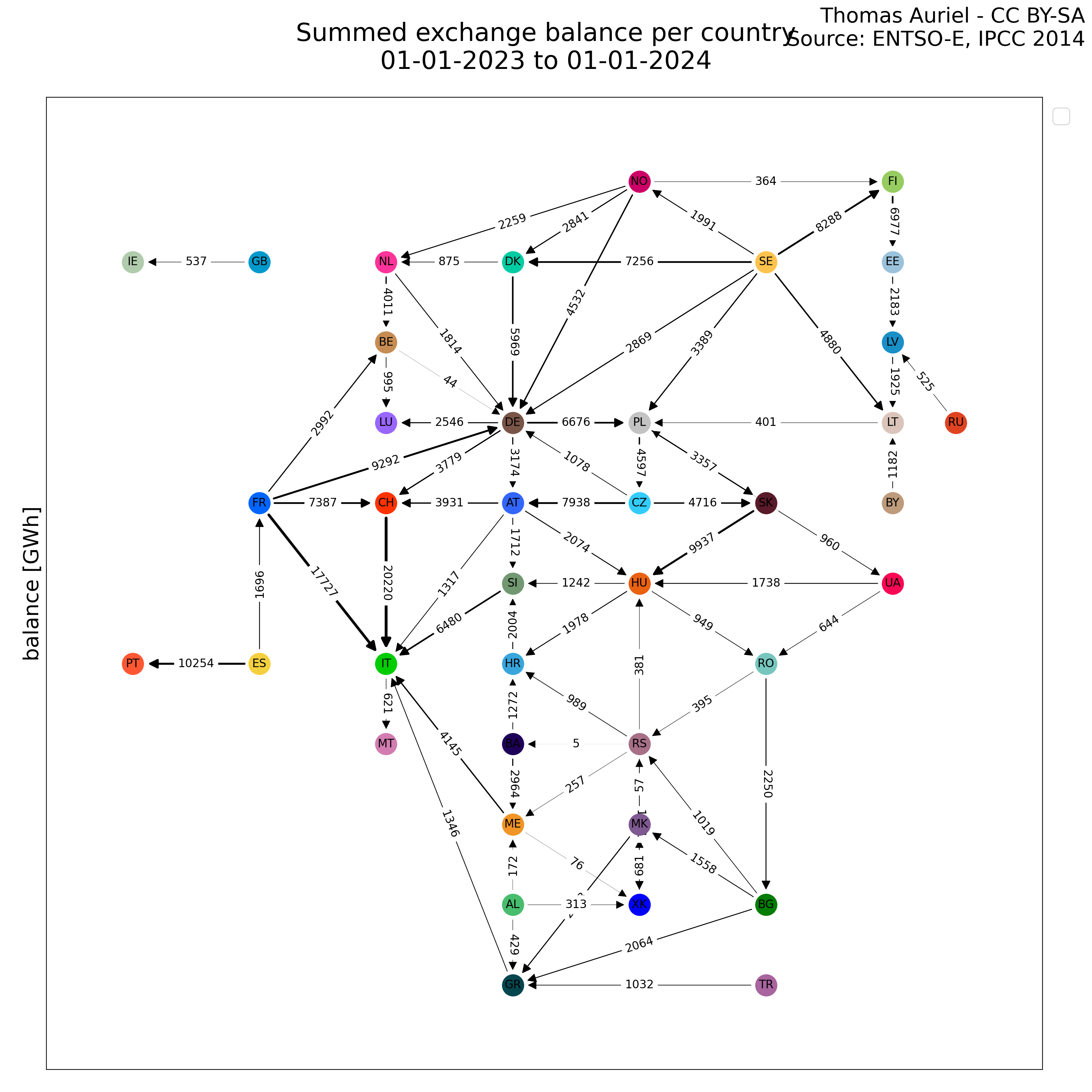 Graph network representations visualize complex interactions and electricity exchange among countries. Nodes represent individual countries, labeled with their iso code. Links illustrate the flow, direction, and intensity of exchanges, with wider links denoting greater exchange values. This representation aids in identifying countries with significant interactions and offers insights into international relationships.