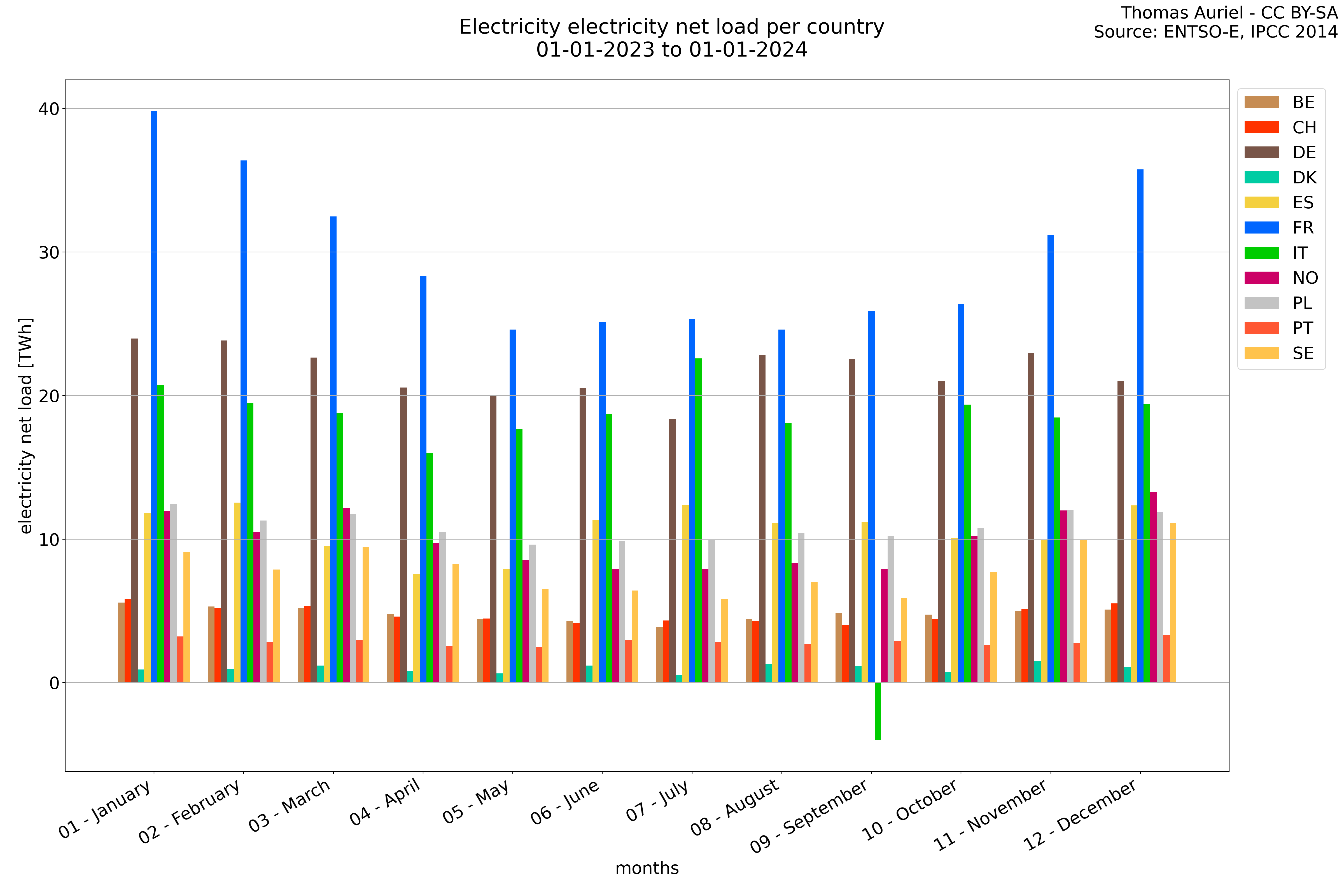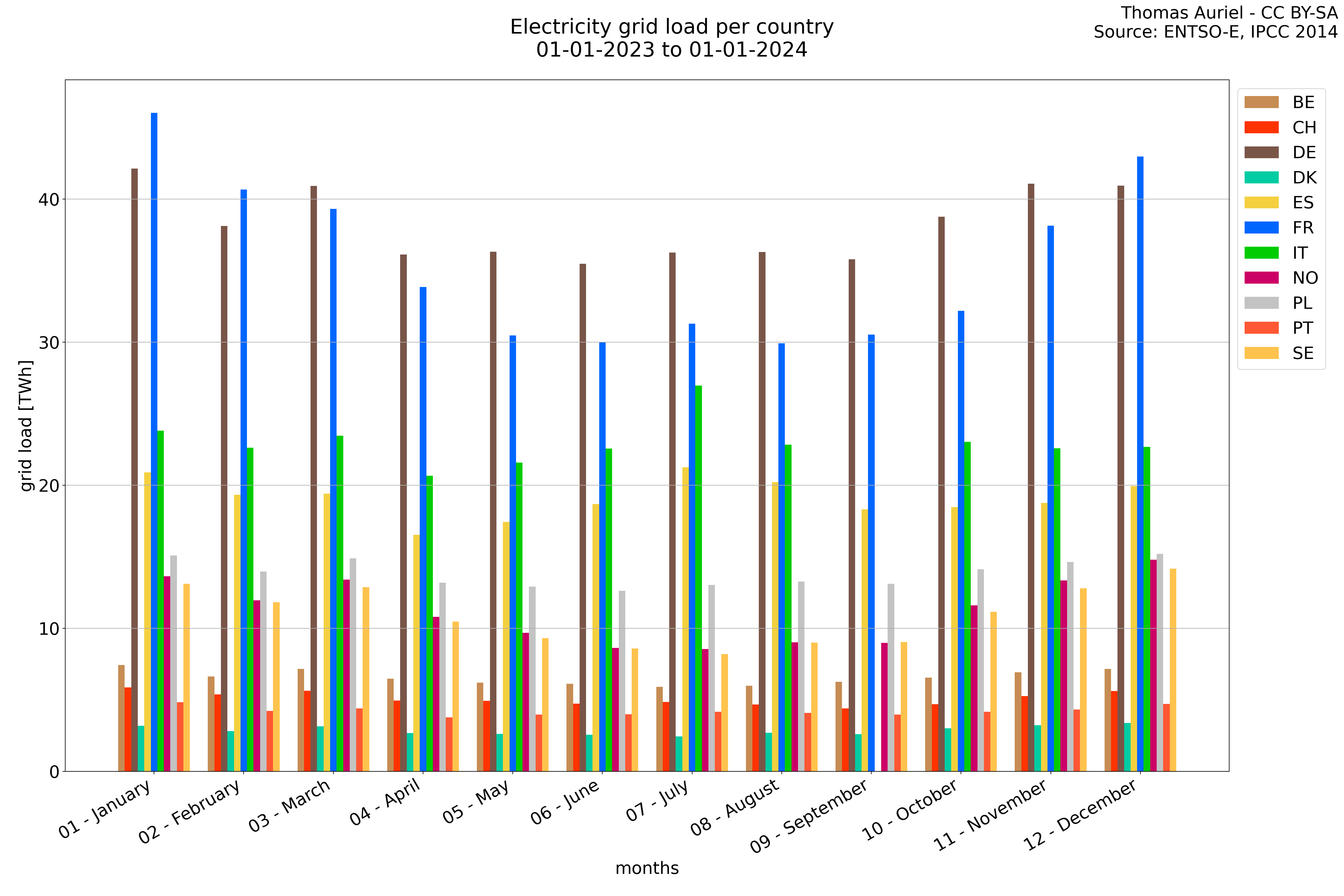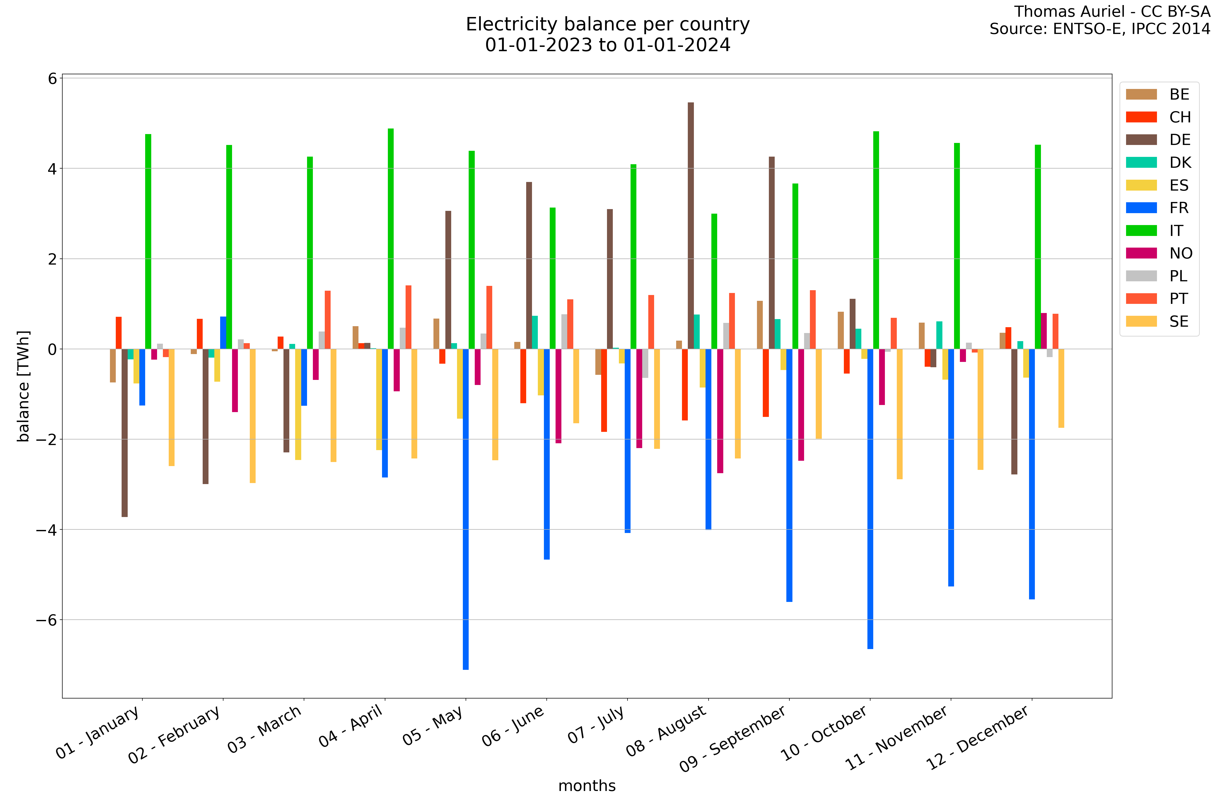 A periode plot takes a general view of the data by summing all the values over each month and presents them as a stacked bar plot. This visualization method allows for a clear understanding of how each country grid change over months. Then the Periode plot does not provide time-based trends but instead give an insight on the composition of the data within the chosen period.