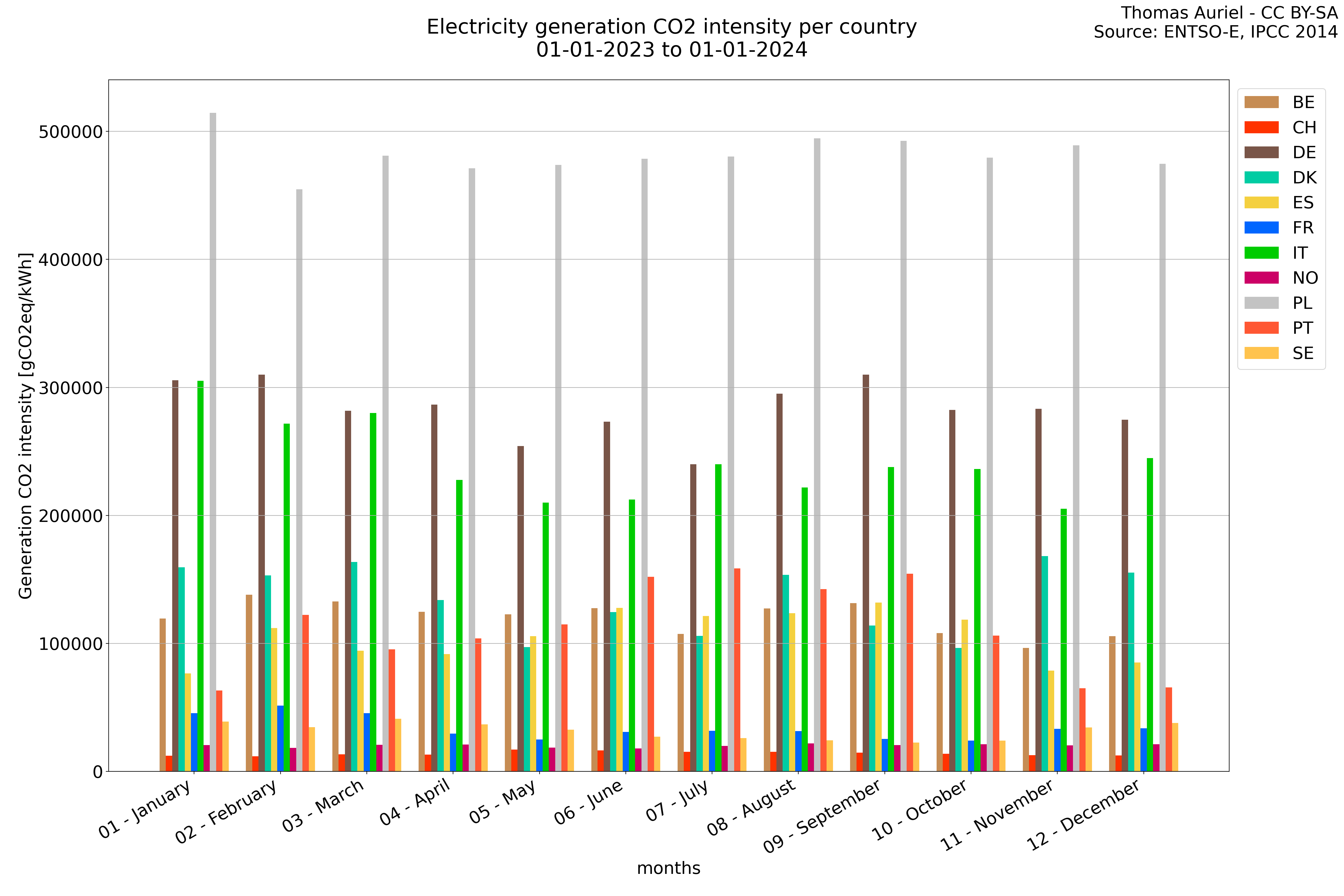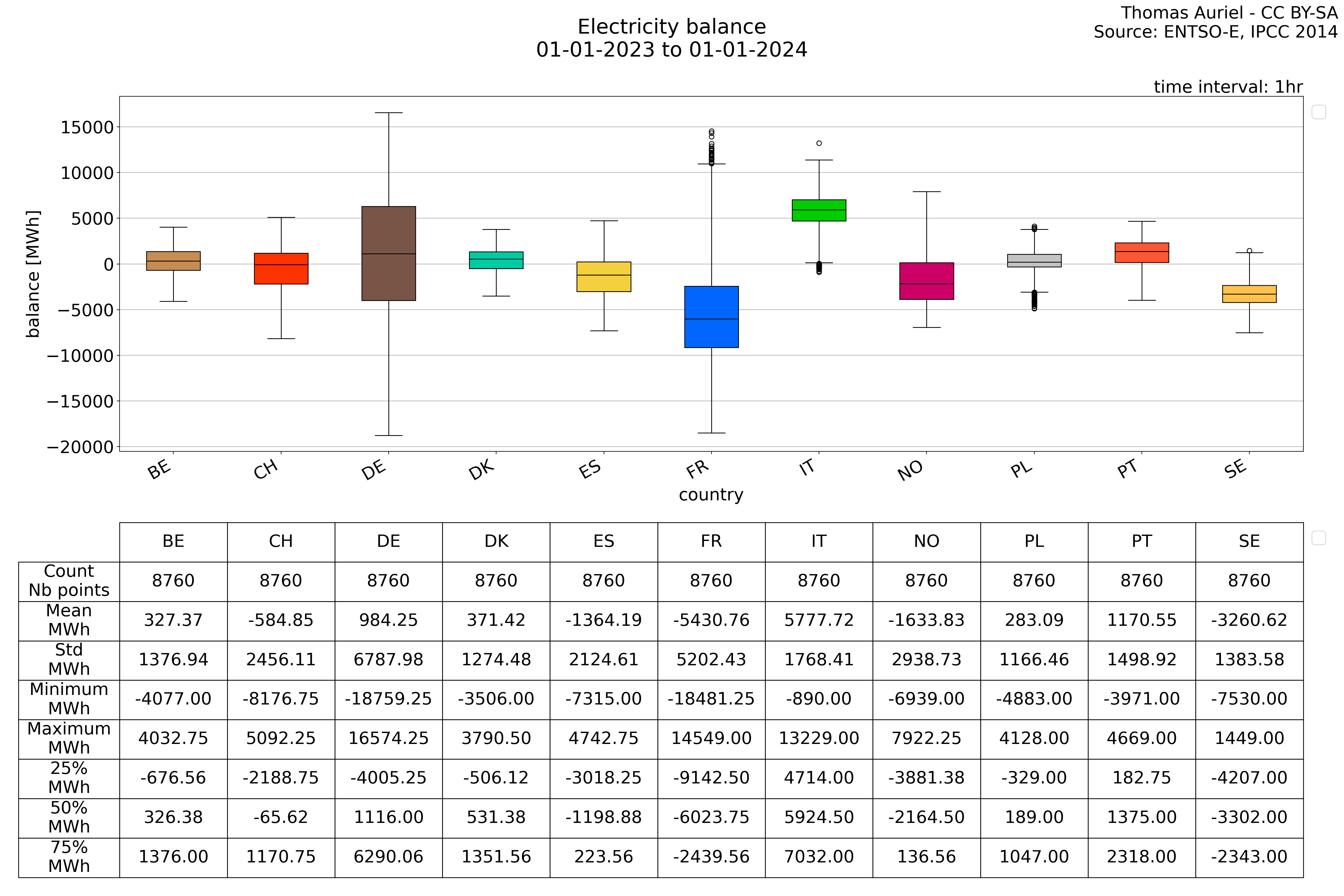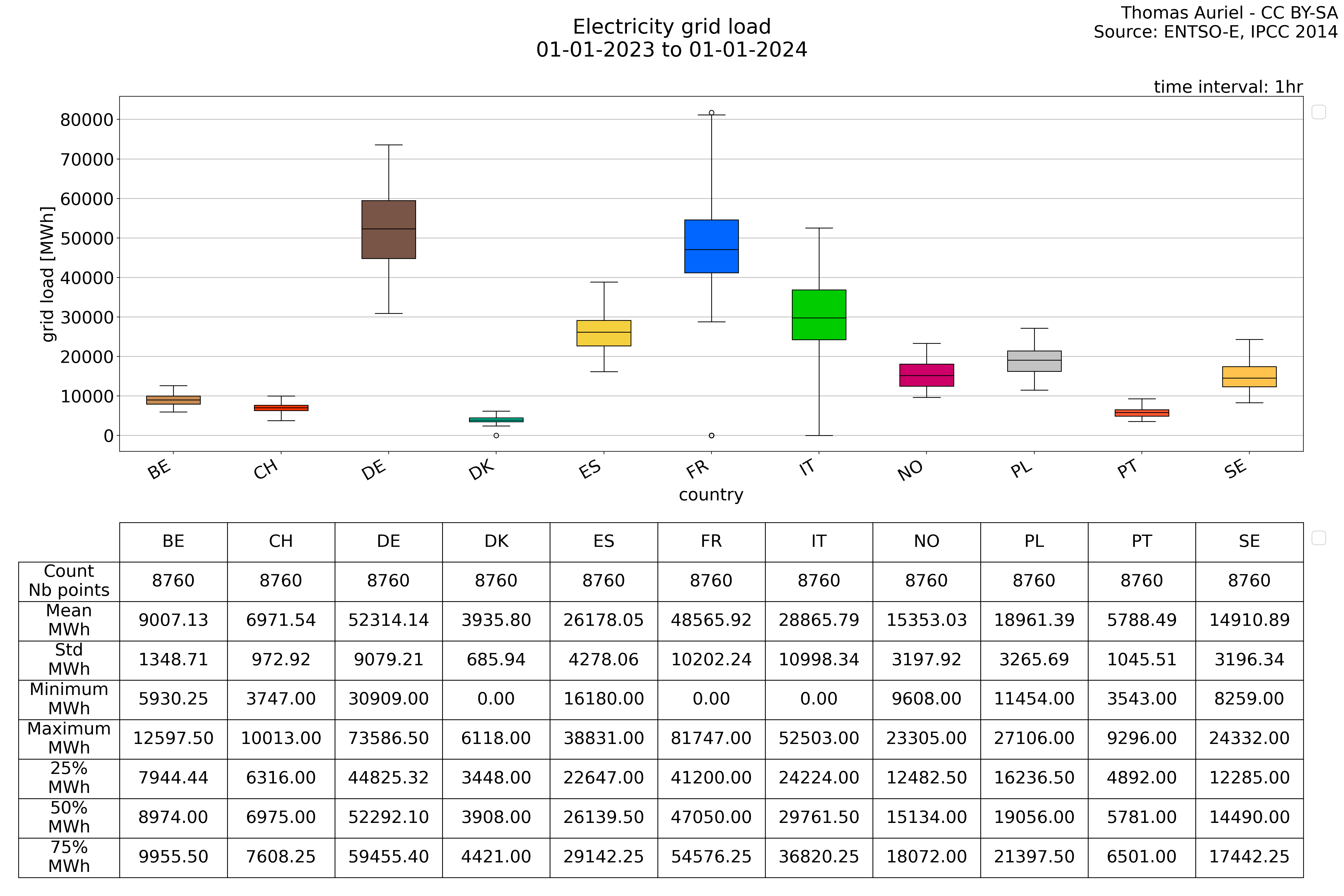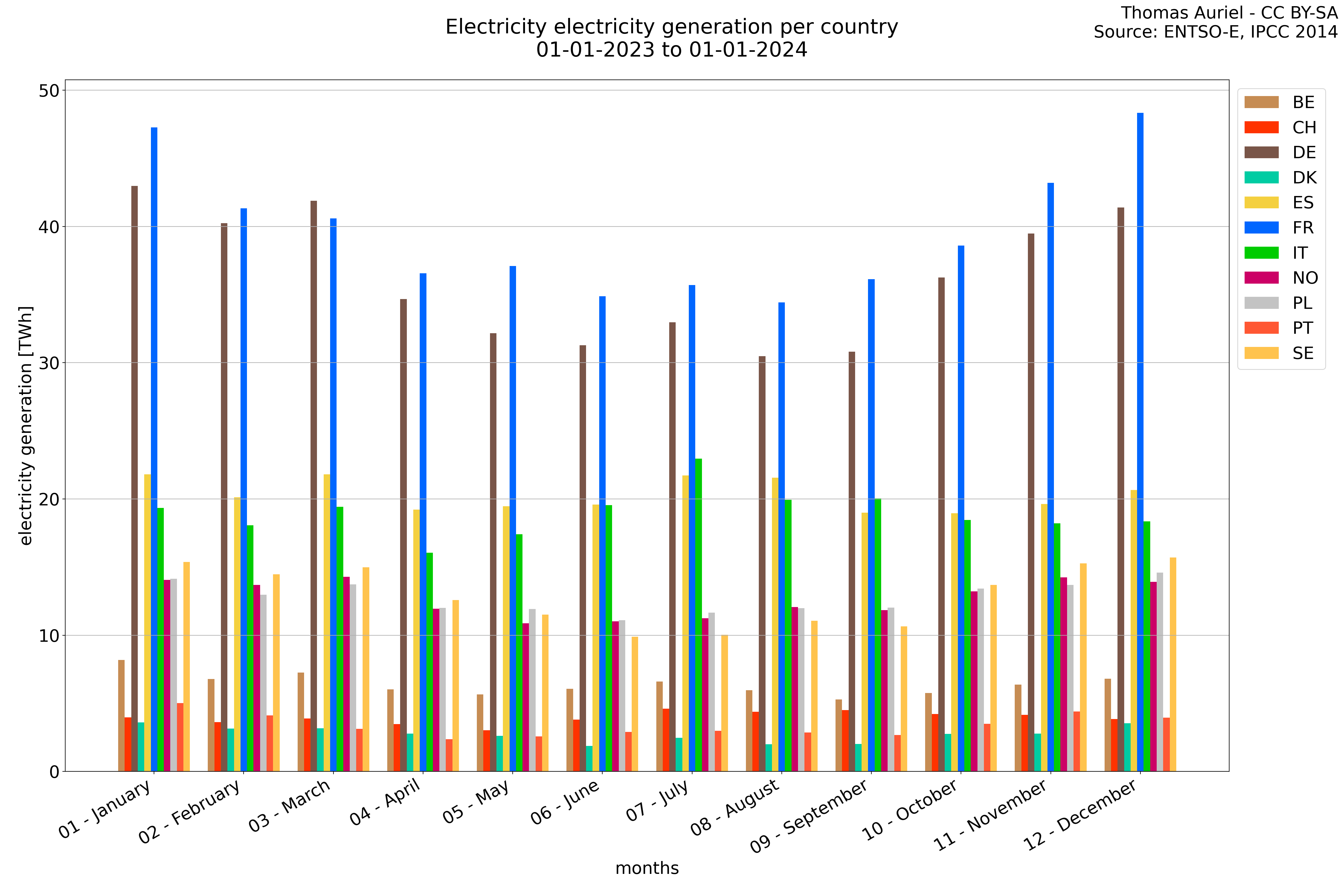 A periode plot takes a general view of the data by summing all the values over each month and presents them as a stacked bar plot. This visualization method allows for a clear understanding of how each country grid change over months. Then the Periode plot does not provide time-based trends but instead give an insight on the composition of the data within the chosen period.