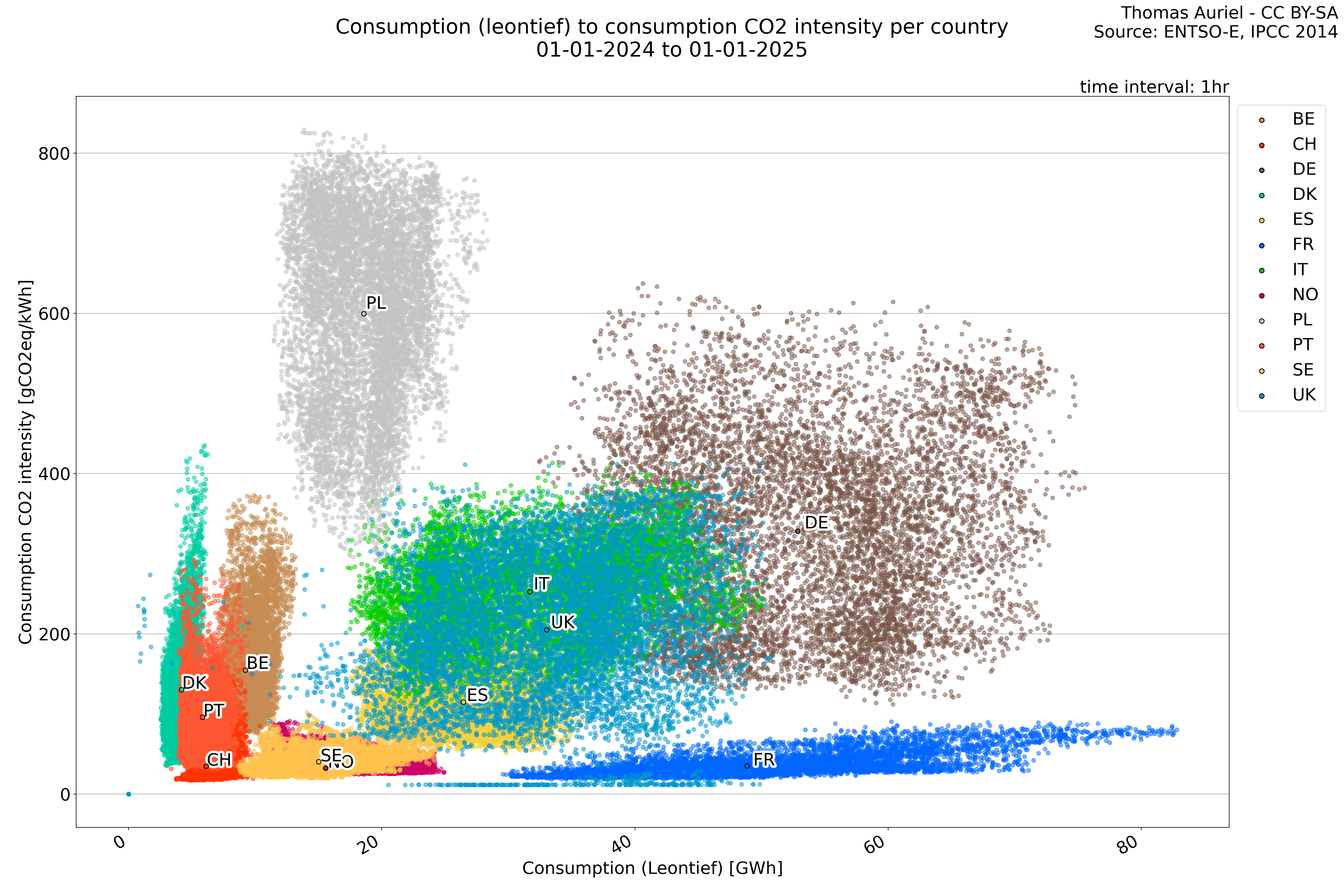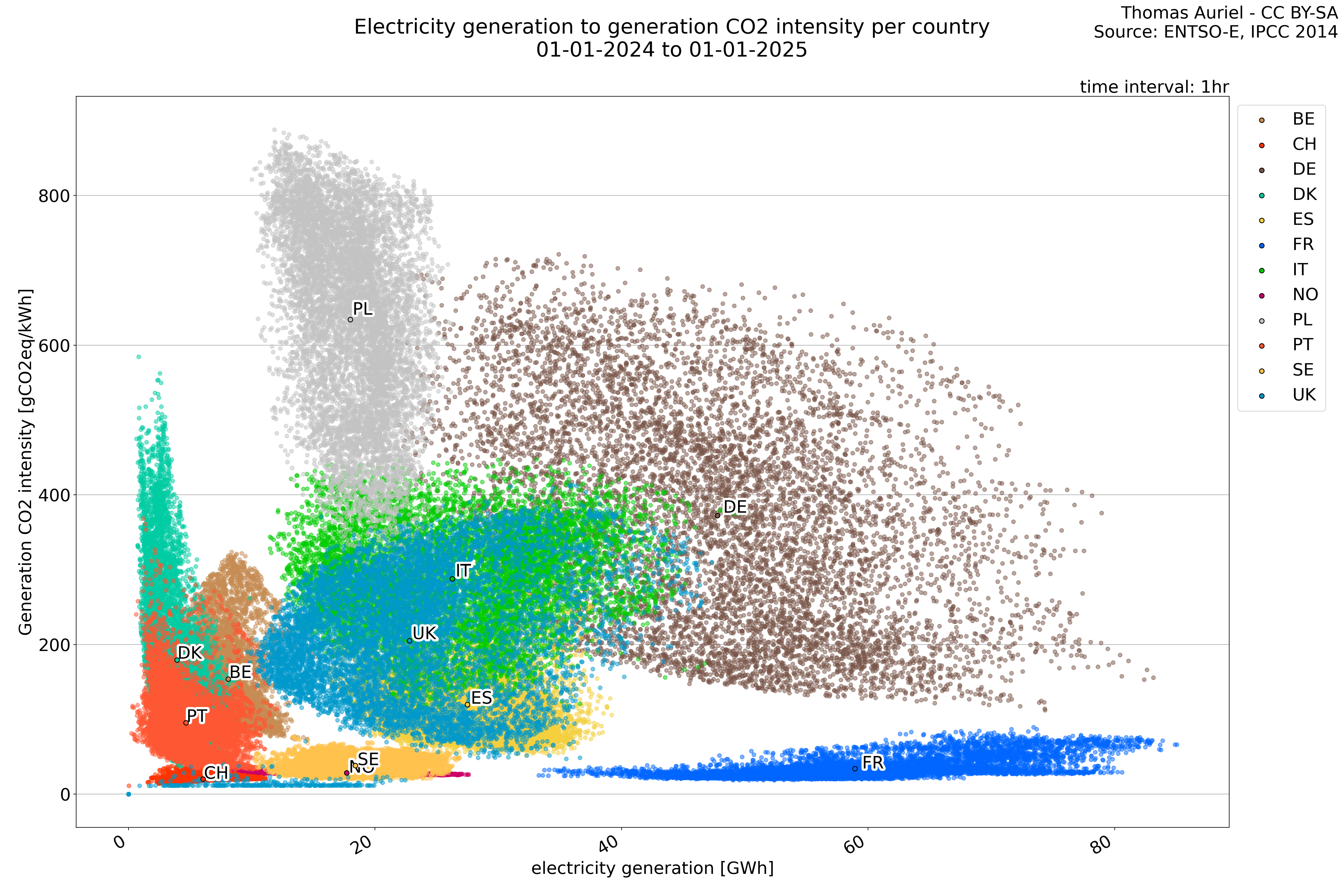 To read the scatter plot, locate a point on the graph and trace it back to both axes. The x-axis value gives the hour of production, and the y-axis value gives the CO2 intensity for that hour. By examining where the points are clustered, you can identify trends. For example, a cluster of points towards the lower right might indicate that higher production hours are associated with lower CO2 intensity for a particular country.
