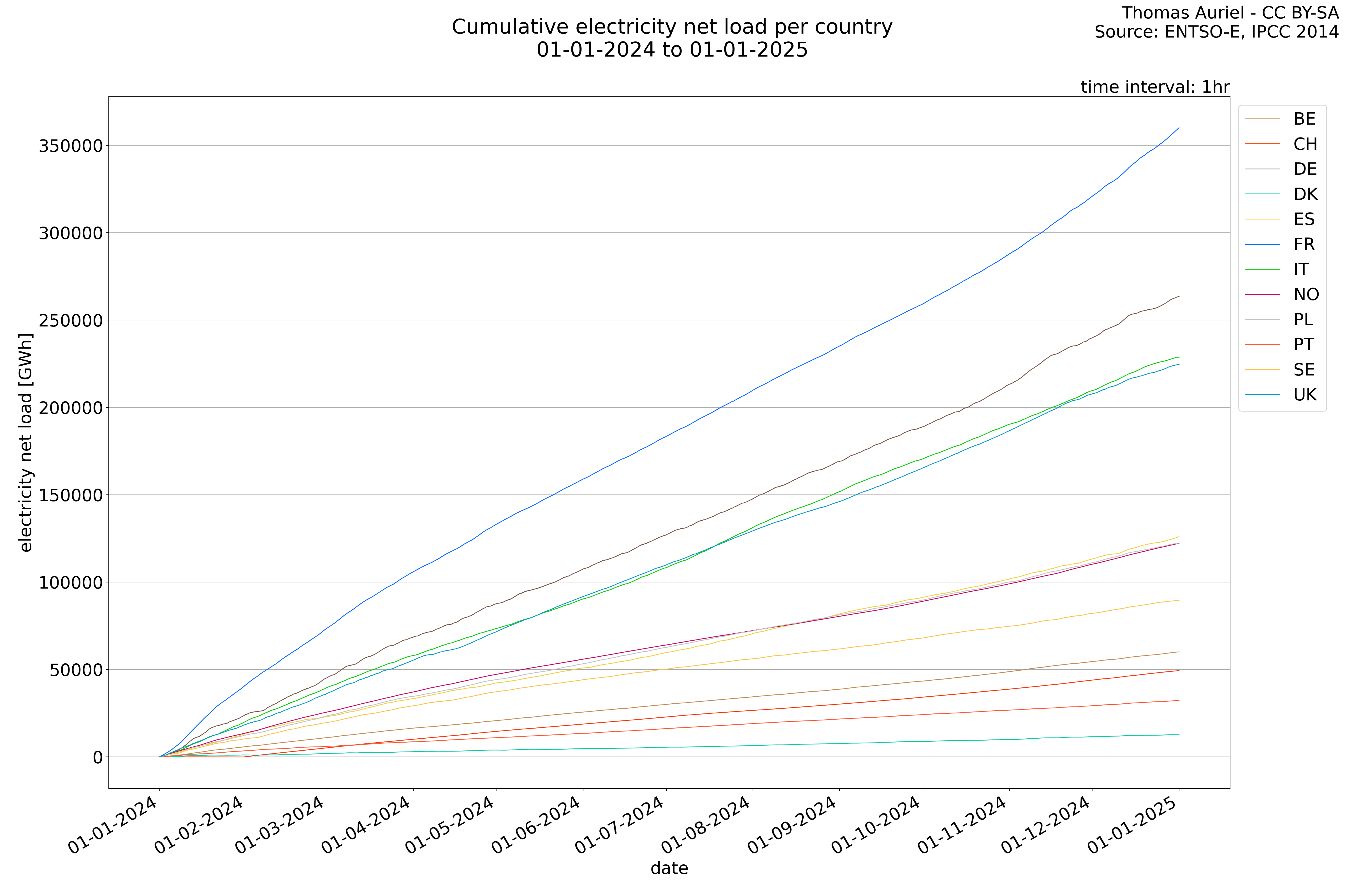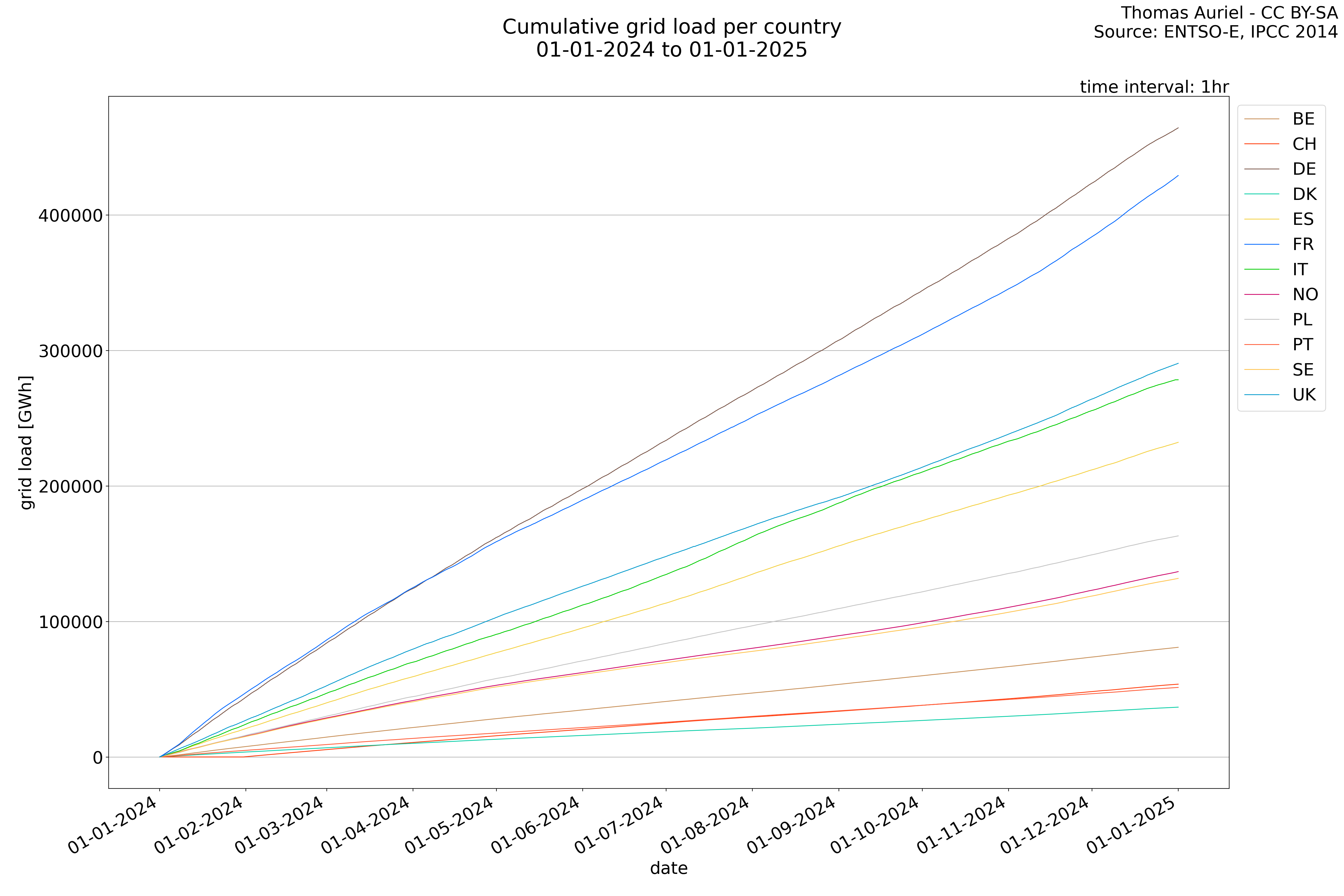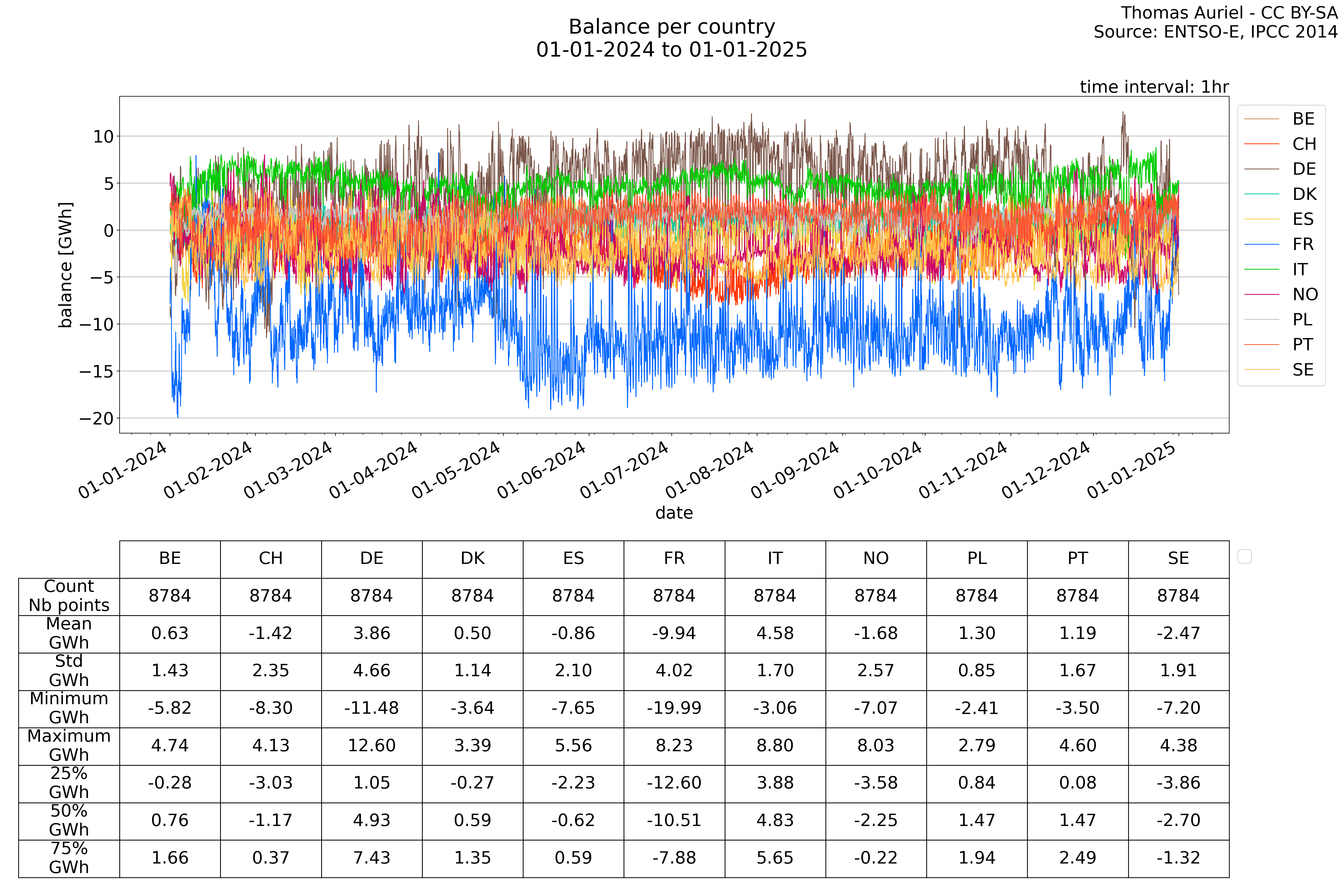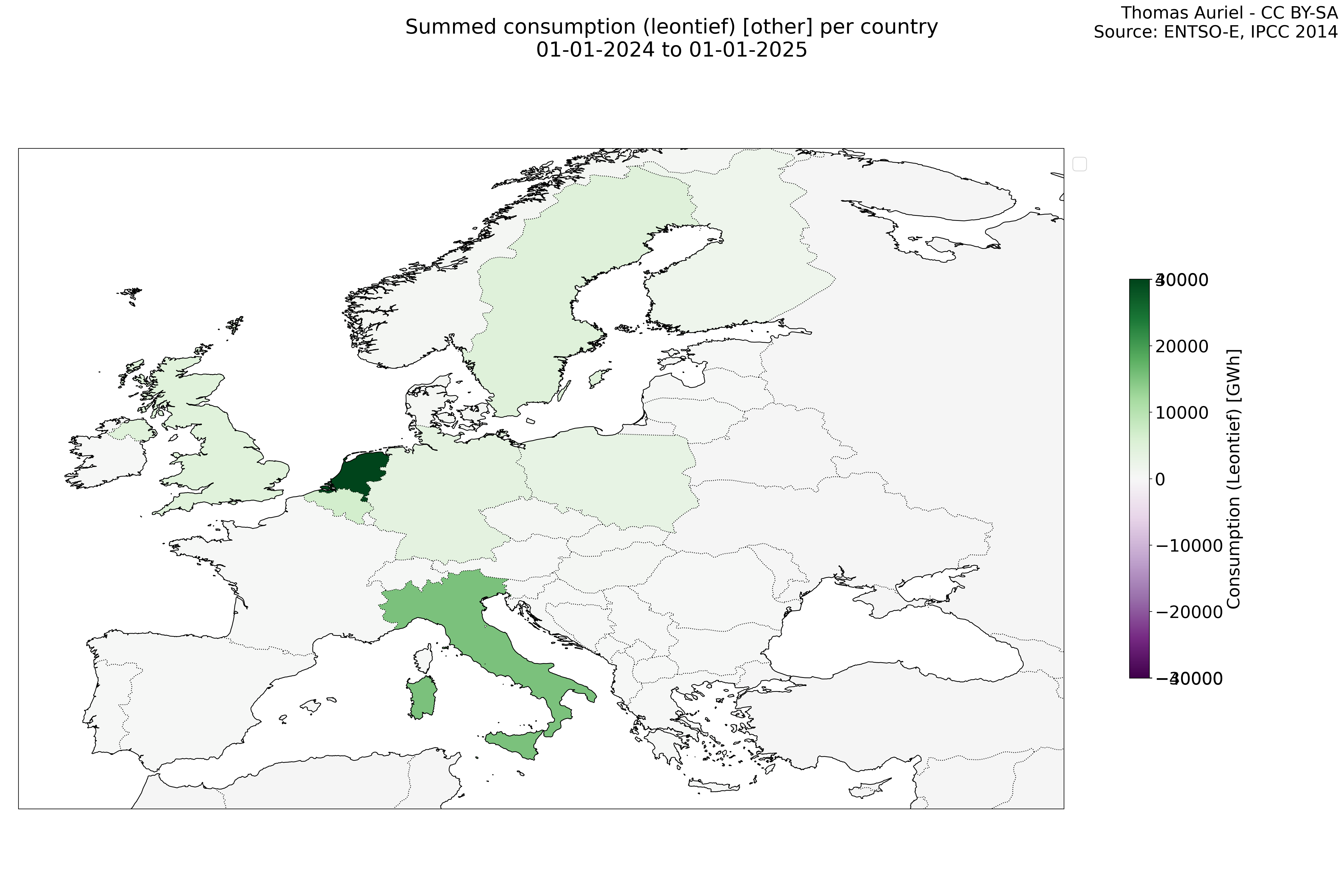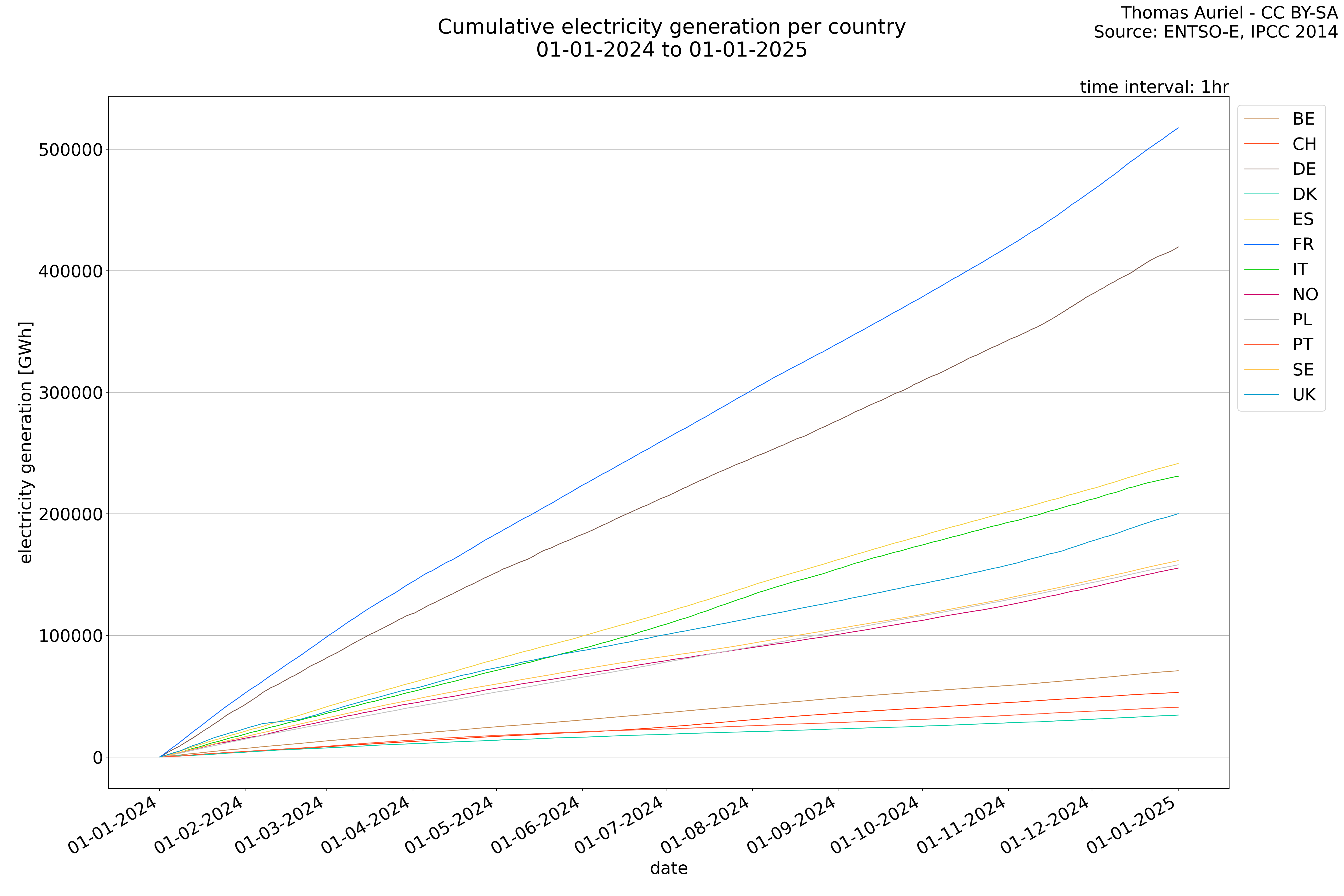 In these hourly line plots, the x-axis spans the entire year, with hours as individual data points. The y-axis represents the values of production, exchange, consumption, and data emissions, but unlike cumulative plots, these plots are designed for quality control purposes. Each line on the plot corresponds to a specific country and is used to identify data irregularities, holes, or artifacts that may occur within the year. By examining these plots, it is possible to spot discrepancies or missing data points in the hourly records, ensuring data integrity.