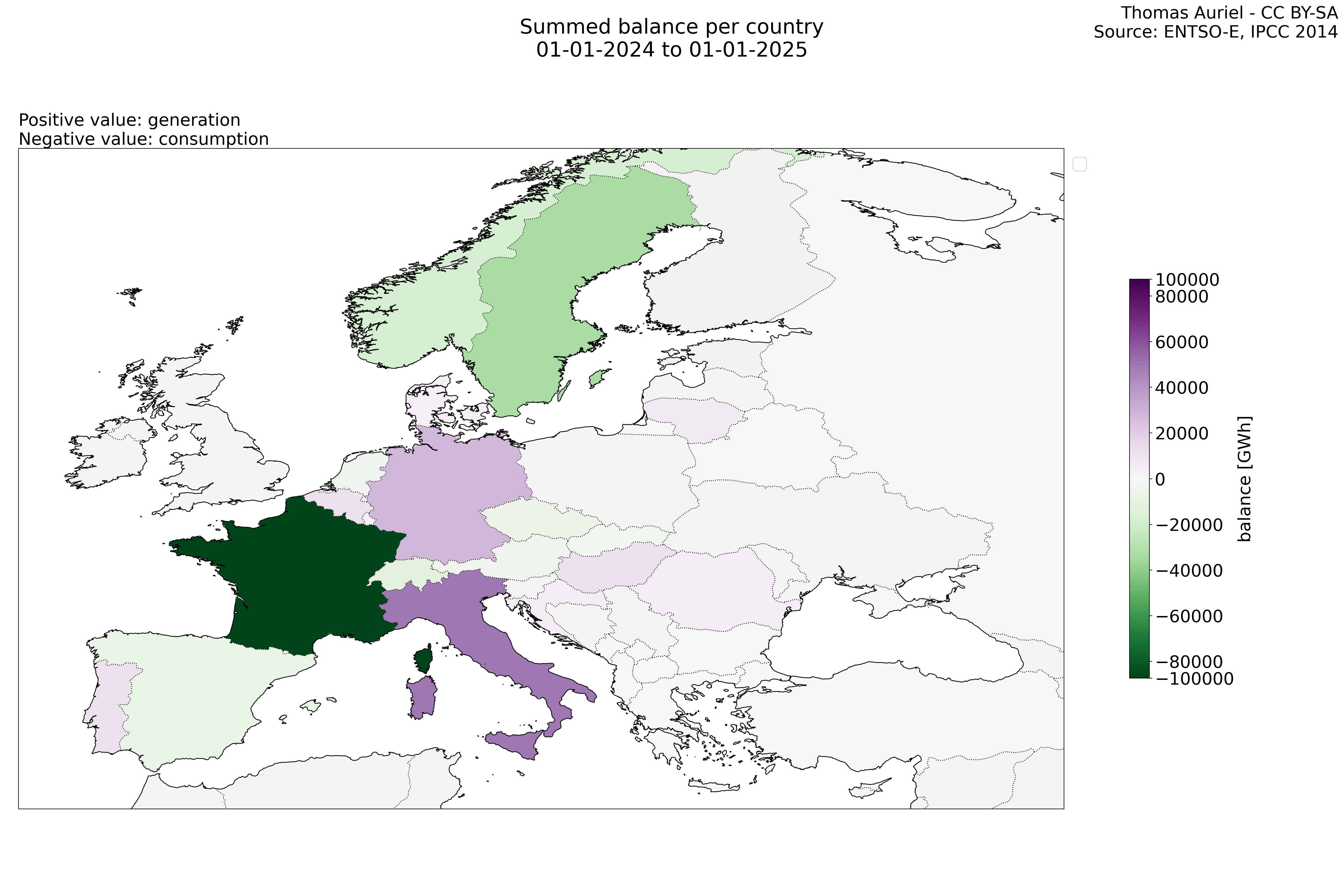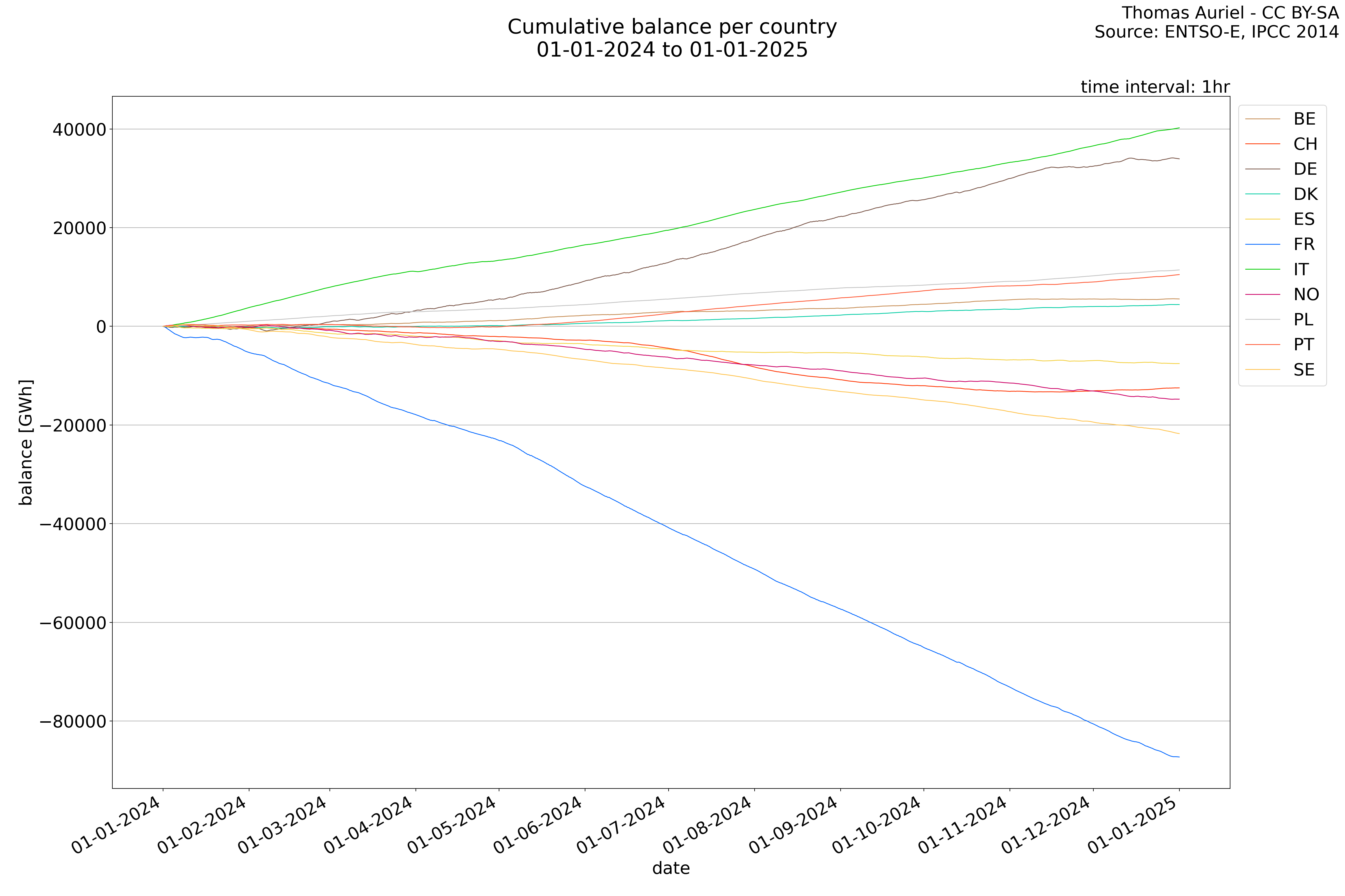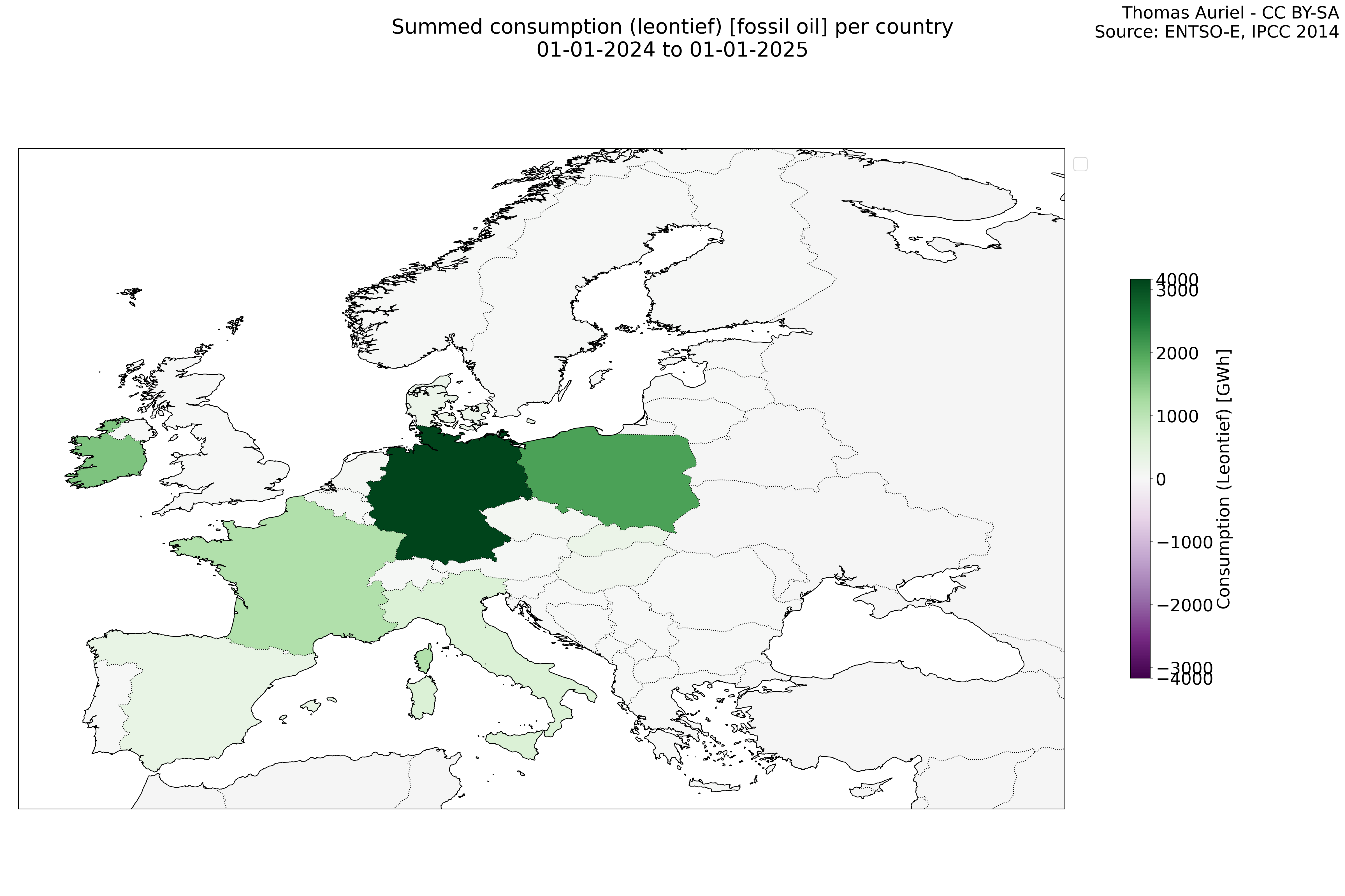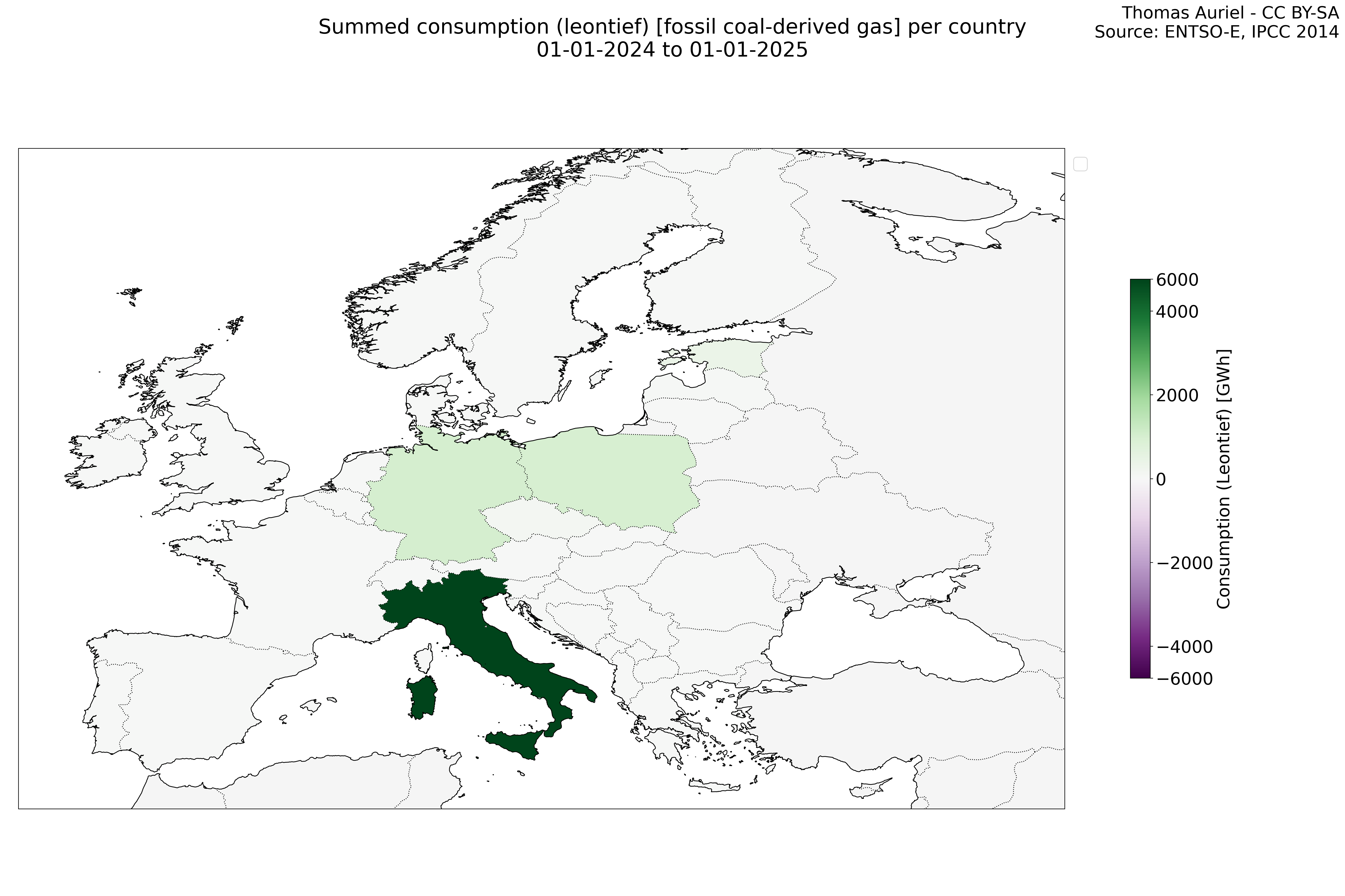 In these hourly line plots, the x-axis spans the entire year, with hours as individual data points. The y-axis represents the values of production, exchange, consumption, and data emissions, but unlike cumulative plots, these plots are designed for quality control purposes. Each line on the plot corresponds to a specific country and is used to identify data irregularities, holes, or artifacts that may occur within the year. By examining these plots, it is possible to spot discrepancies or missing data points in the hourly records, ensuring data integrity.
