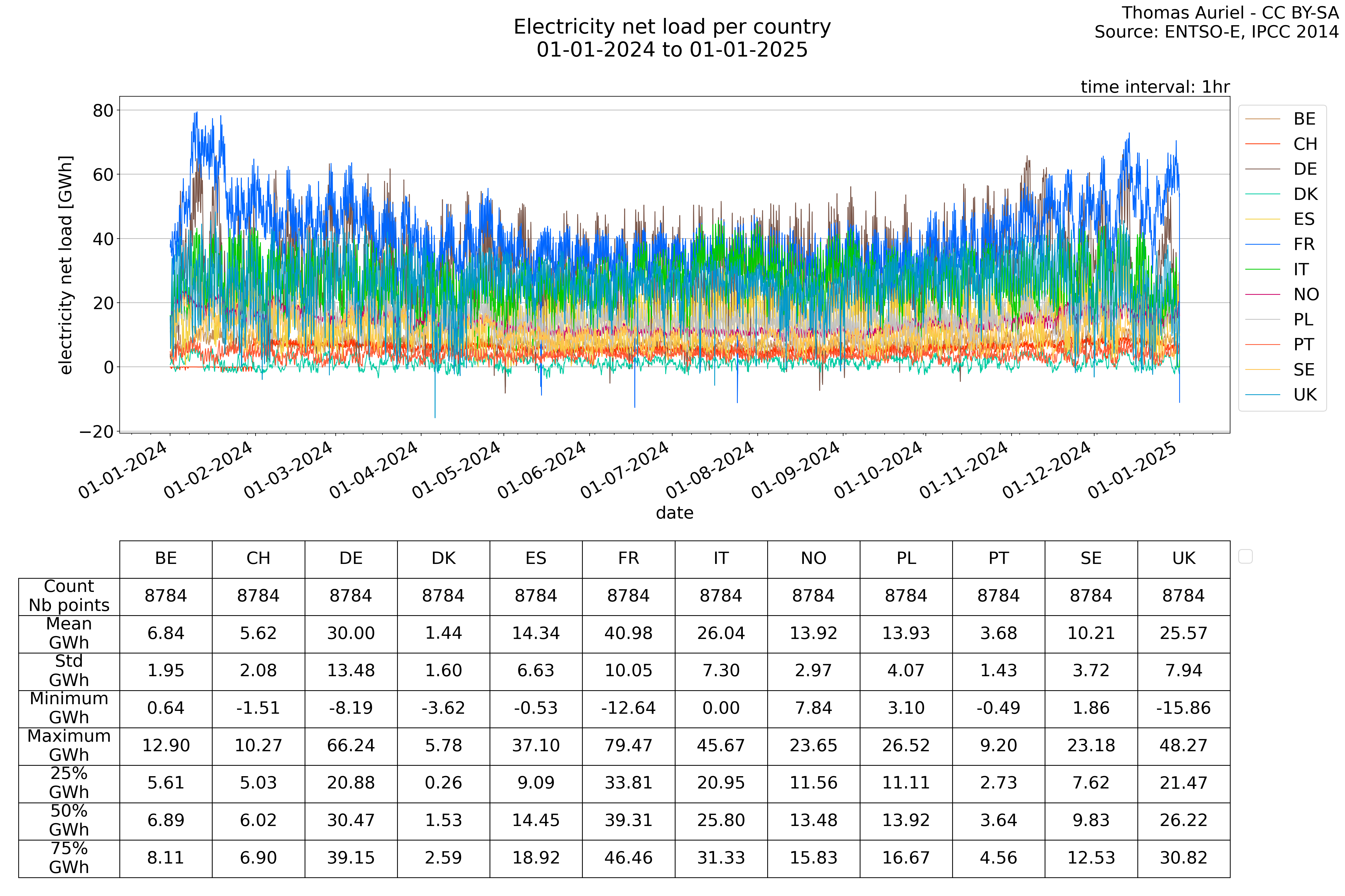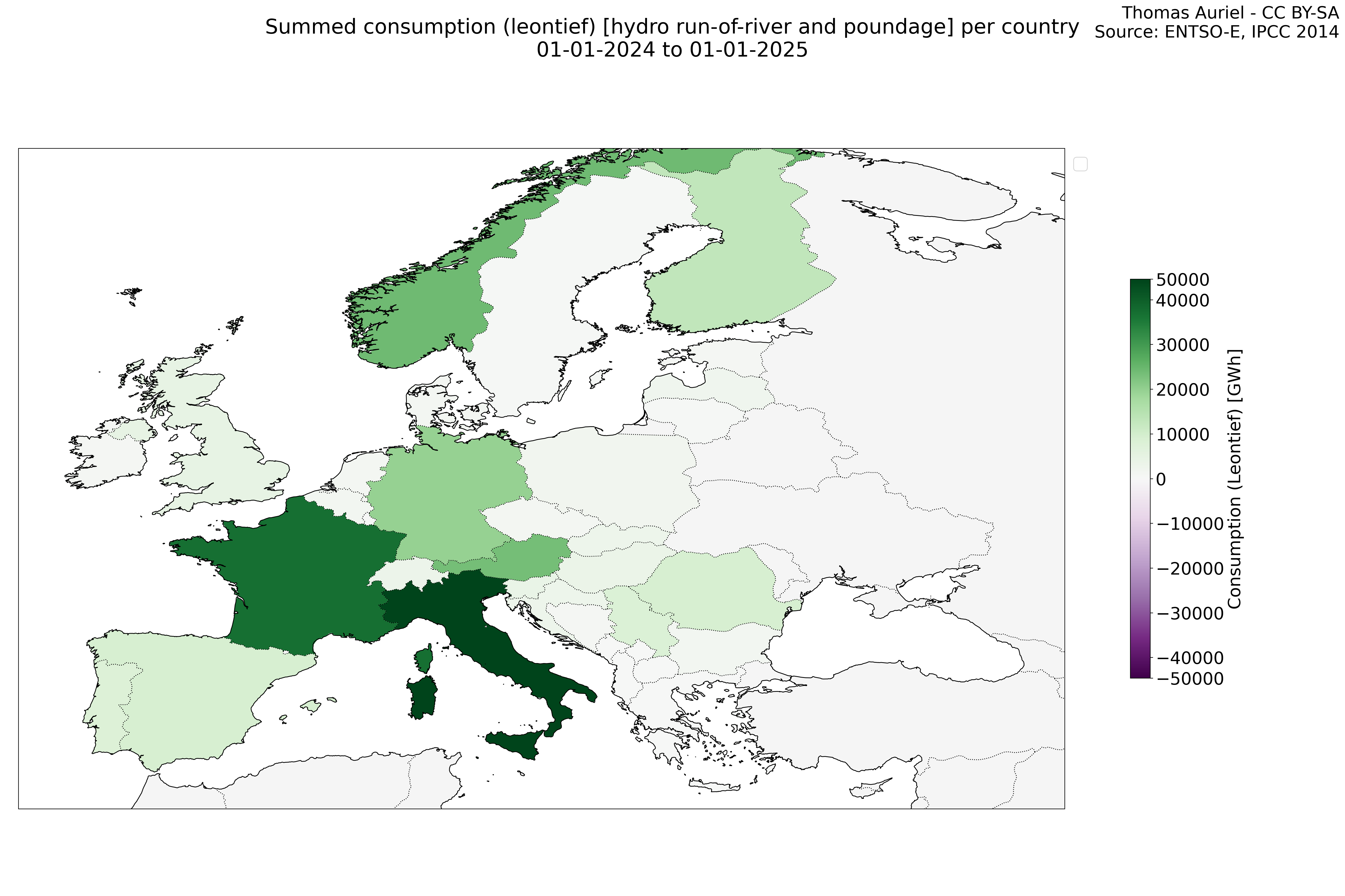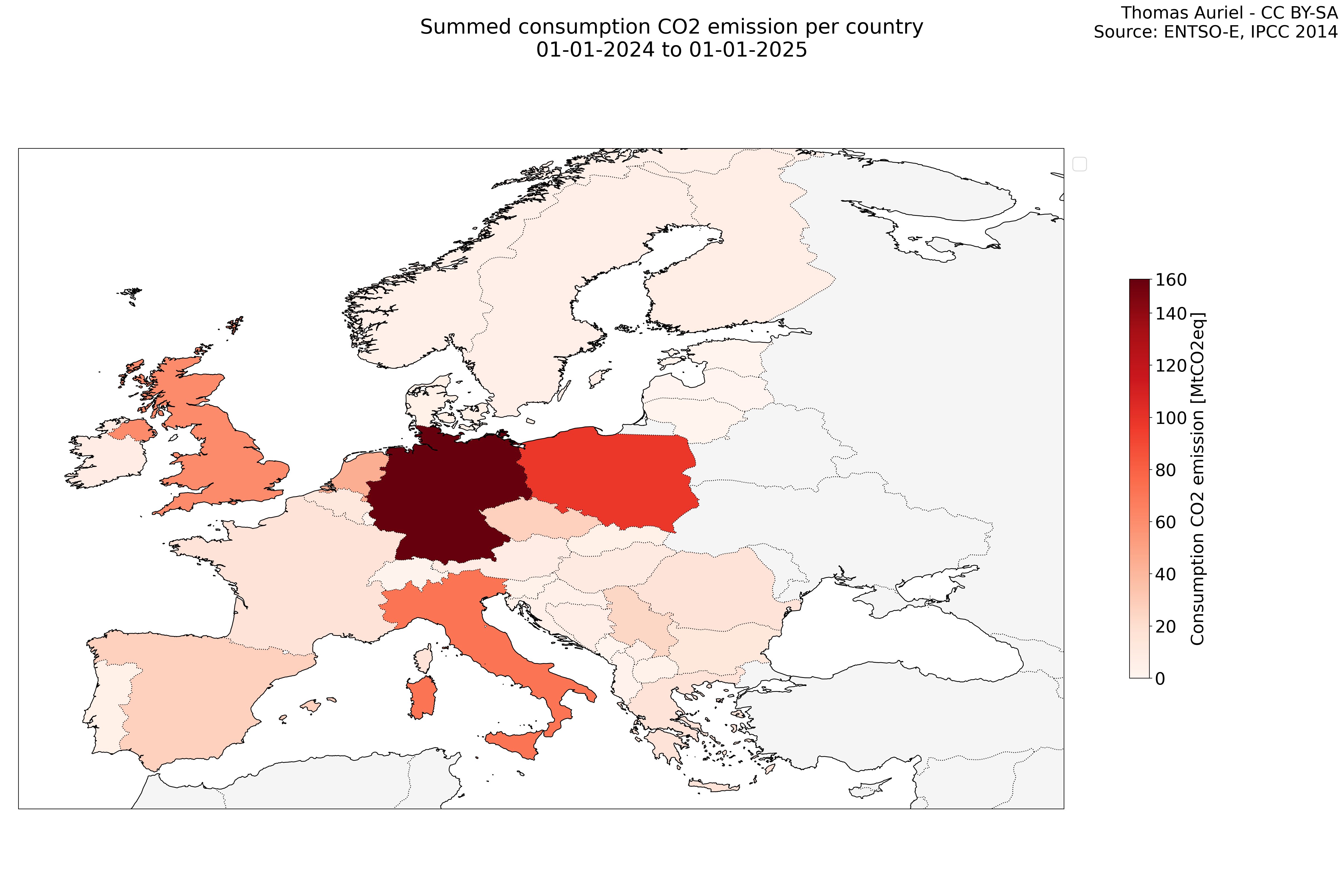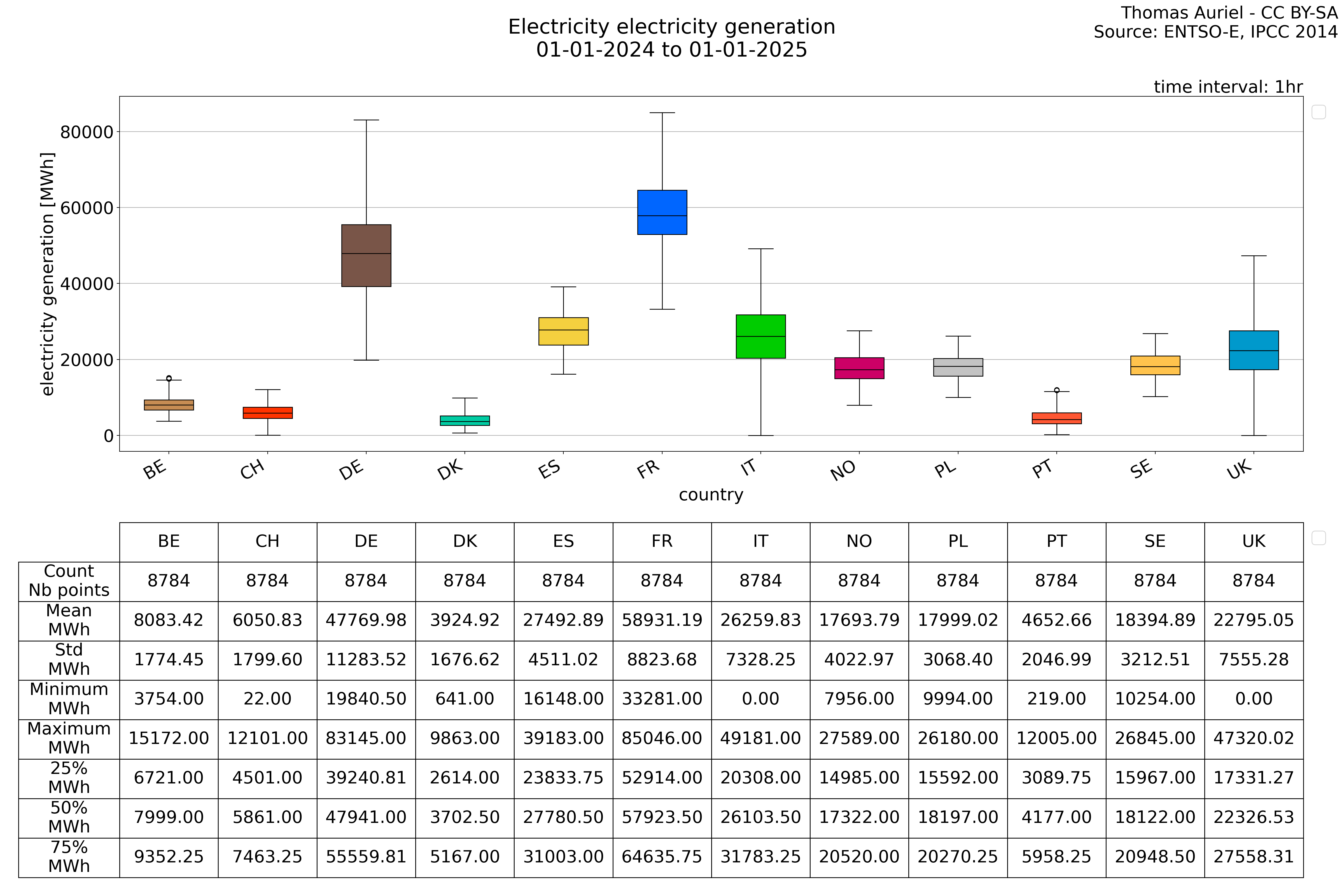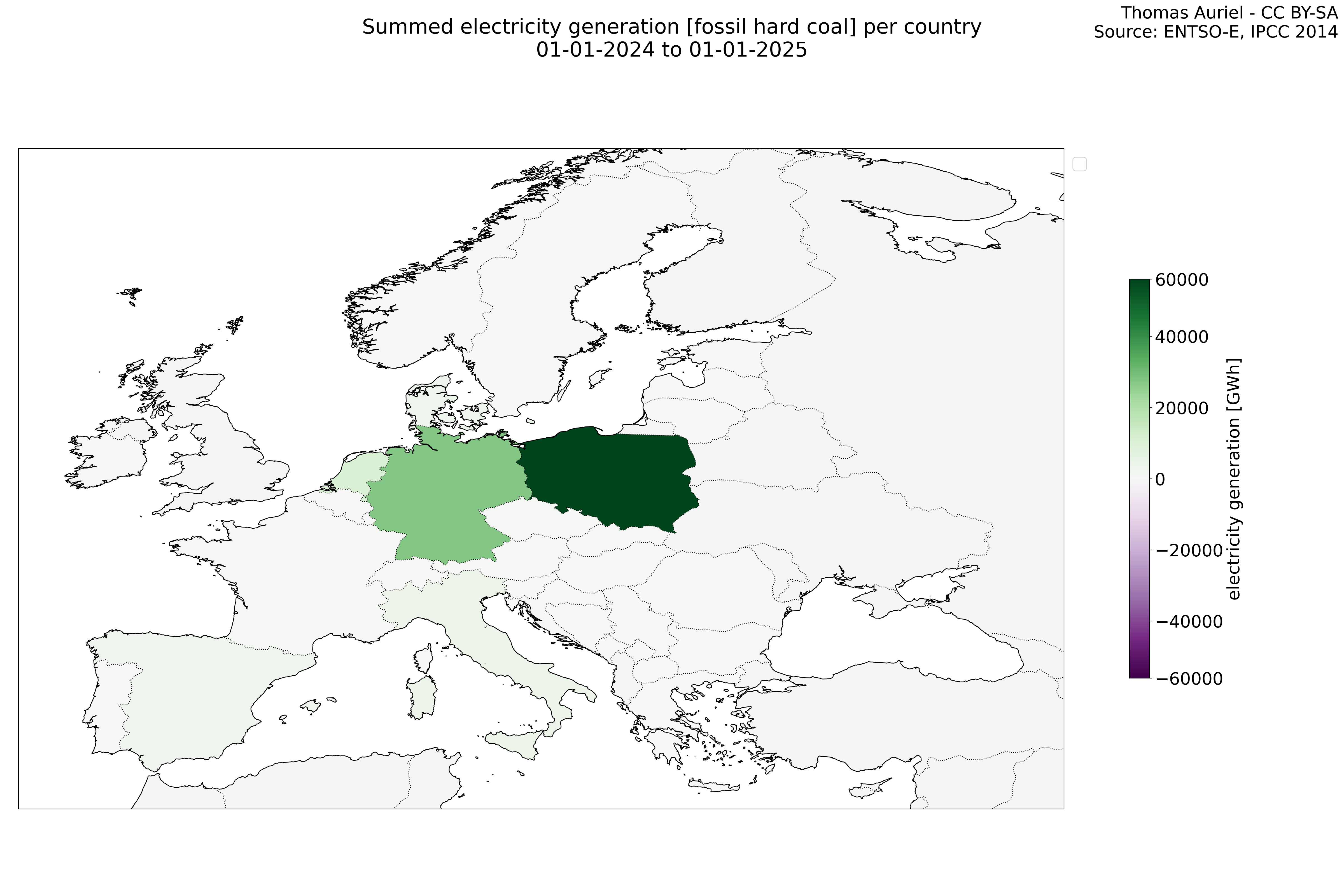 In these hourly line plots, the x-axis spans the entire year, with hours as individual data points. The y-axis represents the values of production, exchange, consumption, and data emissions, but unlike cumulative plots, these plots are designed for quality control purposes. Each line on the plot corresponds to a specific country and is used to identify data irregularities, holes, or artifacts that may occur within the year. By examining these plots, it is possible to spot discrepancies or missing data points in the hourly records, ensuring data integrity.