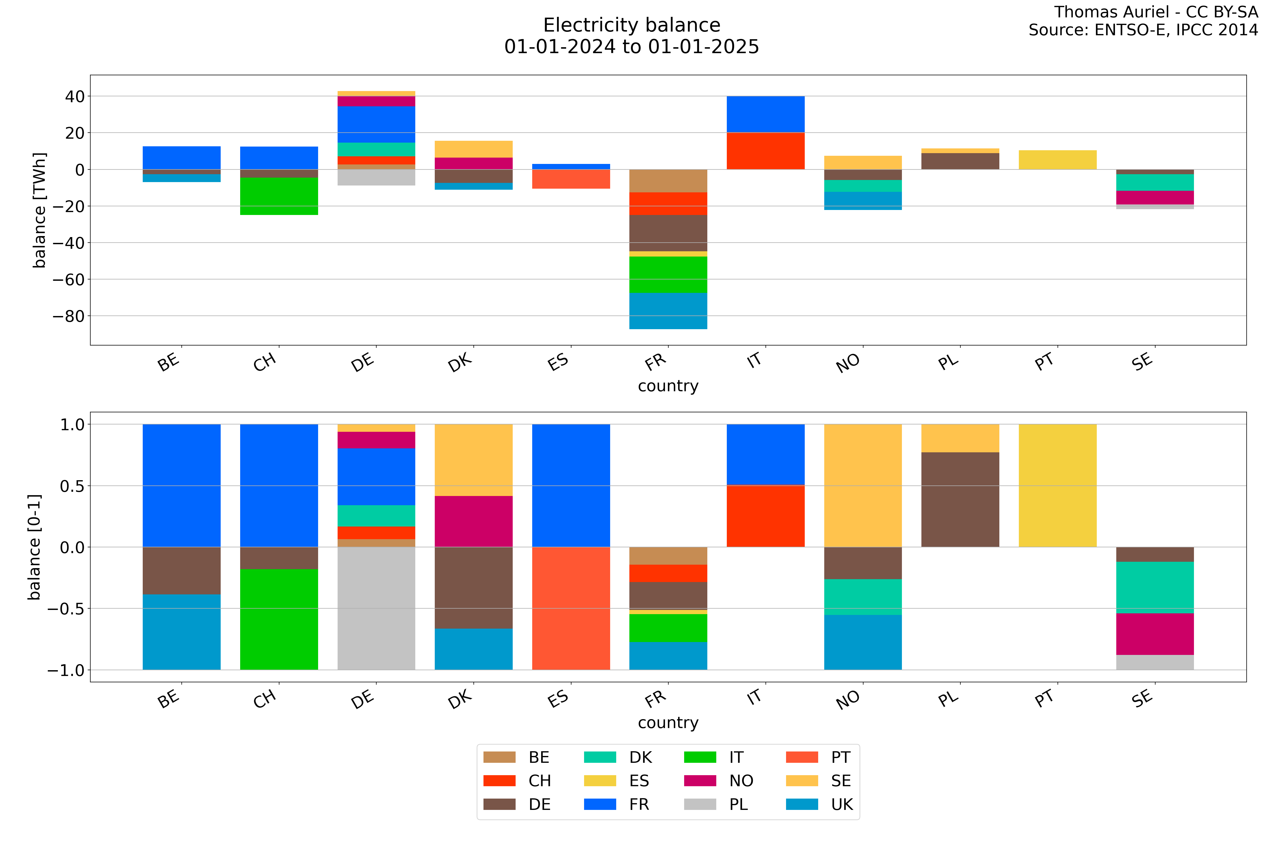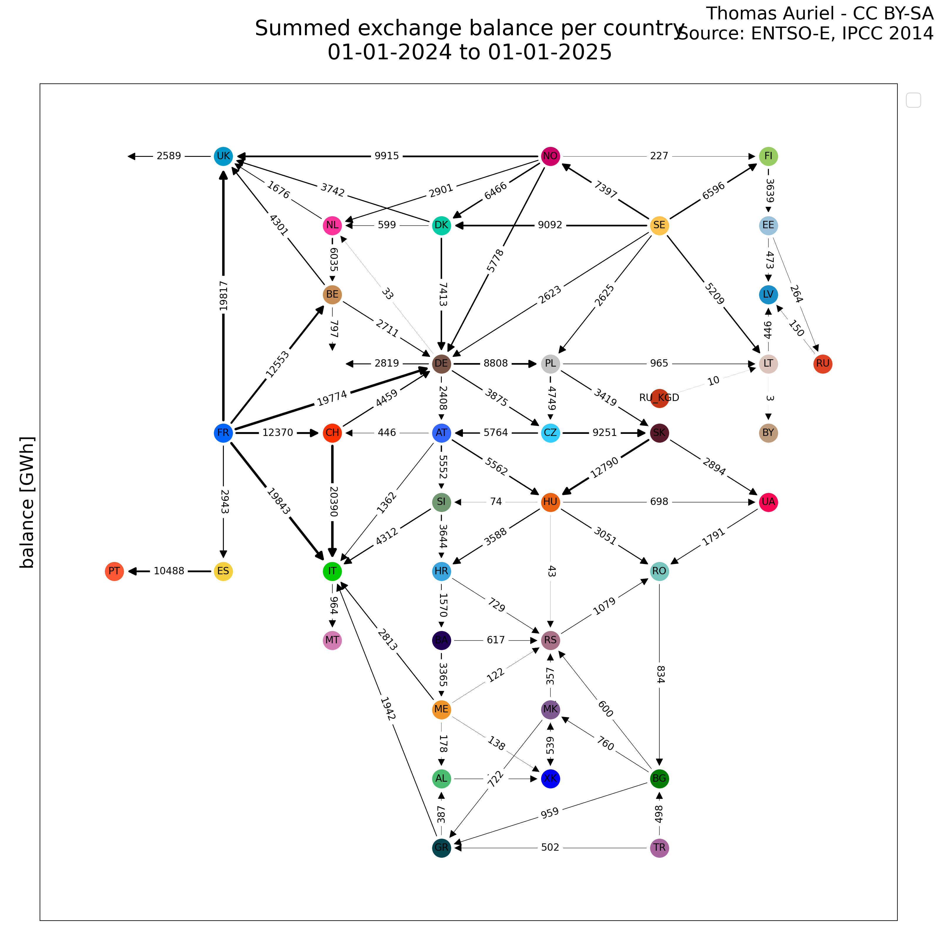 Graph network representations visualize complex interactions and electricity exchange among countries. Nodes represent individual countries, labeled with their iso code. Links illustrate the flow, direction, and intensity of exchanges, with wider links denoting greater exchange values. This representation aids in identifying countries with significant interactions and offers insights into interconnexion dynamics.