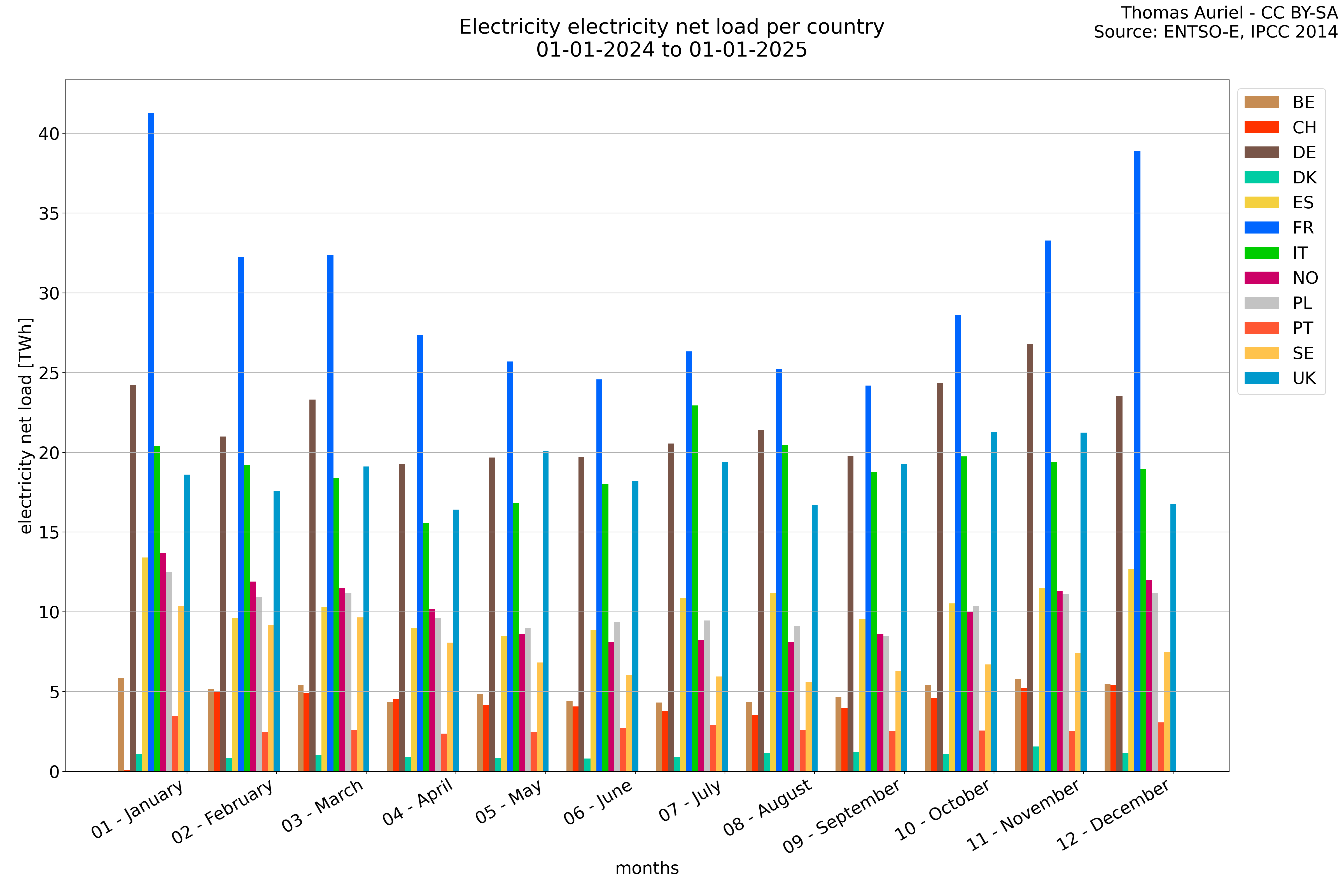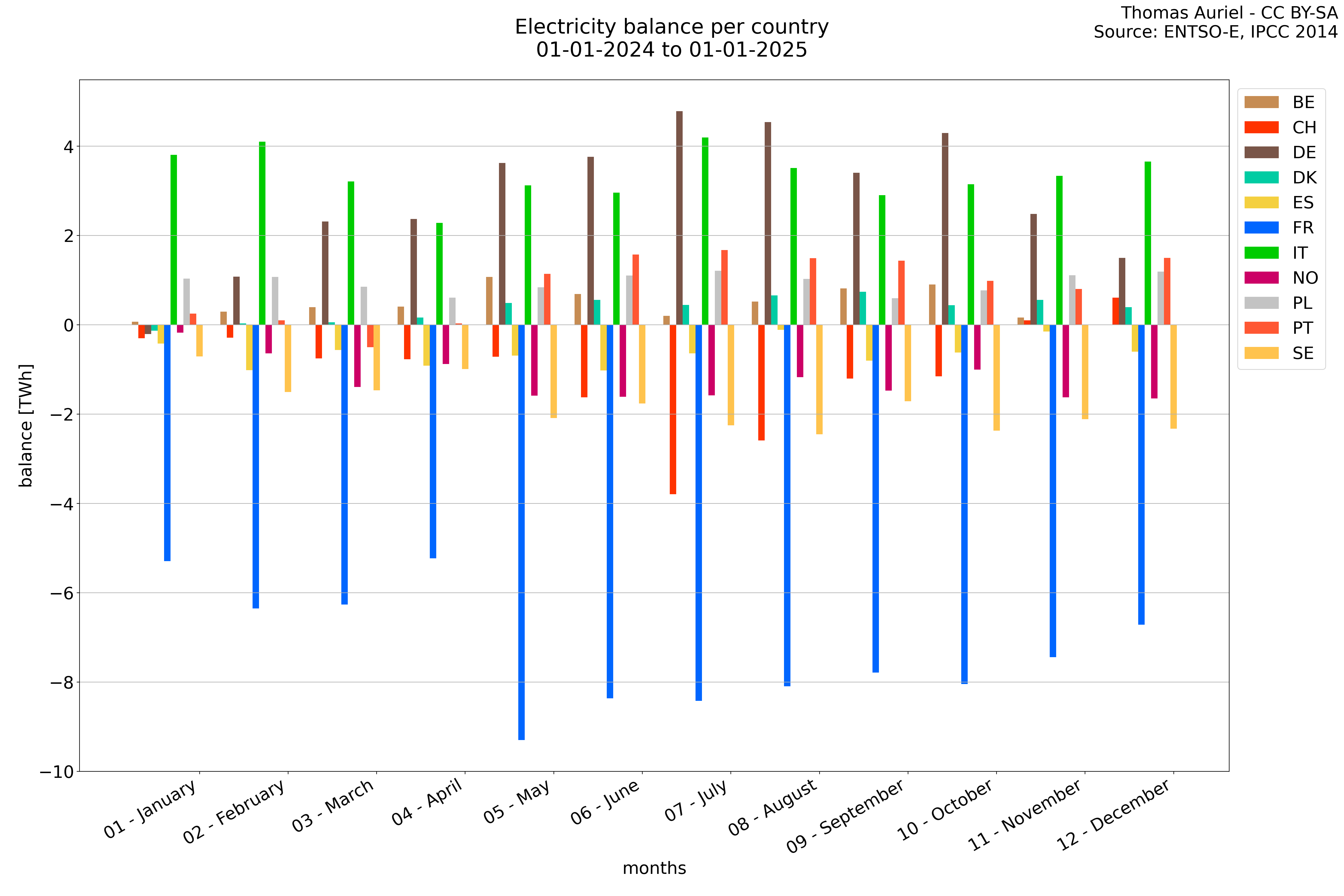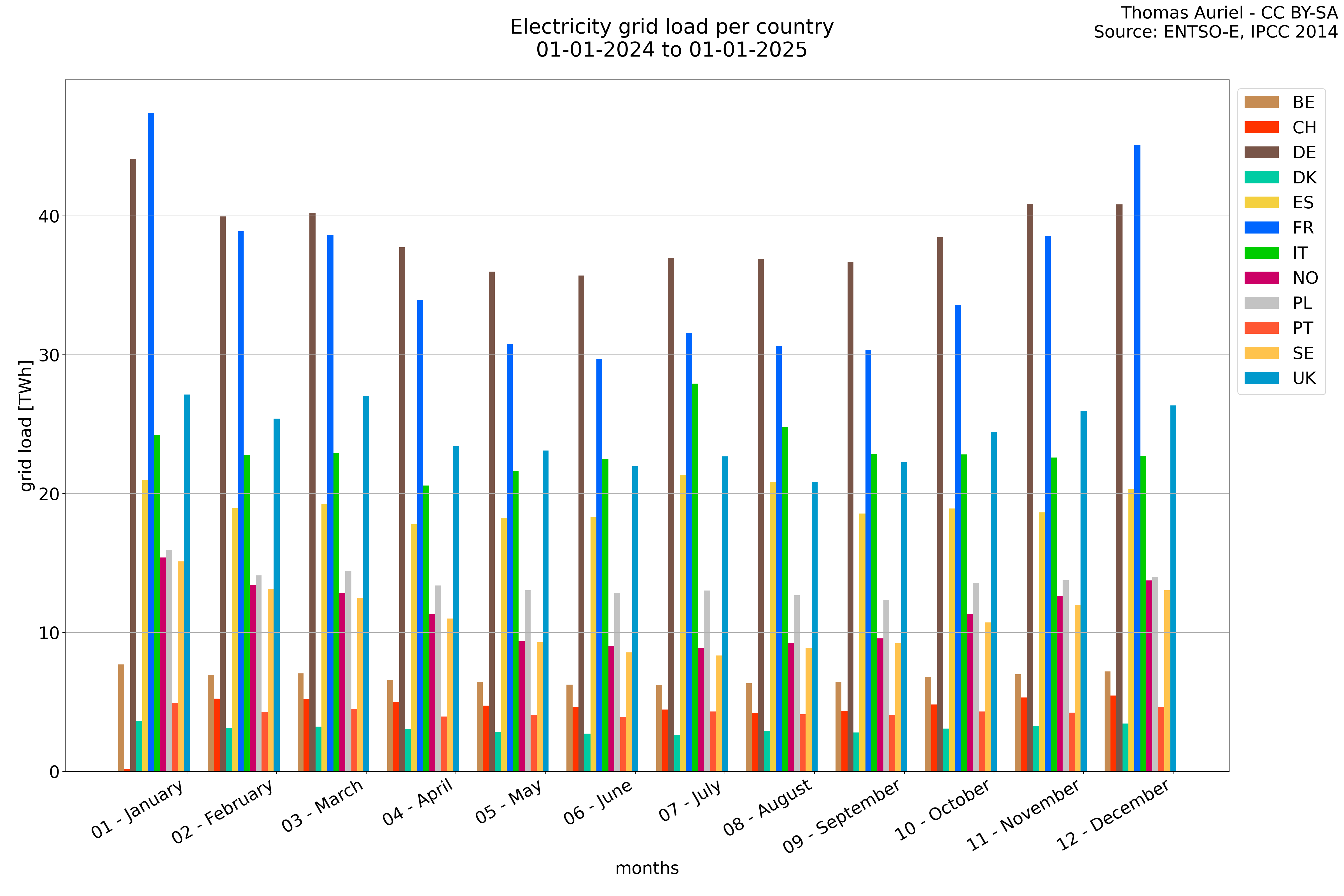 A periode plot takes a general view of the data by summing all the values over each month and presents them as a stacked bar plot. This visualization method allows for a clear understanding of how each country grid change over months. Then the Periode plot does not provide time-based trends but instead give an insight on the composition of the data within the chosen period.