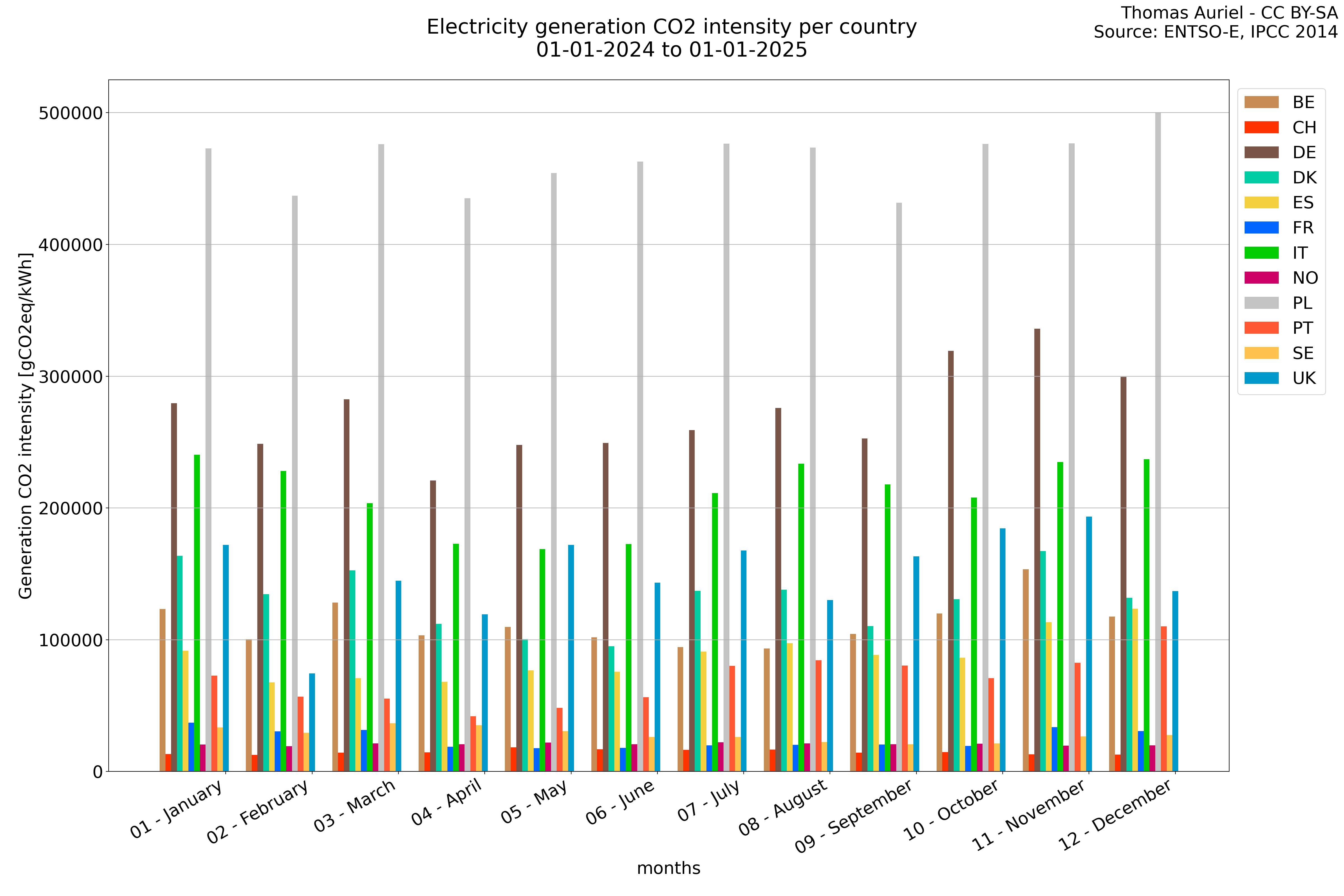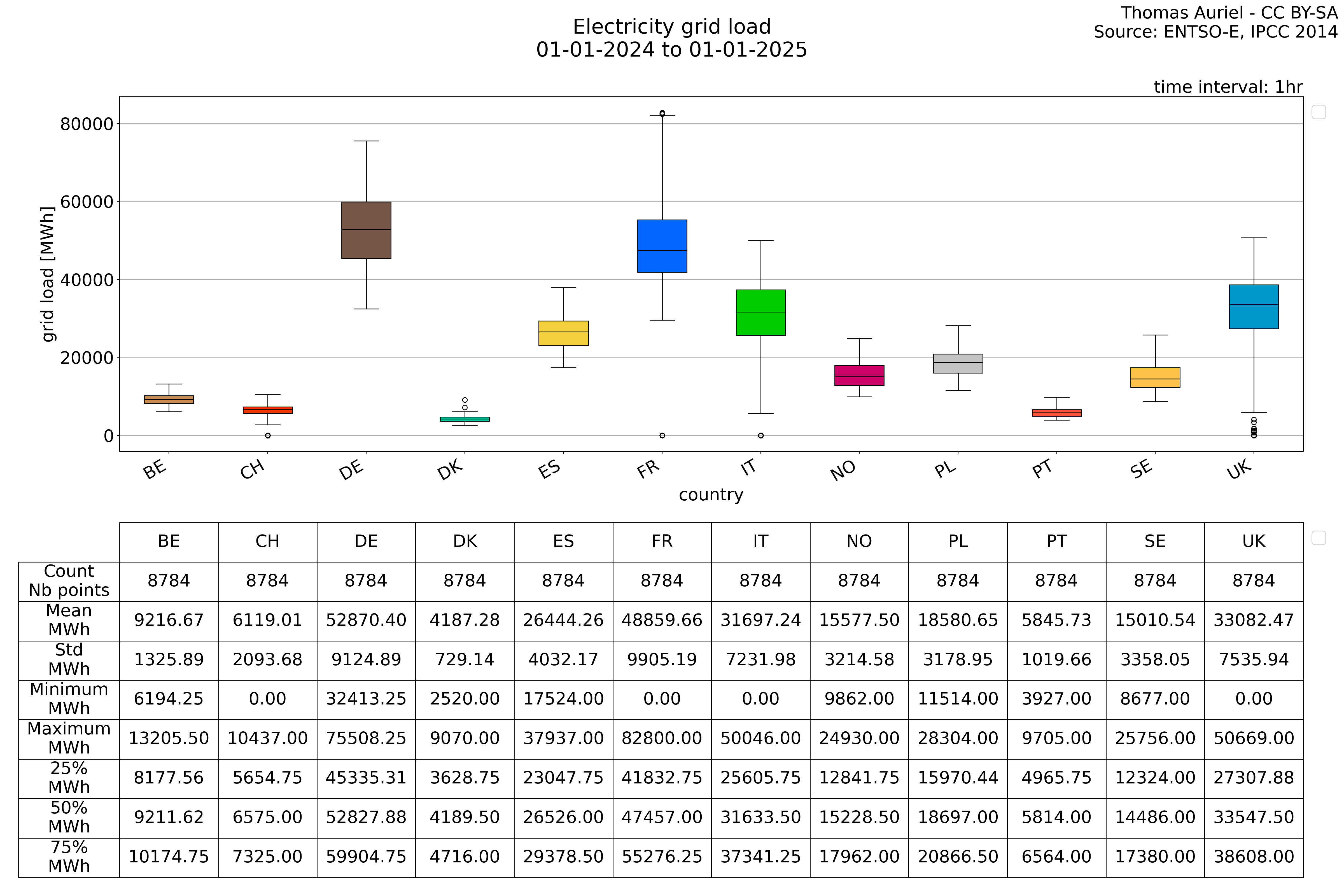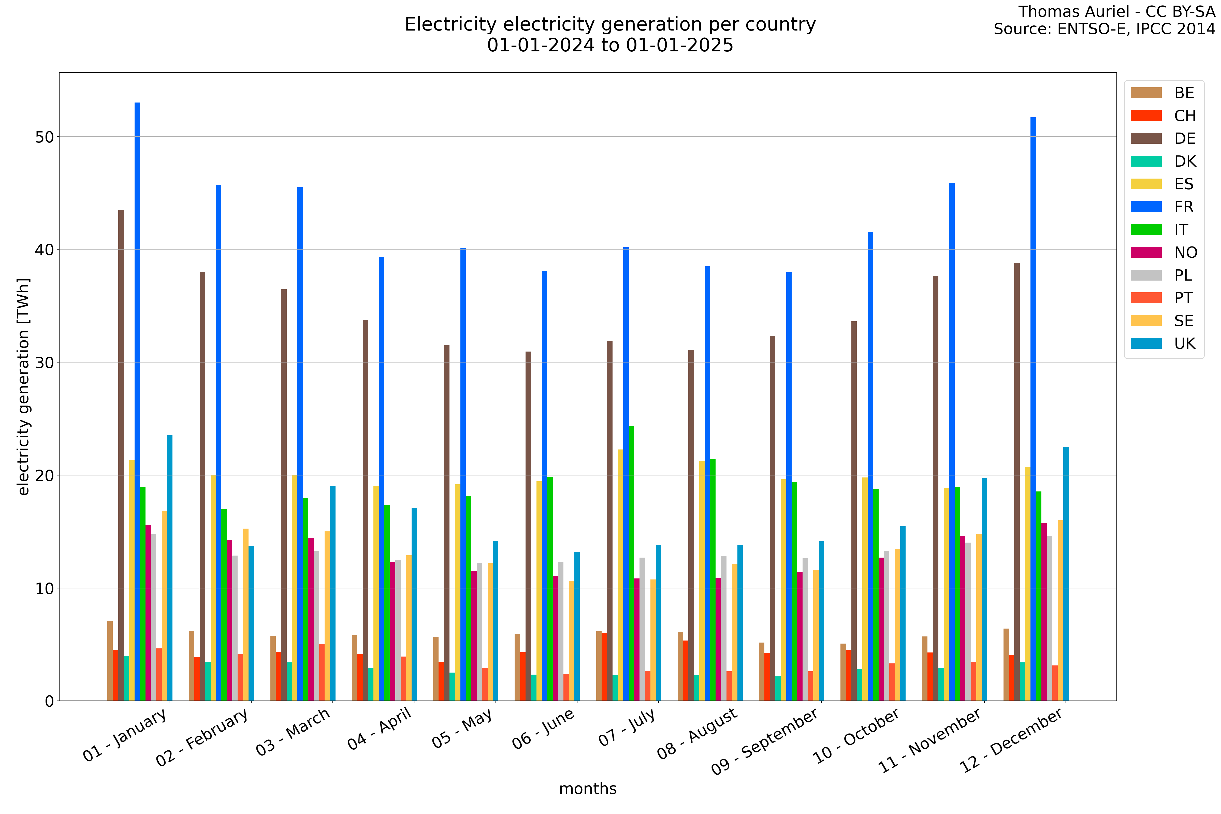 A periode plot takes a general view of the data by summing all the values over each month and presents them as a stacked bar plot. This visualization method allows for a clear understanding of how each country grid change over months. Then the Periode plot does not provide time-based trends but instead give an insight on the composition of the data within the chosen period.