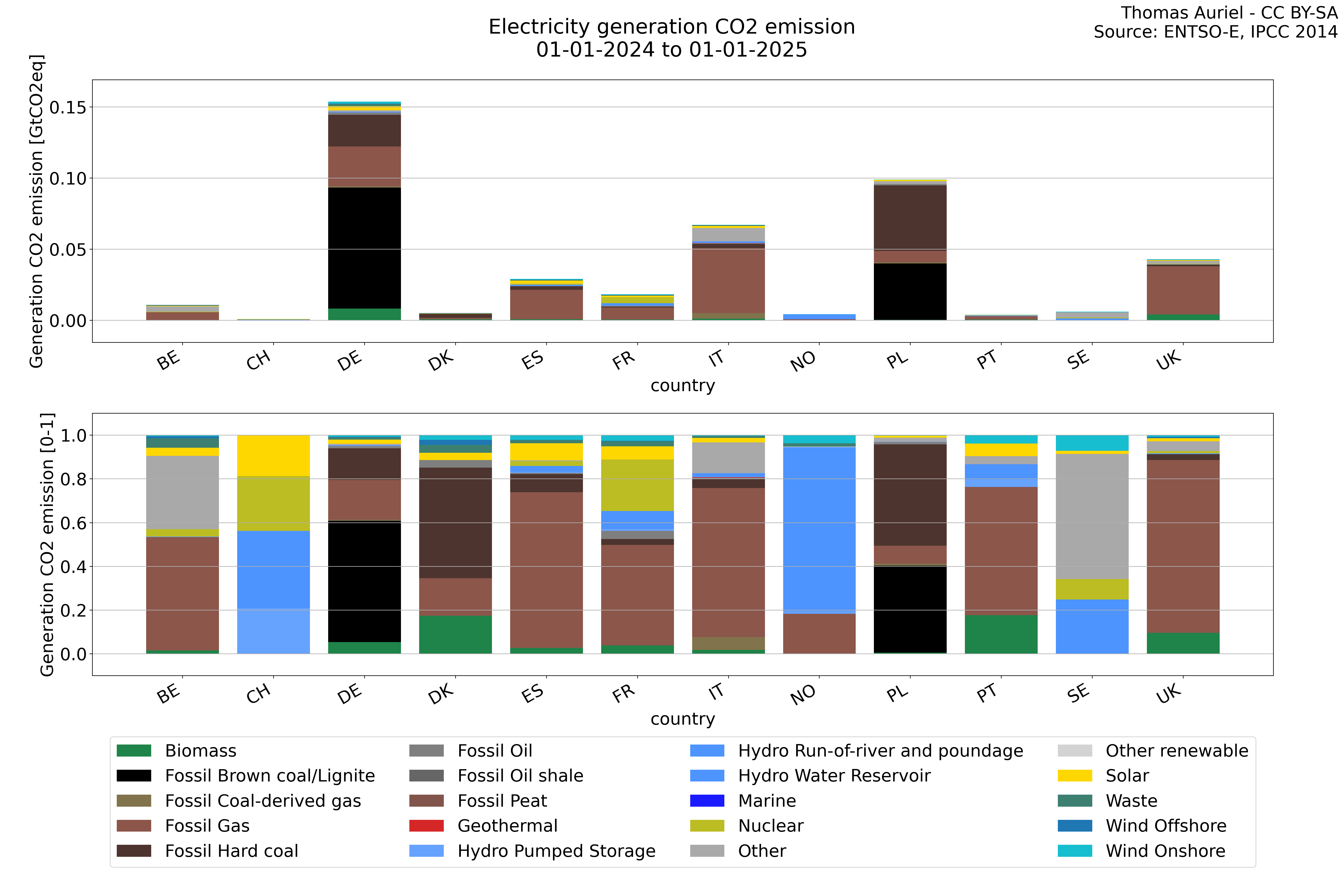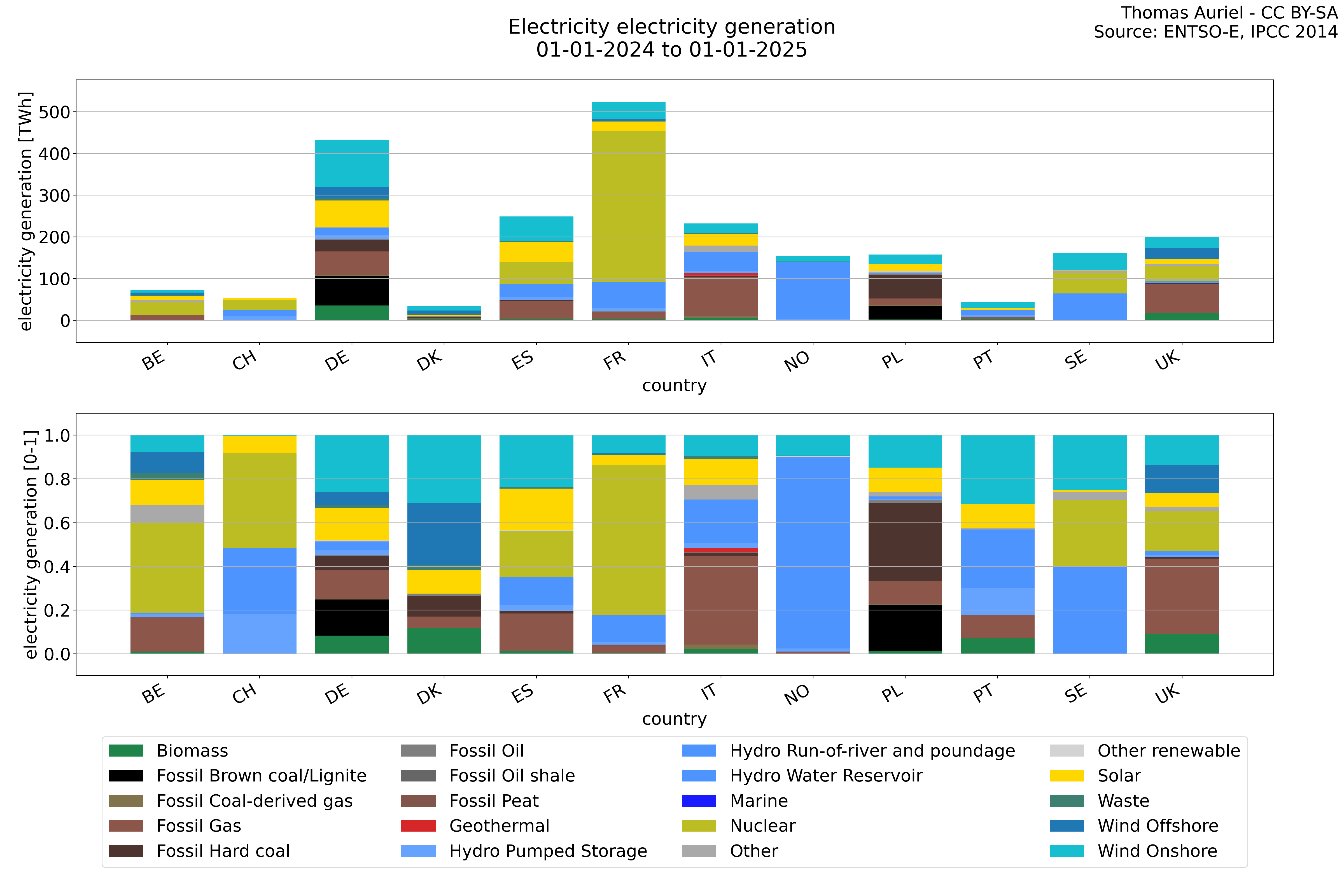 In these stacked bar plots, each bar represents a specific country. The bars are divided into sections that depict the decomposition of production, exchange, and CO2 emissions over the year. Two versions are presented: one displaying absolute values, and the other showing relative values. In the absolute values plot, each country's bar illustrates the absolute amounts of these components during the year. The relative values plot showcases the proportion of each component within a country's data for the entire year. These stacked bar plots offer insights into how production, exchange, and CO2 emissions vary across countries, aiding in comparative analysis.