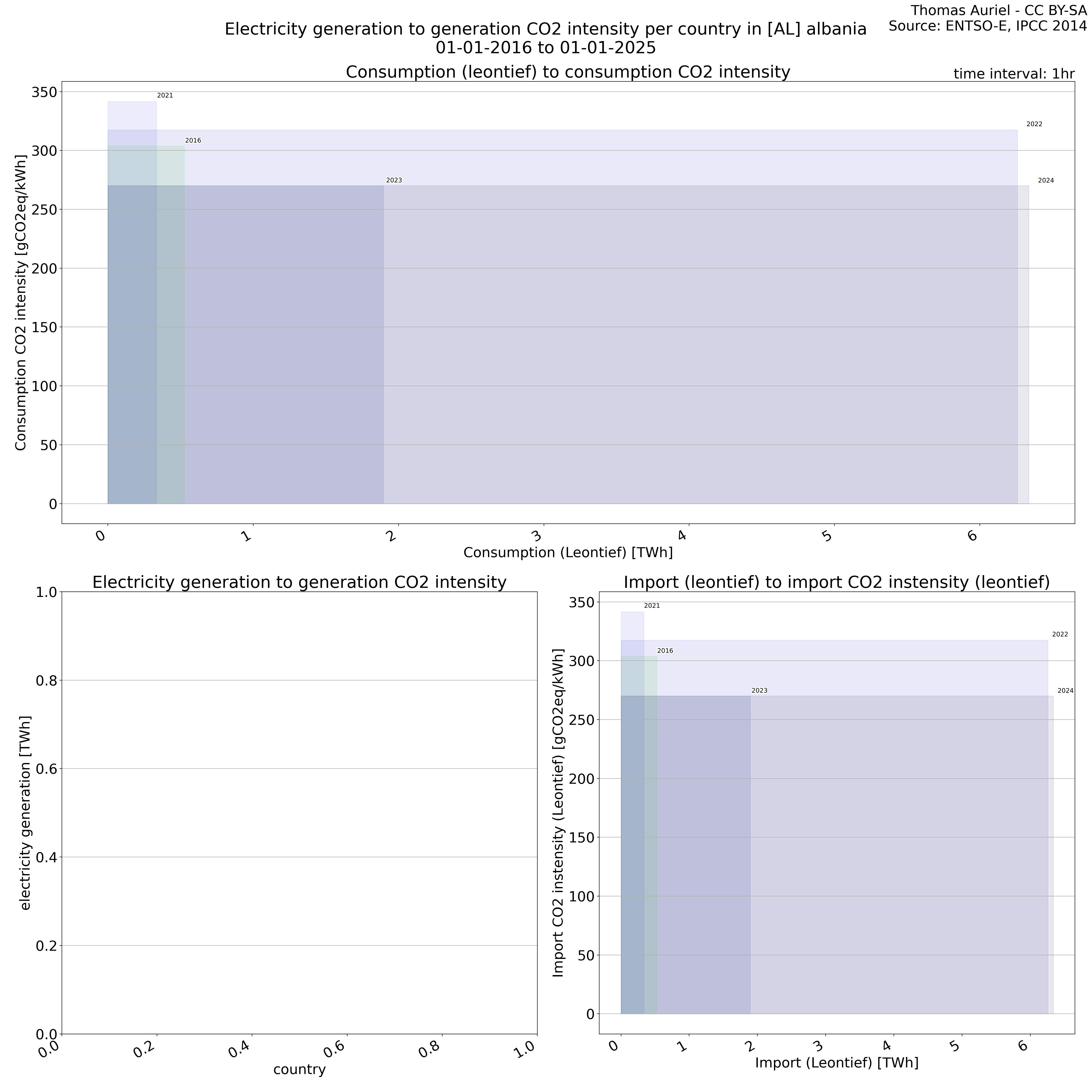 The plot consists of squares, each representing a single year, designed to illustrate electricity-related metrics and their associated environmental impacts. The length of each square corresponds to the total electricity consumption, generation, or imports during the year, with longer squares indicating higher overall values for the respective metric. The height of each square represents the average CO₂ intensity (e.g., grams of CO₂ per kWh) associated with electricity consumption, generation, or imports; hence, taller squares signify greater environmental impact per unit of electricity. Finally, the surface area of each square, determined by the product of its length and height, represents the total CO₂ emissions associated with the respective activity in the given year.