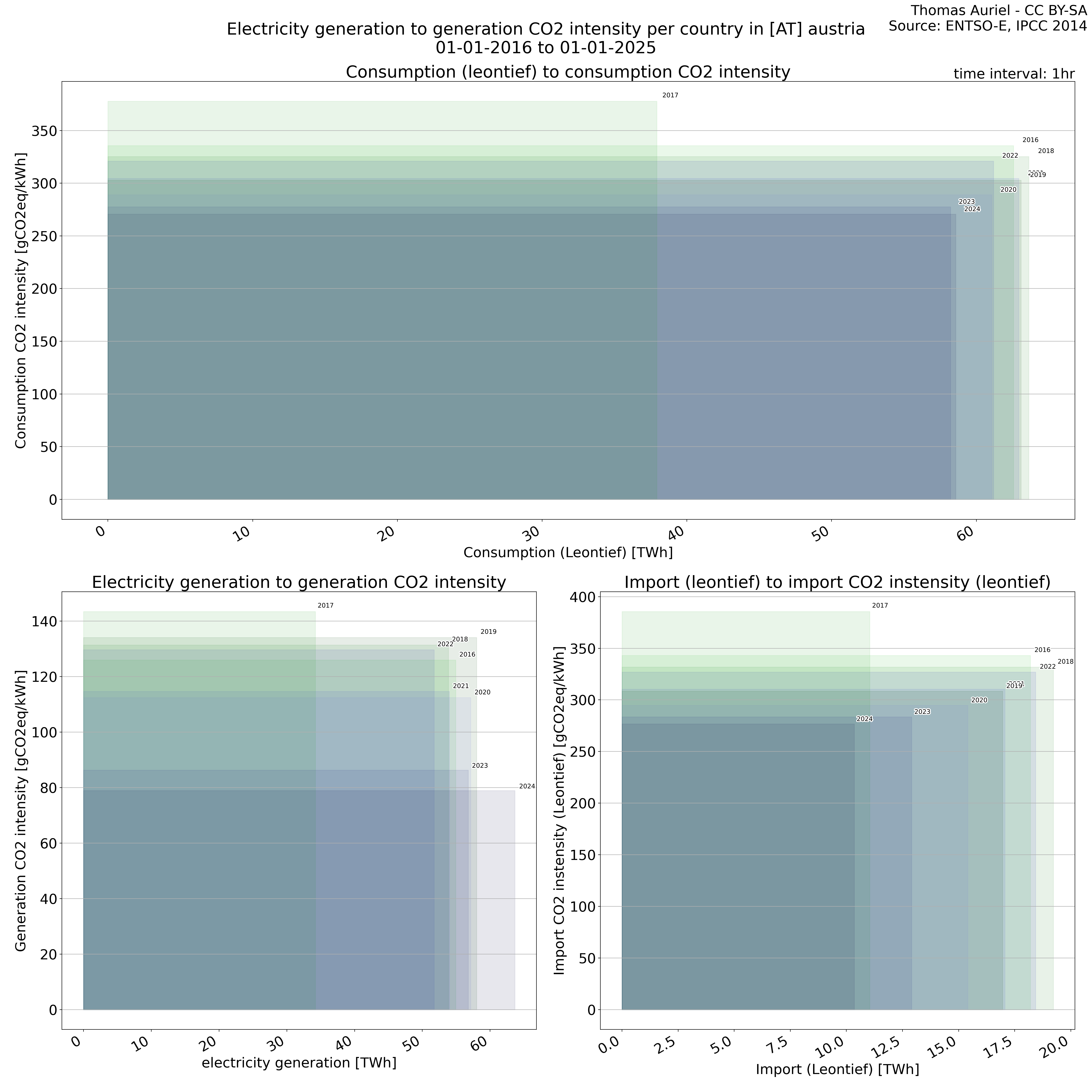 The plot consists of squares, each representing a single year, designed to illustrate electricity-related metrics and their associated environmental impacts. The length of each square corresponds to the total electricity consumption, generation, or imports during the year, with longer squares indicating higher overall values for the respective metric. The height of each square represents the average CO₂ intensity (e.g., grams of CO₂ per kWh) associated with electricity consumption, generation, or imports; hence, taller squares signify greater environmental impact per unit of electricity. Finally, the surface area of each square, determined by the product of its length and height, represents the total CO₂ emissions associated with the respective activity in the given year.