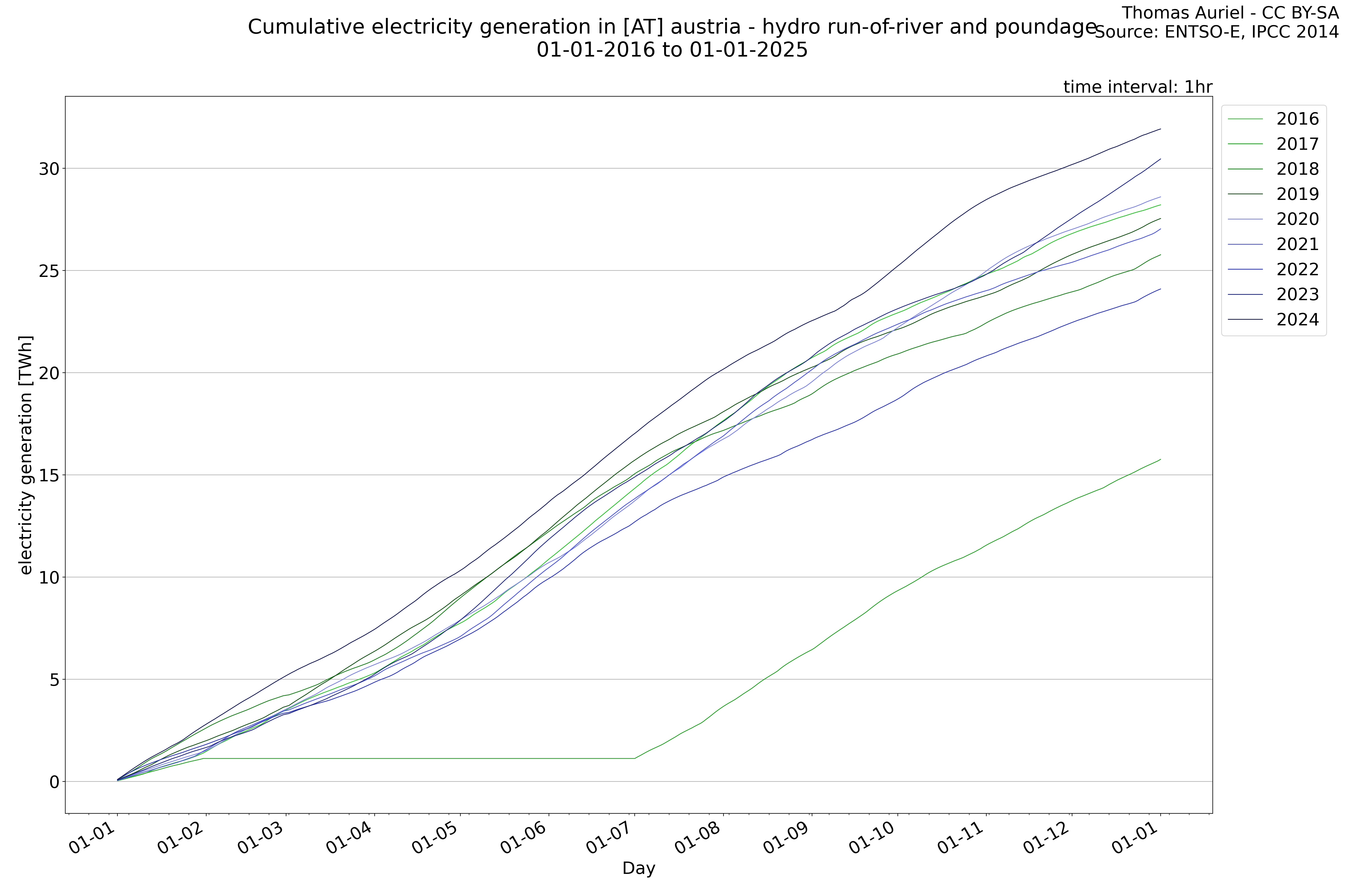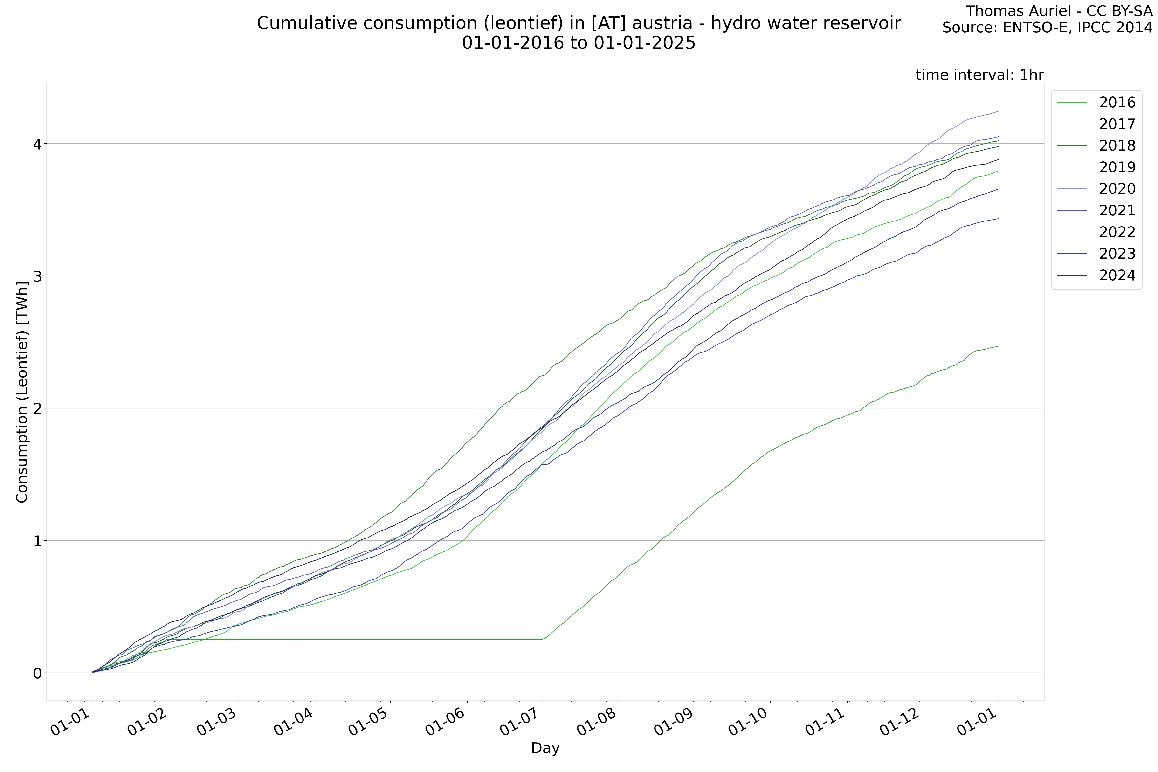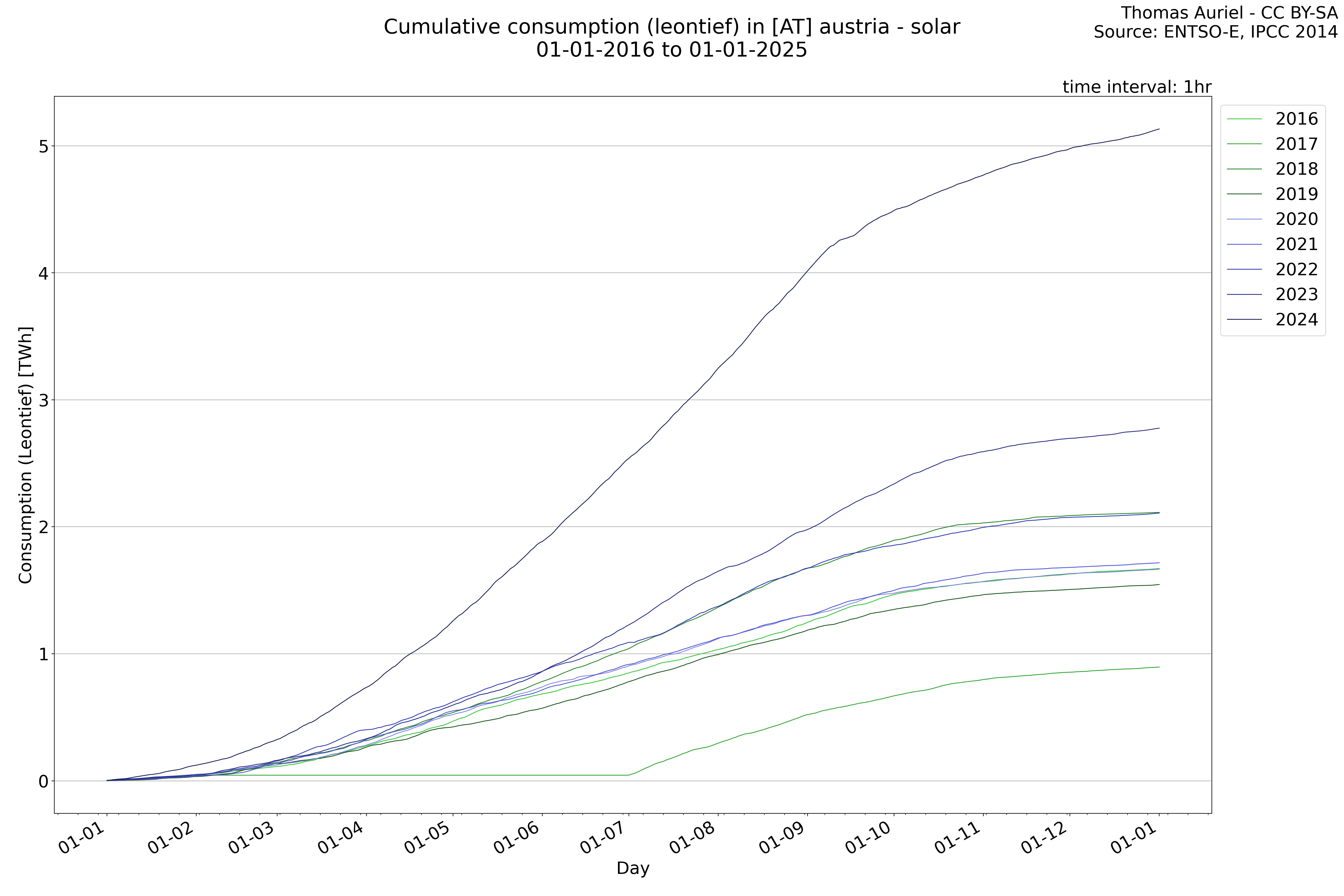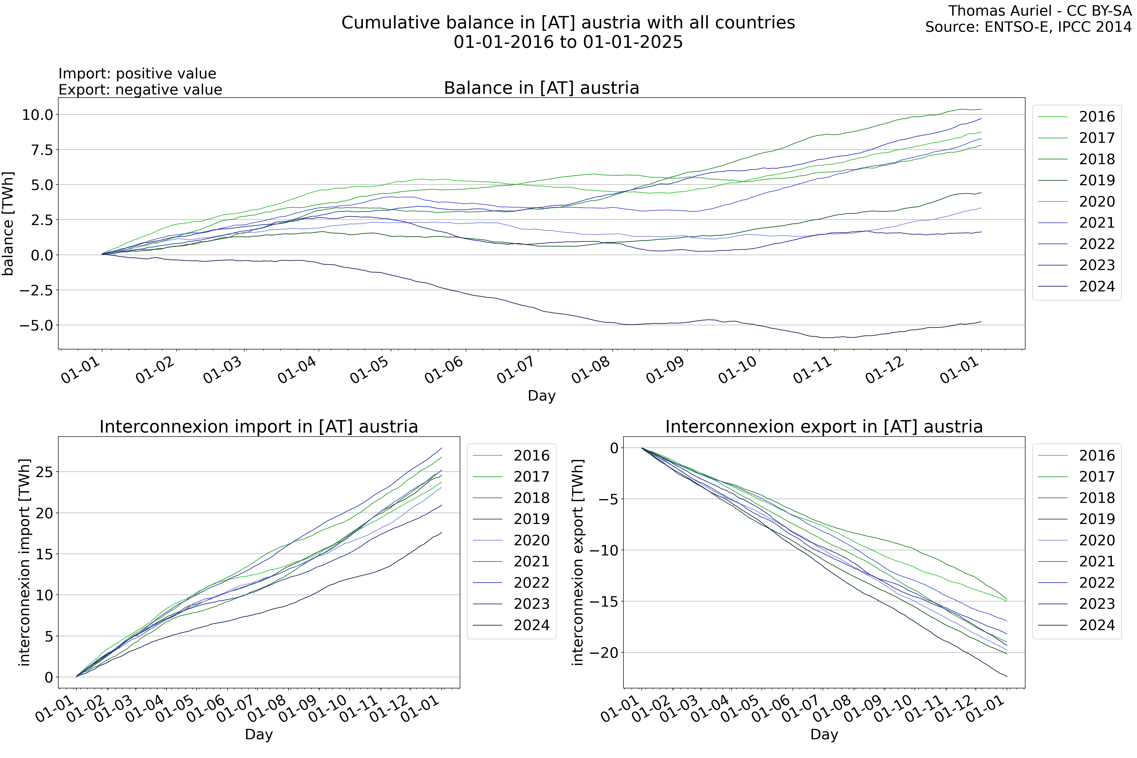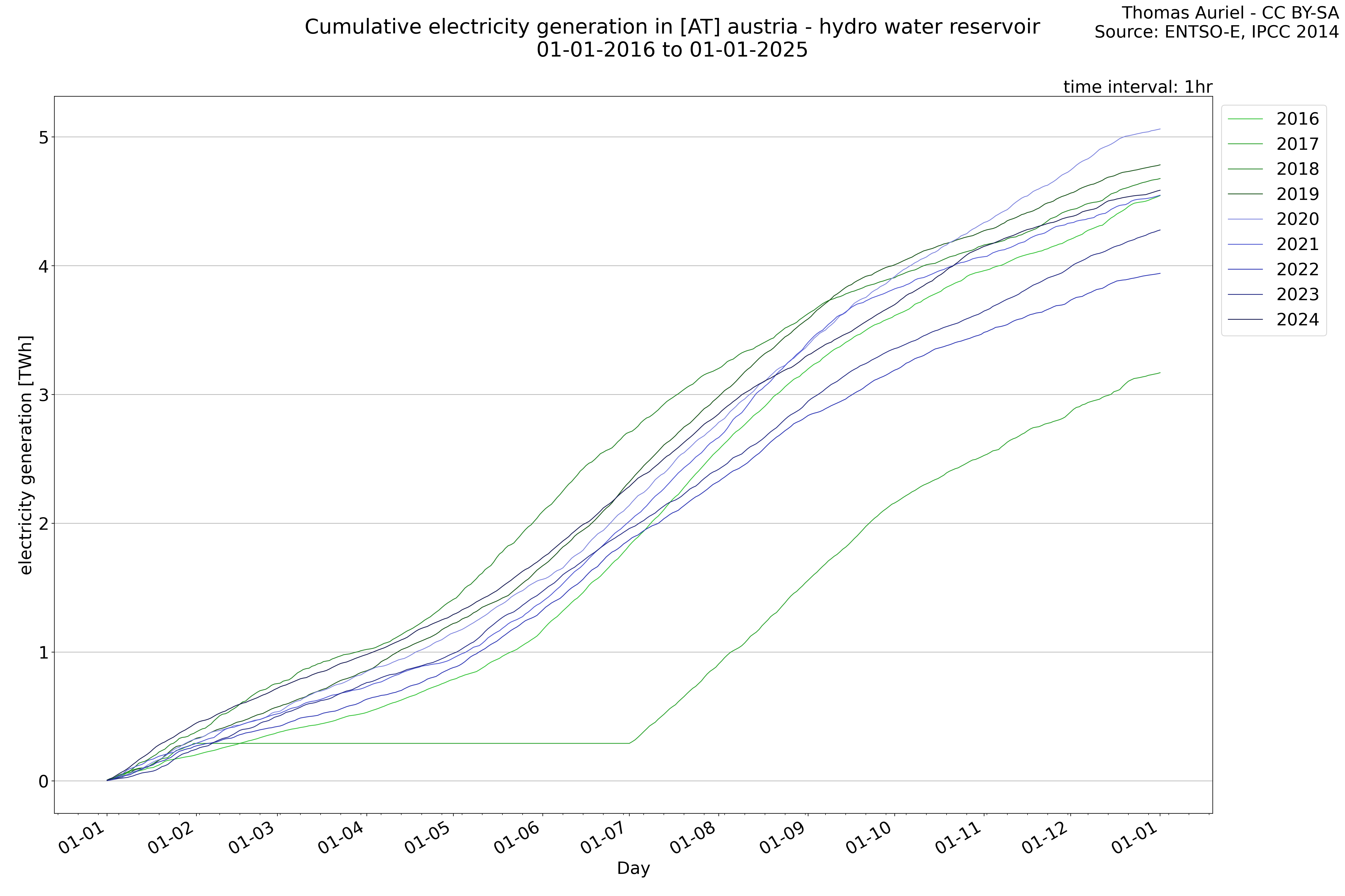 This plot is a cumulative sum plot, where each line represents the cumulative value of a specific metric (e.g., production, load, import, or export) for a given year. The plot begins at zero, and as the year progresses, the cumulative value is updated to reflect the total amount accumulated over time. This visualization illustrates the overall trend of the metric, showing whether the cumulative sum is increasing or decreasing, as well as any changes in the trend within the year. Additionally, the cumulative sum plot helps to reduce the impact of noise and short-term fluctuations commonly present in the raw data of production, load, import, or export. By smoothing out these variations, the plot emphasizes the broader, long-term trends. Consequently, this type of visualization facilitates a clearer understanding of the metric’s evolution across the year, revealing whether the activity follows a steady trajectory, shows signs of volatility, or experiences periods of significant change.
