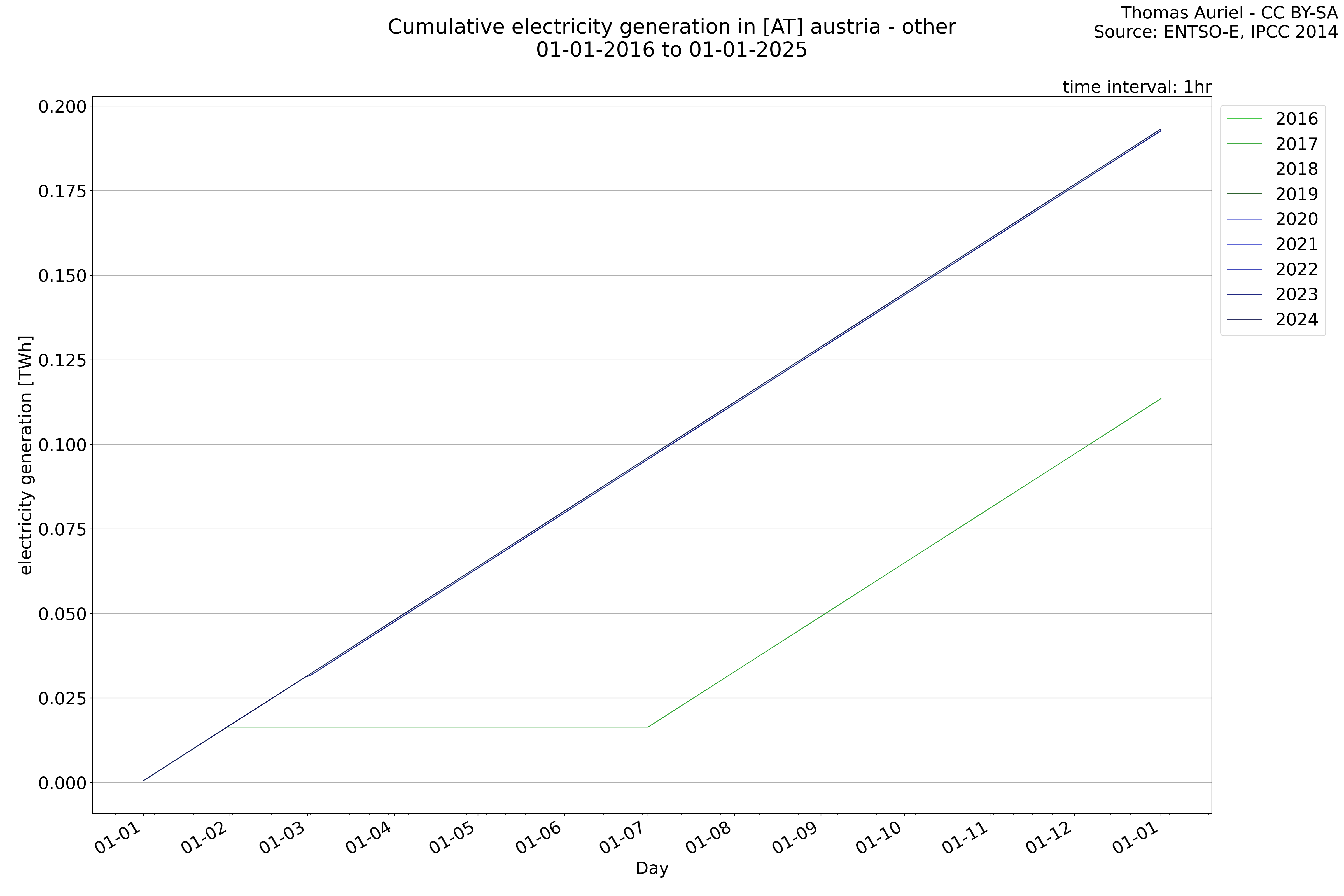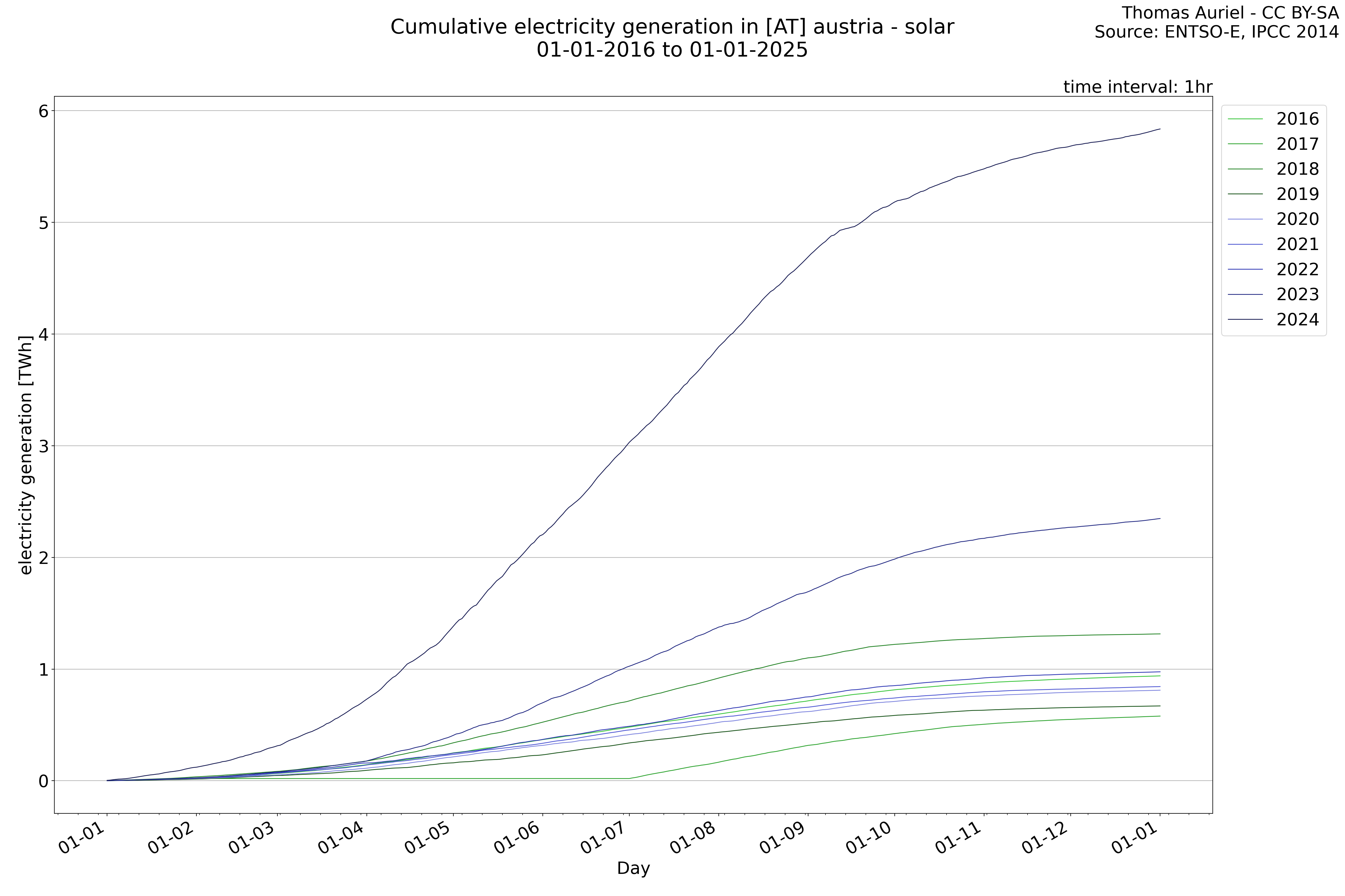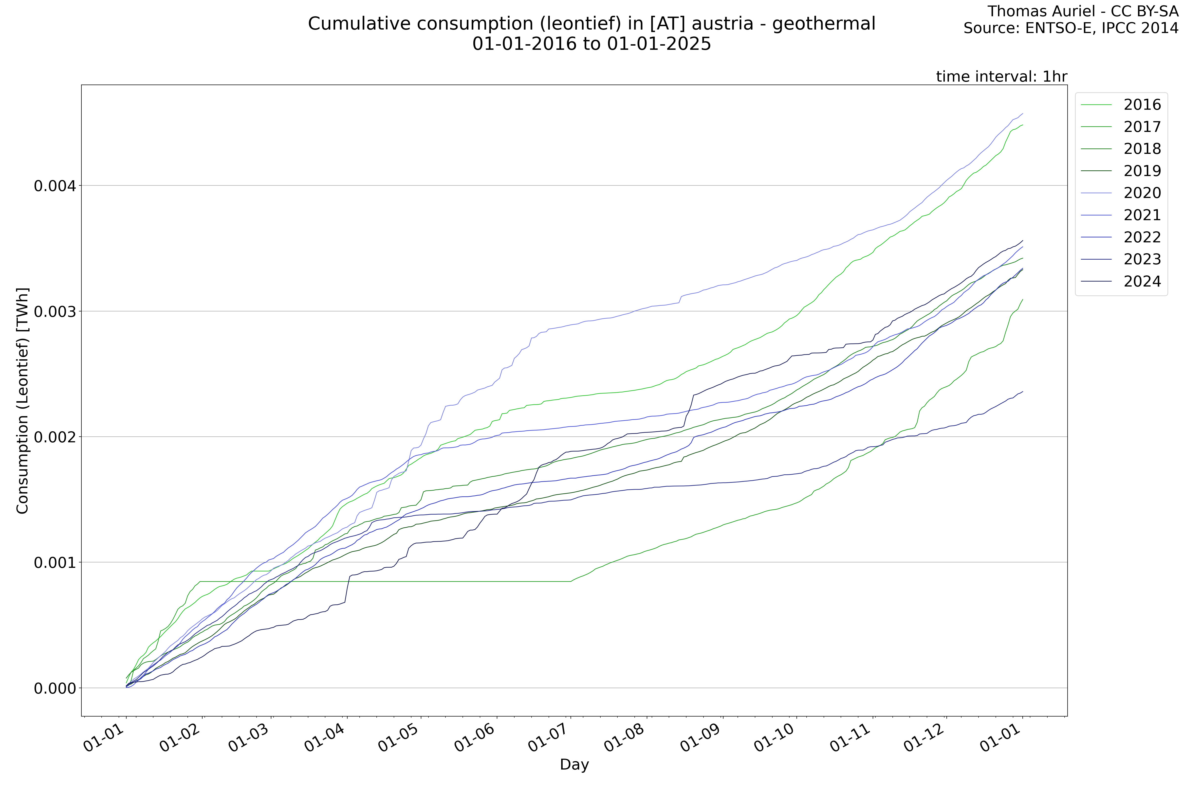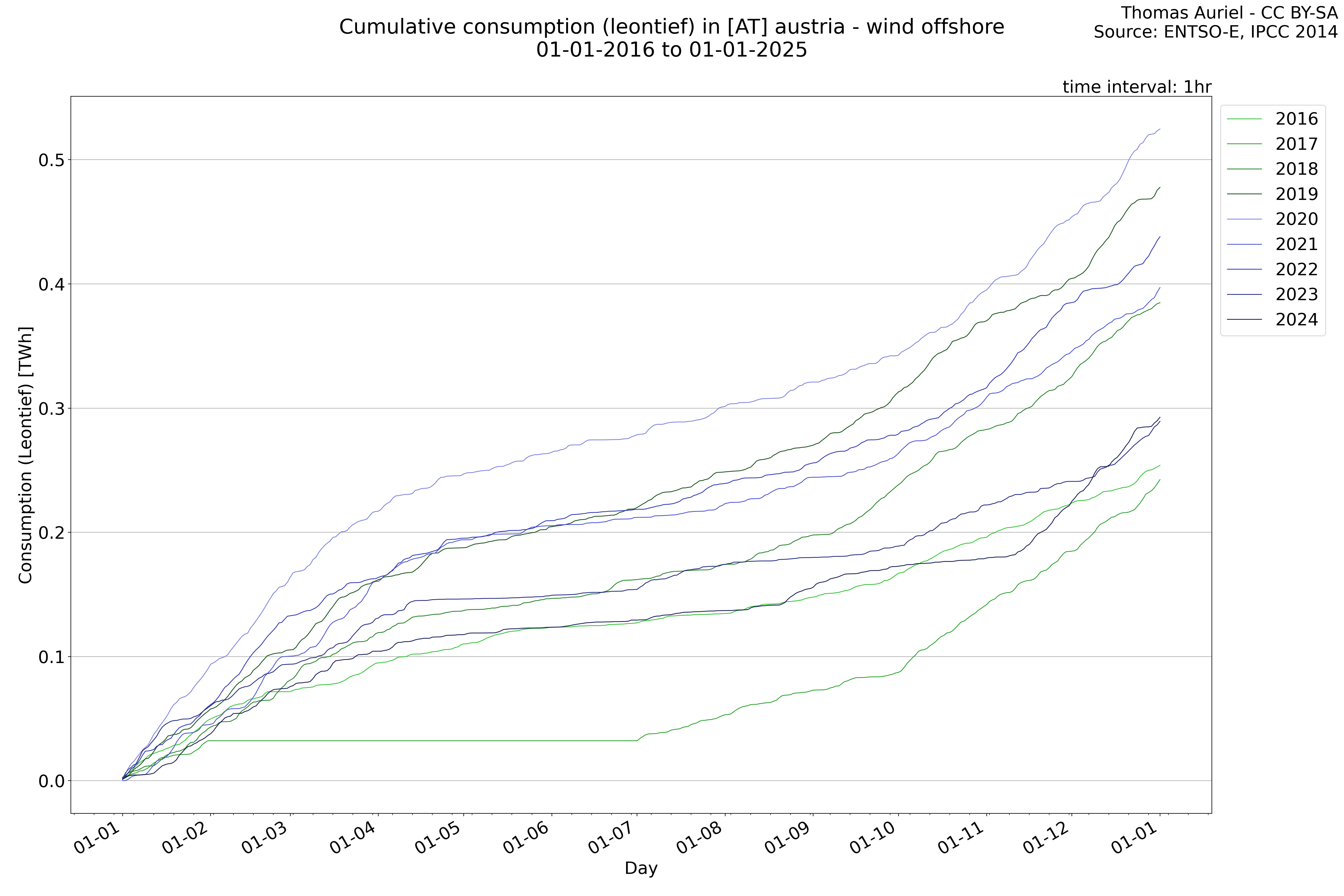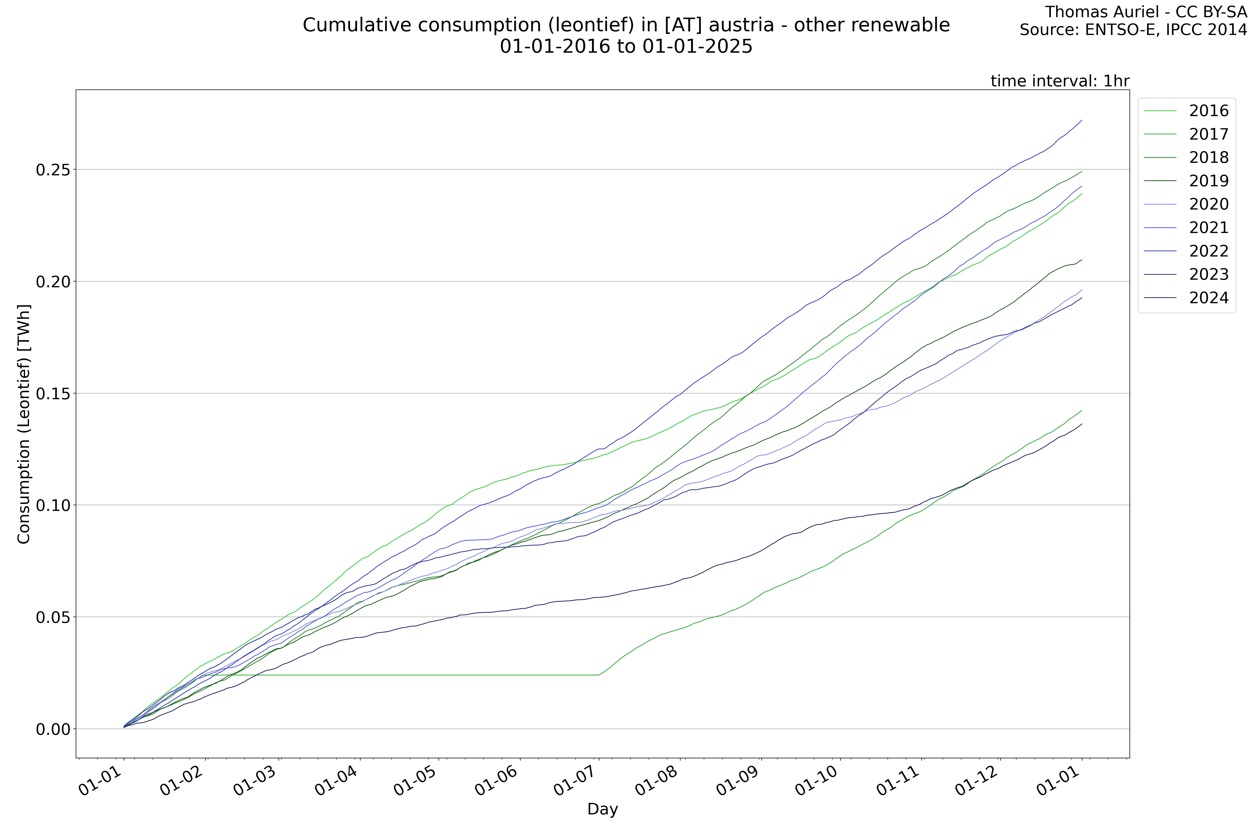 This plot is a cumulative sum plot, where each line represents the cumulative value of a specific metric (e.g., production, load, import, or export) for a given year. The plot begins at zero, and as the year progresses, the cumulative value is updated to reflect the total amount accumulated over time. This visualization illustrates the overall trend of the metric, showing whether the cumulative sum is increasing or decreasing, as well as any changes in the trend within the year. Additionally, the cumulative sum plot helps to reduce the impact of noise and short-term fluctuations commonly present in the raw data of production, load, import, or export. By smoothing out these variations, the plot emphasizes the broader, long-term trends. Consequently, this type of visualization facilitates a clearer understanding of the metric’s evolution across the year, revealing whether the activity follows a steady trajectory, shows signs of volatility, or experiences periods of significant change.