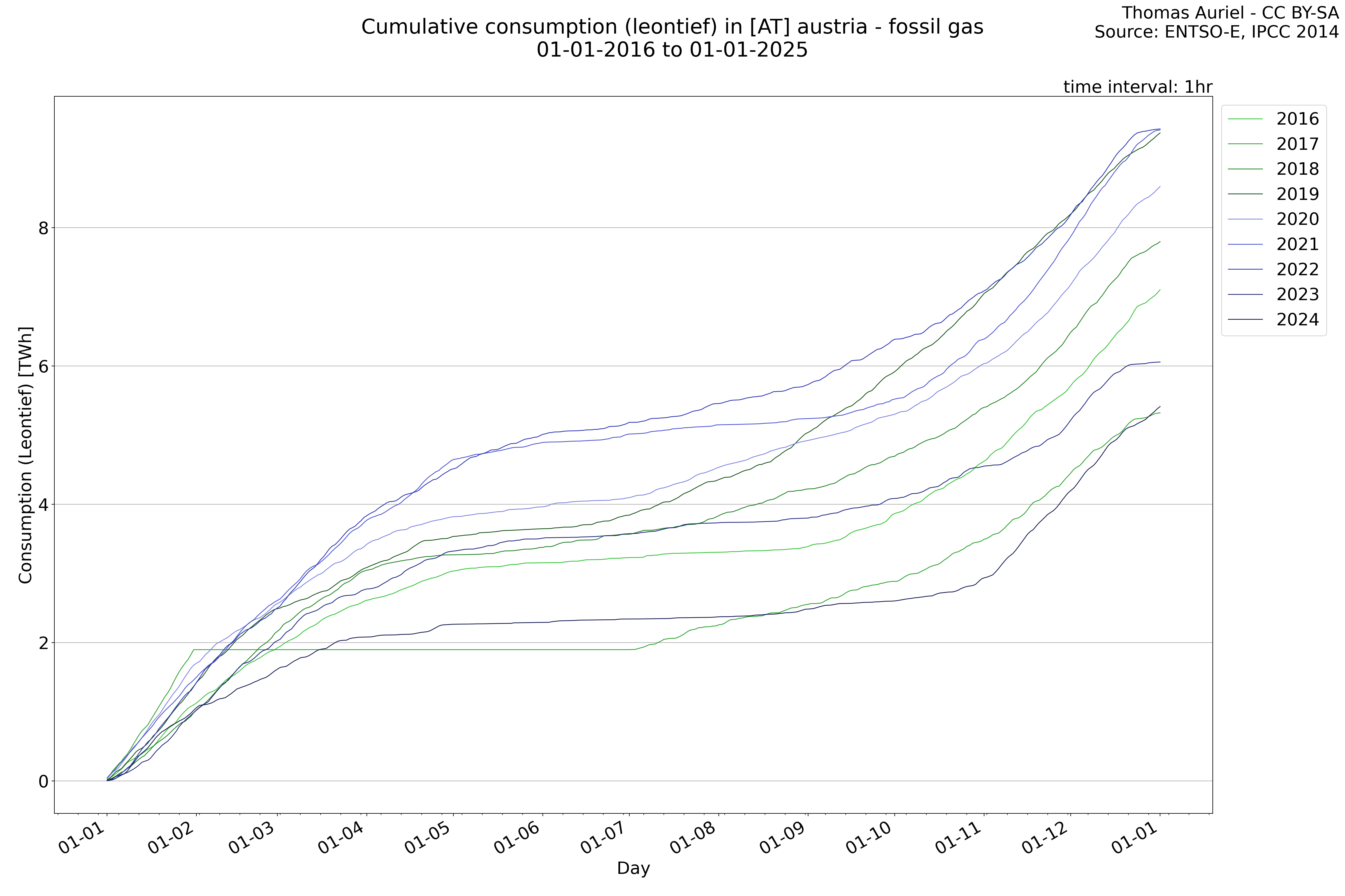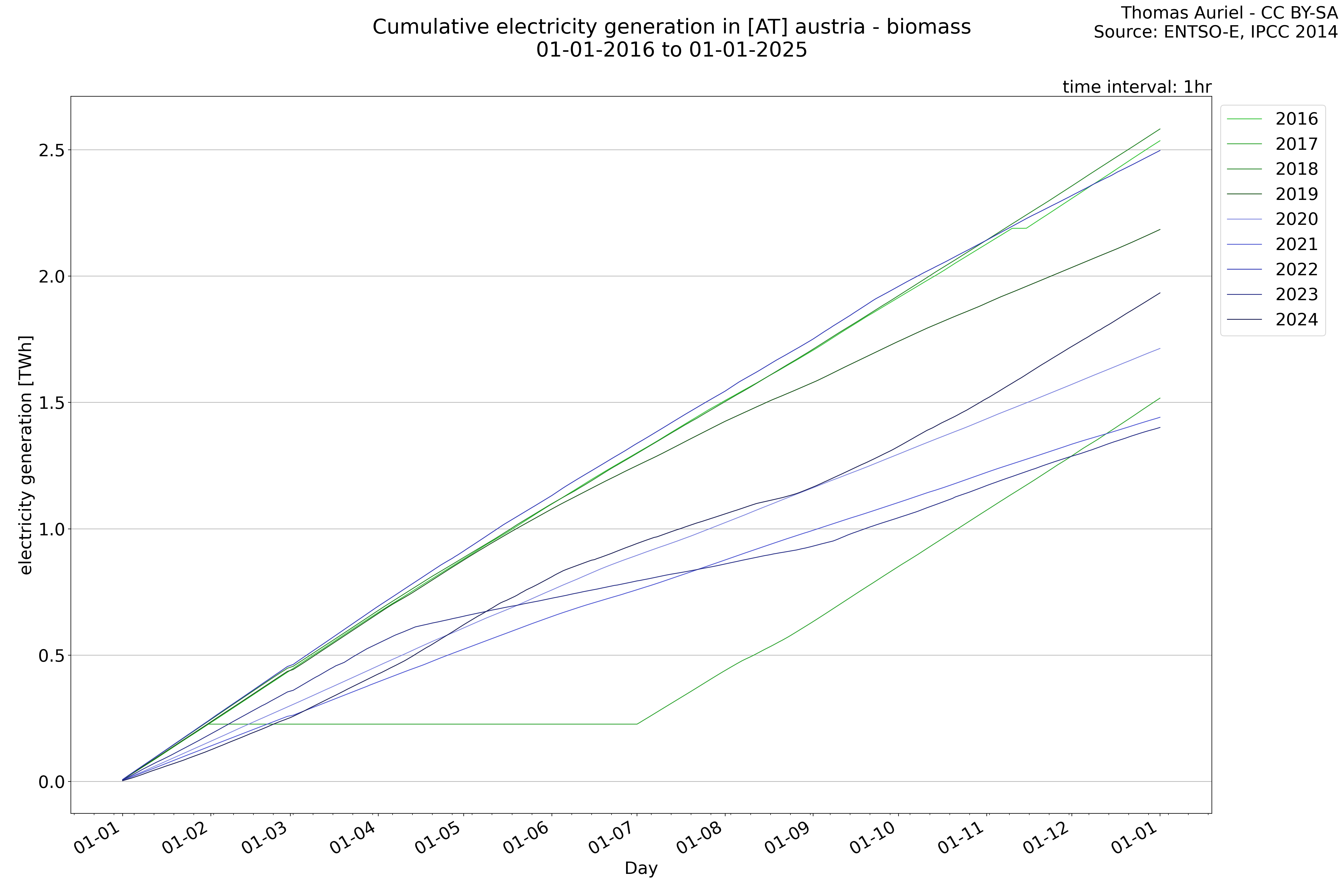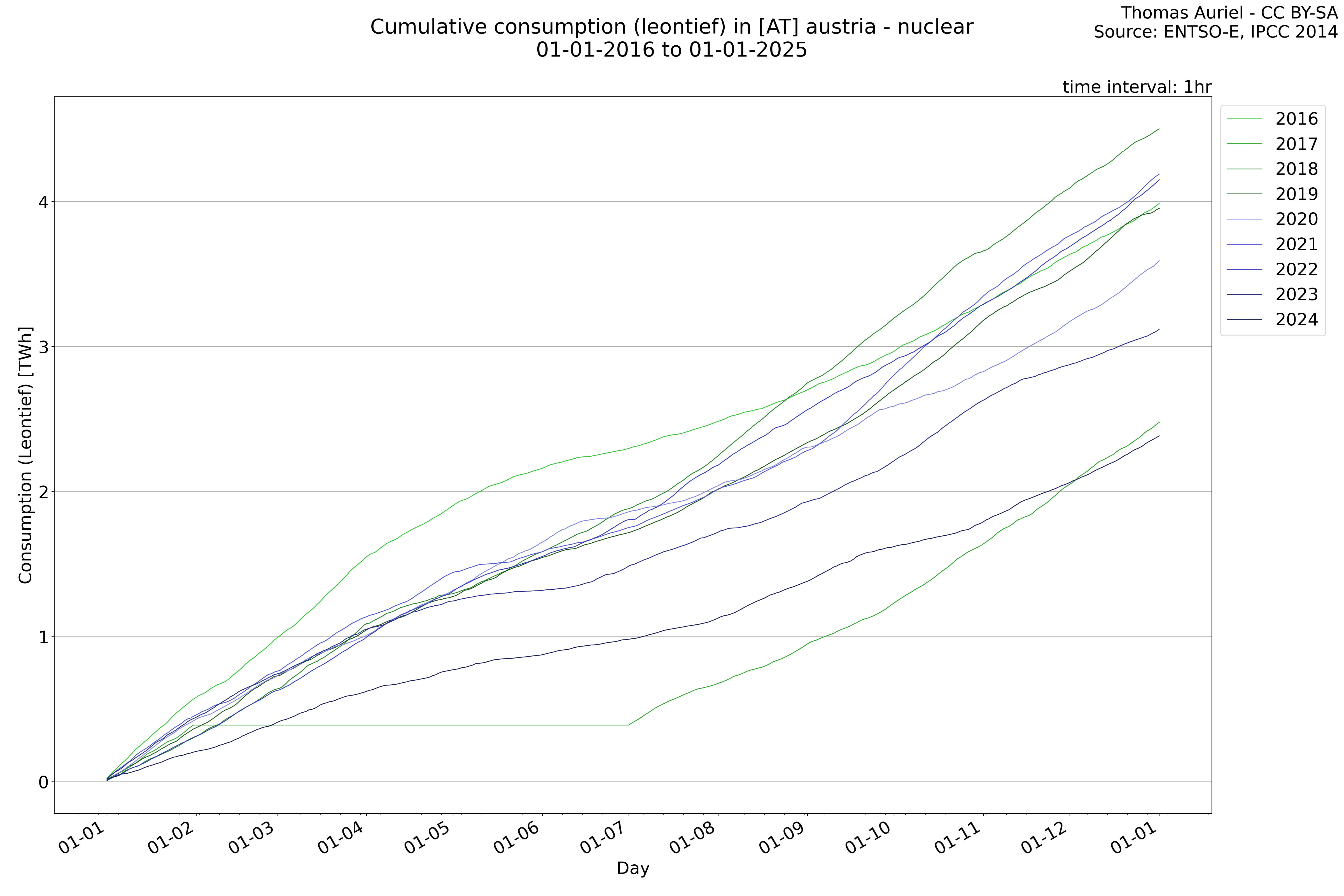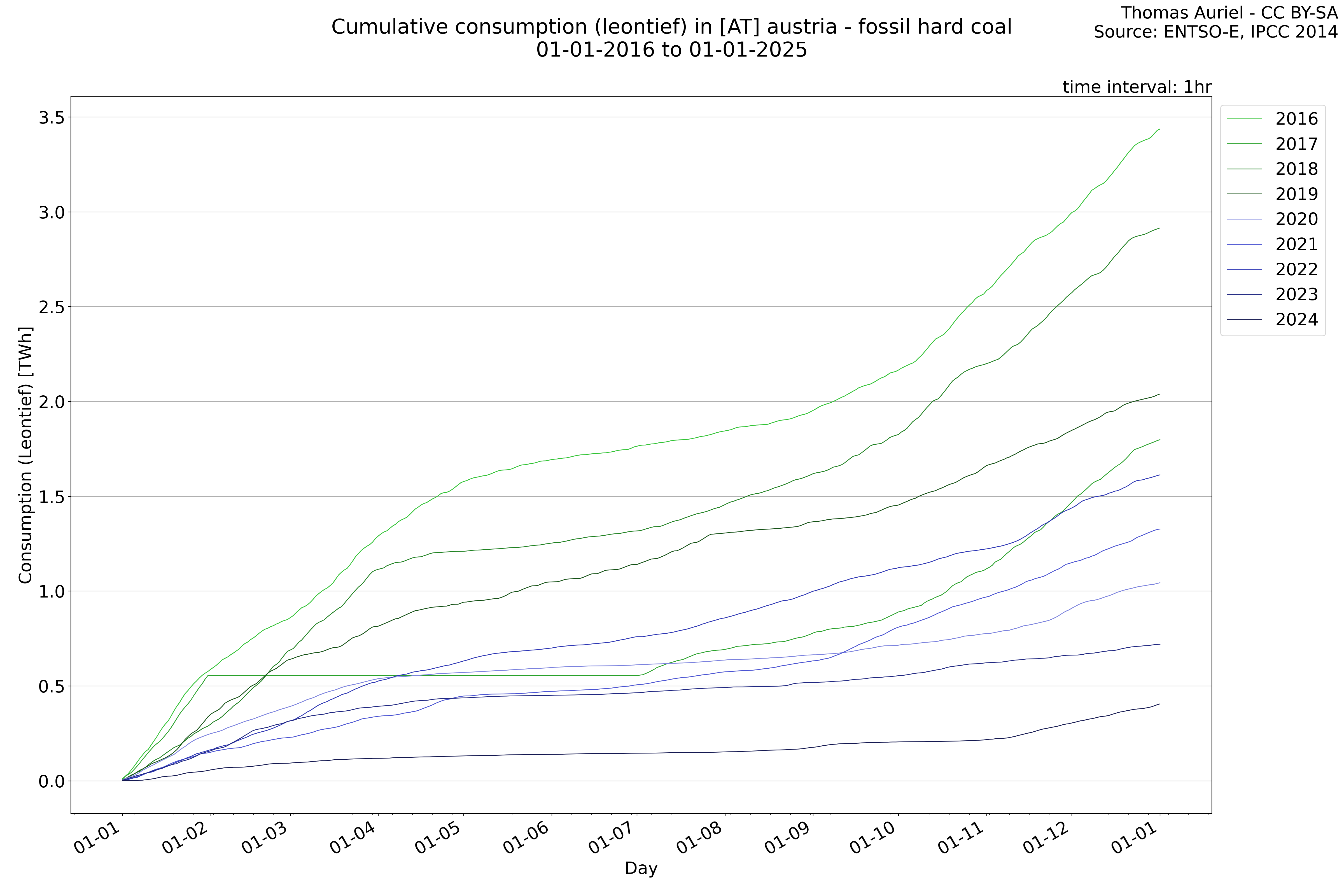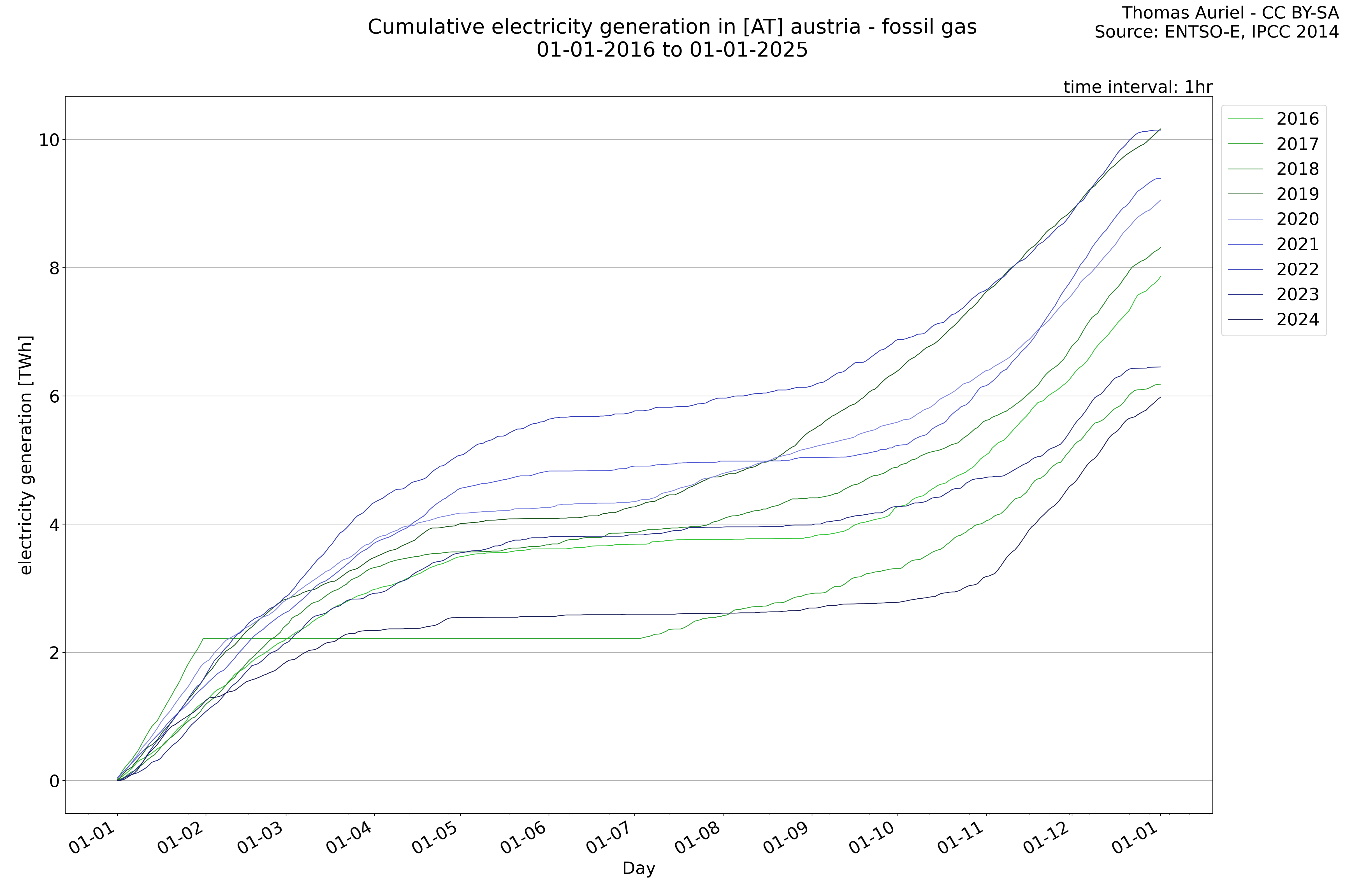 This plot is a cumulative sum plot, where each line represents the cumulative value of a specific metric (e.g., production, load, import, or export) for a given year. The plot begins at zero, and as the year progresses, the cumulative value is updated to reflect the total amount accumulated over time. This visualization illustrates the overall trend of the metric, showing whether the cumulative sum is increasing or decreasing, as well as any changes in the trend within the year. Additionally, the cumulative sum plot helps to reduce the impact of noise and short-term fluctuations commonly present in the raw data of production, load, import, or export. By smoothing out these variations, the plot emphasizes the broader, long-term trends. Consequently, this type of visualization facilitates a clearer understanding of the metric’s evolution across the year, revealing whether the activity follows a steady trajectory, shows signs of volatility, or experiences periods of significant change.