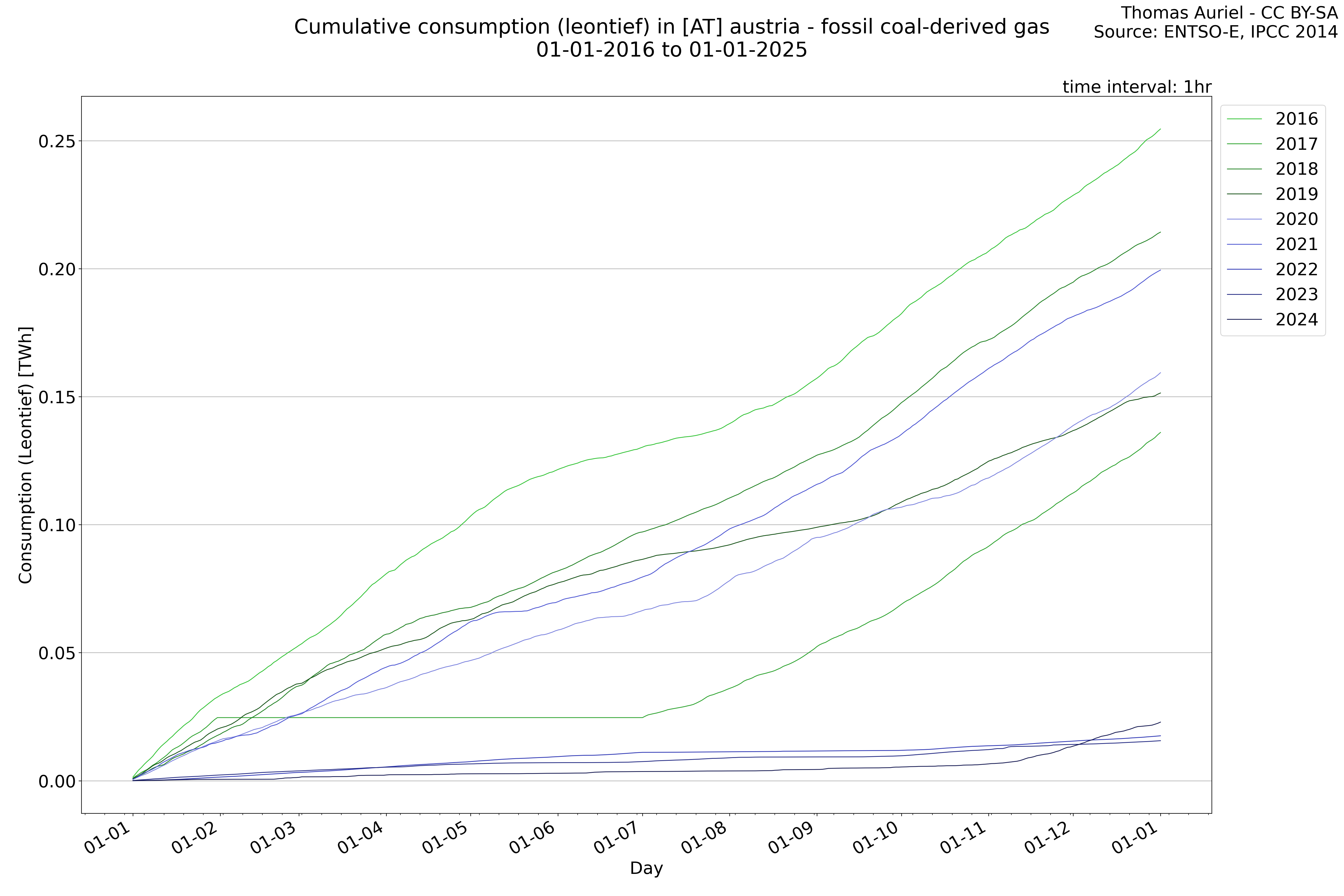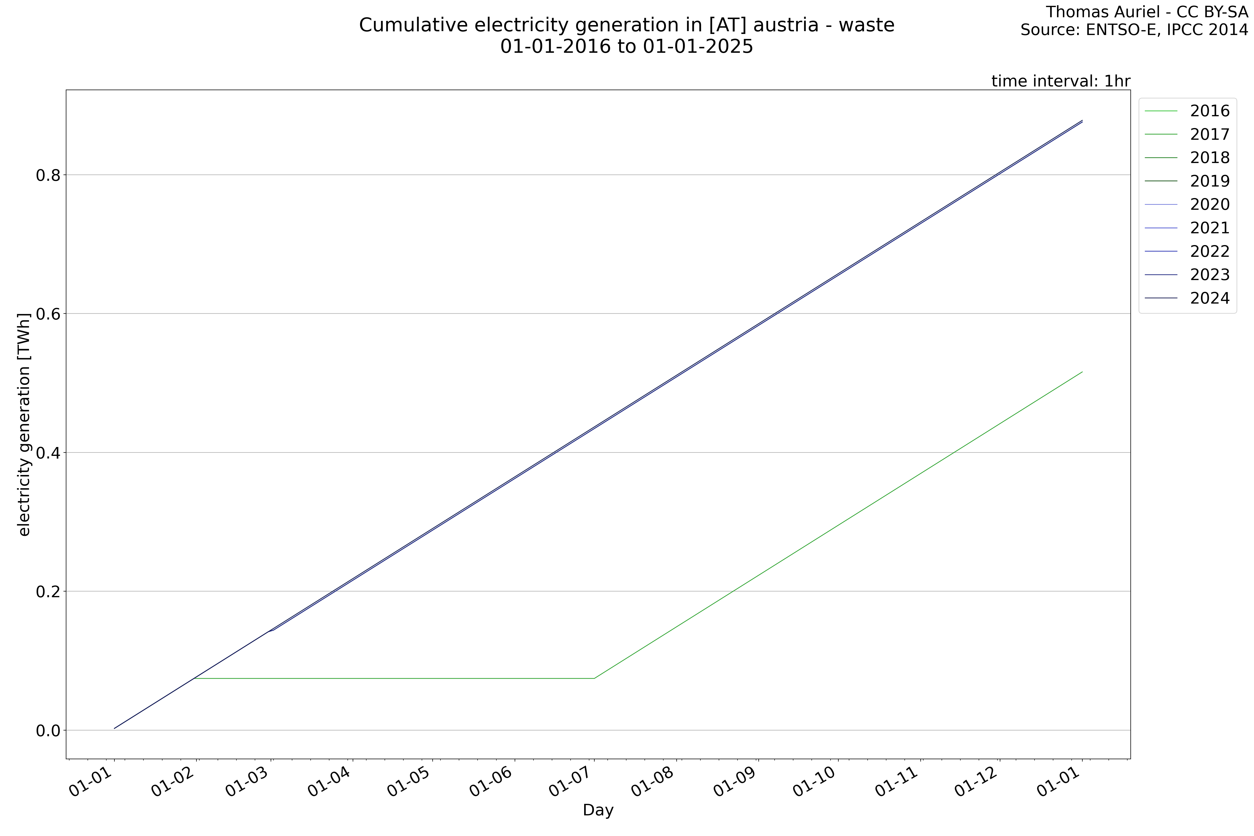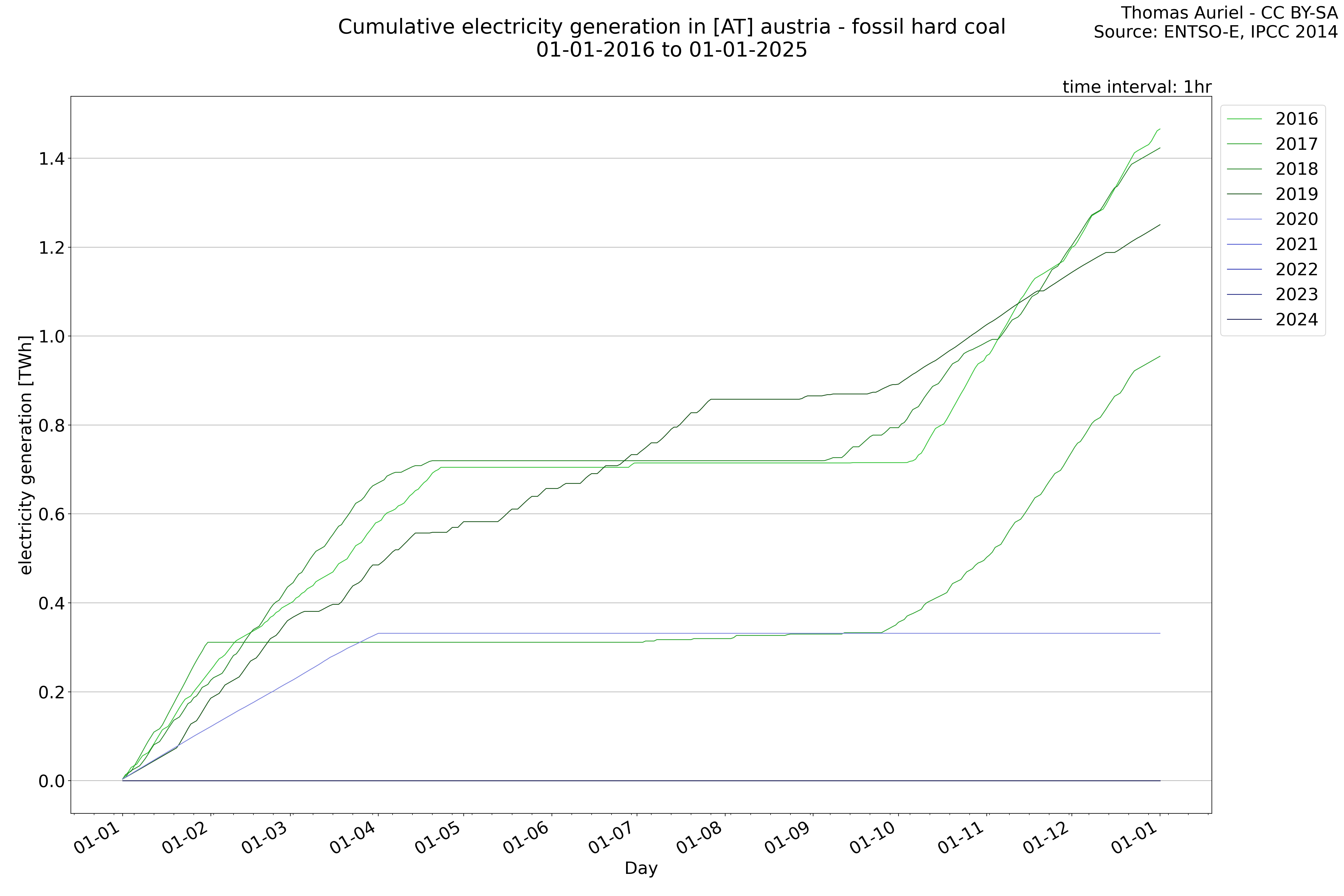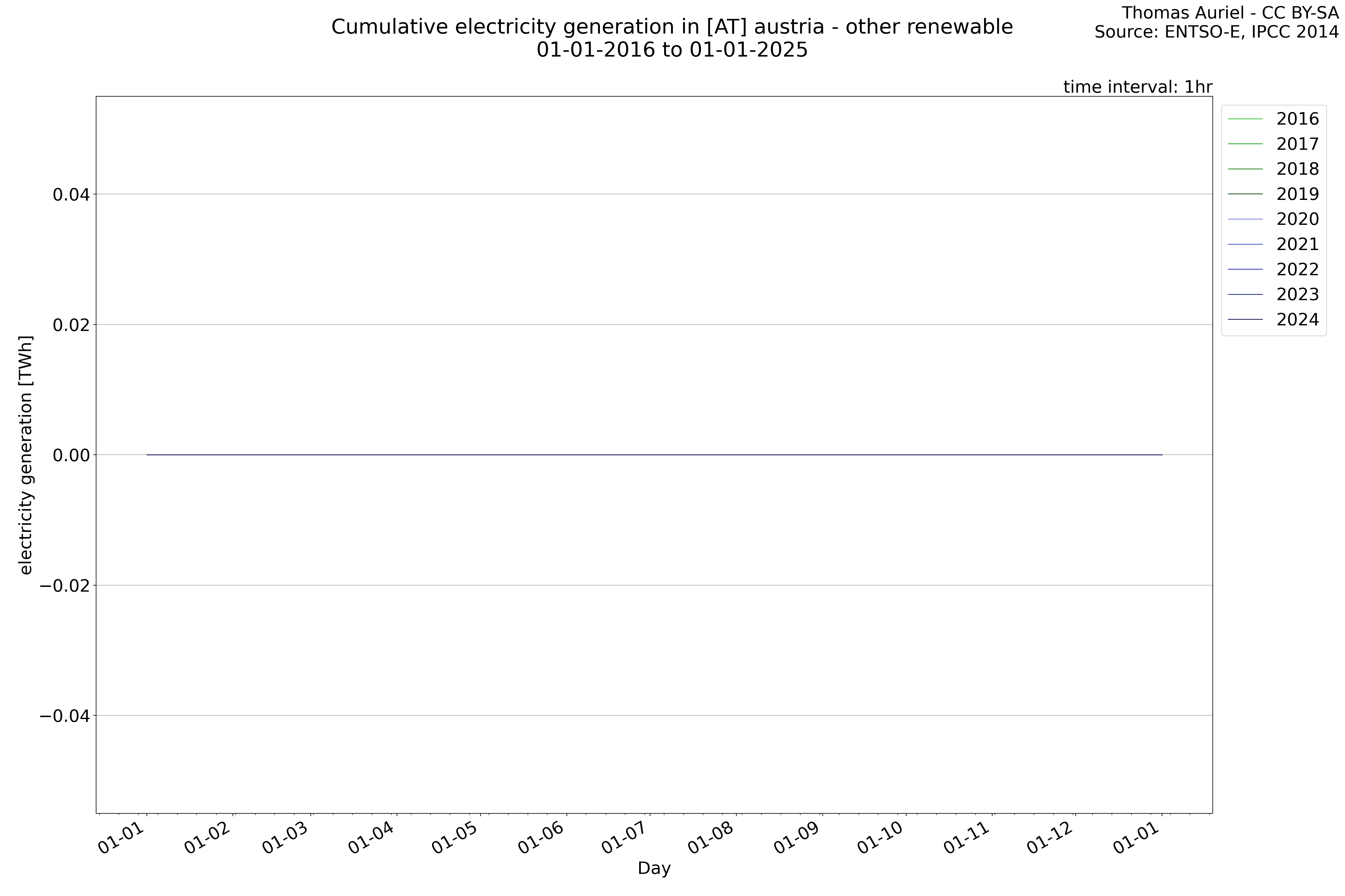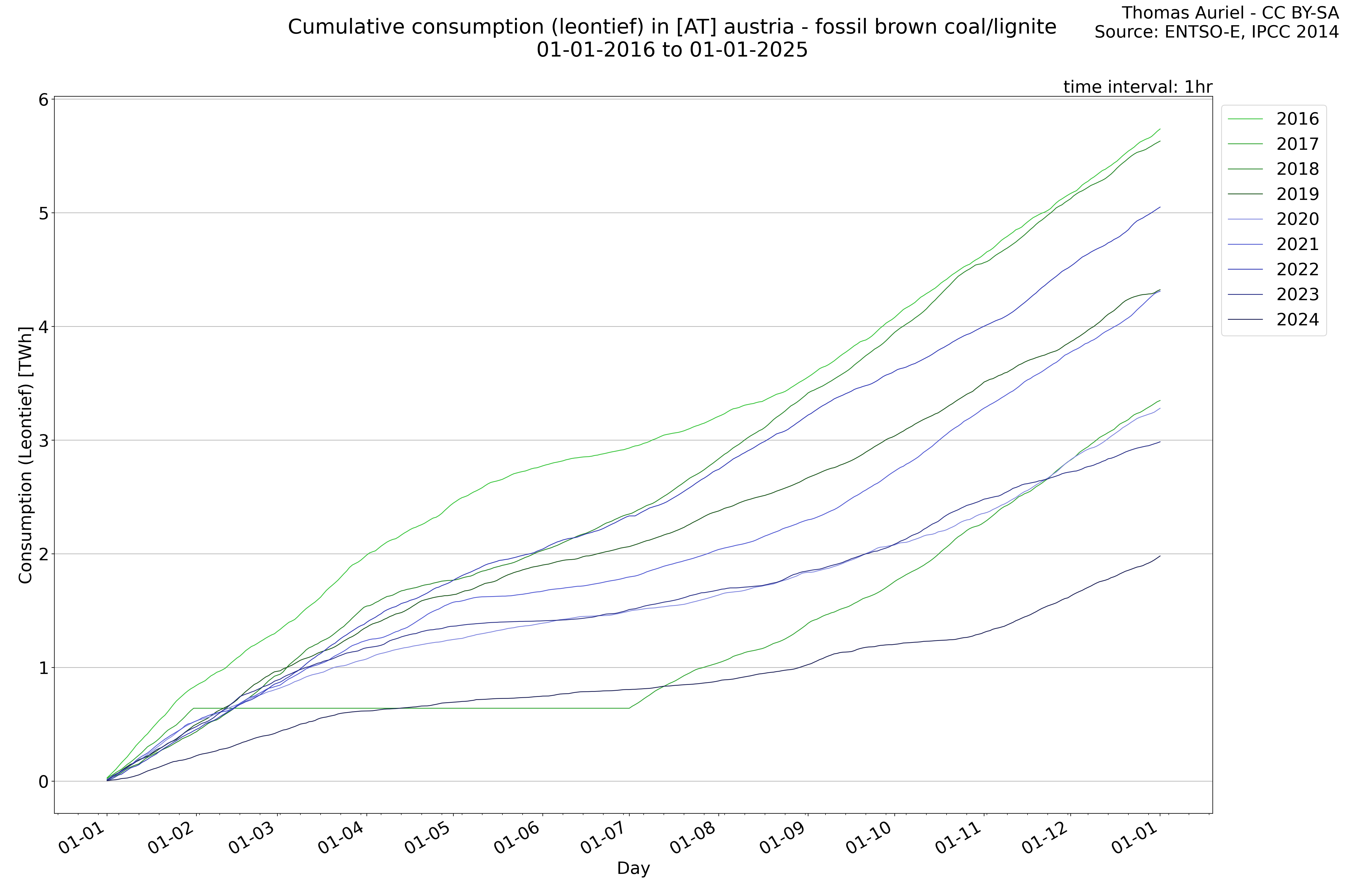 This plot is a cumulative sum plot, where each line represents the cumulative value of a specific metric (e.g., production, load, import, or export) for a given year. The plot begins at zero, and as the year progresses, the cumulative value is updated to reflect the total amount accumulated over time. This visualization illustrates the overall trend of the metric, showing whether the cumulative sum is increasing or decreasing, as well as any changes in the trend within the year. Additionally, the cumulative sum plot helps to reduce the impact of noise and short-term fluctuations commonly present in the raw data of production, load, import, or export. By smoothing out these variations, the plot emphasizes the broader, long-term trends. Consequently, this type of visualization facilitates a clearer understanding of the metric’s evolution across the year, revealing whether the activity follows a steady trajectory, shows signs of volatility, or experiences periods of significant change.