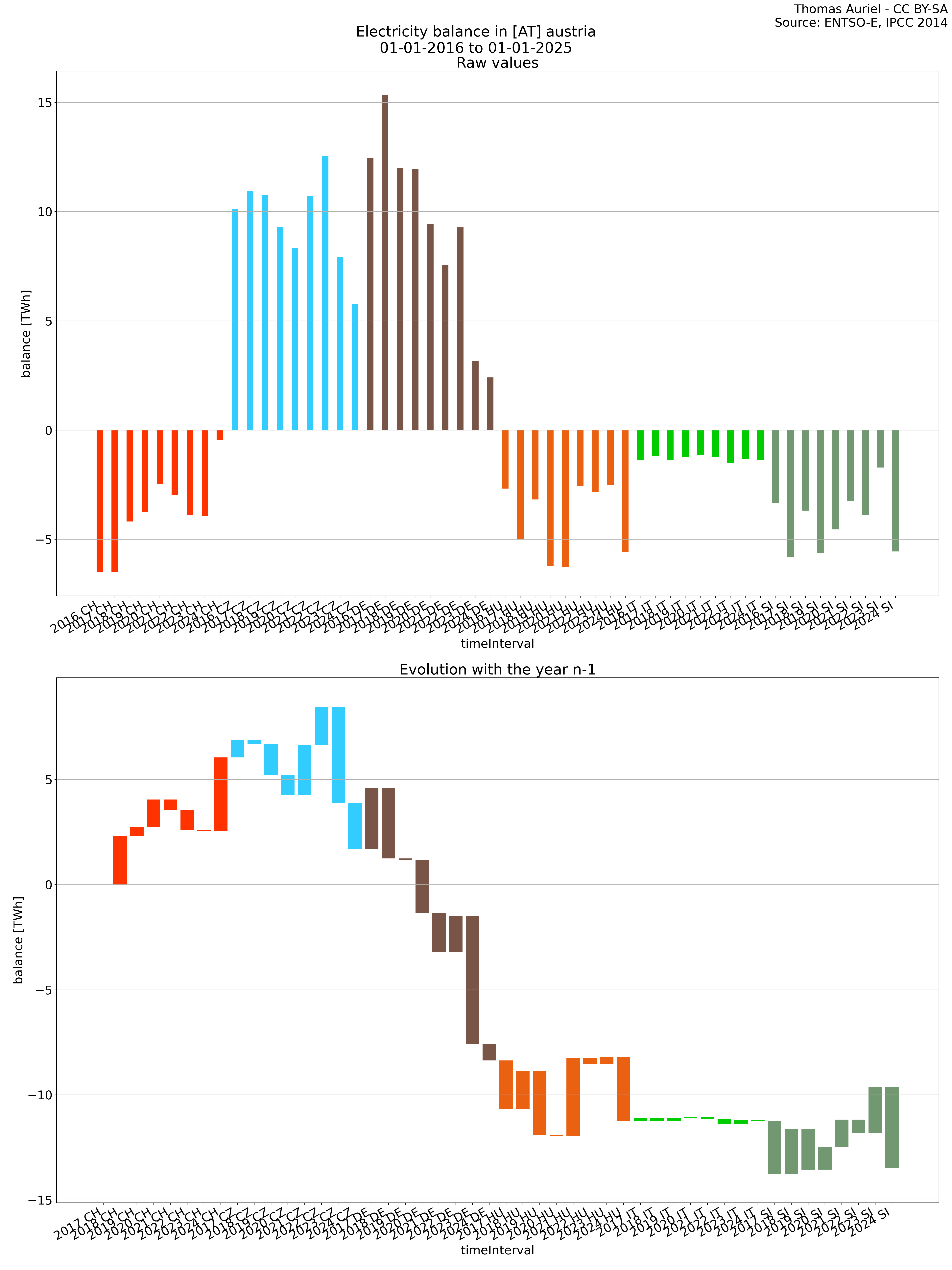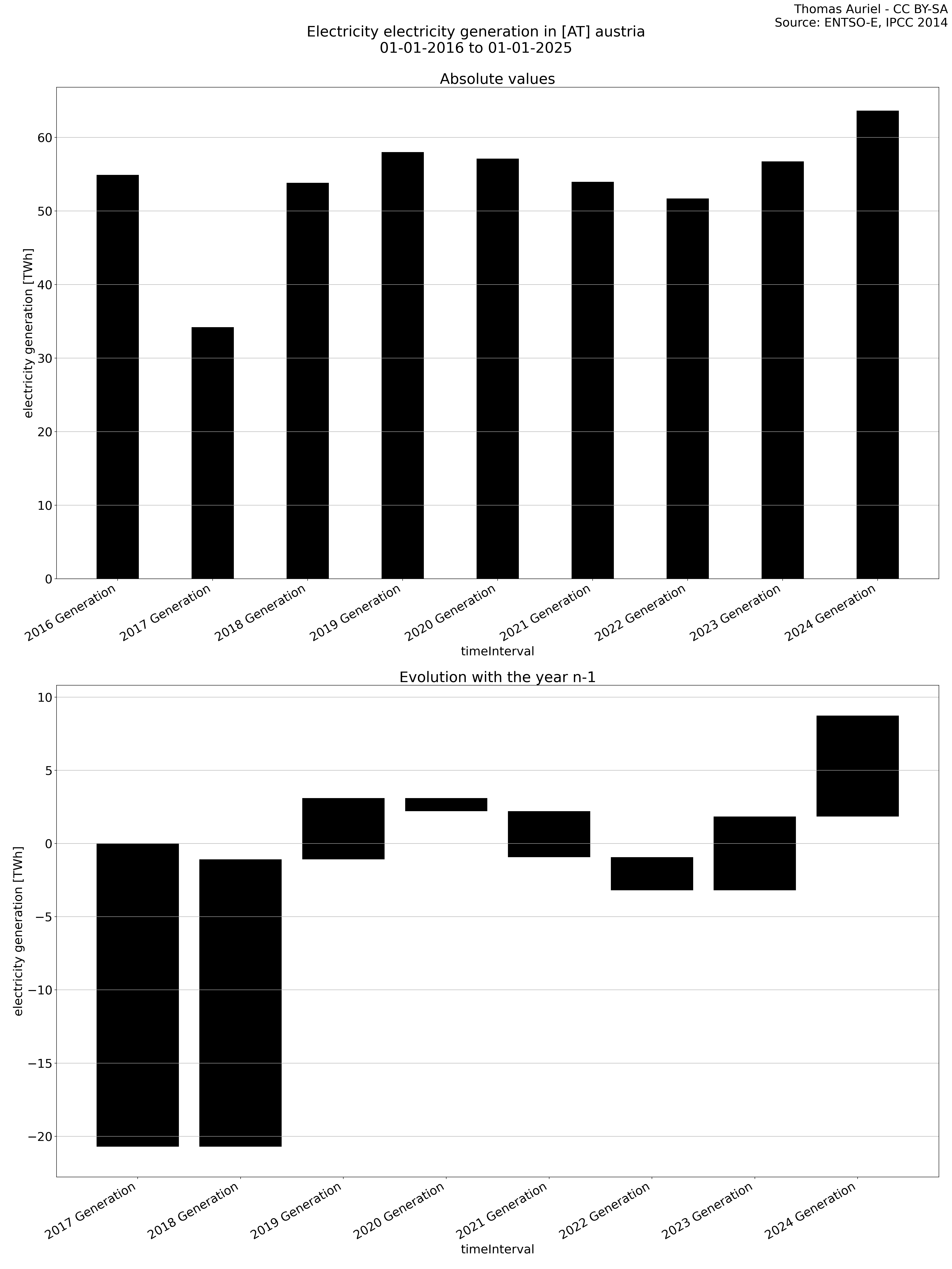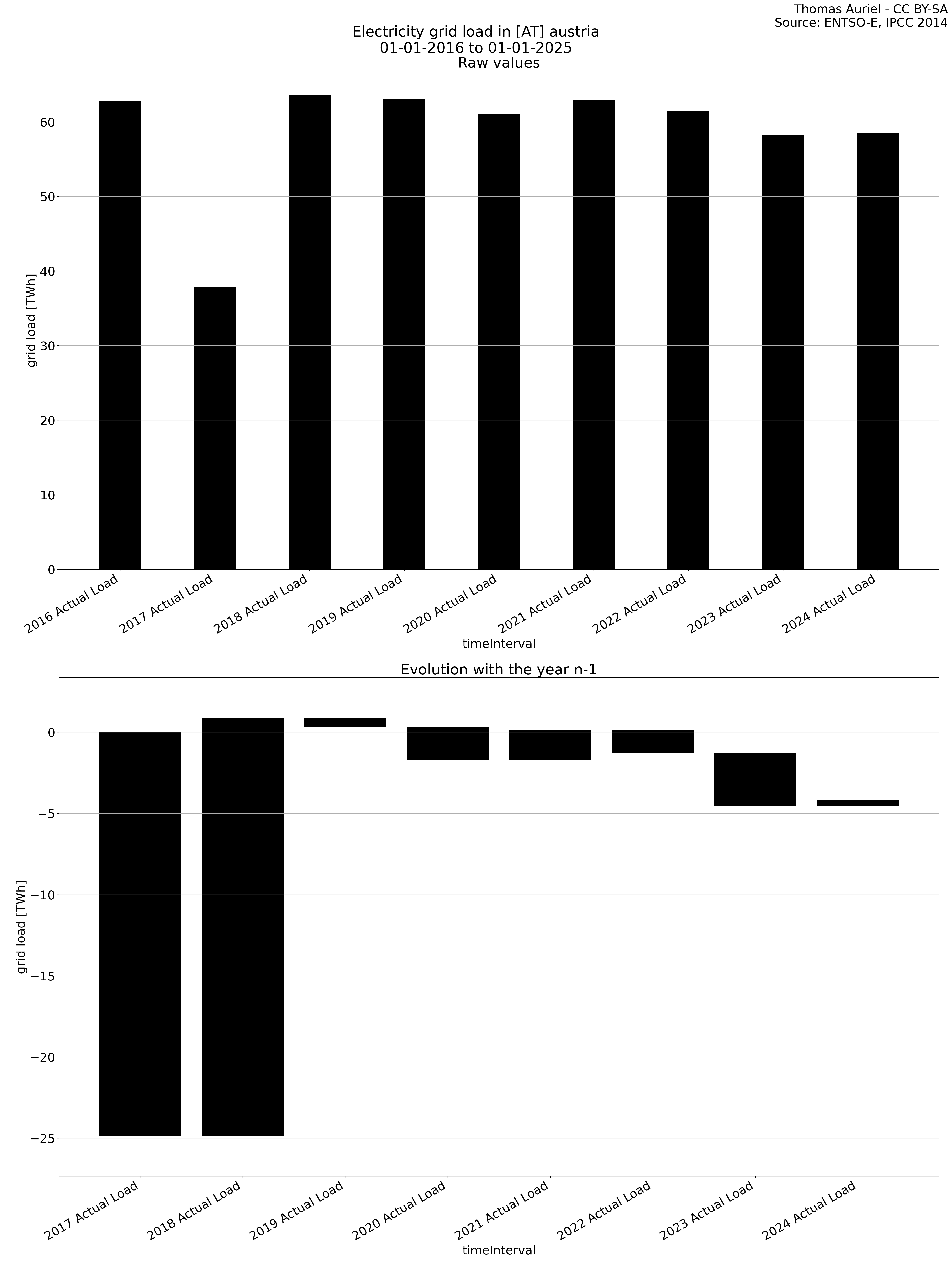 The second section features a waterfall graph, which visually represents the year-over-year changes in electricity metrics. In this graph, the length of each bar corresponds to the difference in the metric (e.g., production, load, etc.) compared to the previous year. Unlike the bar plot, the bars in the waterfall graph do not start at zero; instead, each bar begins where the previous one ended. Hence, this structure emphasizes the incremental changes in the metric over time, facilitating the visualization of fluctuations from one year to the next.