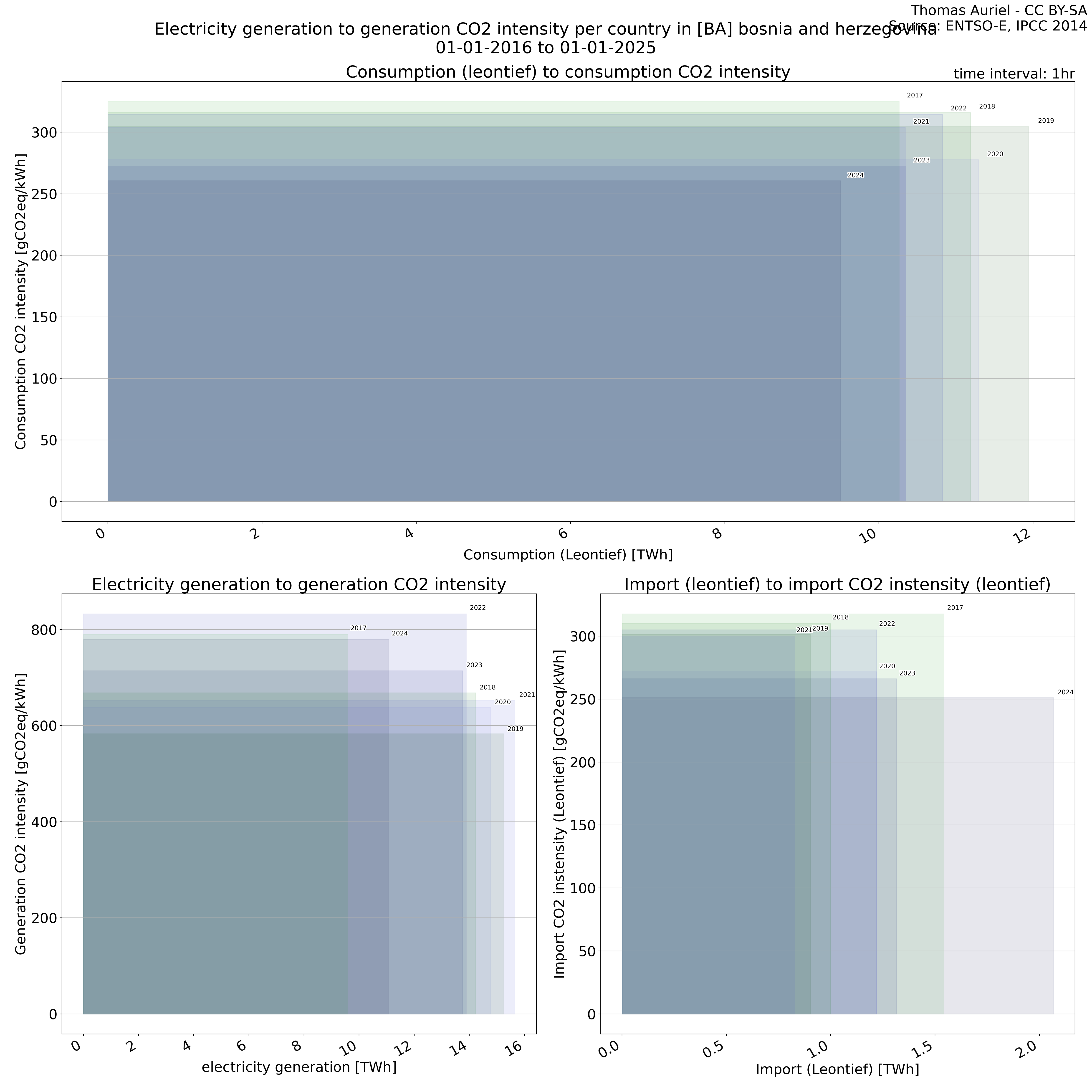 The plot consists of squares, each representing a single year, designed to illustrate electricity-related metrics and their associated environmental impacts. The length of each square corresponds to the total electricity consumption, generation, or imports during the year, with longer squares indicating higher overall values for the respective metric. The height of each square represents the average CO₂ intensity (e.g., grams of CO₂ per kWh) associated with electricity consumption, generation, or imports; hence, taller squares signify greater environmental impact per unit of electricity. Finally, the surface area of each square, determined by the product of its length and height, represents the total CO₂ emissions associated with the respective activity in the given year.