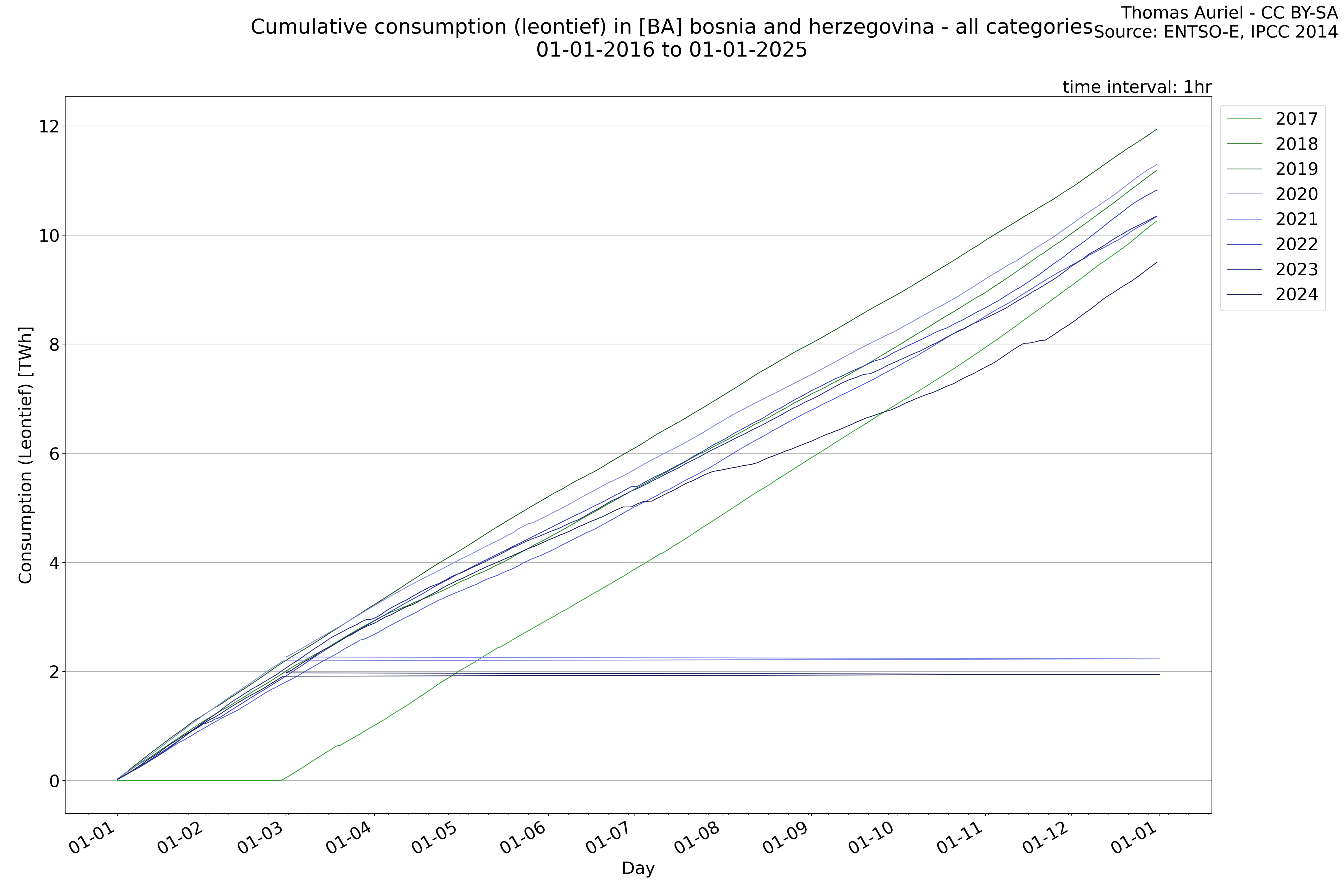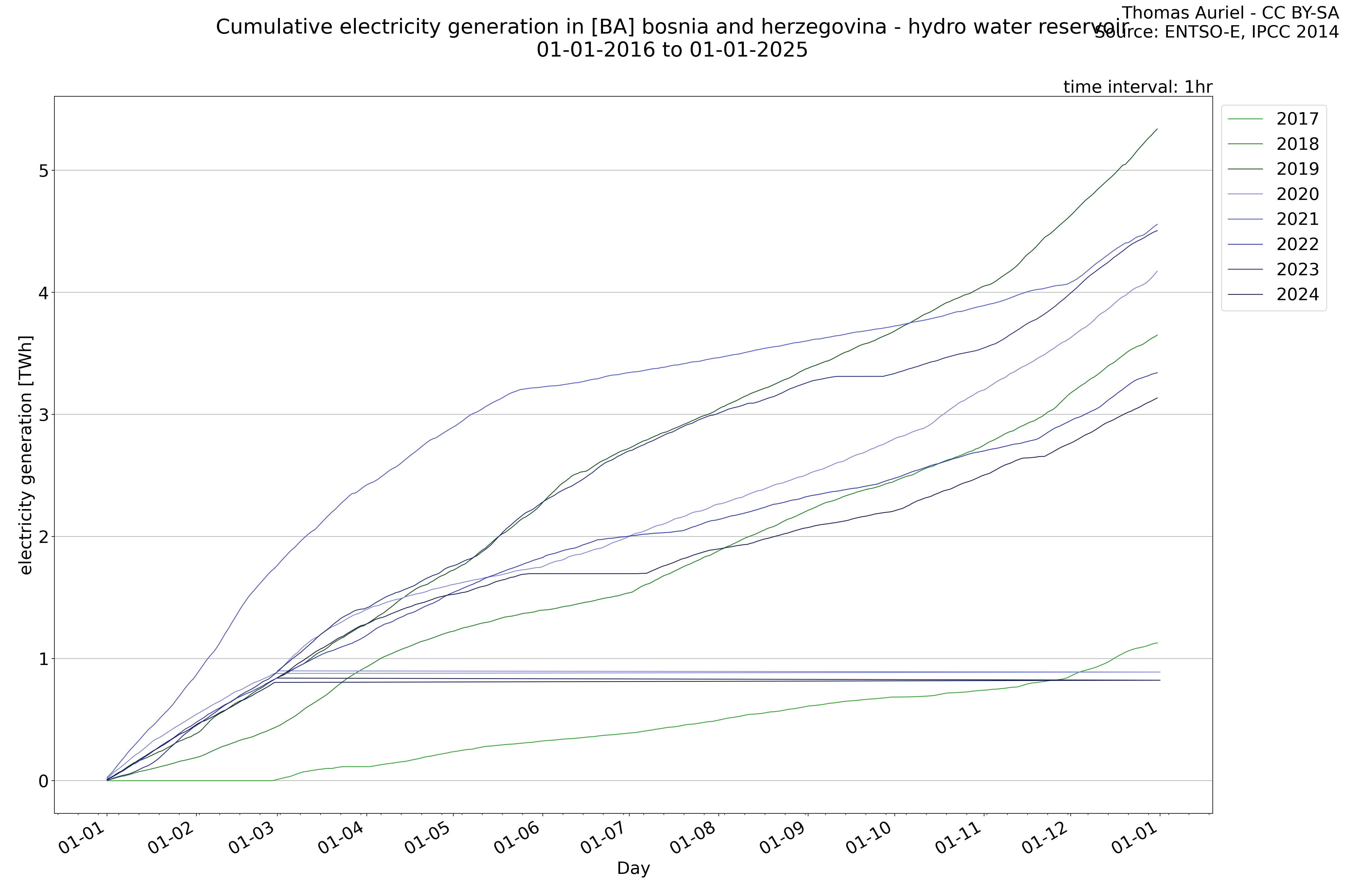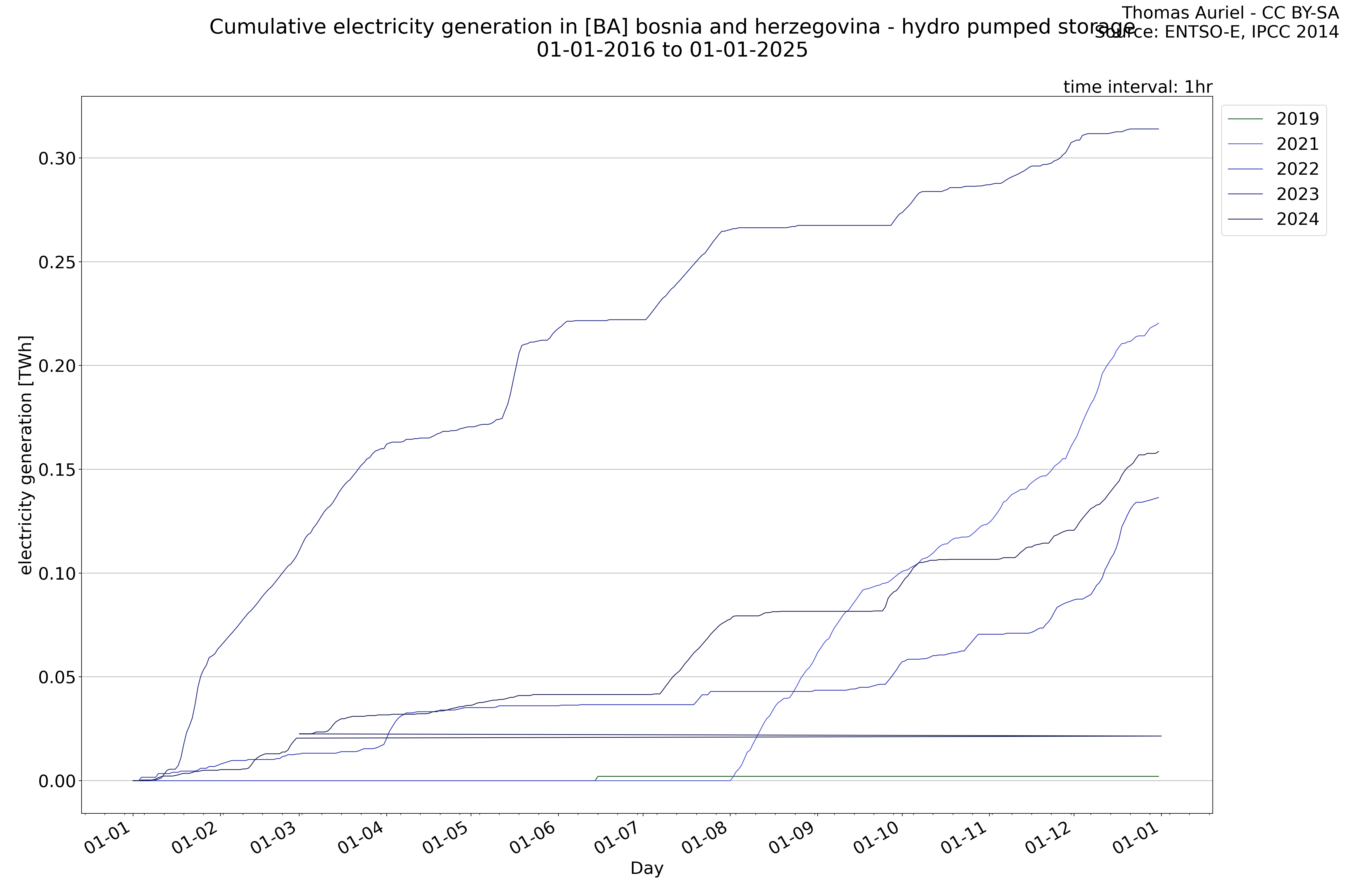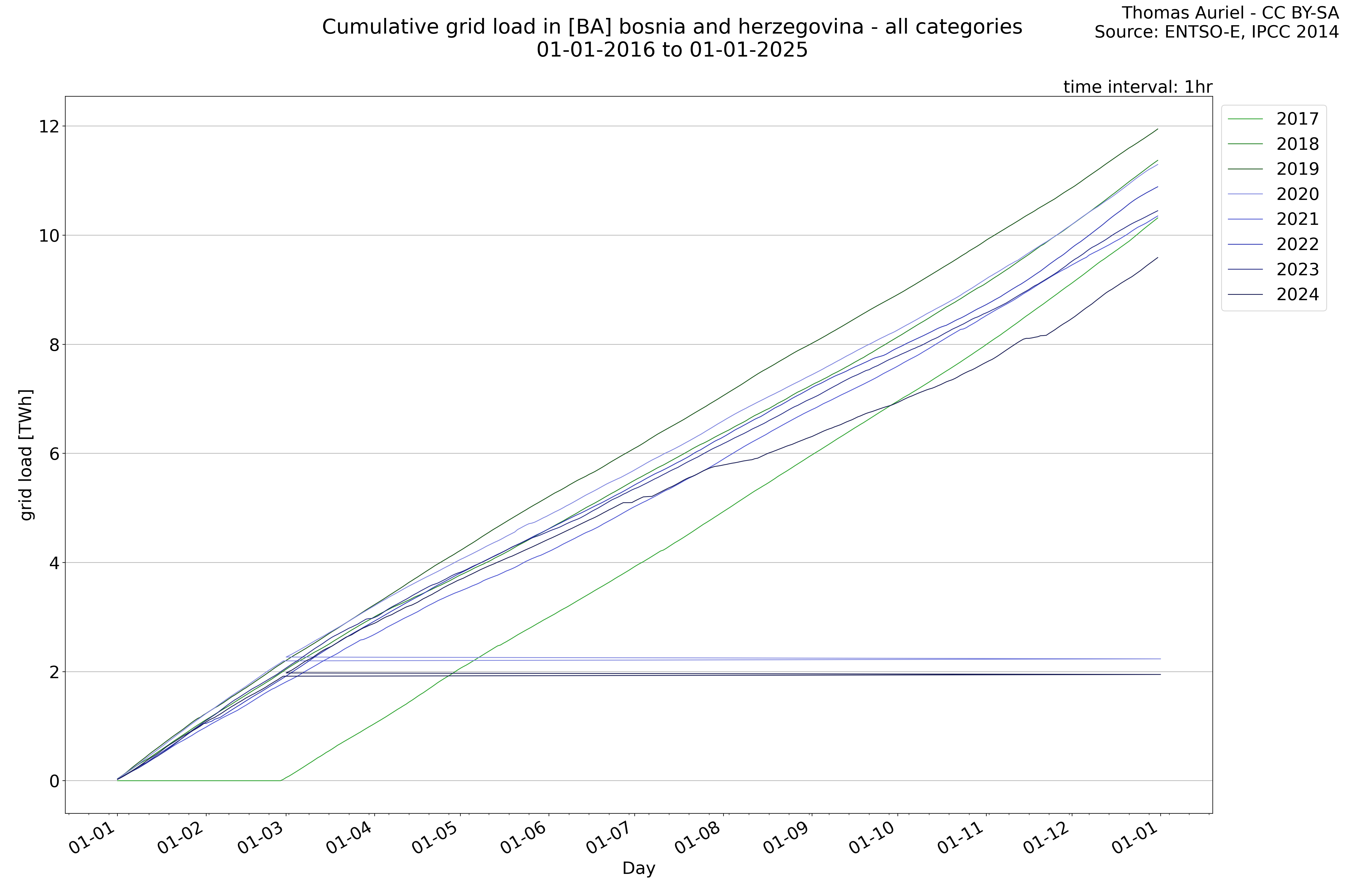 This plot is a cumulative sum plot, where each line represents the cumulative value of a specific metric (e.g., production, load, import, or export) for a given year. The plot begins at zero, and as the year progresses, the cumulative value is updated to reflect the total amount accumulated over time. This visualization illustrates the overall trend of the metric, showing whether the cumulative sum is increasing or decreasing, as well as any changes in the trend within the year. Additionally, the cumulative sum plot helps to reduce the impact of noise and short-term fluctuations commonly present in the raw data of production, load, import, or export. By smoothing out these variations, the plot emphasizes the broader, long-term trends. Consequently, this type of visualization facilitates a clearer understanding of the metric’s evolution across the year, revealing whether the activity follows a steady trajectory, shows signs of volatility, or experiences periods of significant change.